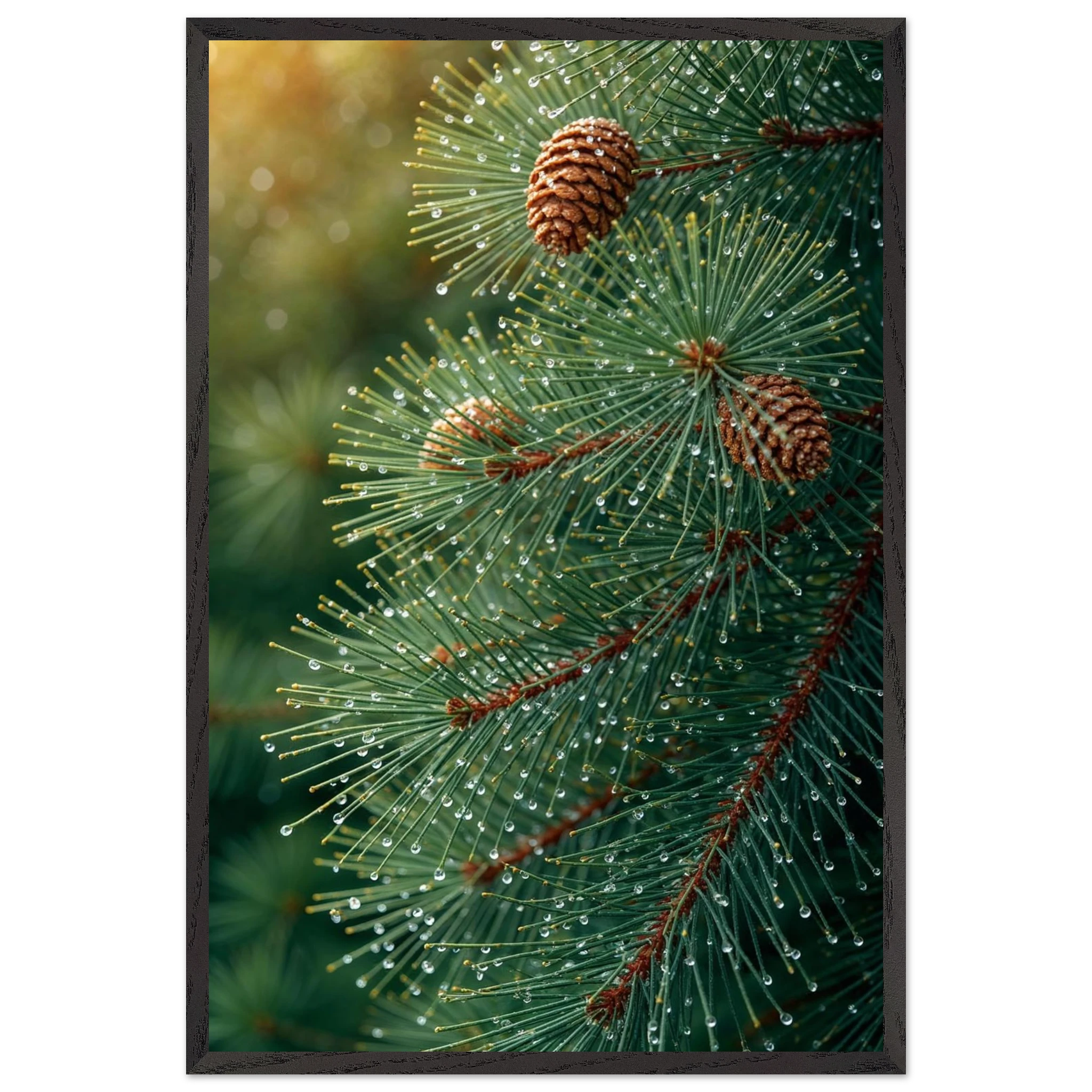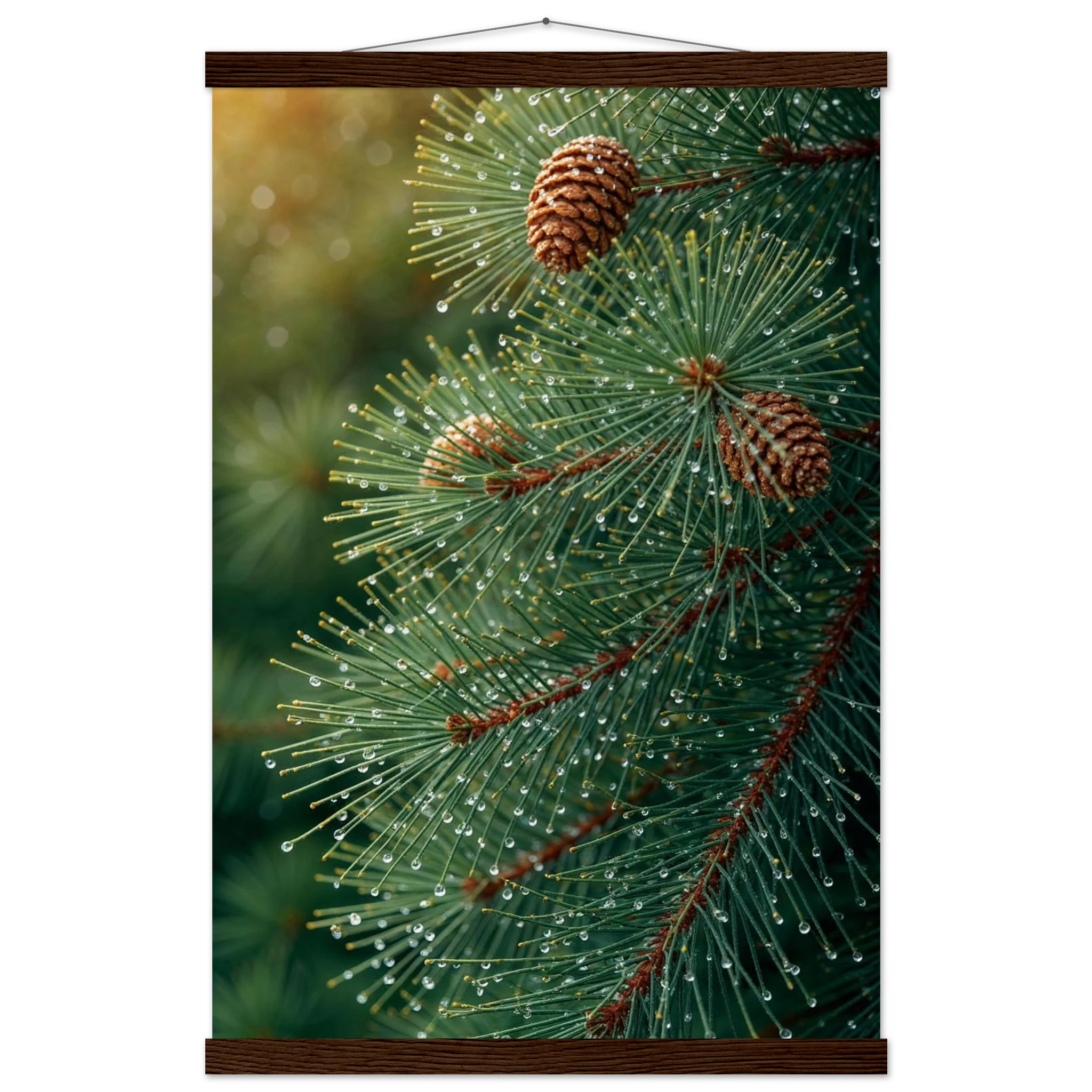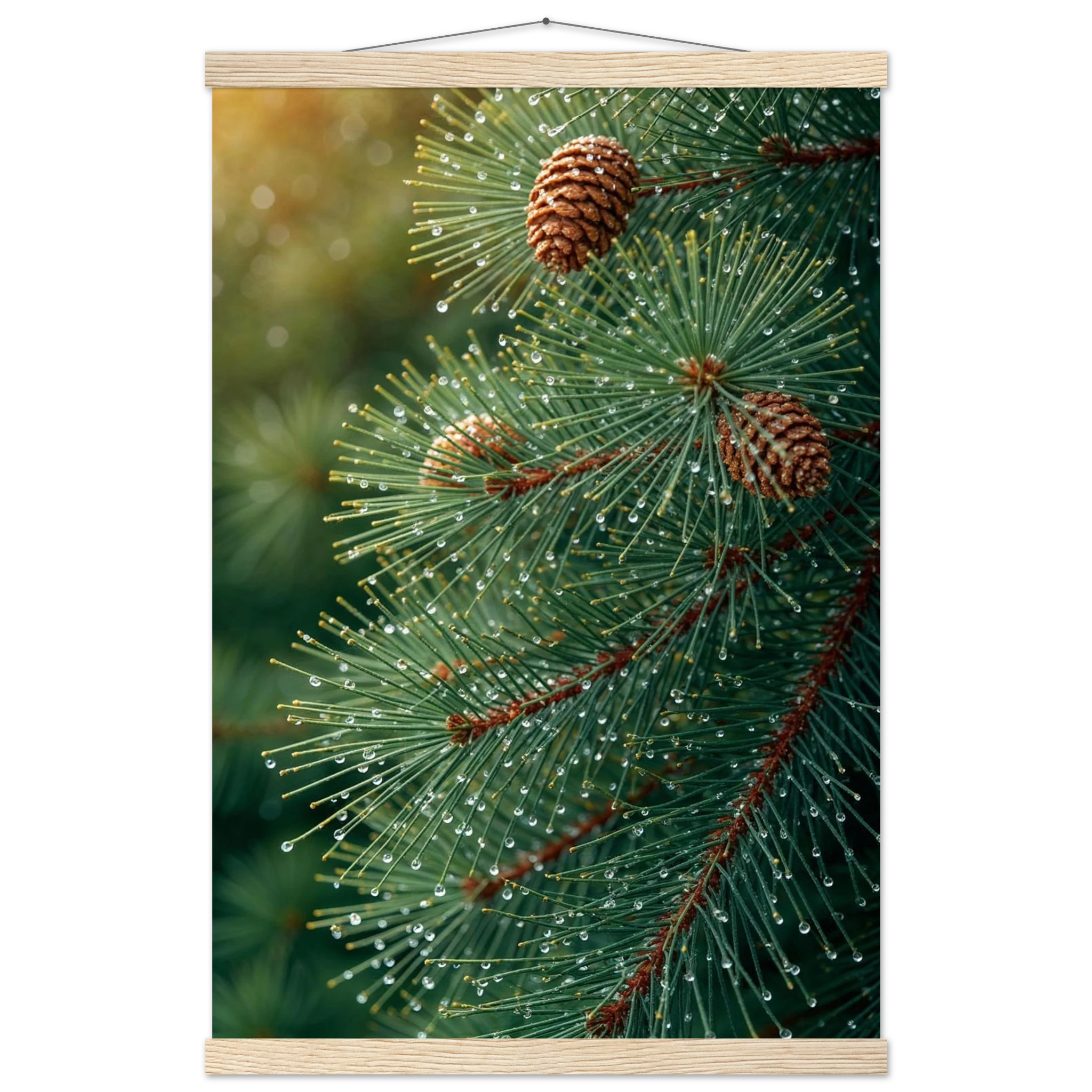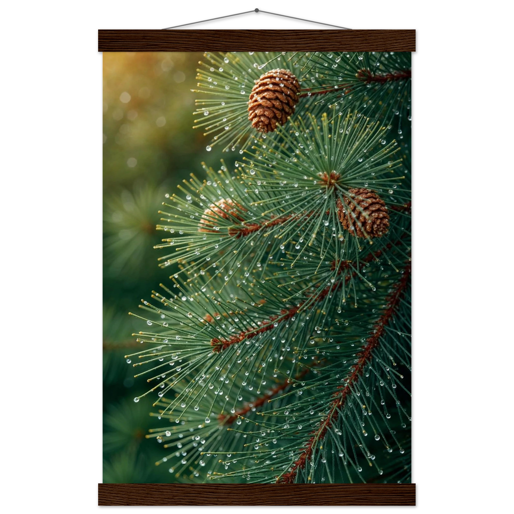 Pine Tree Branch Close Up: Vibrant Green Needles, Dewy Water Droplets, Rustic Nature Wall Art