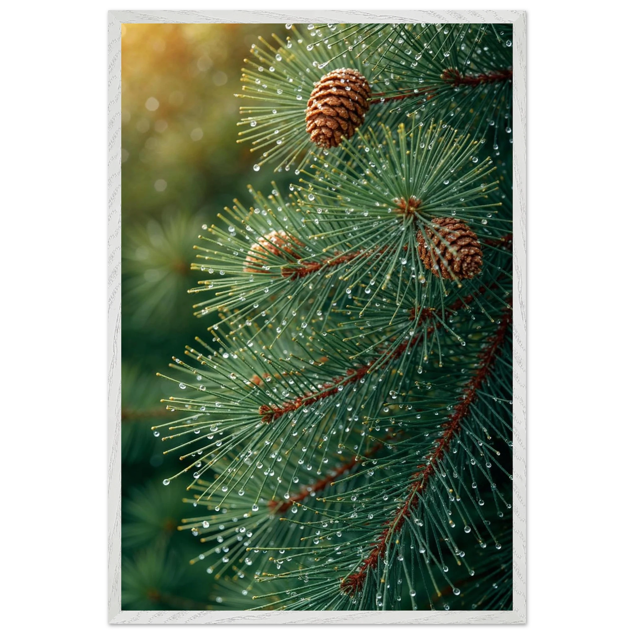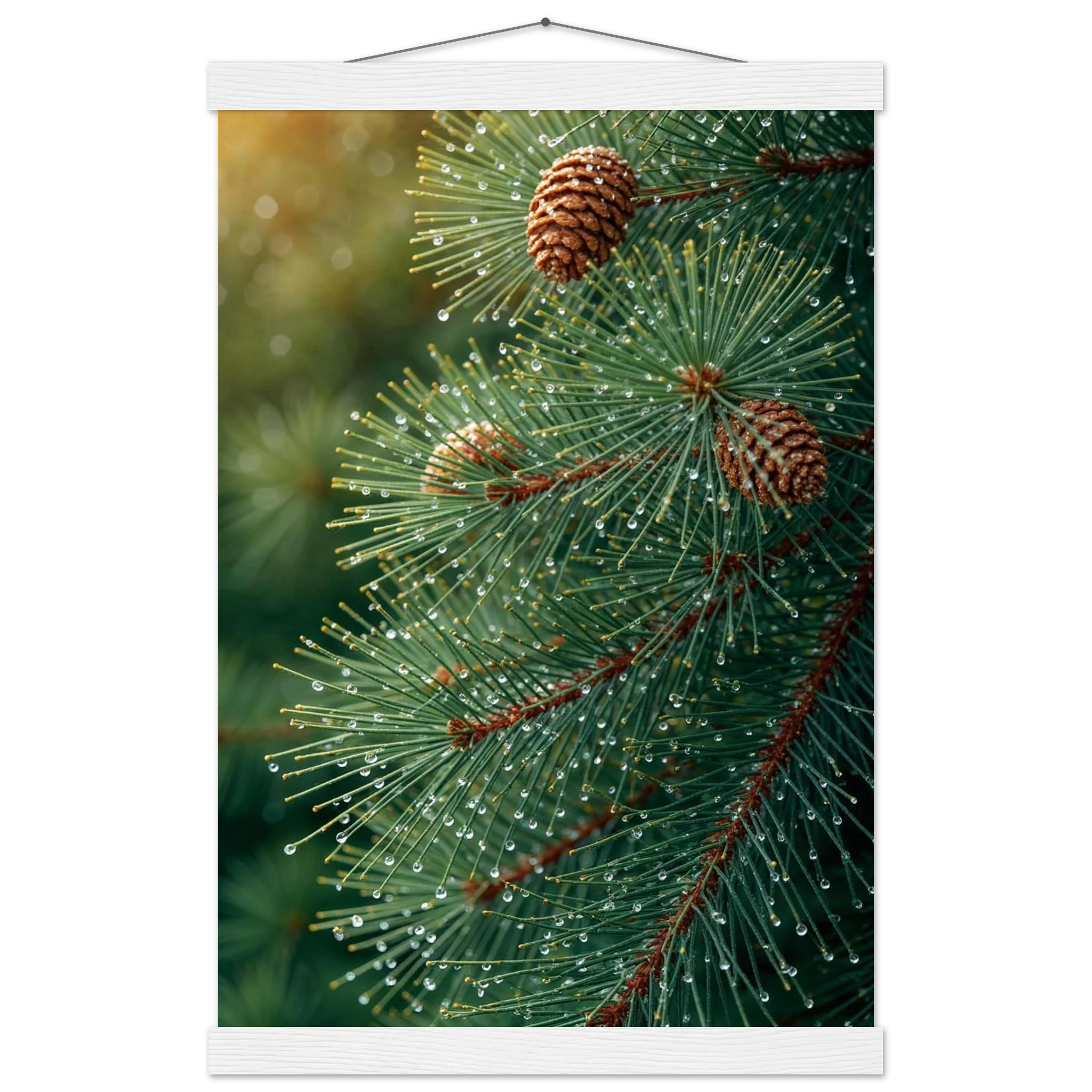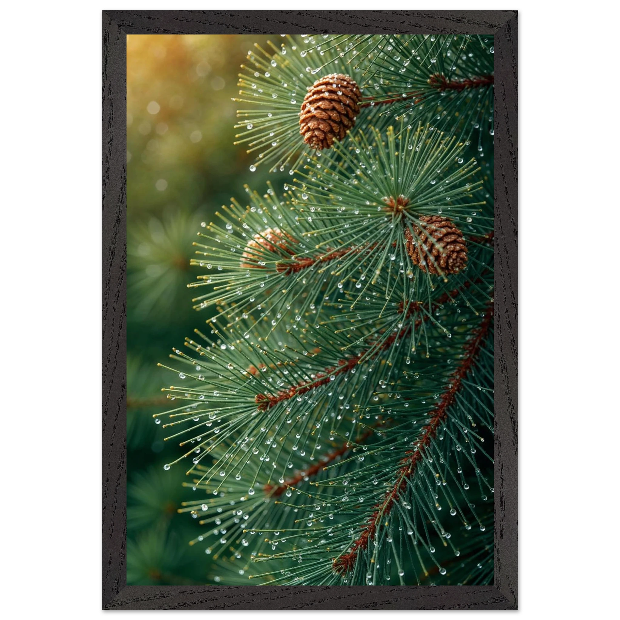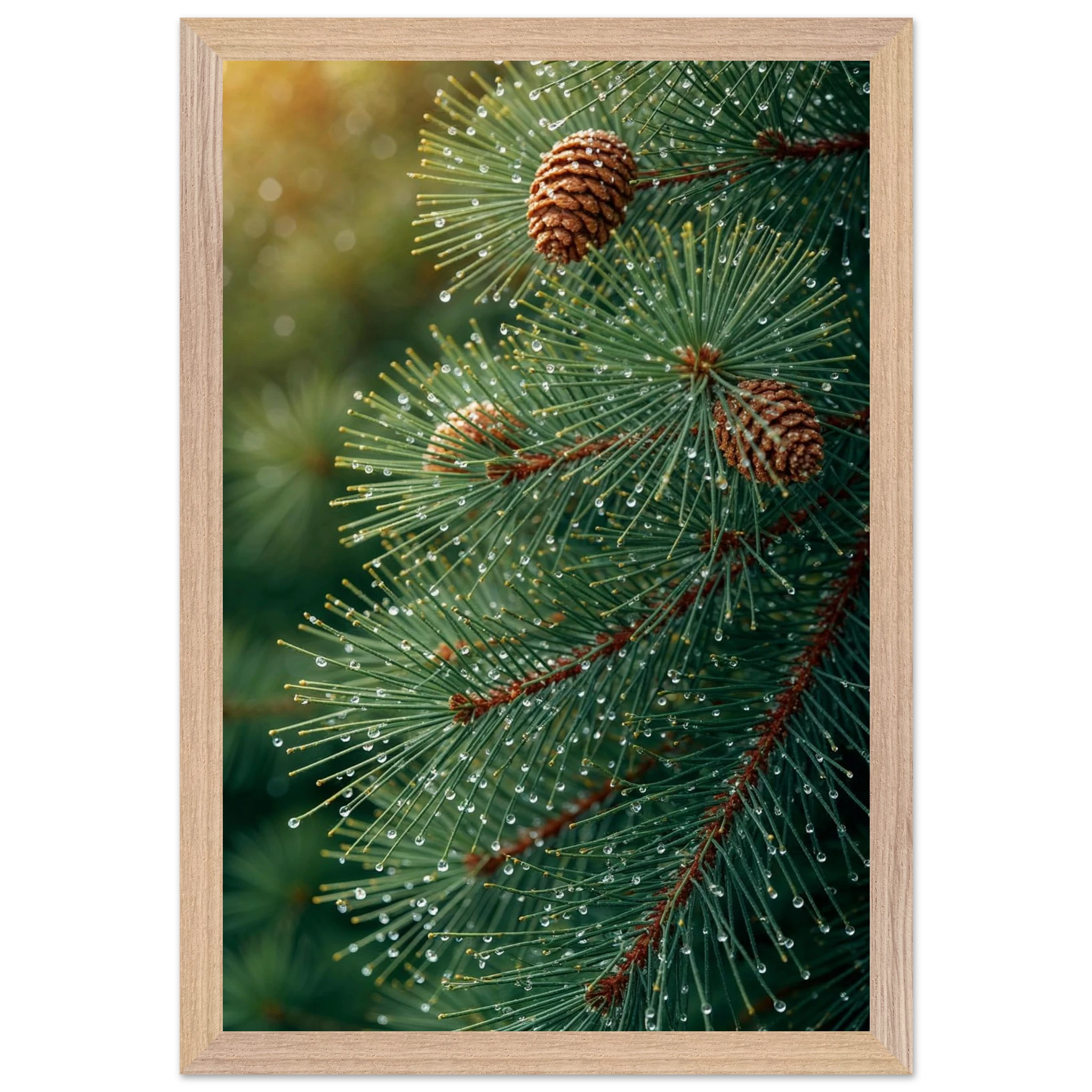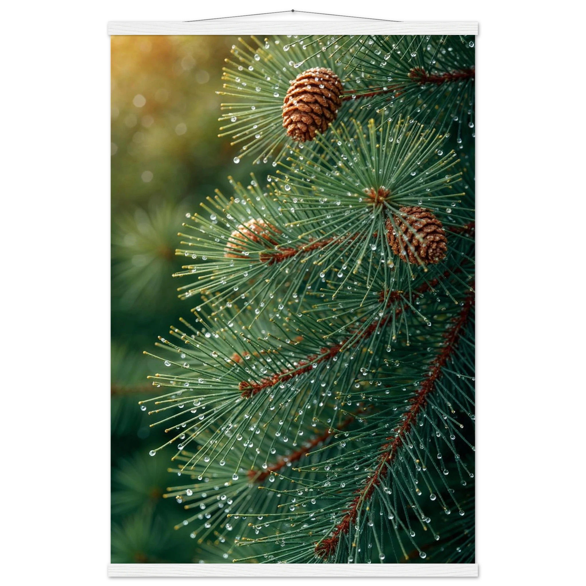 Pine Tree Branch Close Up: Vibrant Green Needles, Dewy Water Droplets, Rustic Nature Wall Art