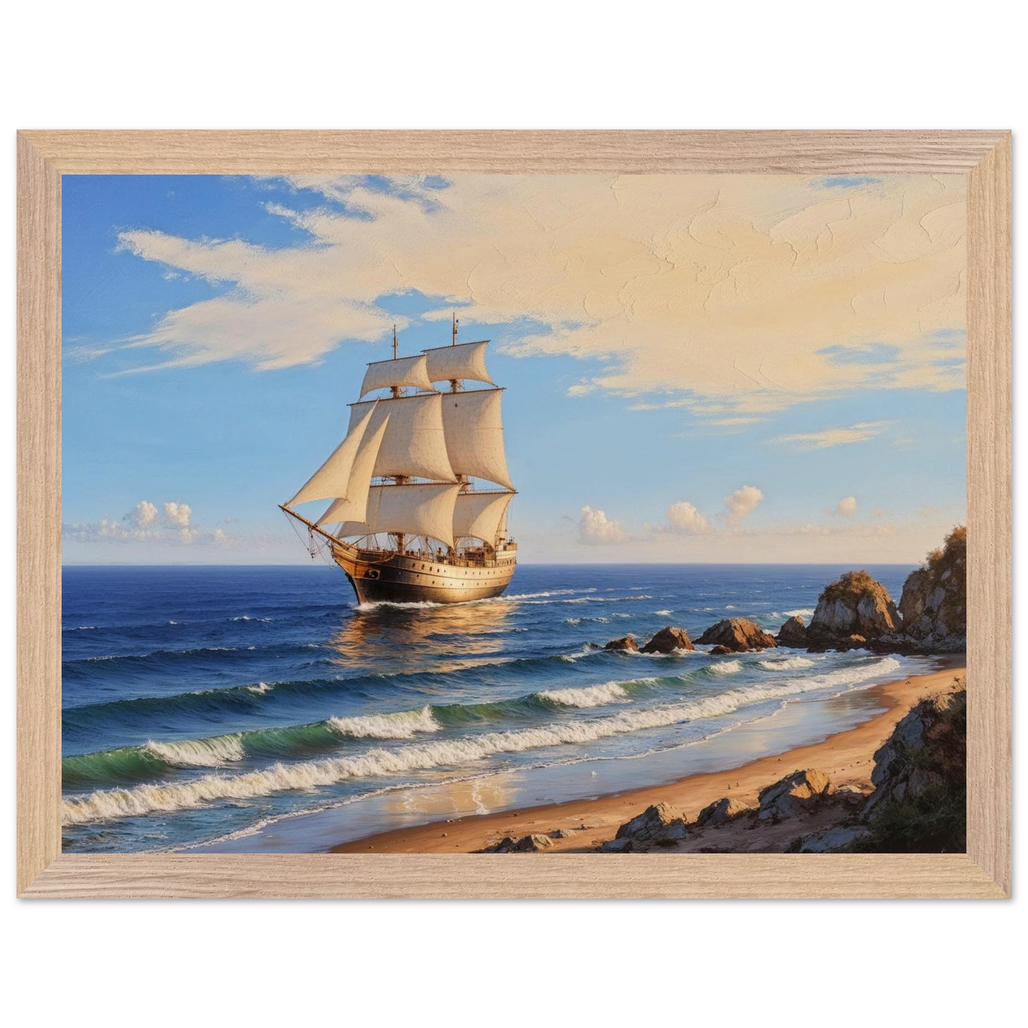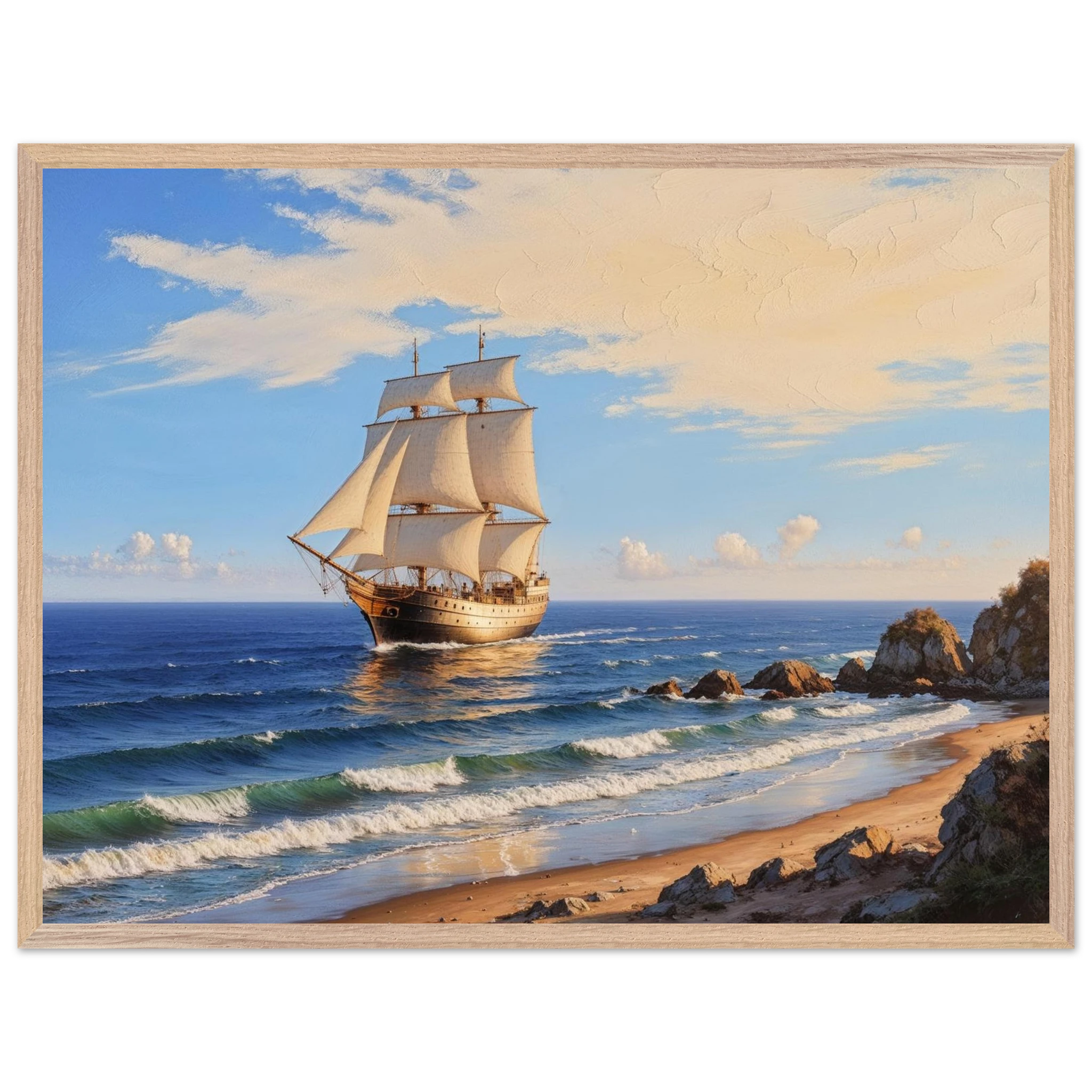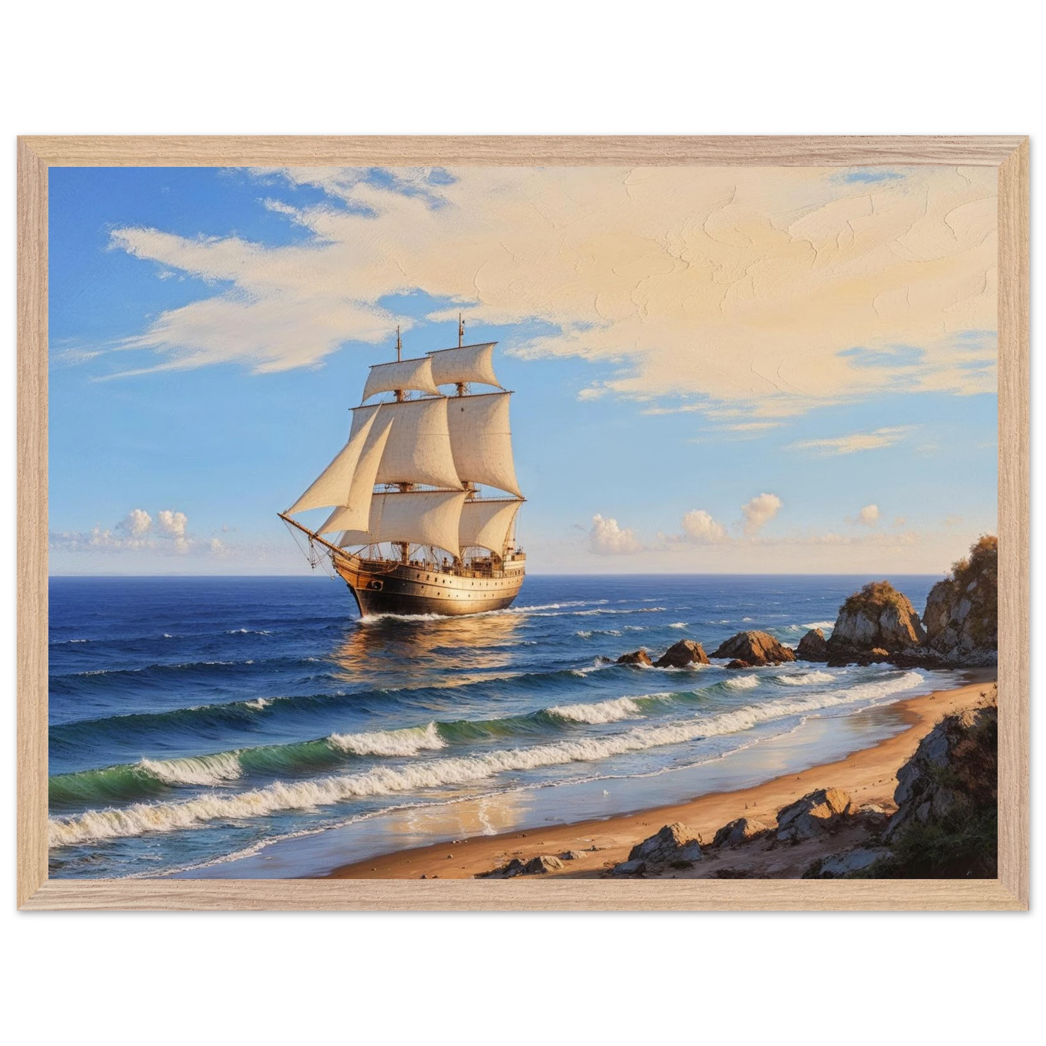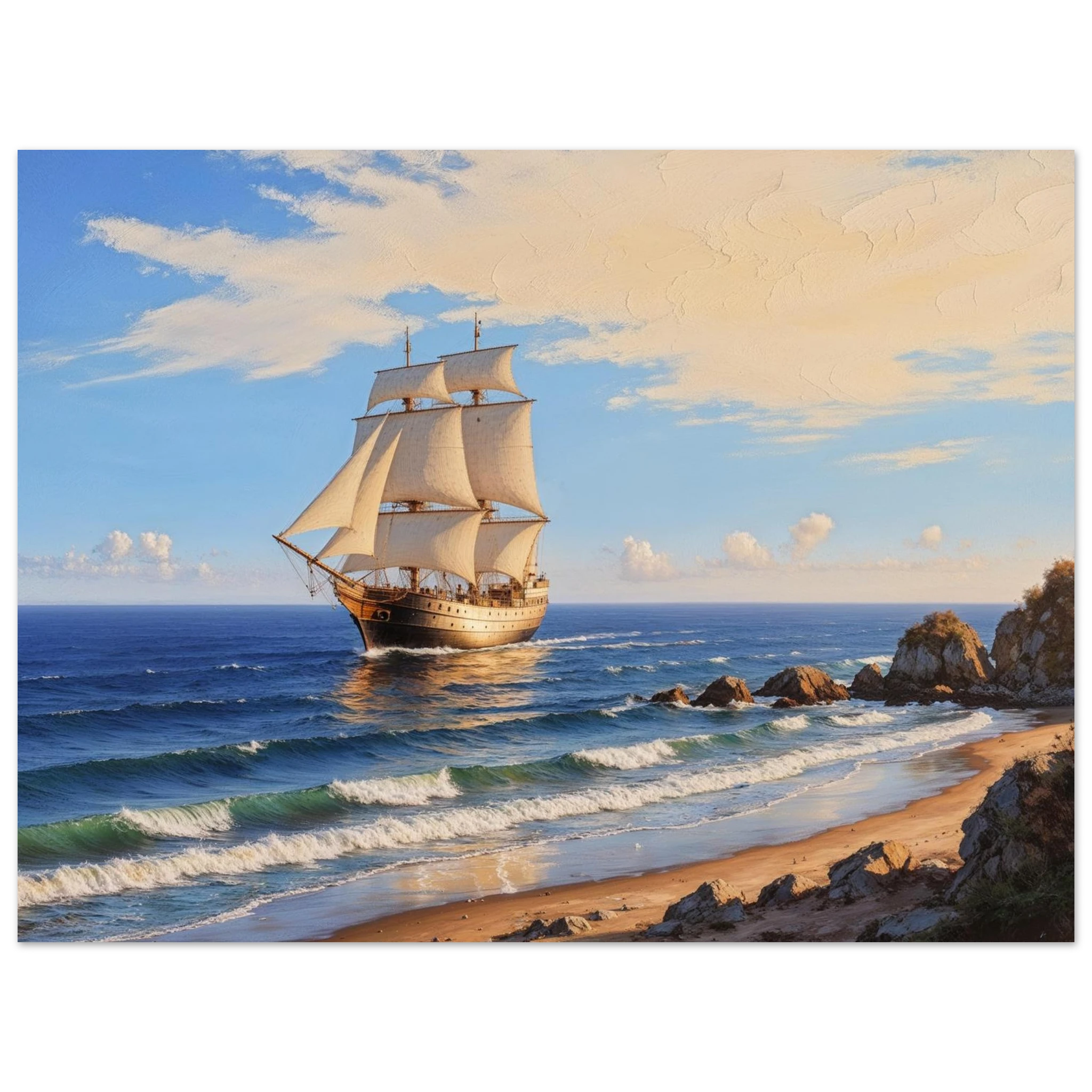 Elevate your space with this stunning art print. The artwork features a magnificent solitary ship sailing on the horizon, under a vibrant blue sky with delicate wispy clouds, on a bright, sunny day. Captured from a rocky coastline where waves gently lap the shore, the ship’s sails billow gracefully, its hull shining with a warm, golden light. The entire seascape is bathed in a soft golden hour glow, highlighting the meticulous texture. This piece evokes feelings of nostalgia and wonder, making it perfect for nautical decor, coastal themes, or anyone seeking a timeless and evocative ocean art print.