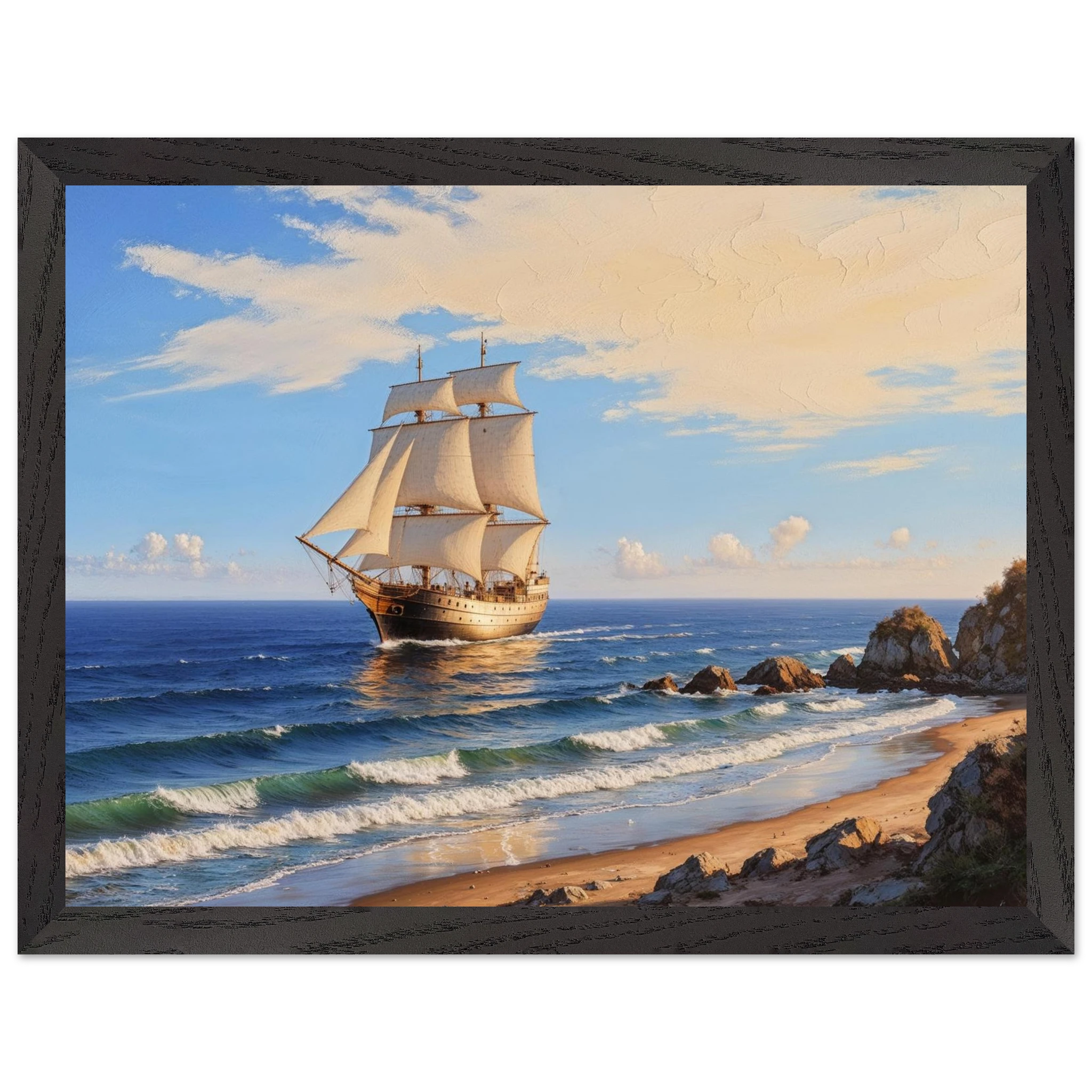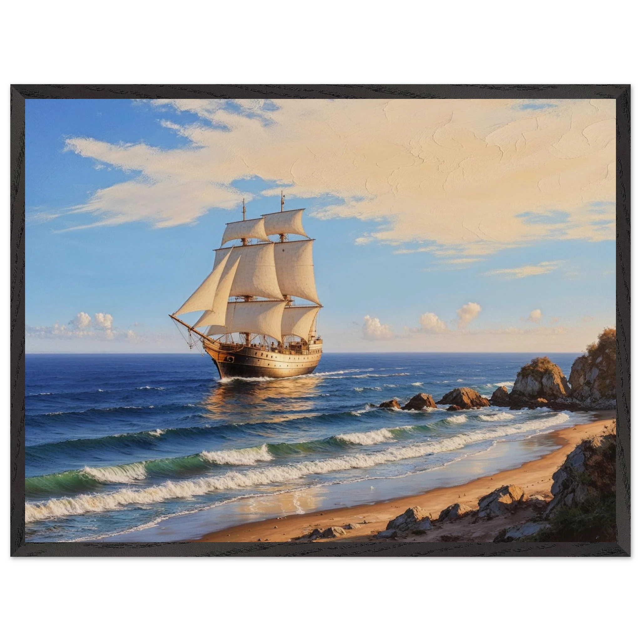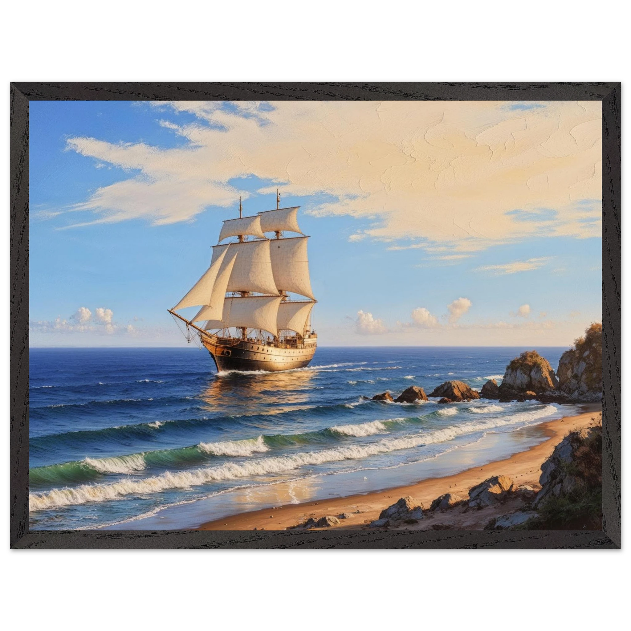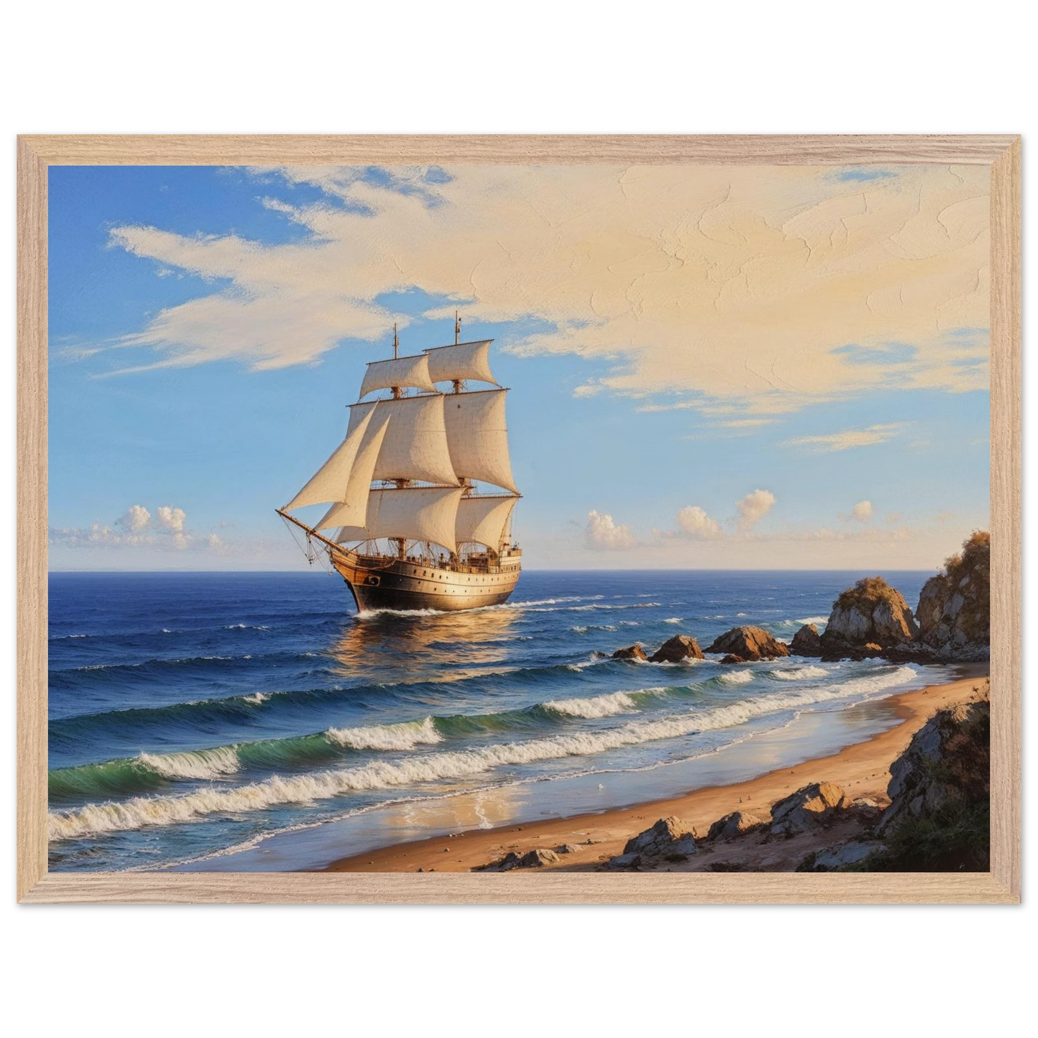 Elevate your space with this stunning art print. The artwork features a magnificent solitary ship sailing on the horizon, under a vibrant blue sky with delicate wispy clouds, on a bright, sunny day. Captured from a rocky coastline where waves gently lap the shore, the ship’s sails billow gracefully, its hull shining with a warm, golden light. The entire seascape is bathed in a soft golden hour glow, highlighting the meticulous texture. This piece evokes feelings of nostalgia and wonder, making it perfect for nautical decor, coastal themes, or anyone seeking a timeless and evocative ocean art print.