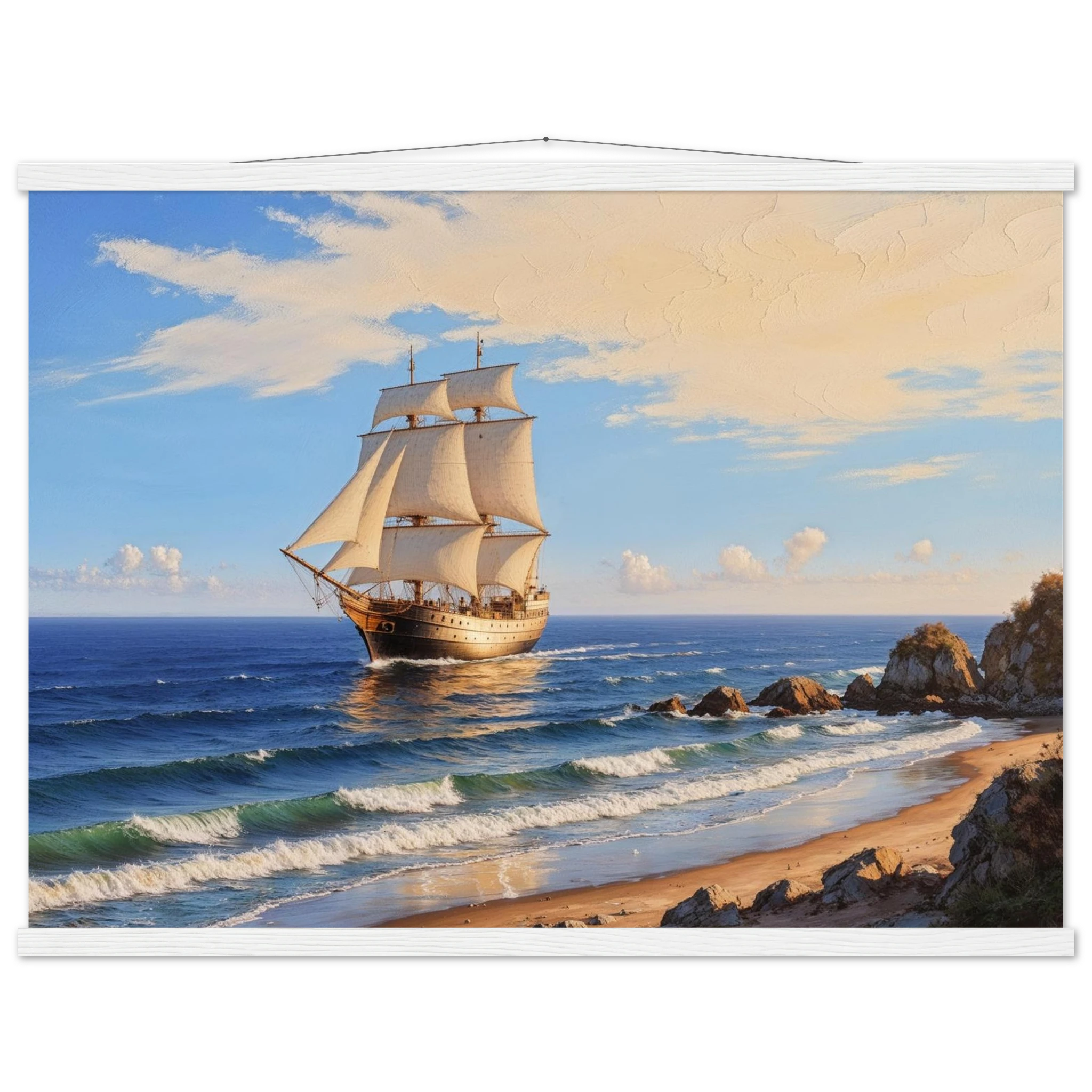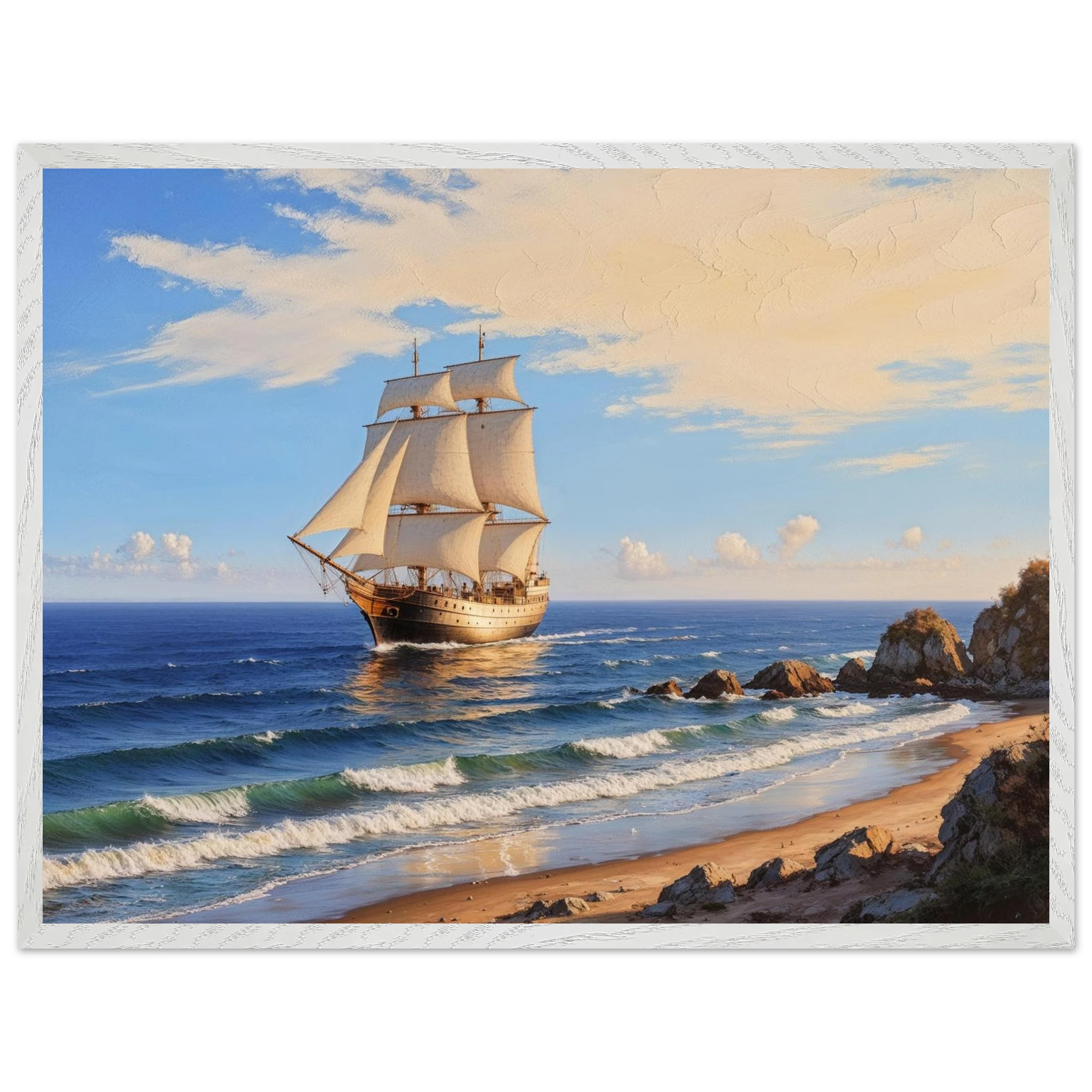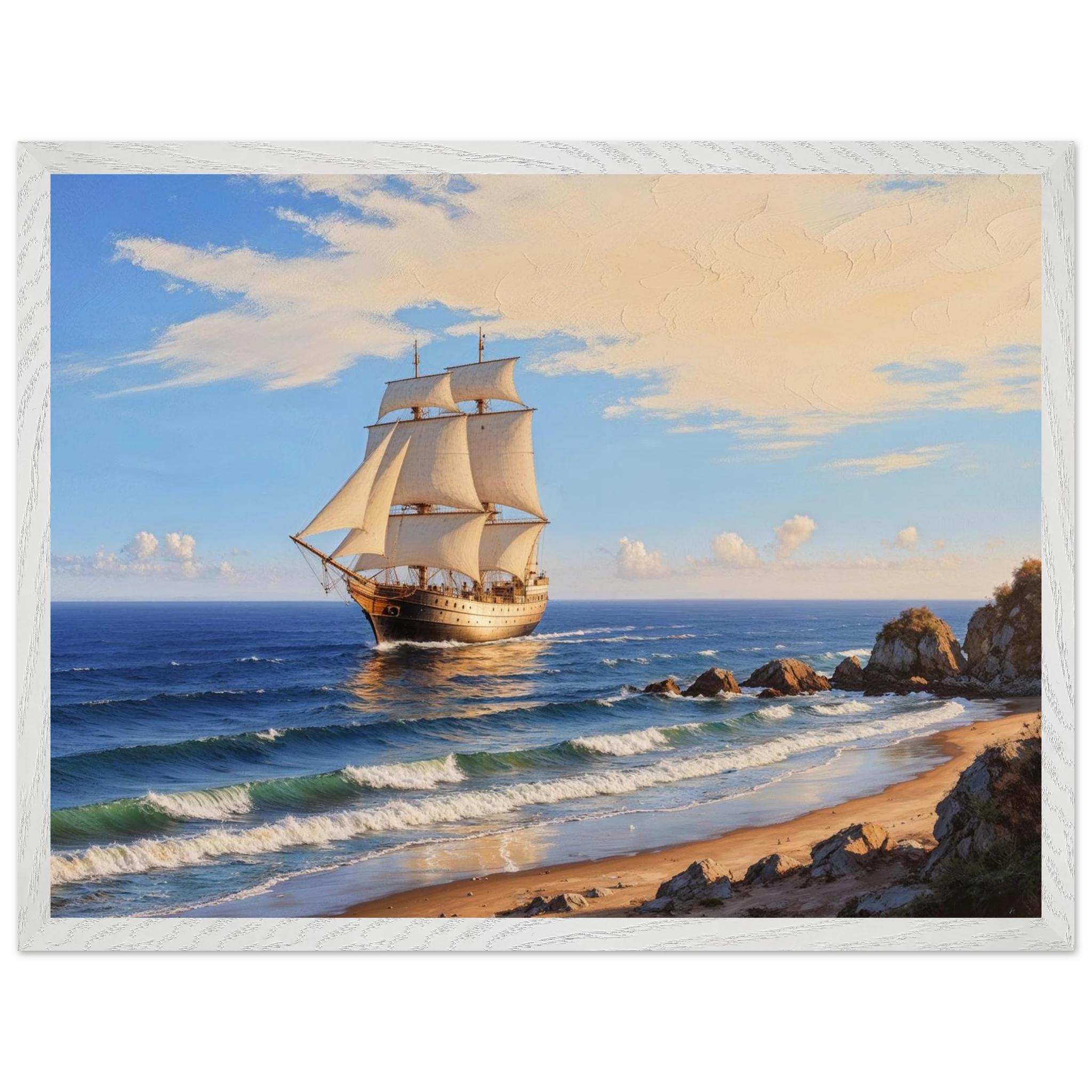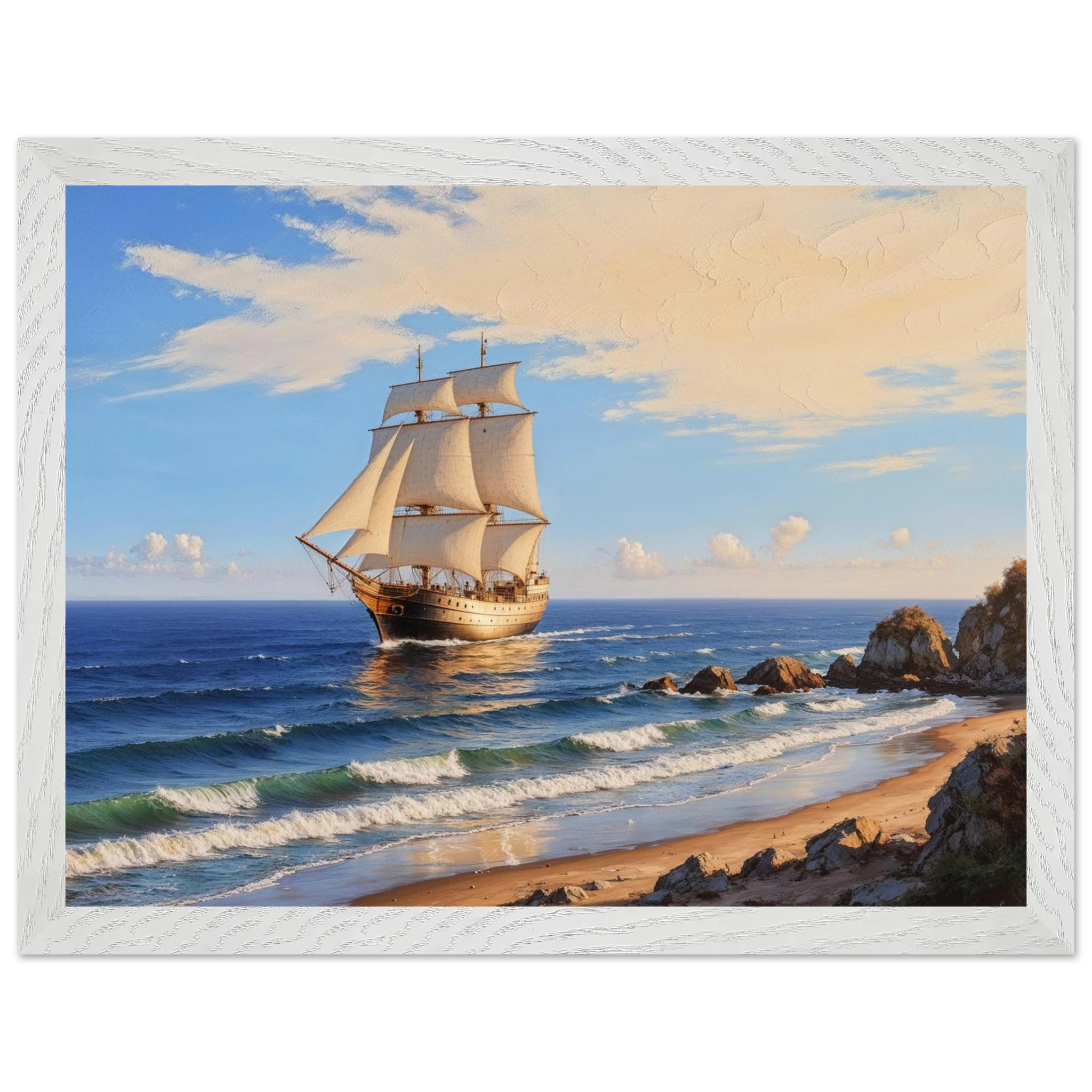 Elevate your space with this stunning art print. The artwork features a magnificent solitary ship sailing on the horizon, under a vibrant blue sky with delicate wispy clouds, on a bright, sunny day. Captured from a rocky coastline where waves gently lap the shore, the ship’s sails billow gracefully, its hull shining with a warm, golden light. The entire seascape is bathed in a soft golden hour glow, highlighting the meticulous texture. This piece evokes feelings of nostalgia and wonder, making it perfect for nautical decor, coastal themes, or anyone seeking a timeless and evocative ocean art print.