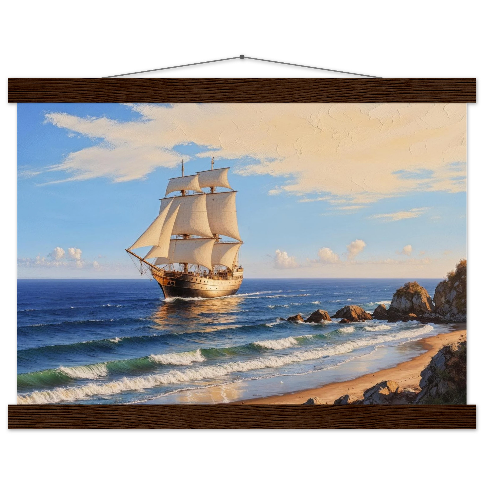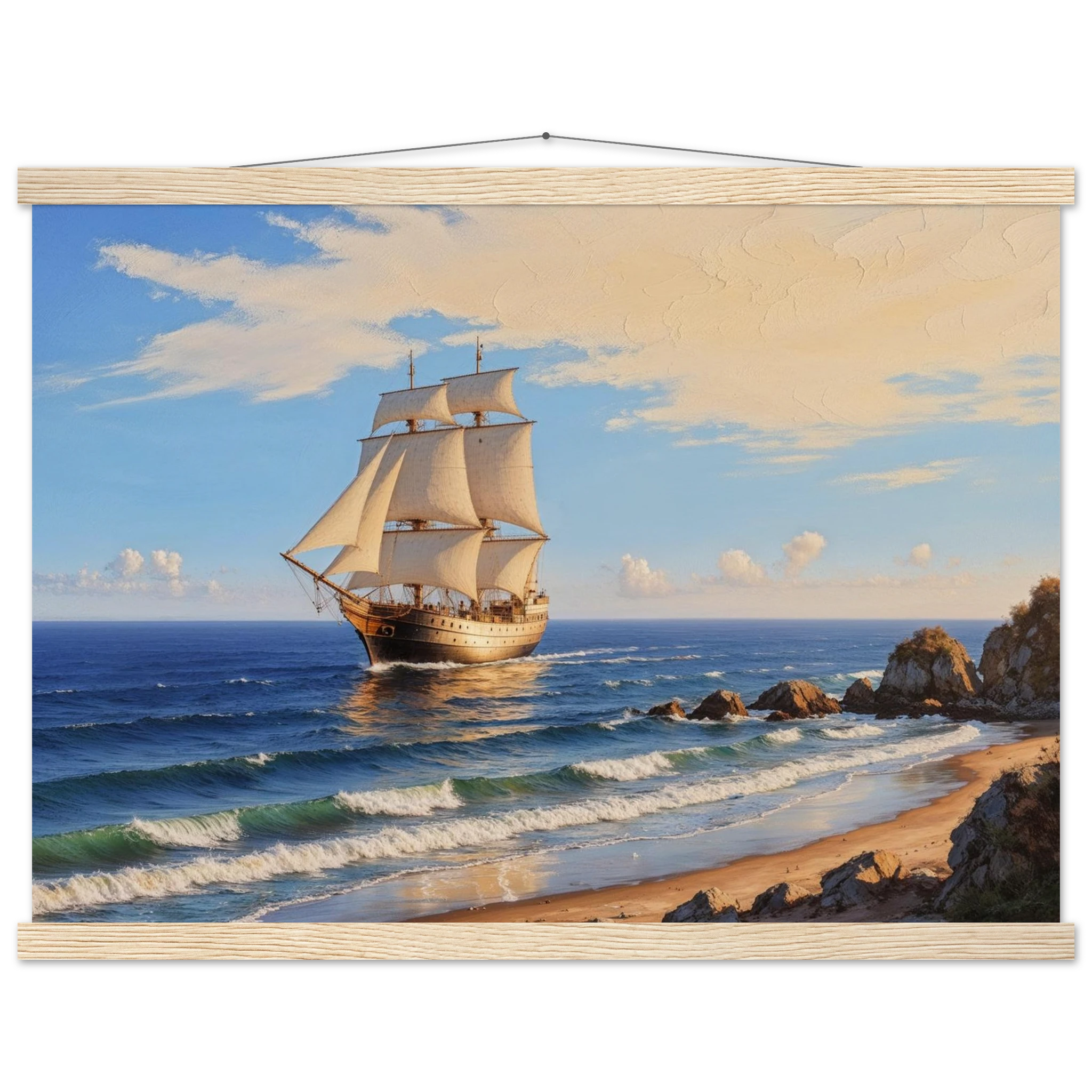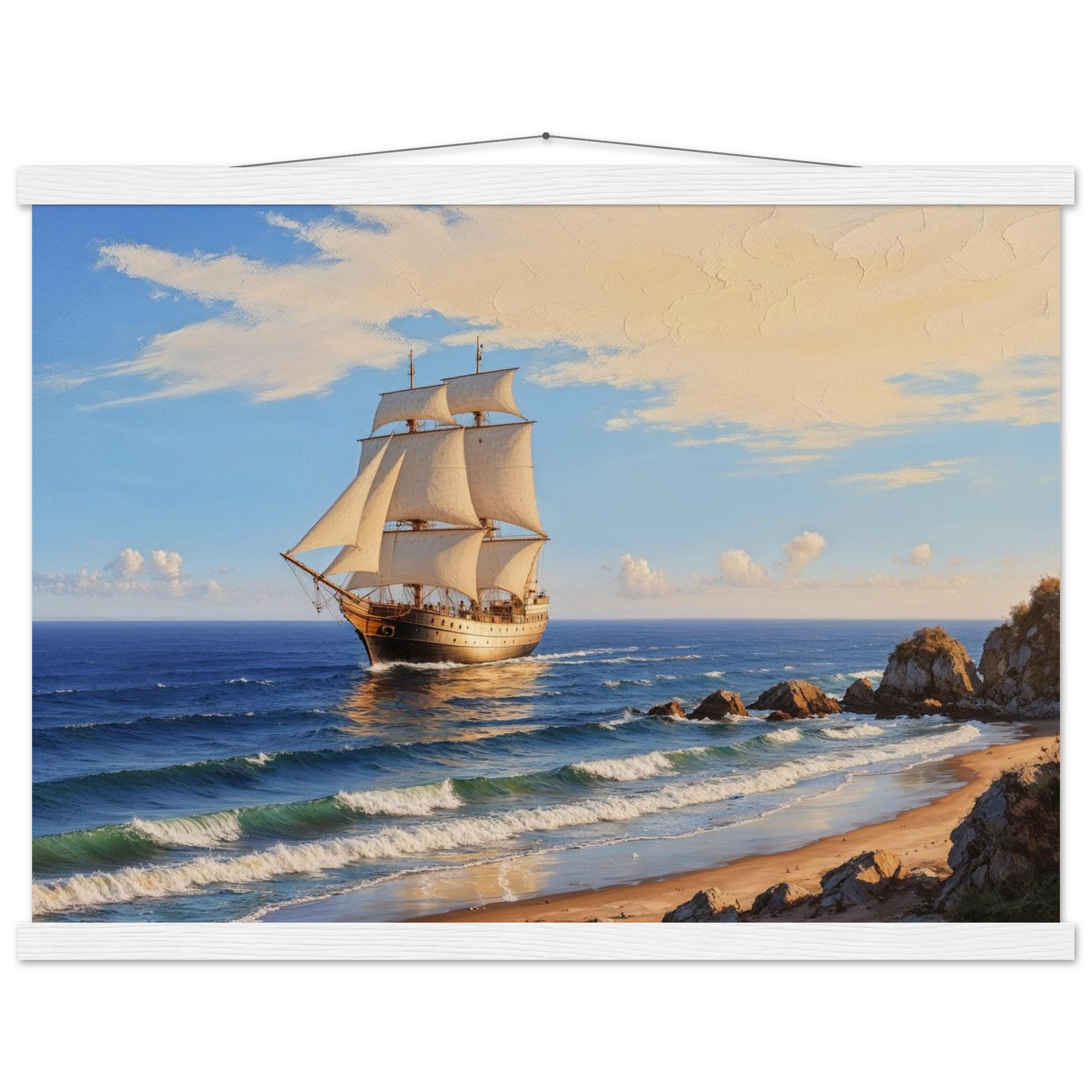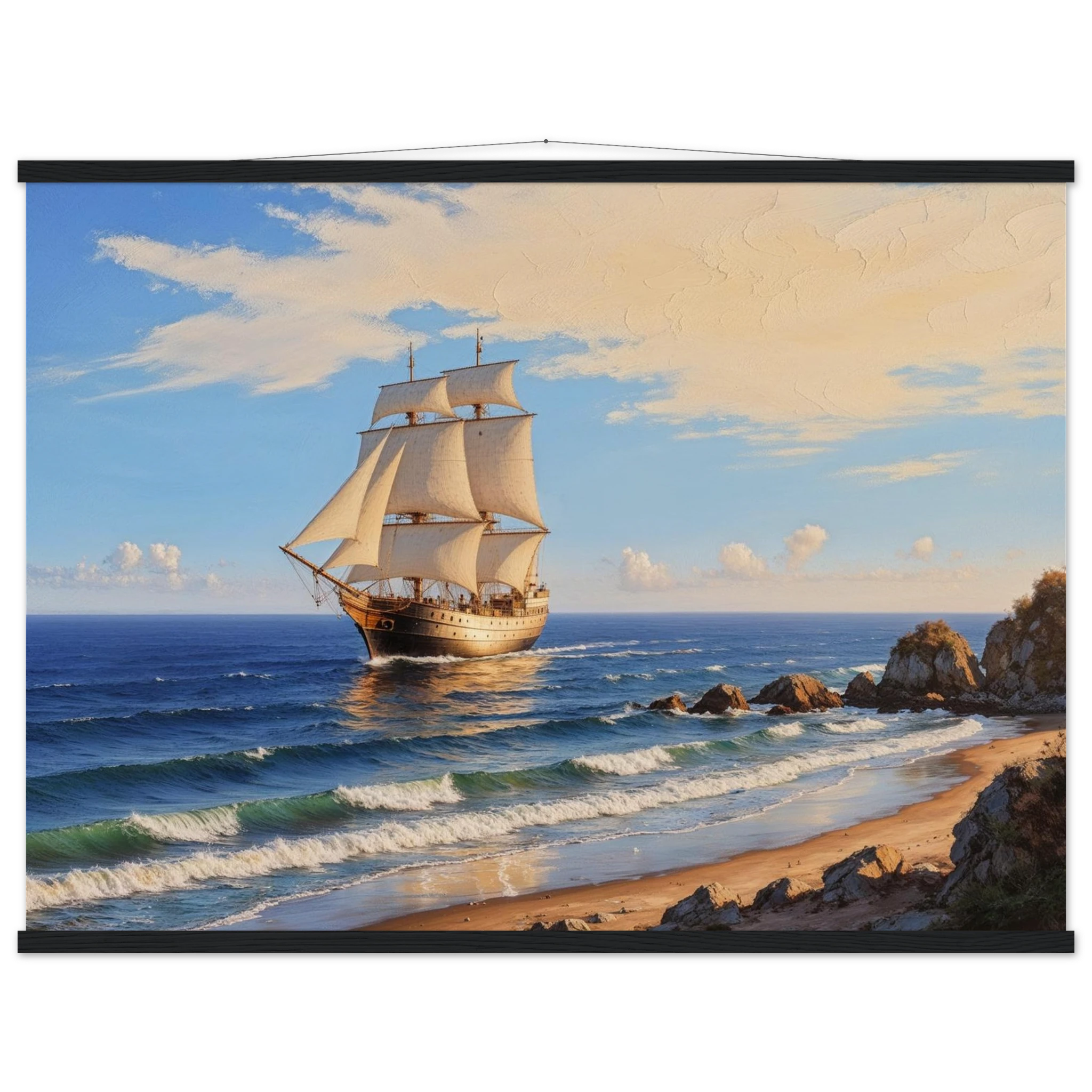 Elevate your space with this stunning art print. The artwork features a magnificent solitary ship sailing on the horizon, under a vibrant blue sky with delicate wispy clouds, on a bright, sunny day. Captured from a rocky coastline where waves gently lap the shore, the ship’s sails billow gracefully, its hull shining with a warm, golden light. The entire seascape is bathed in a soft golden hour glow, highlighting the meticulous texture. This piece evokes feelings of nostalgia and wonder, making it perfect for nautical decor, coastal themes, or anyone seeking a timeless and evocative ocean art print.