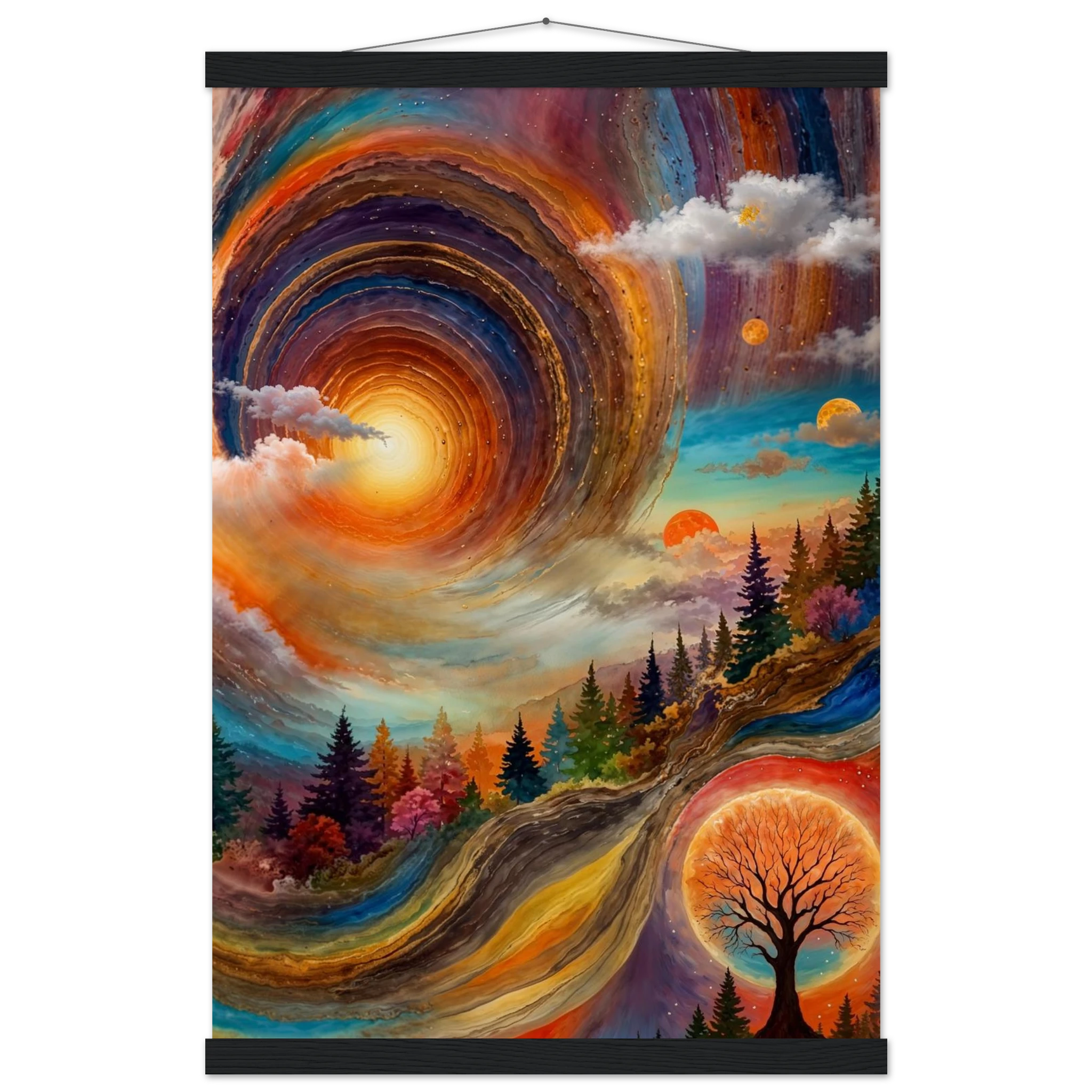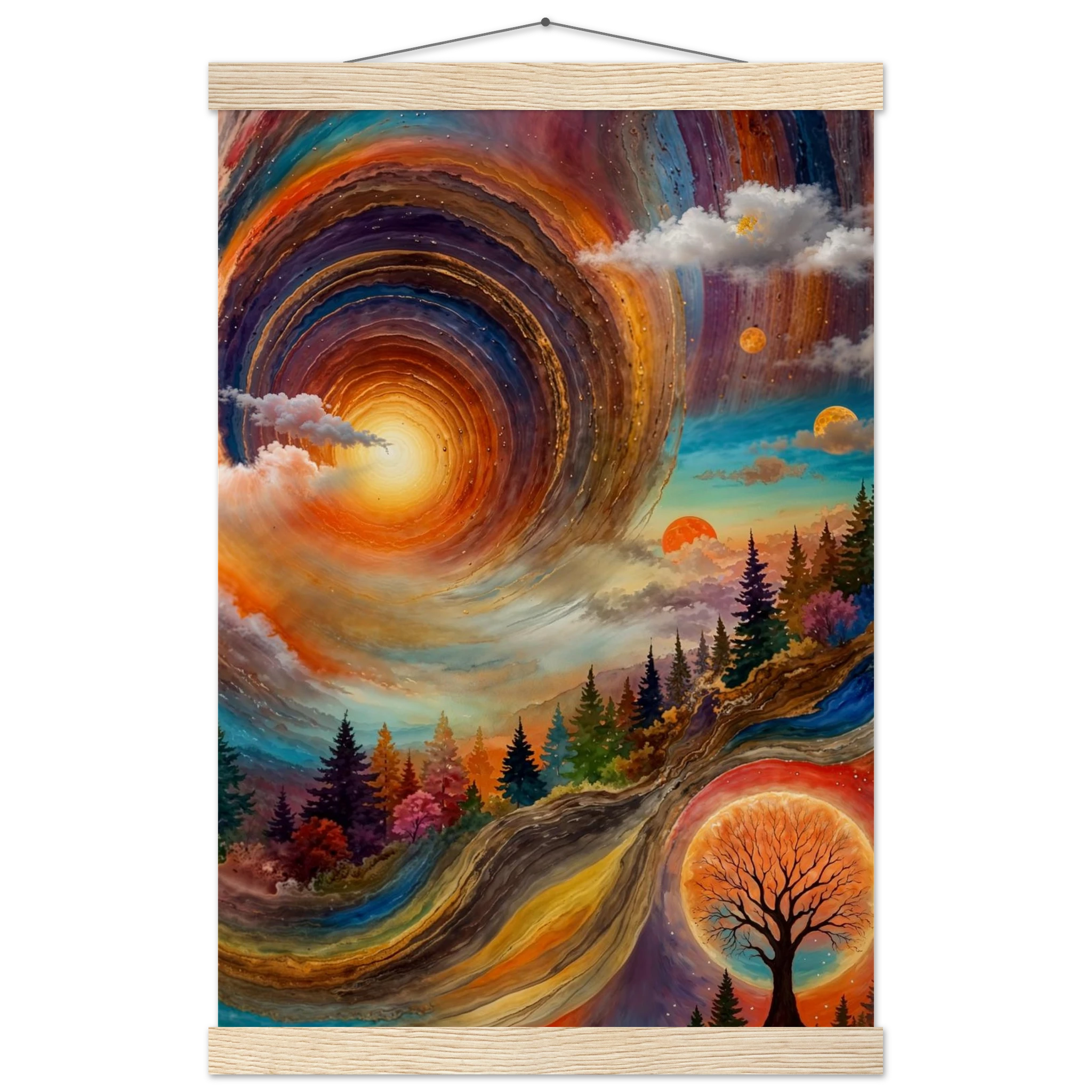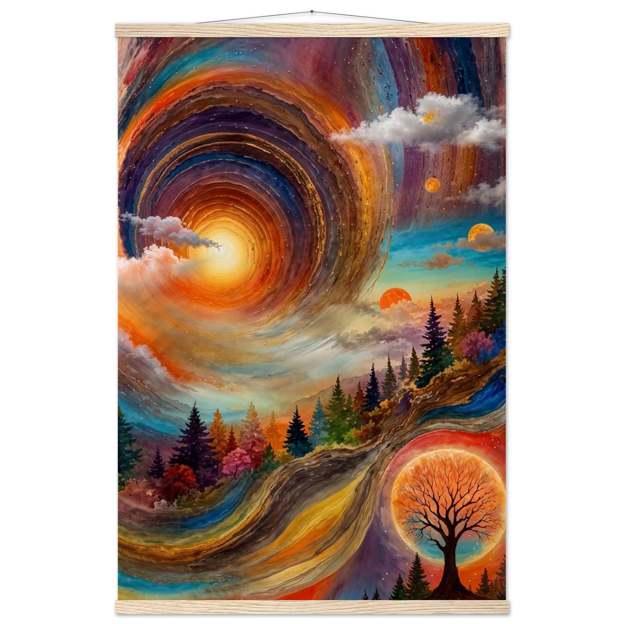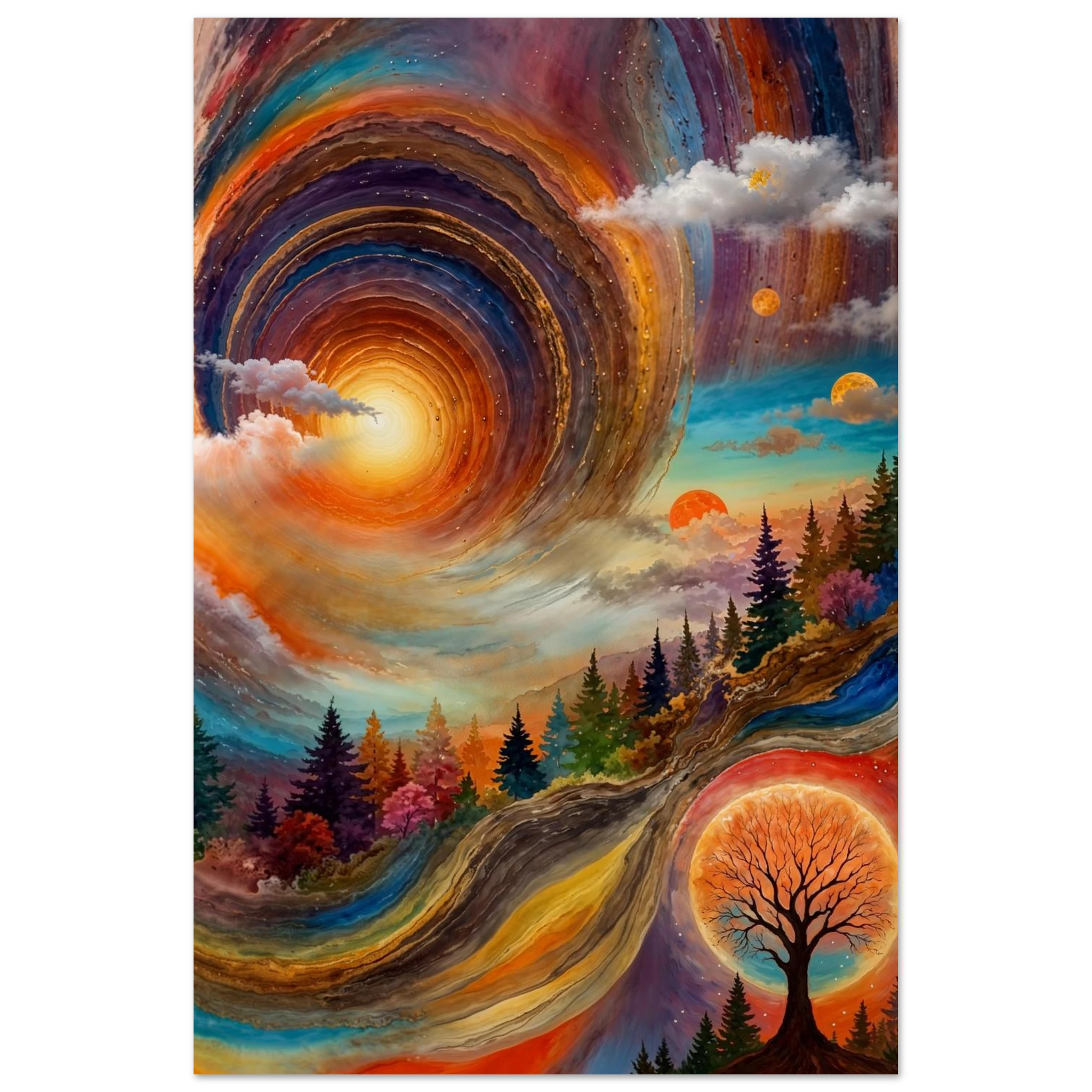 Immerse yourself in a dynamic dreamscape with this vibrant, surreal abstract painting. The eye is immediately drawn to the vortex-like spiral in the upper left, composed of dynamic, concentric rings in cool blues, purples, and pinks. Below the swirling clouds, a stunning landscape features stylised red, orange, and green trees. The scene is completed by a large, glowing orange sun setting behind a silhouetted tree, creating a striking contrast. This piece offers a harmonious blend of cool and warm tones, evoking a profound sense of fantasy and cosmic movement. Perfect for adding a psychedelic, abstract statement to any modern or expressive decor.