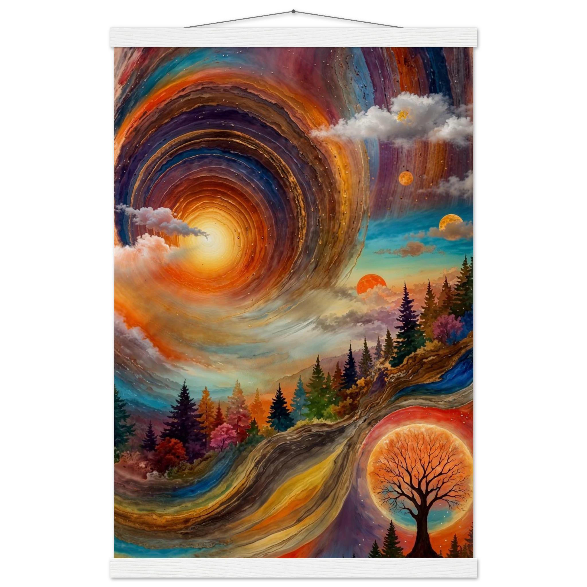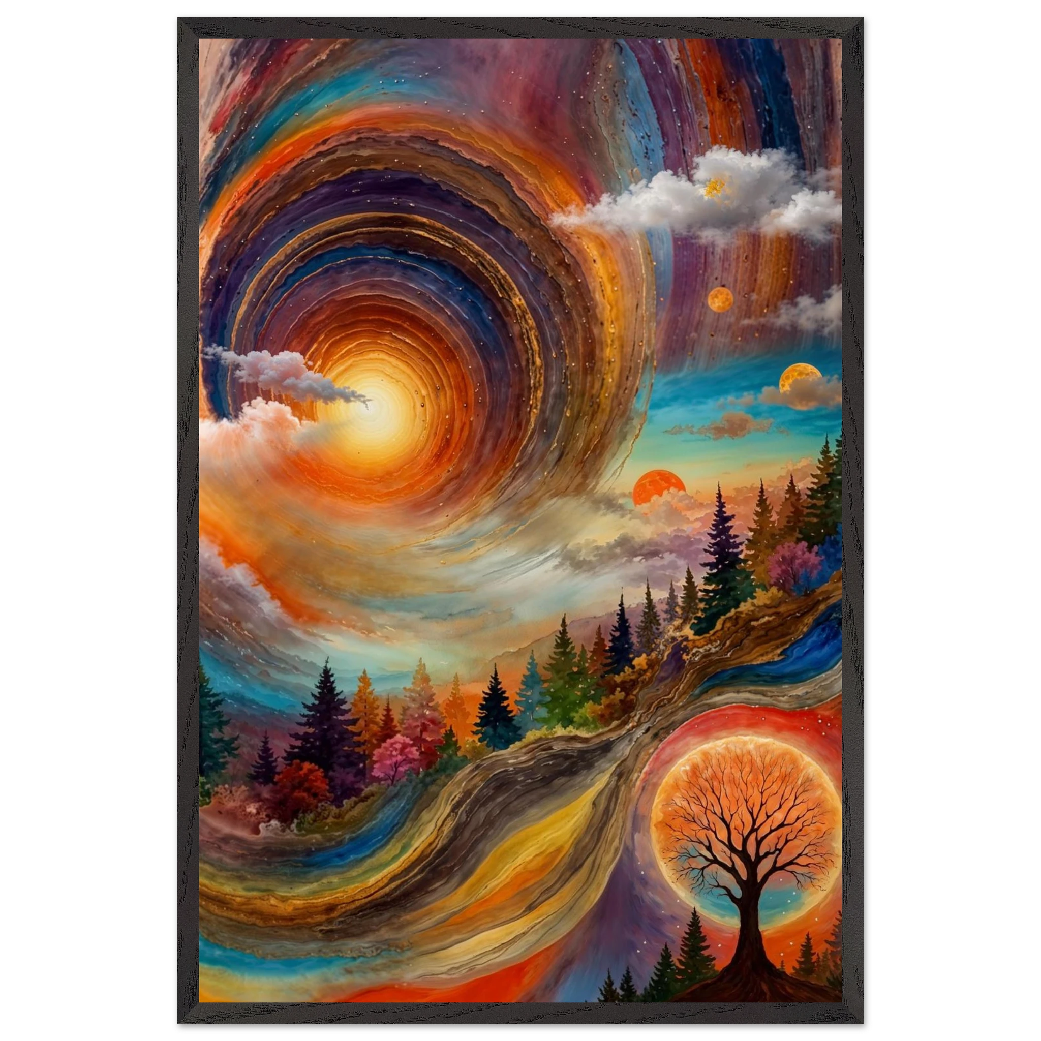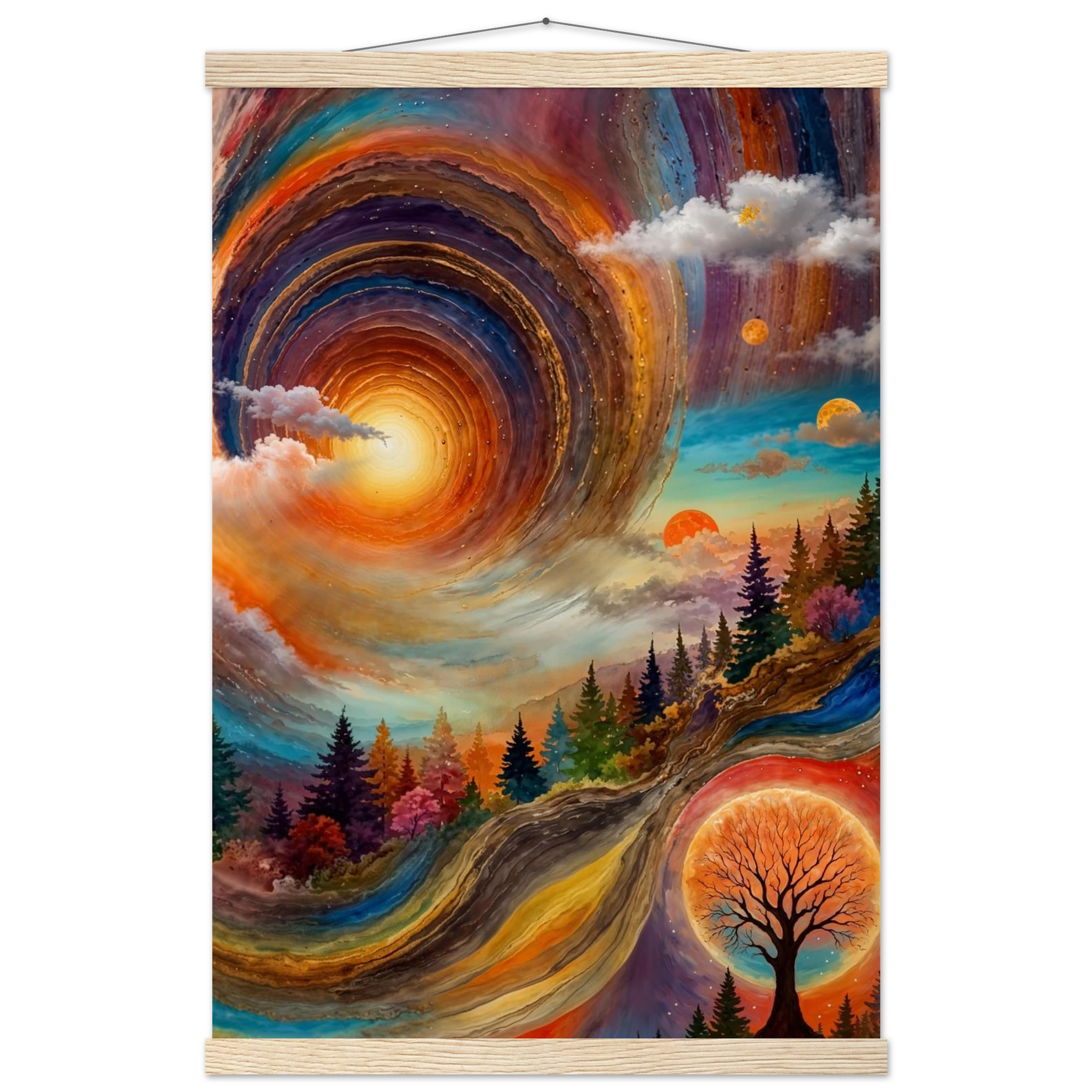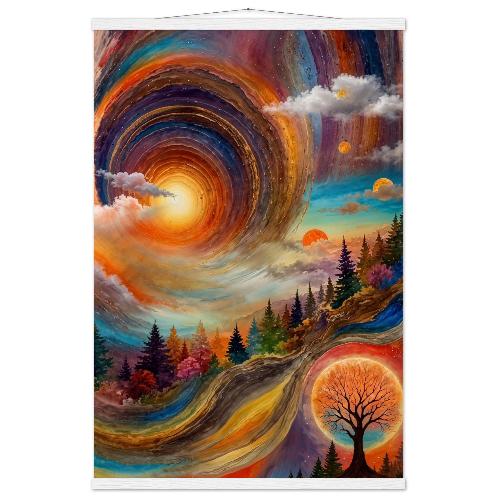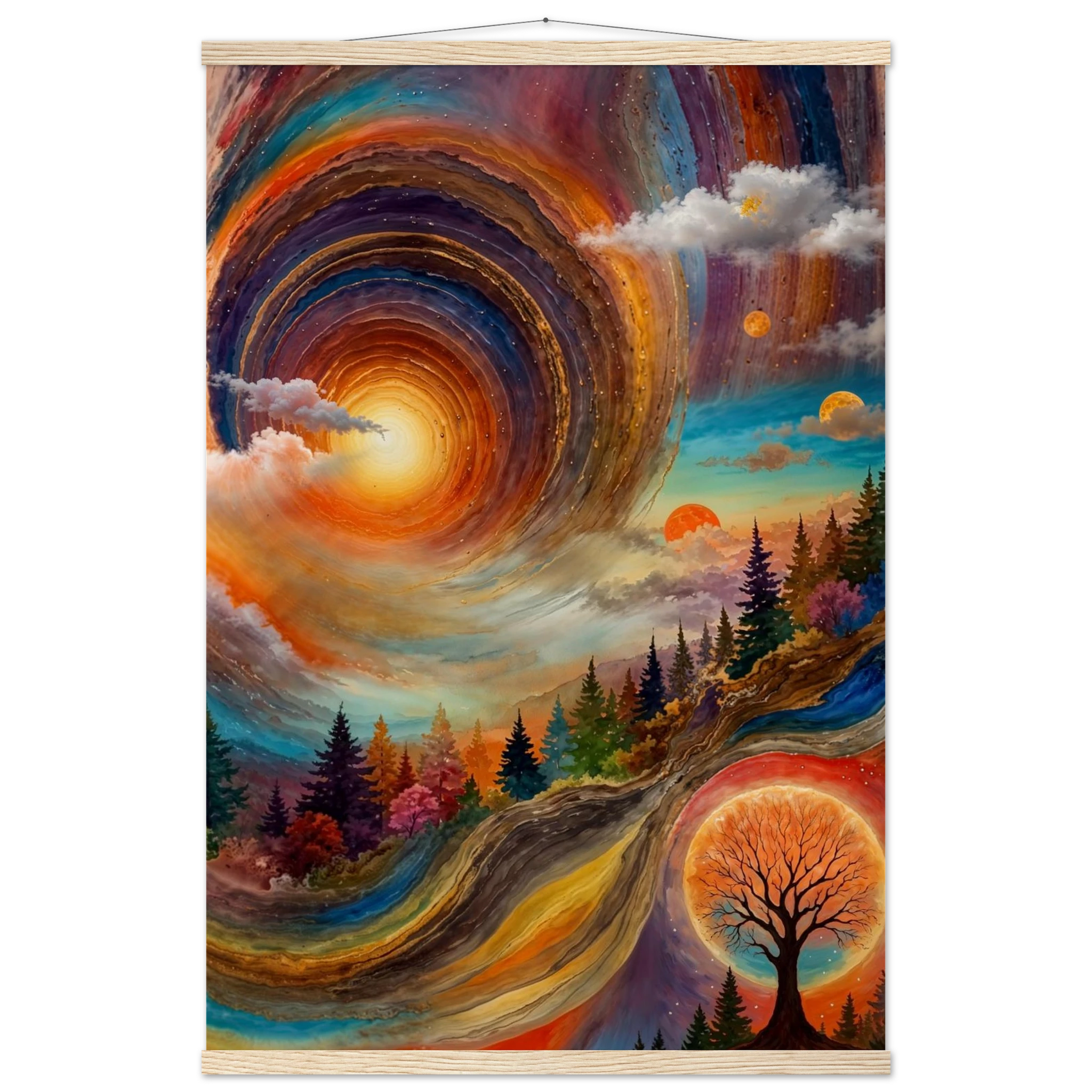Immerse yourself in a dynamic dreamscape with this vibrant, surreal abstract painting. The eye is immediately drawn to the vortex-like spiral in the upper left, composed of dynamic, concentric rings in cool blues, purples, and pinks. Below the swirling clouds, a stunning landscape features stylised red, orange, and green trees. The scene is completed by a large, glowing orange sun setting behind a silhouetted tree, creating a striking contrast. This piece offers a harmonious blend of cool and warm tones, evoking a profound sense of fantasy and cosmic movement. Perfect for adding a psychedelic, abstract statement to any modern or expressive decor.