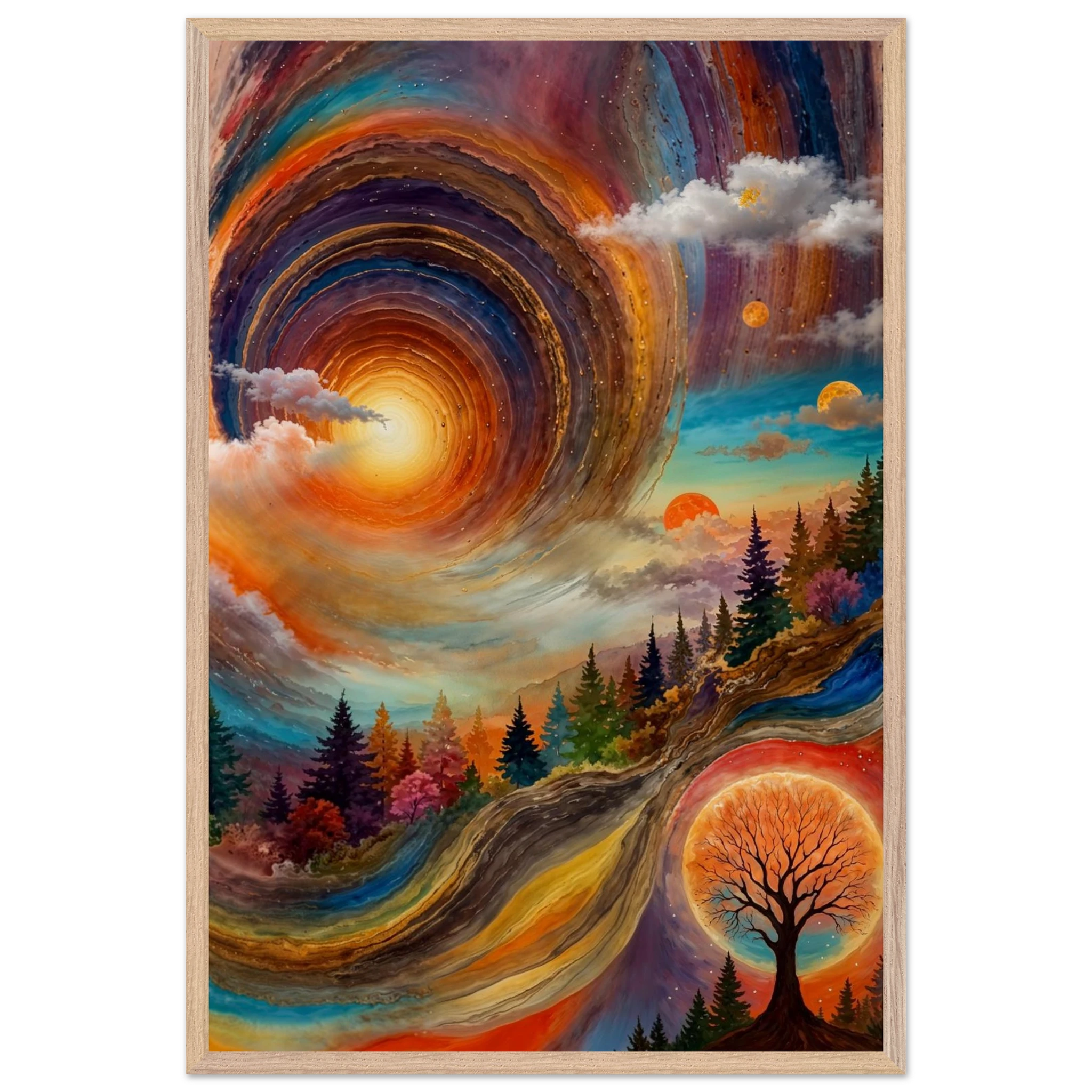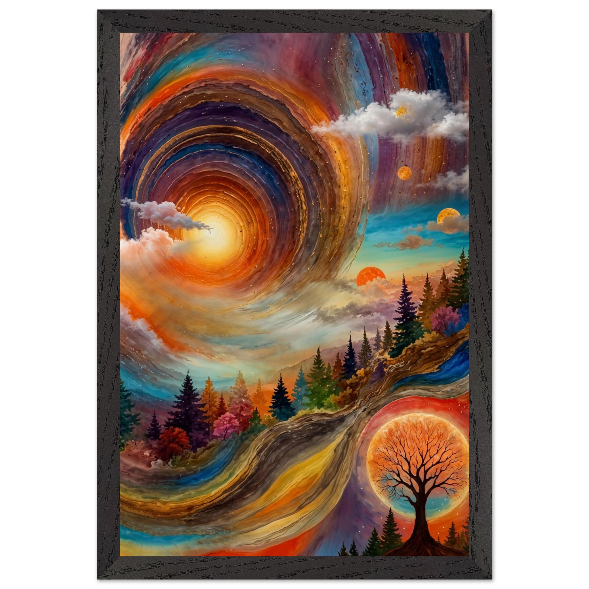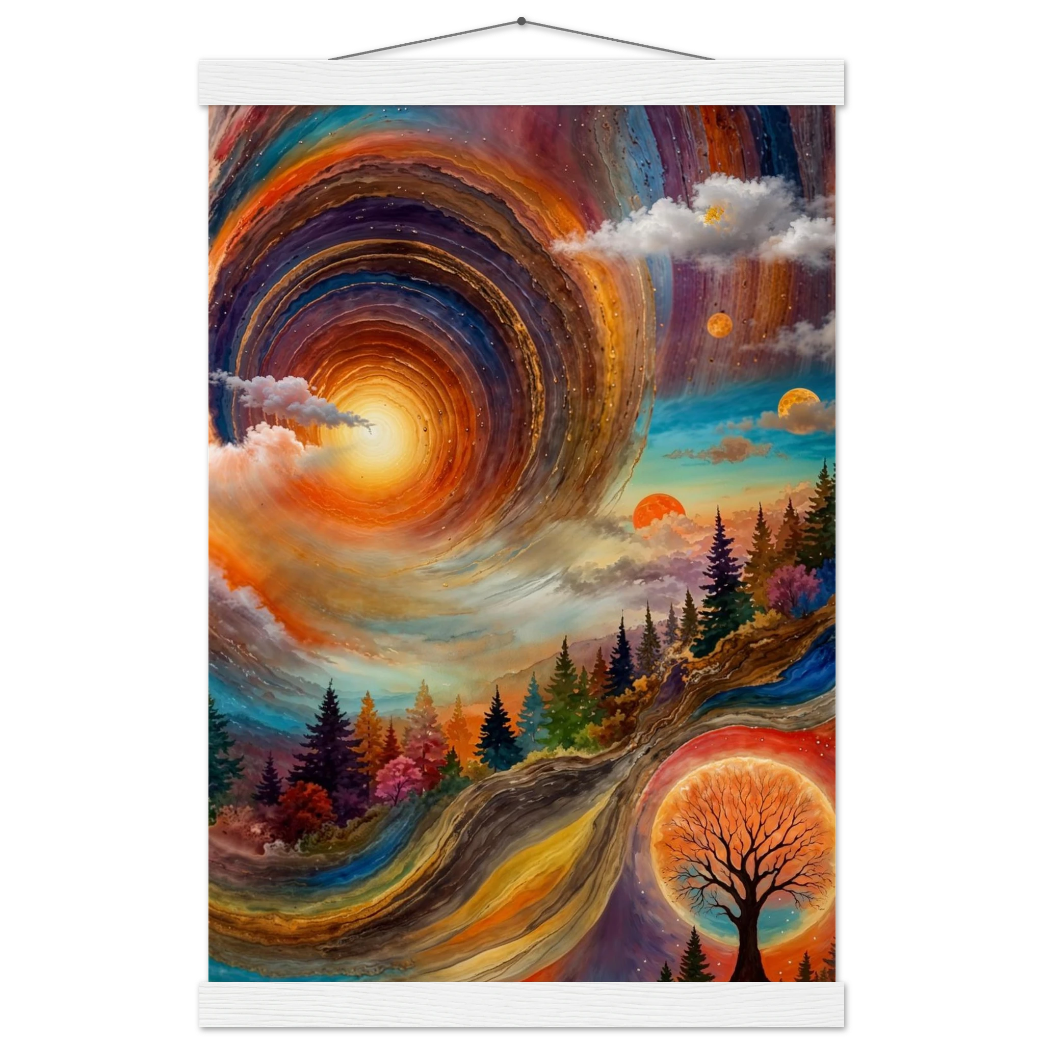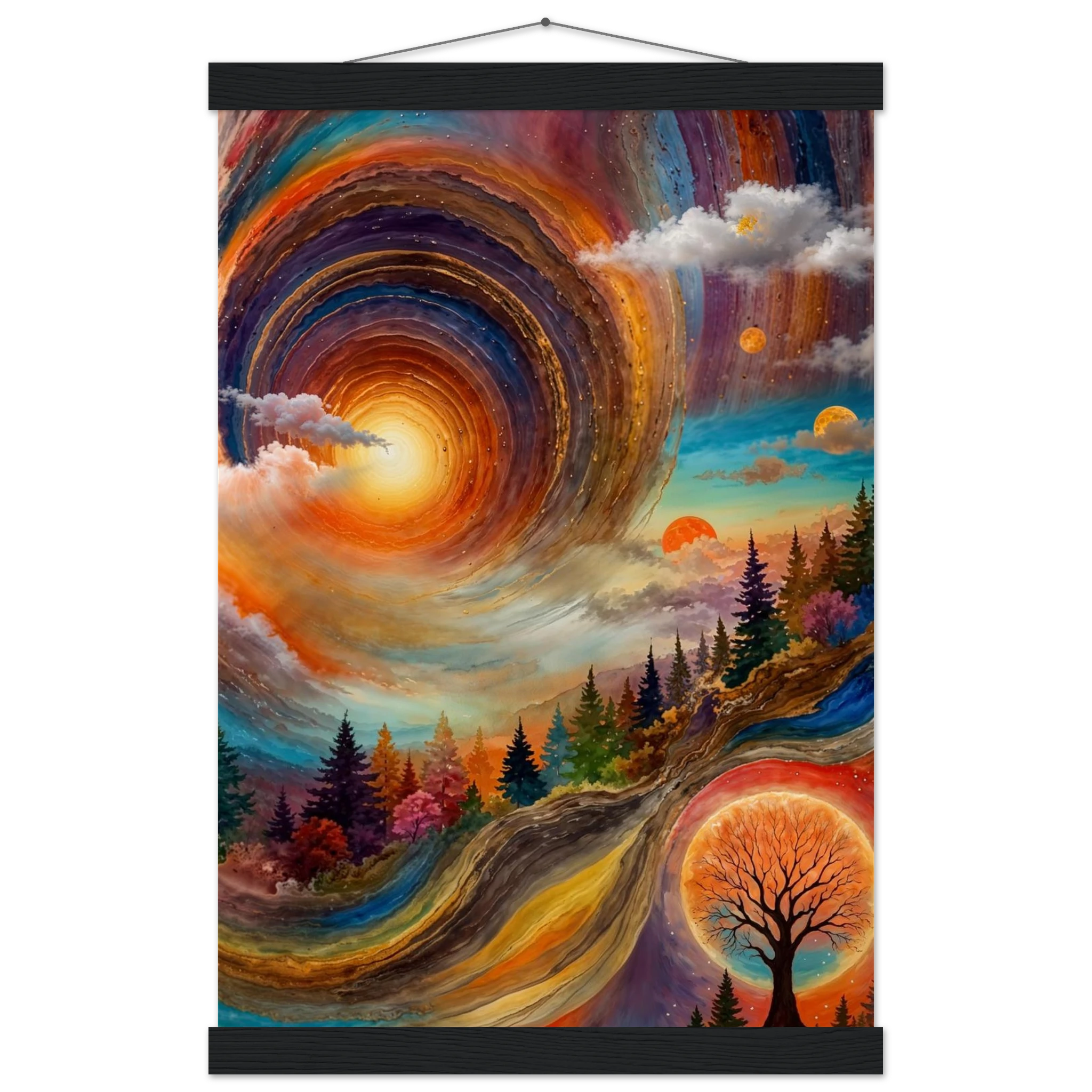 Immerse yourself in a dynamic dreamscape with this vibrant, surreal abstract painting. The eye is immediately drawn to the vortex-like spiral in the upper left, composed of dynamic, concentric rings in cool blues, purples, and pinks. Below the swirling clouds, a stunning landscape features stylised red, orange, and green trees. The scene is completed by a large, glowing orange sun setting behind a silhouetted tree, creating a striking contrast. This piece offers a harmonious blend of cool and warm tones, evoking a profound sense of fantasy and cosmic movement. Perfect for adding a psychedelic, abstract statement to any modern or expressive decor.