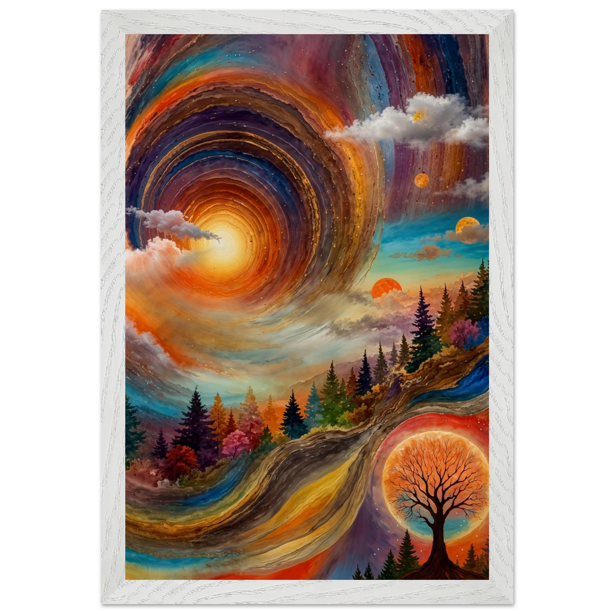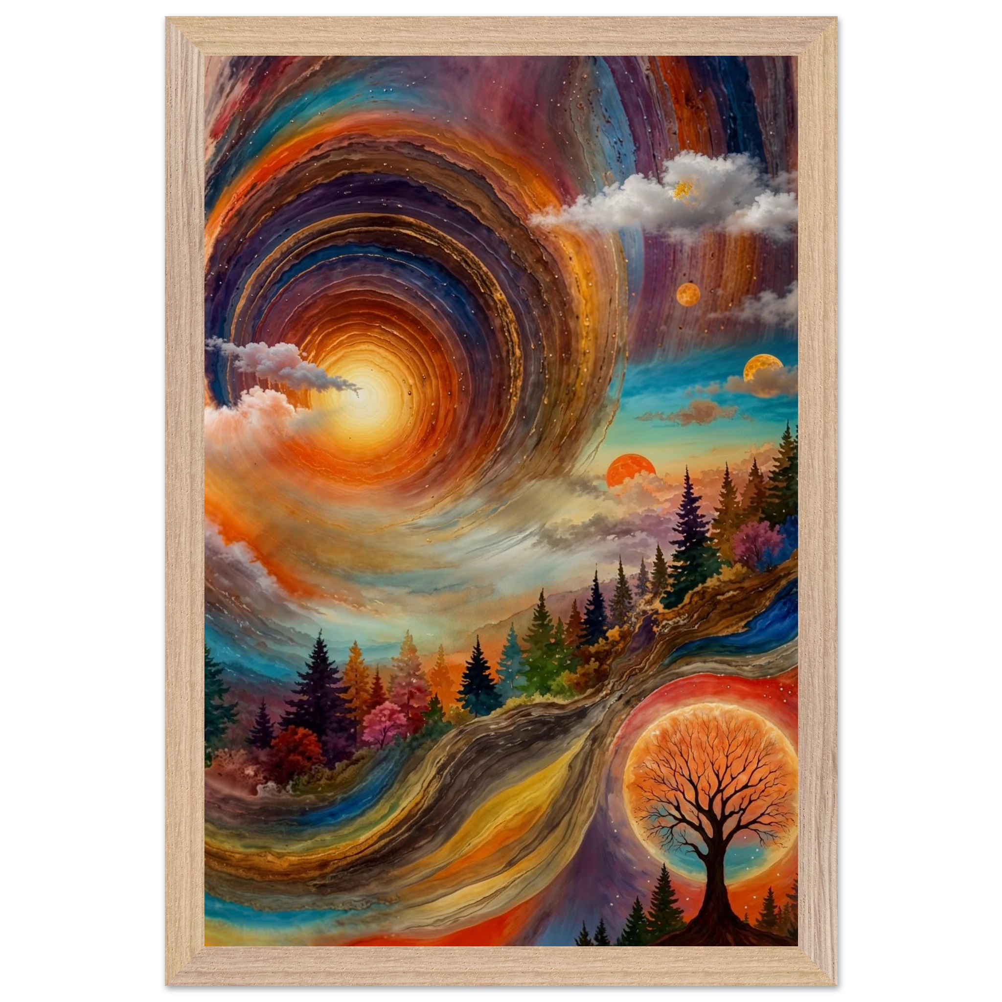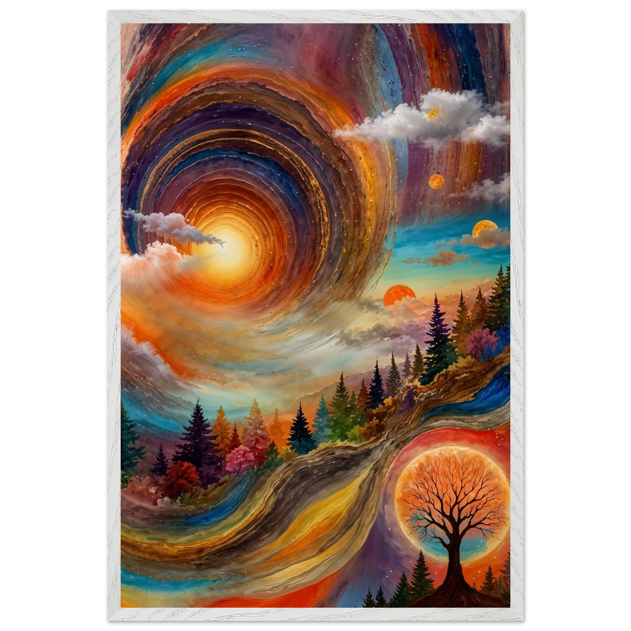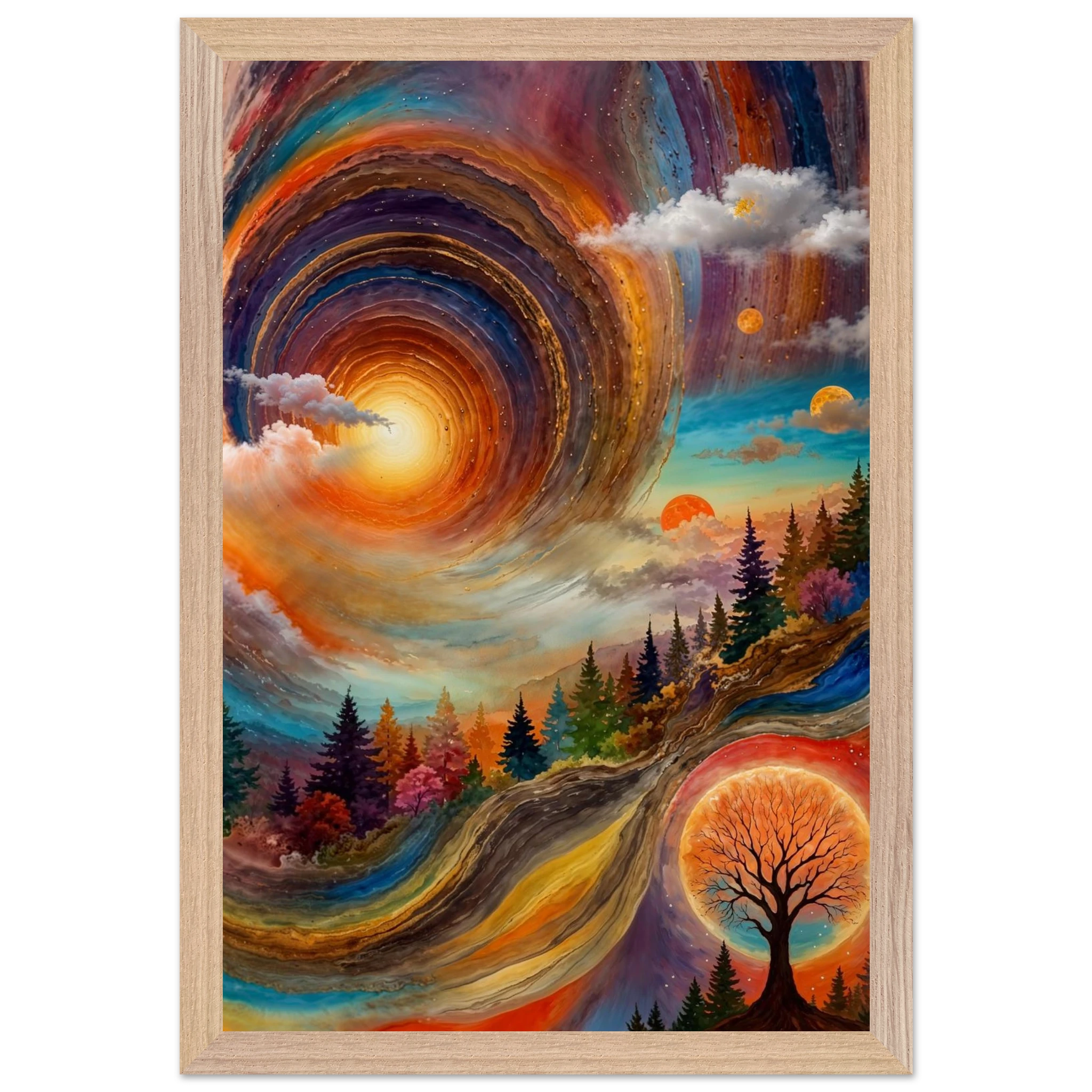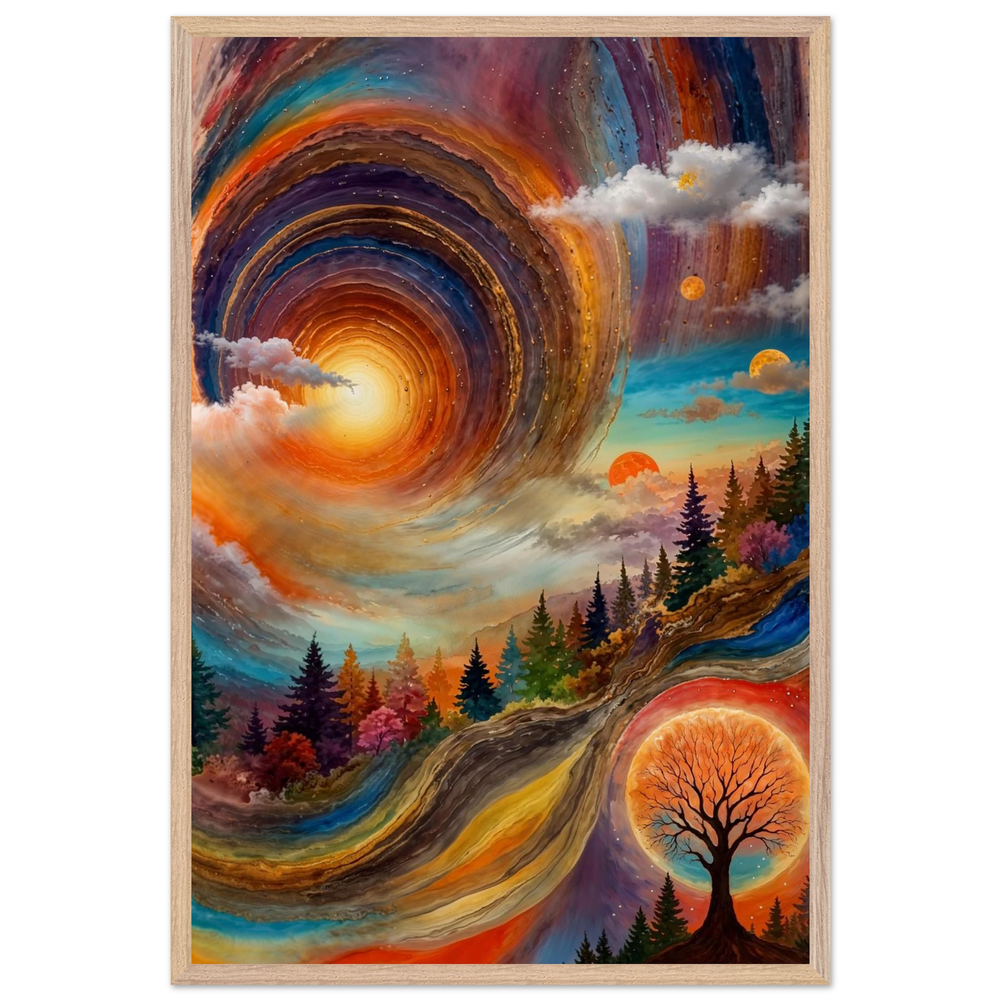 Immerse yourself in a dynamic dreamscape with this vibrant, surreal abstract painting. The eye is immediately drawn to the vortex-like spiral in the upper left, composed of dynamic, concentric rings in cool blues, purples, and pinks. Below the swirling clouds, a stunning landscape features stylised red, orange, and green trees. The scene is completed by a large, glowing orange sun setting behind a silhouetted tree, creating a striking contrast. This piece offers a harmonious blend of cool and warm tones, evoking a profound sense of fantasy and cosmic movement. Perfect for adding a psychedelic, abstract statement to any modern or expressive decor.