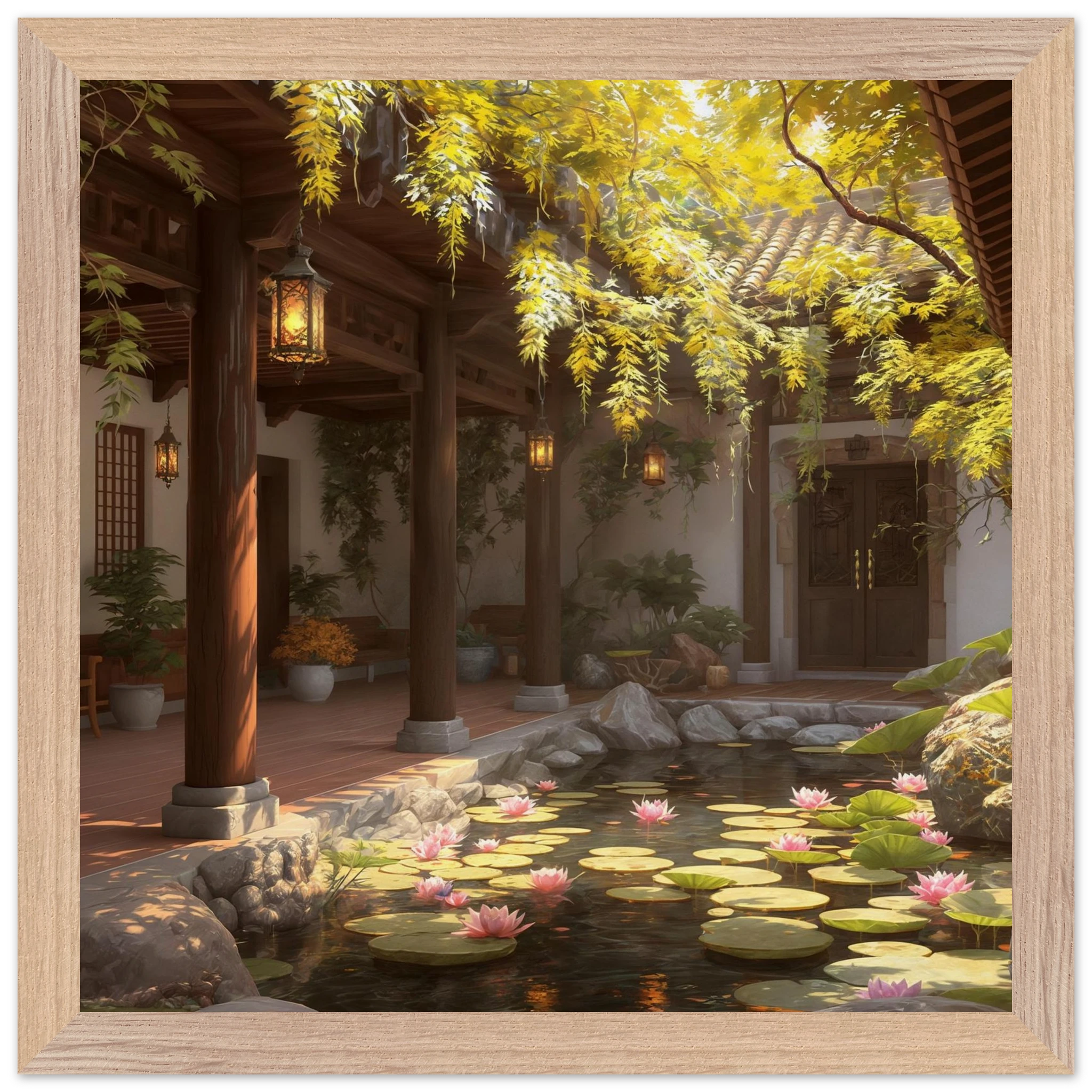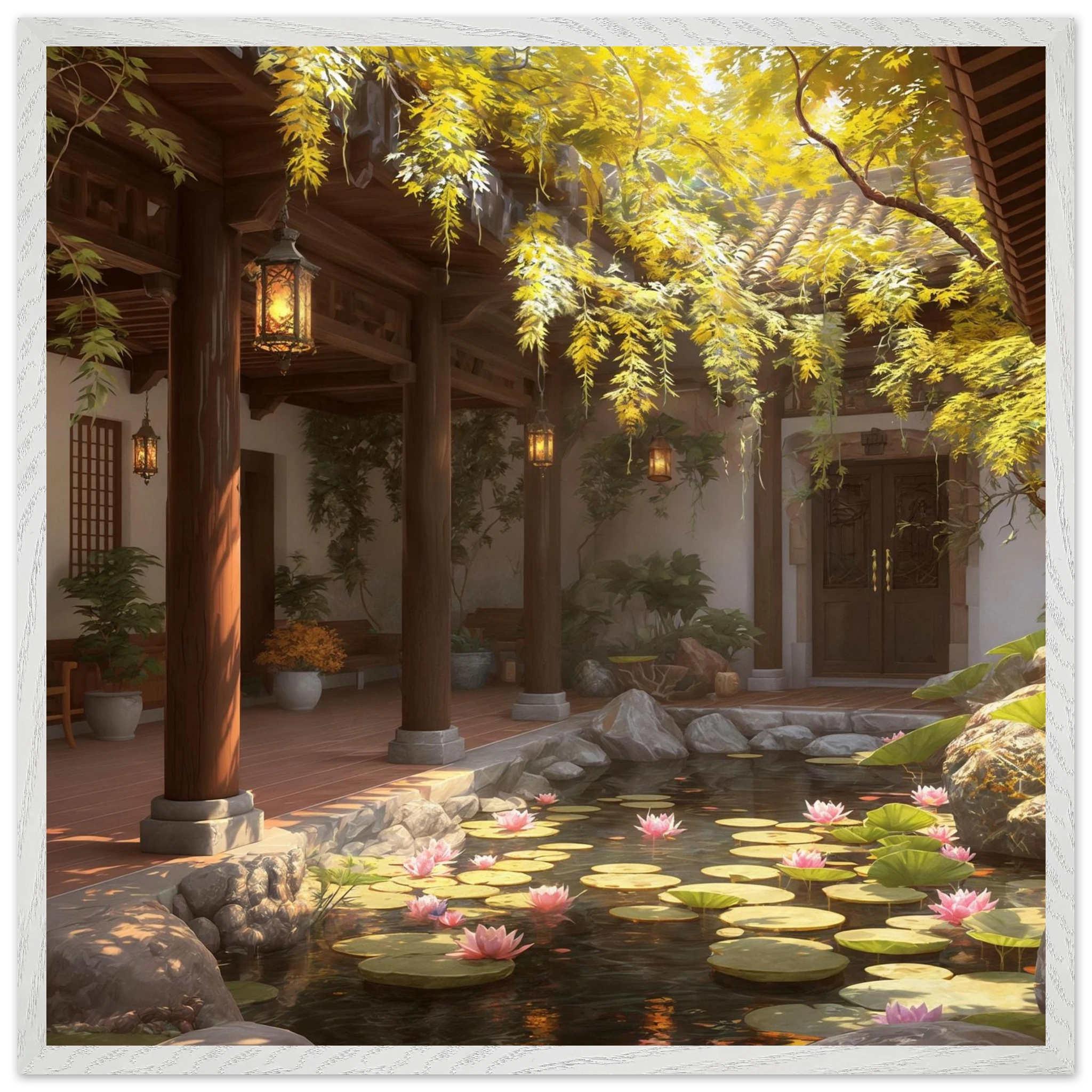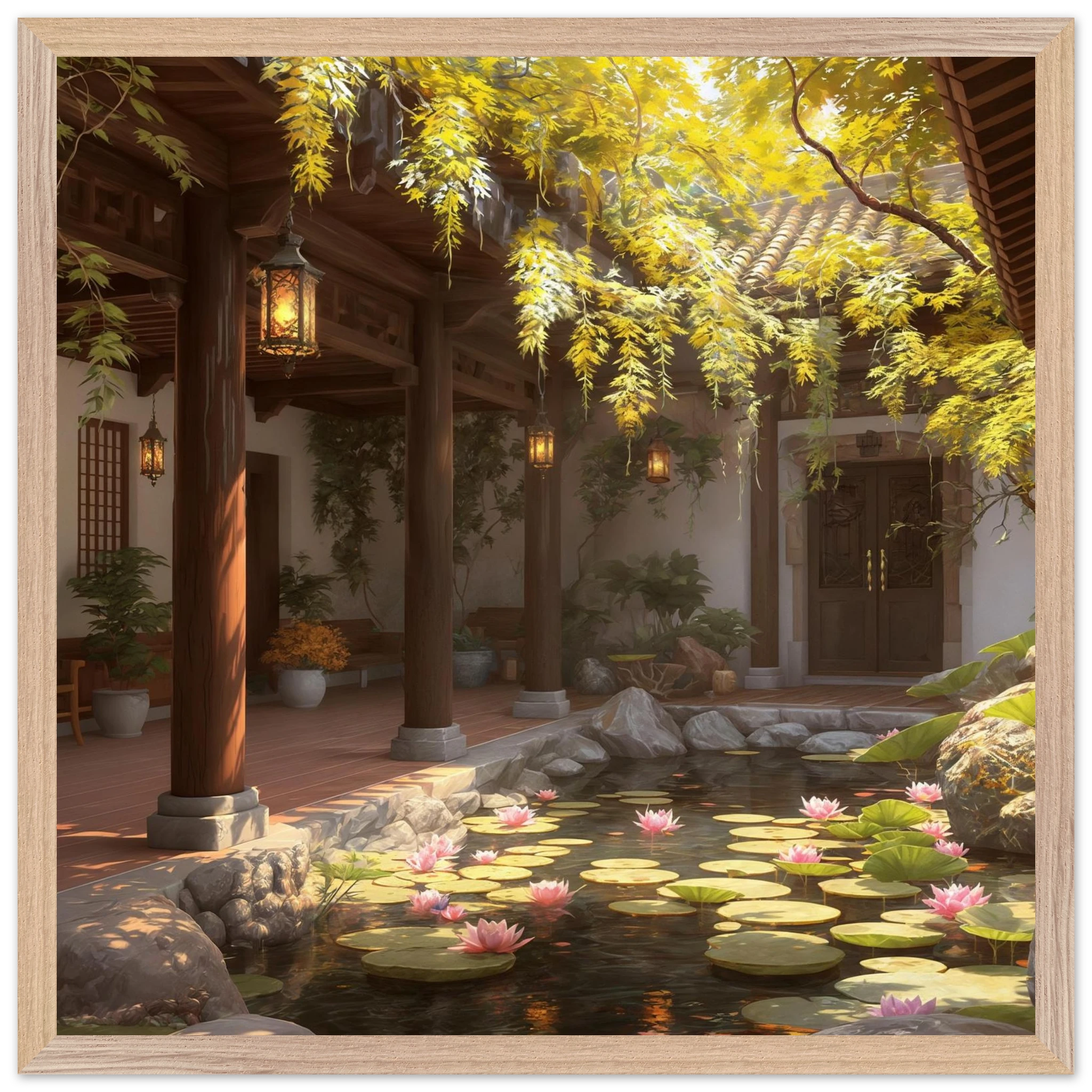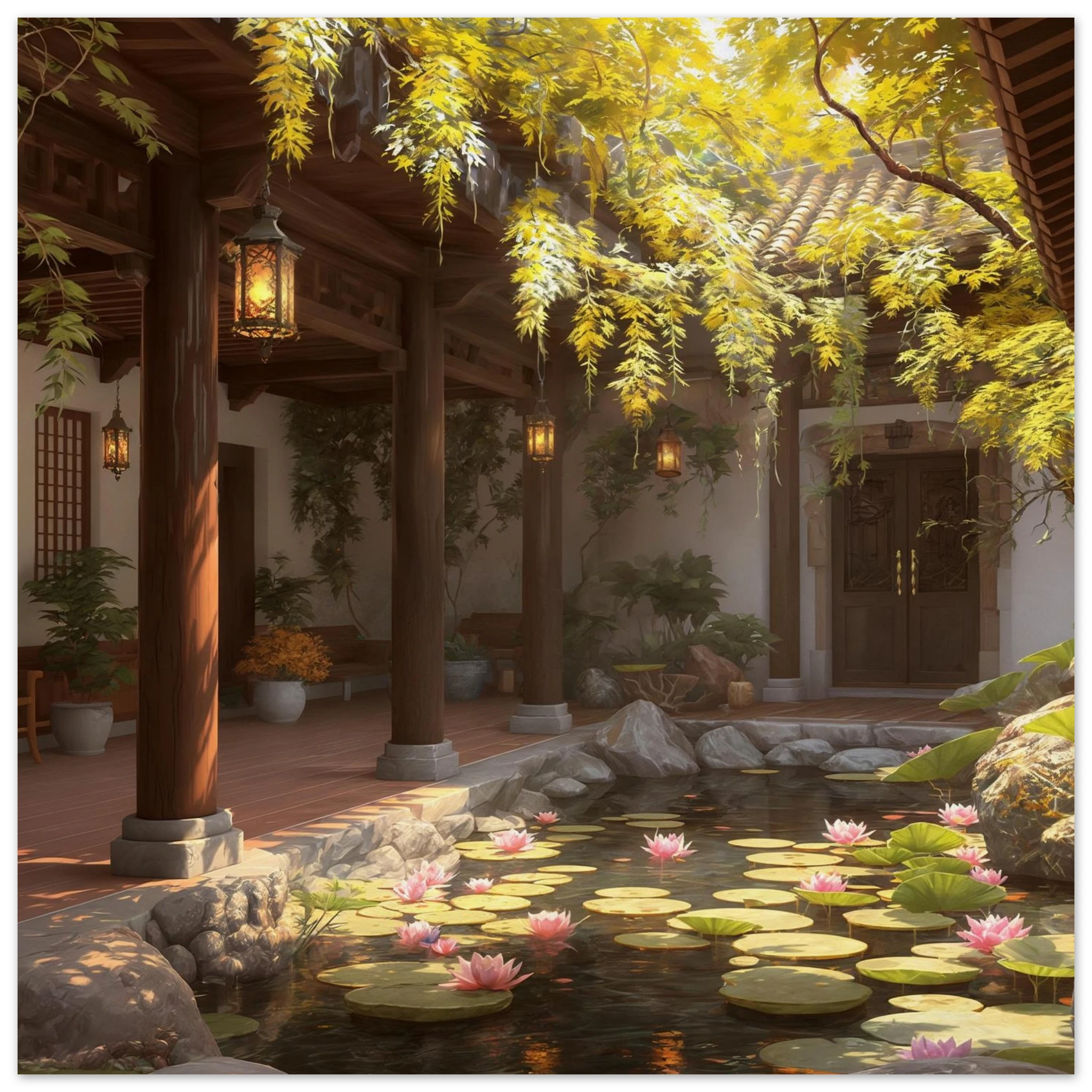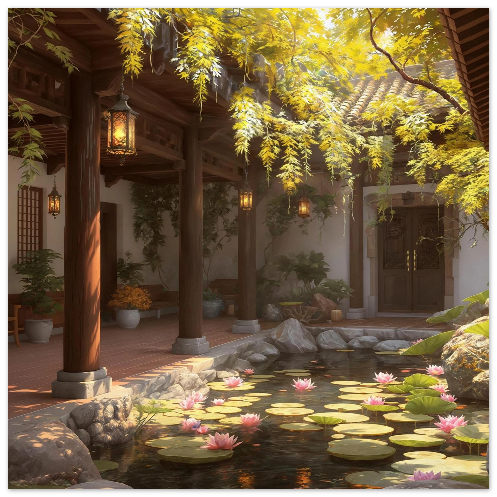 Escape to a serene courtyard with this realistic art print. Sunlight filters through columns onto a terracotta floor, while a pond with pink lotus flowers and lily pads creates a peaceful centrepiece. The warm glow of lanterns and lush greenery make this a harmonious, tranquil scene.Â