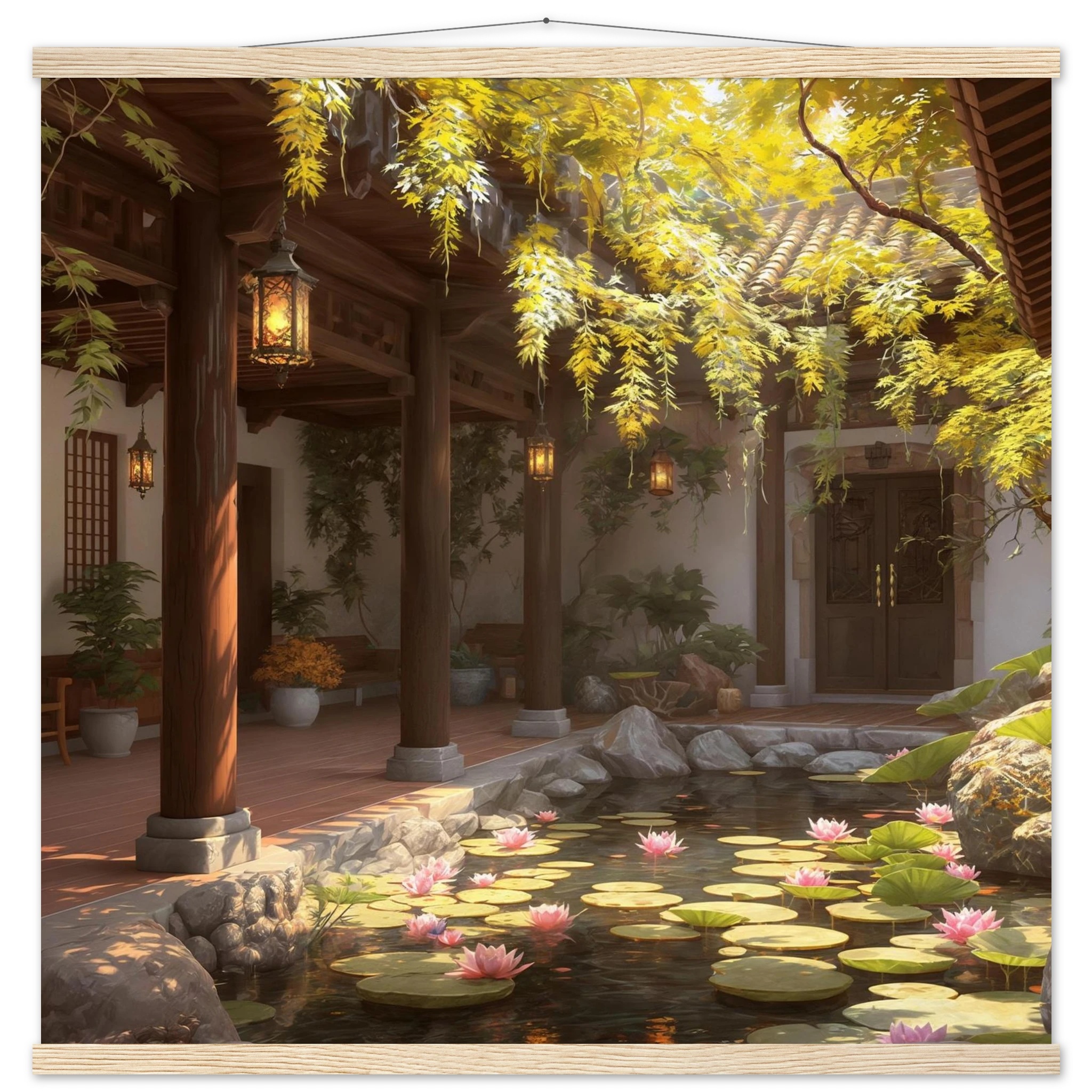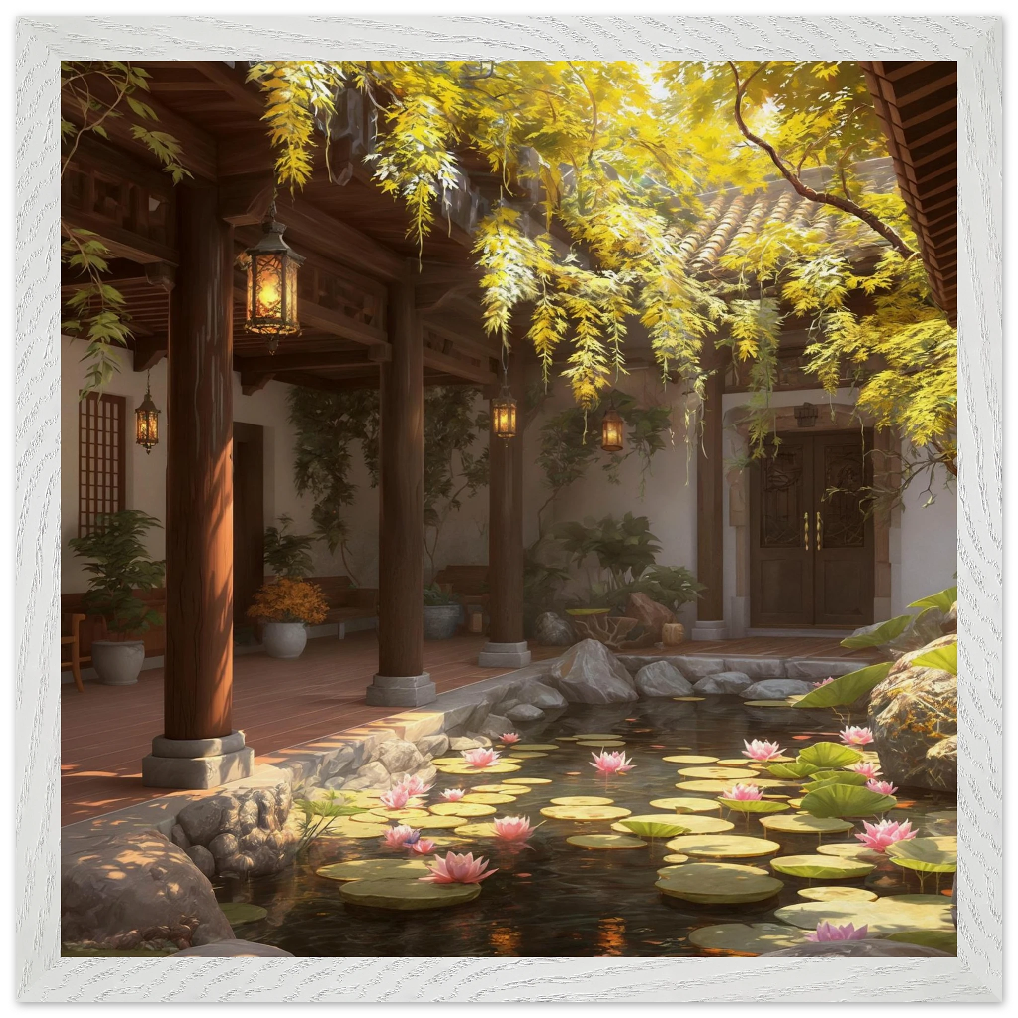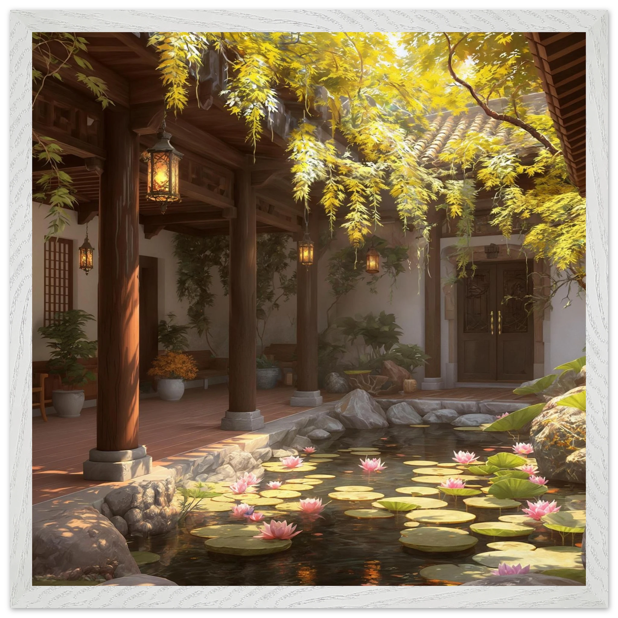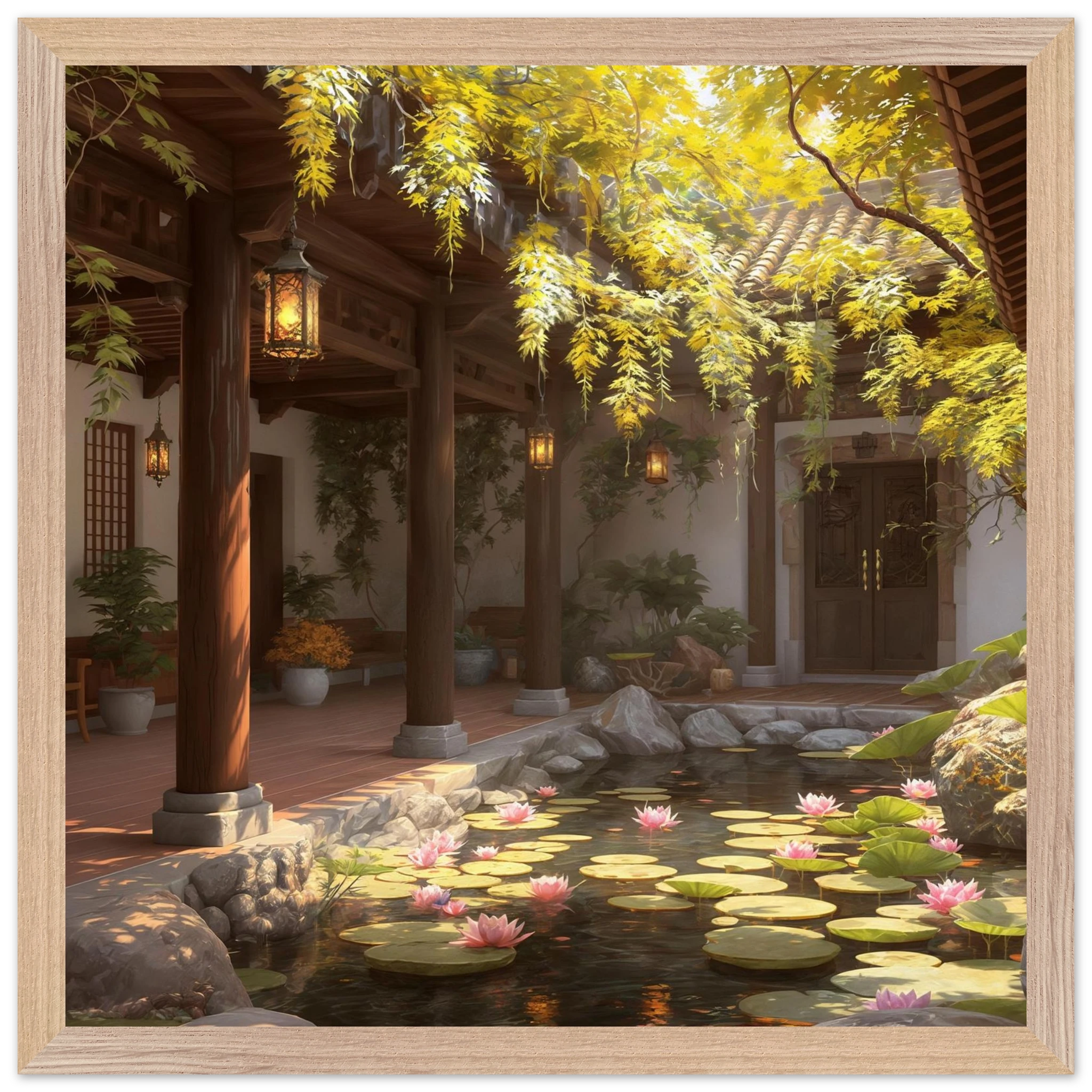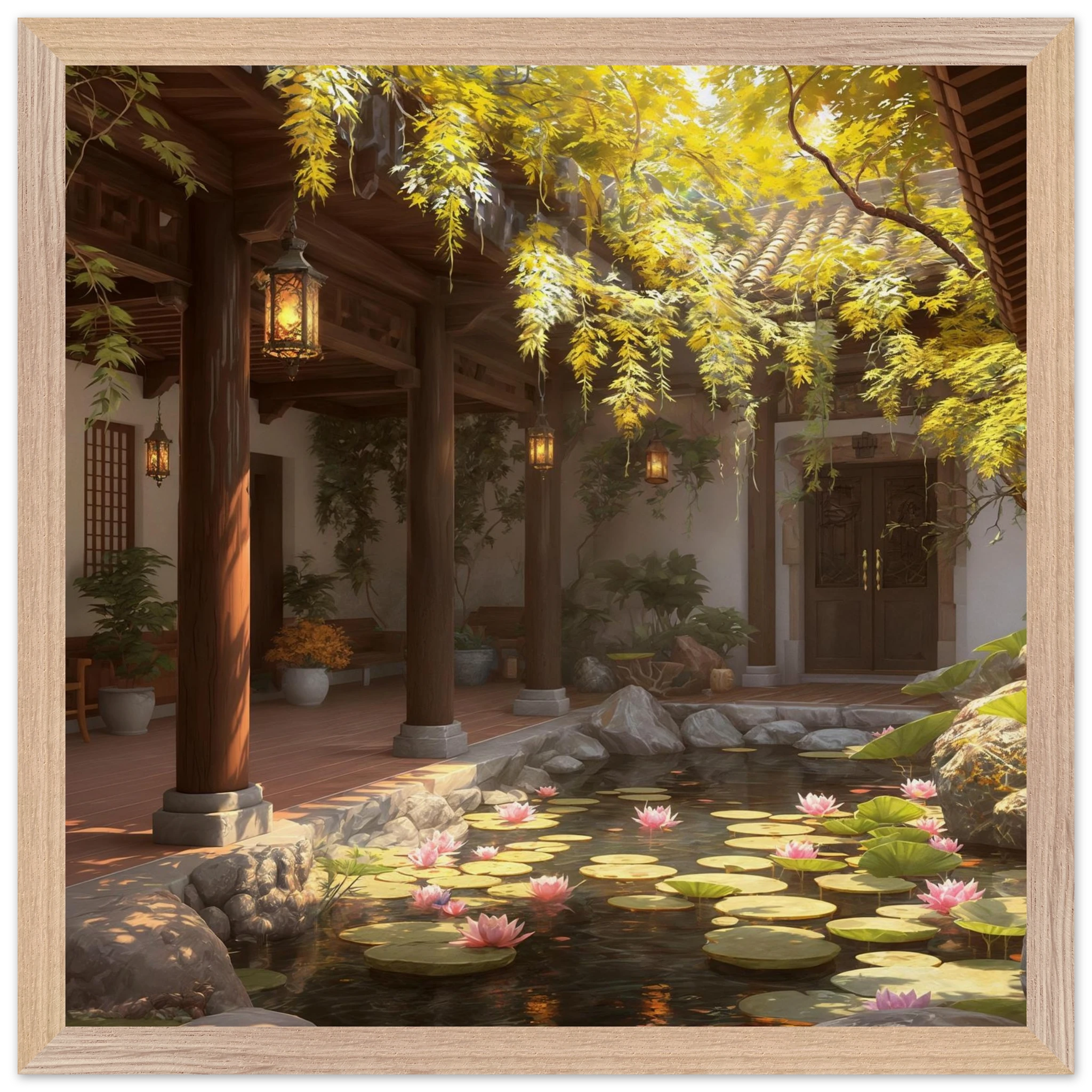Escape to a serene courtyard with this realistic art print. Sunlight filters through columns onto a terracotta floor, while a pond with pink lotus flowers and lily pads creates a peaceful centrepiece. The warm glow of lanterns and lush greenery make this a harmonious, tranquil scene.Â
