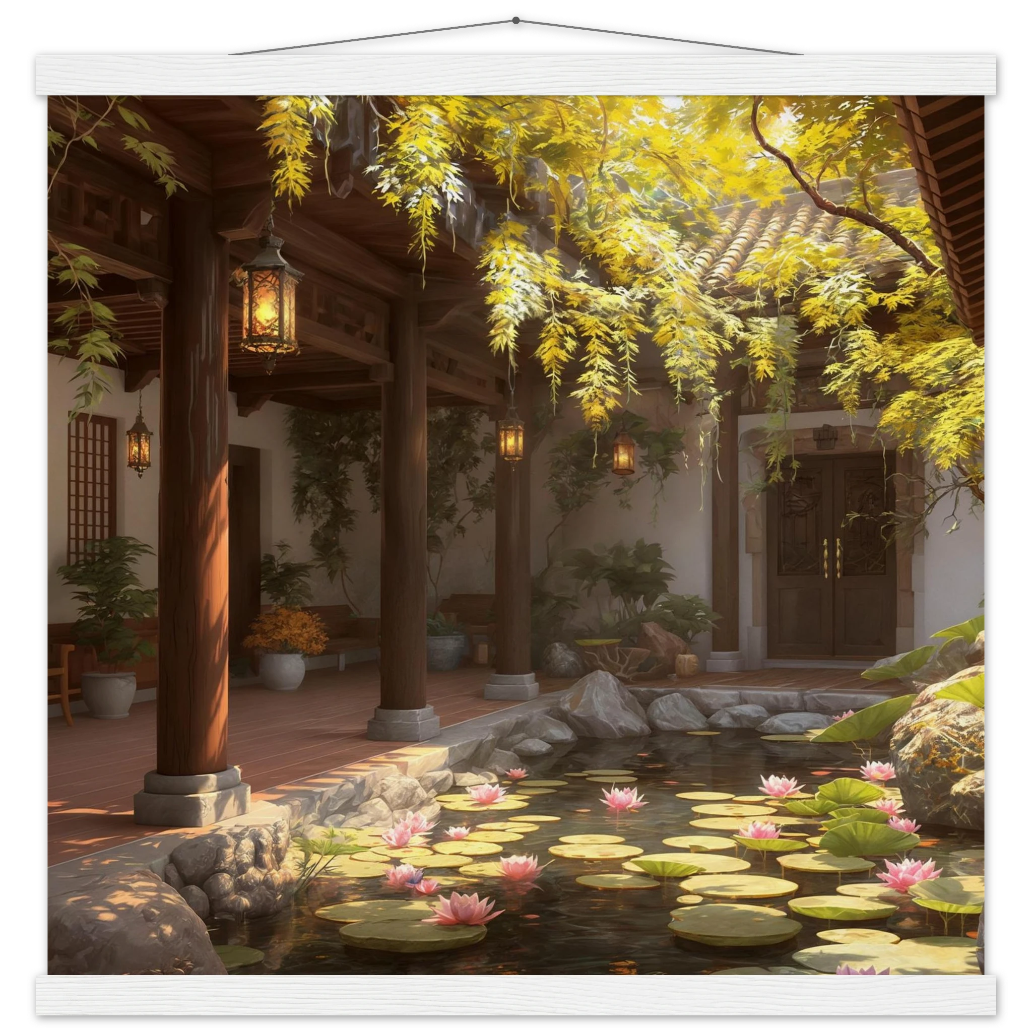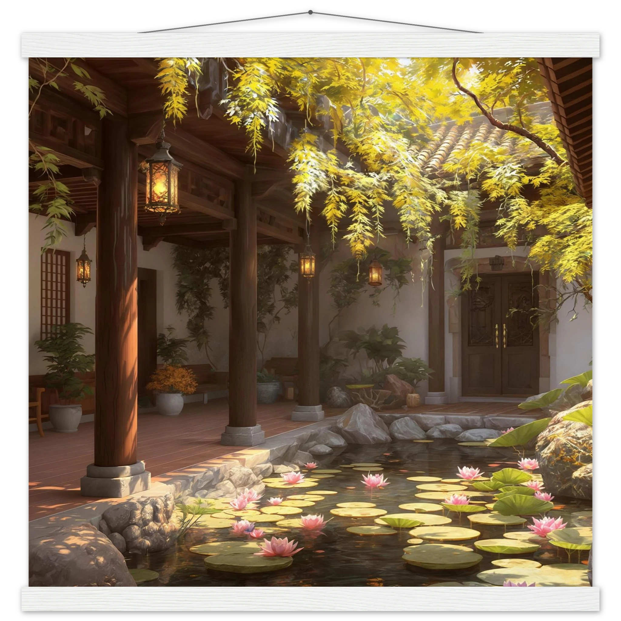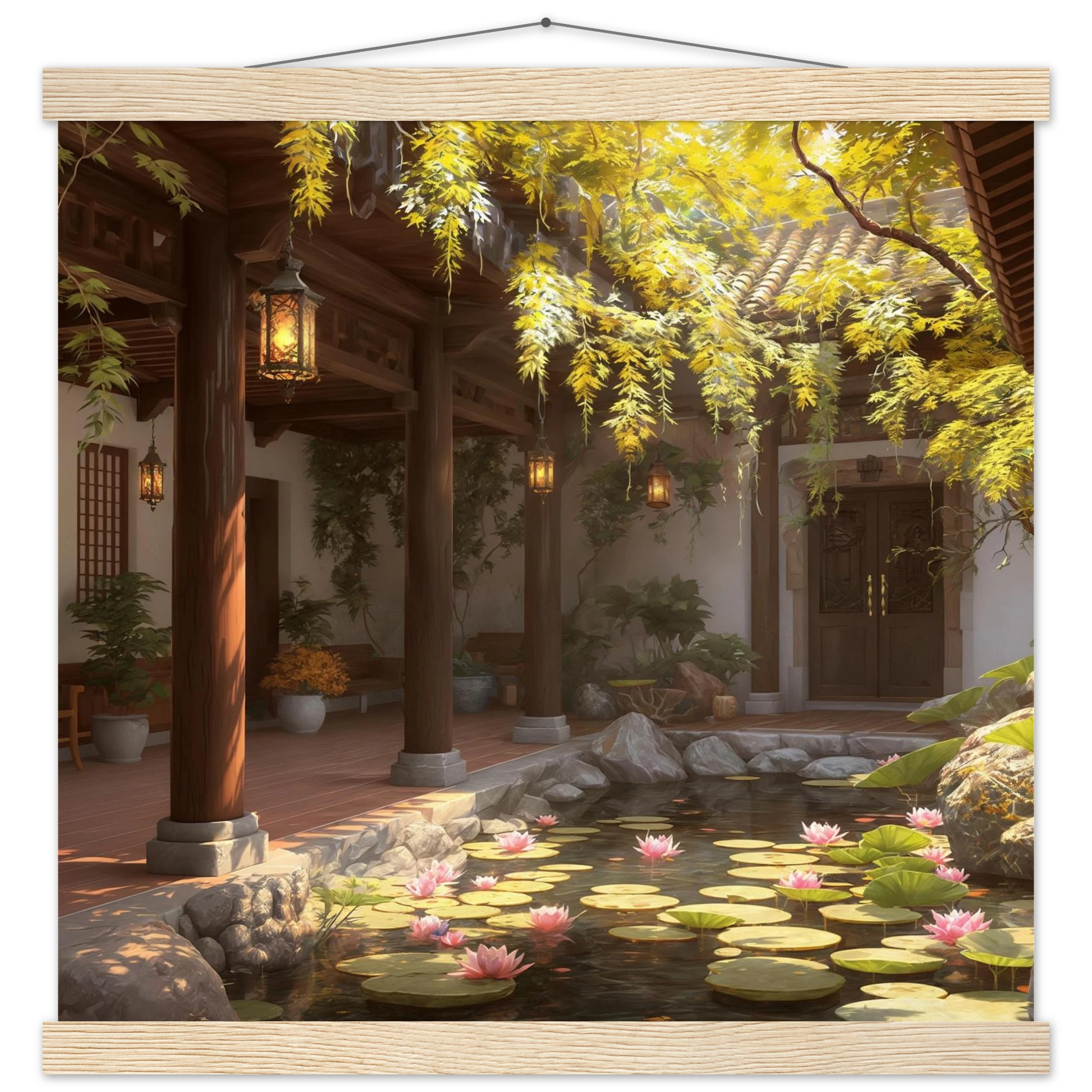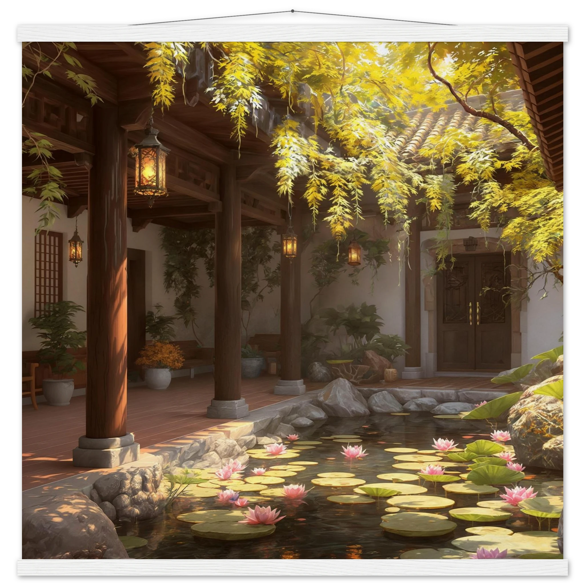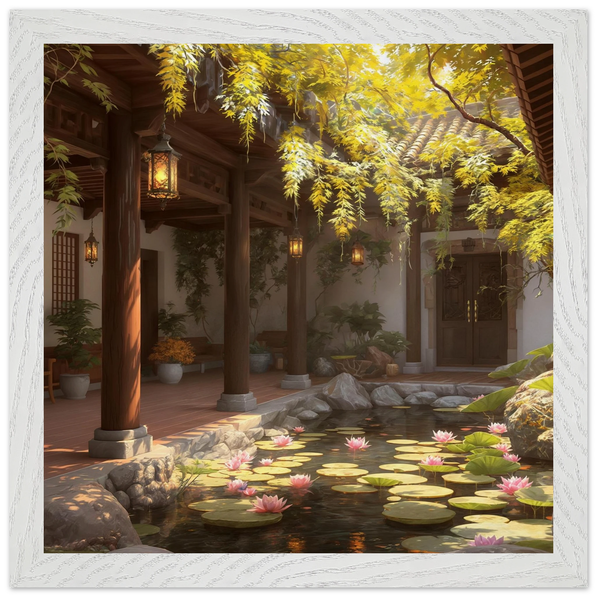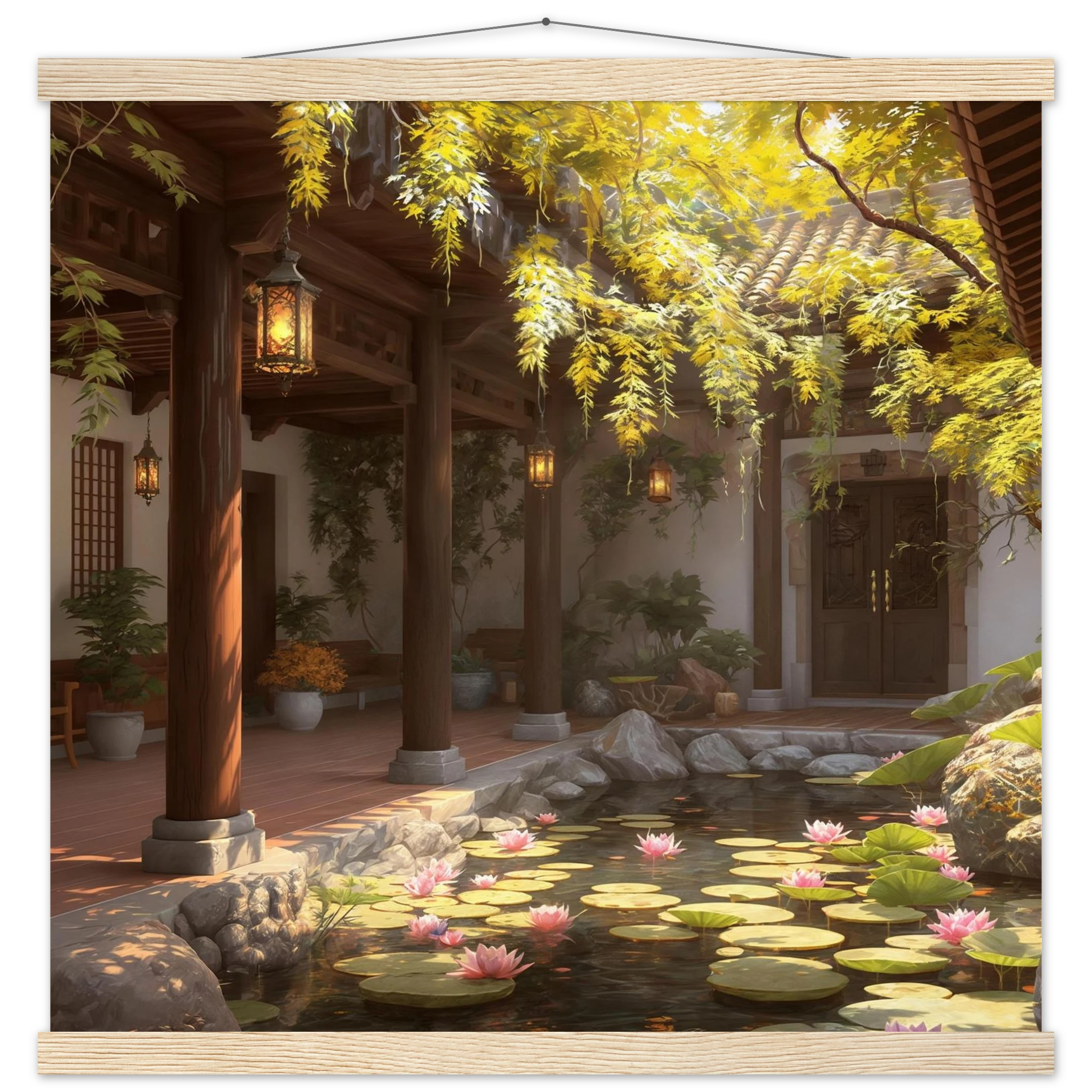 Escape to a serene courtyard with this realistic art print. Sunlight filters through columns onto a terracotta floor, while a pond with pink lotus flowers and lily pads creates a peaceful centrepiece. The warm glow of lanterns and lush greenery make this a harmonious, tranquil scene.Â