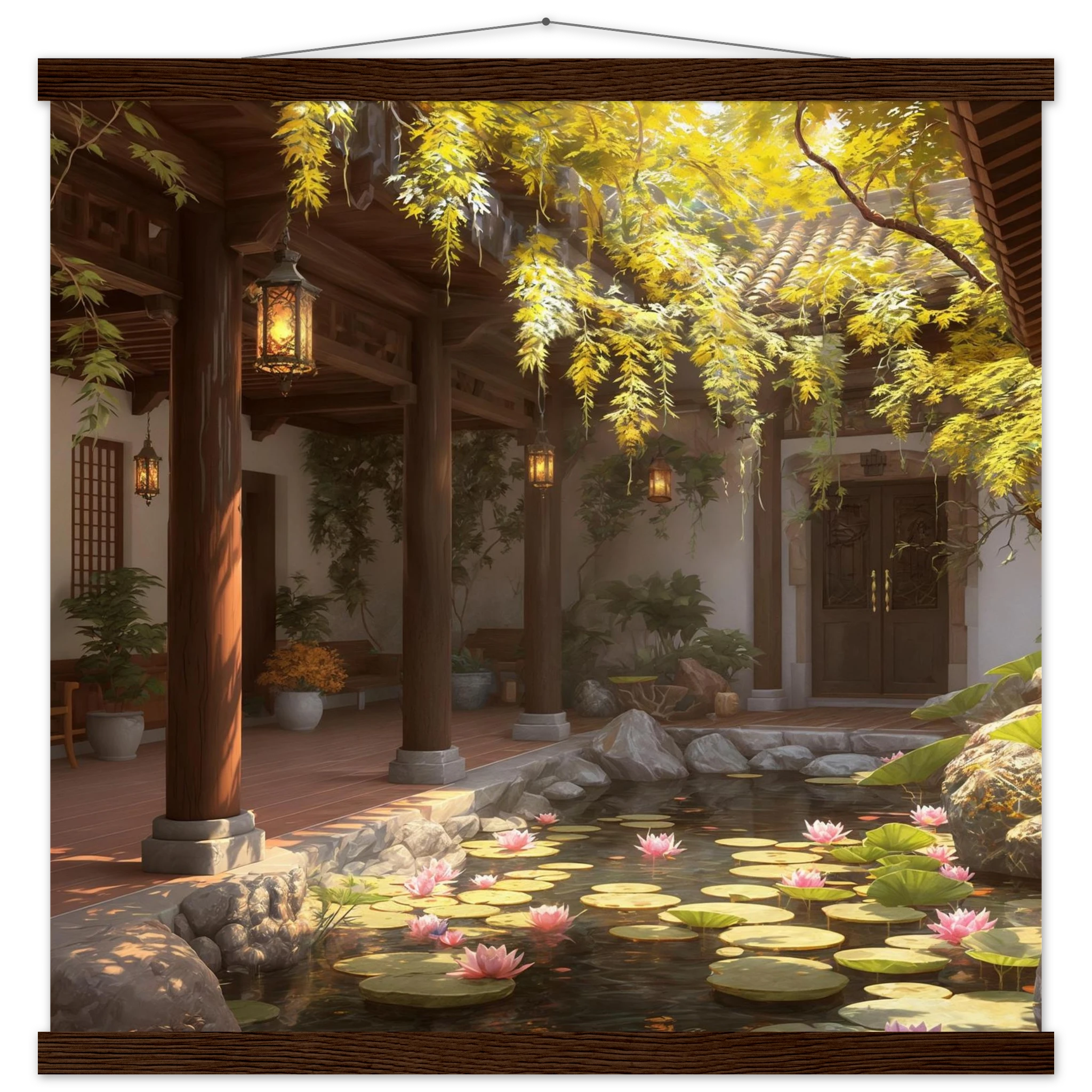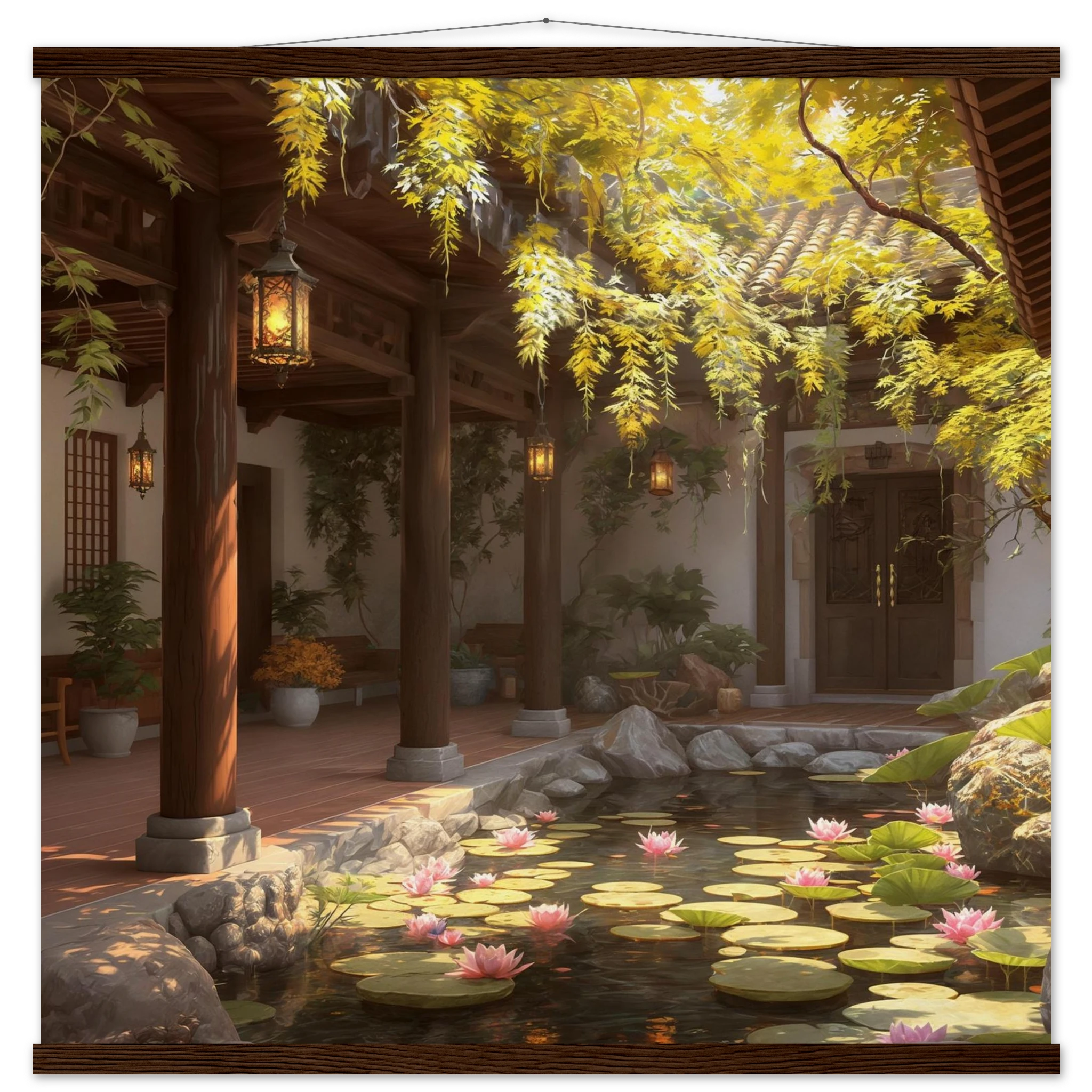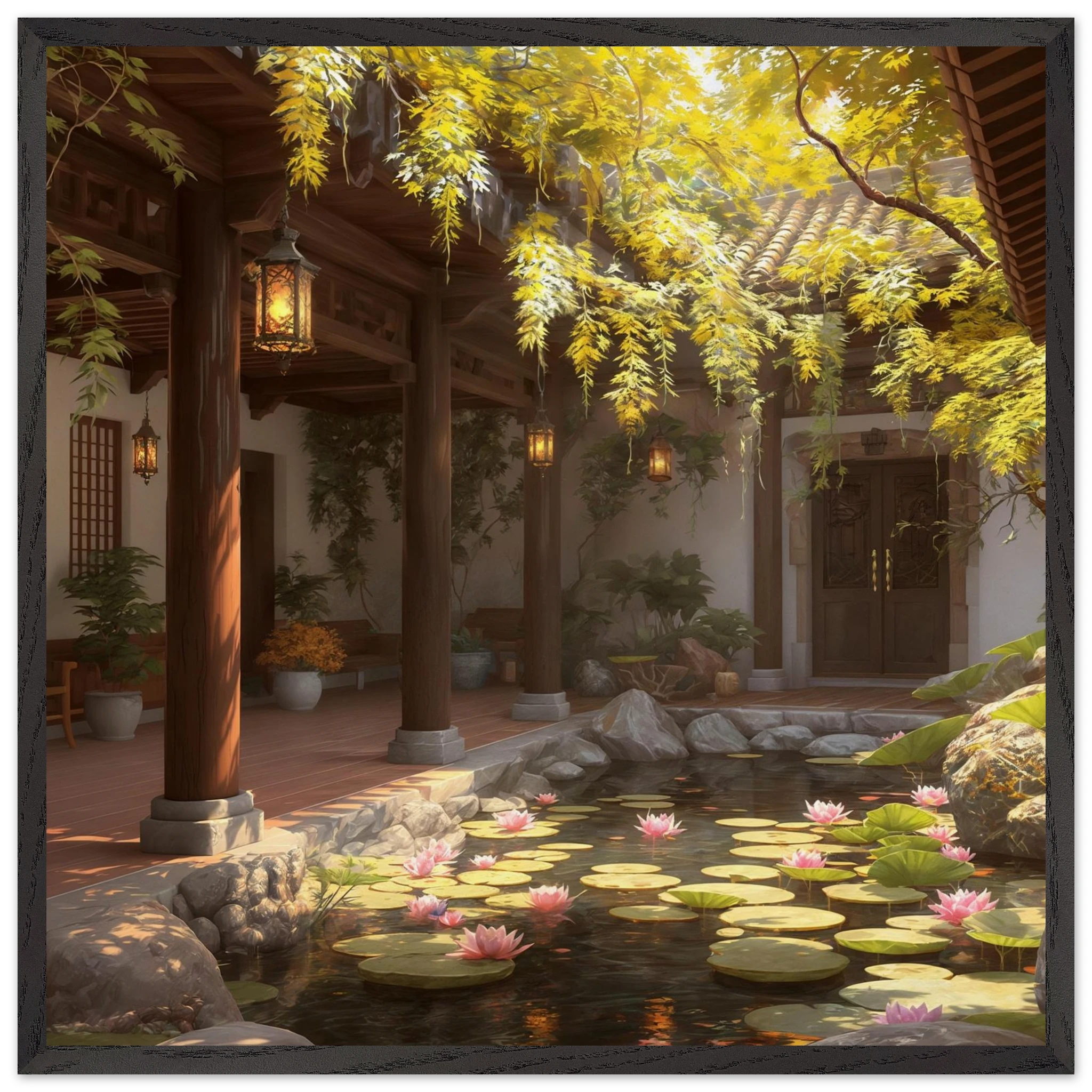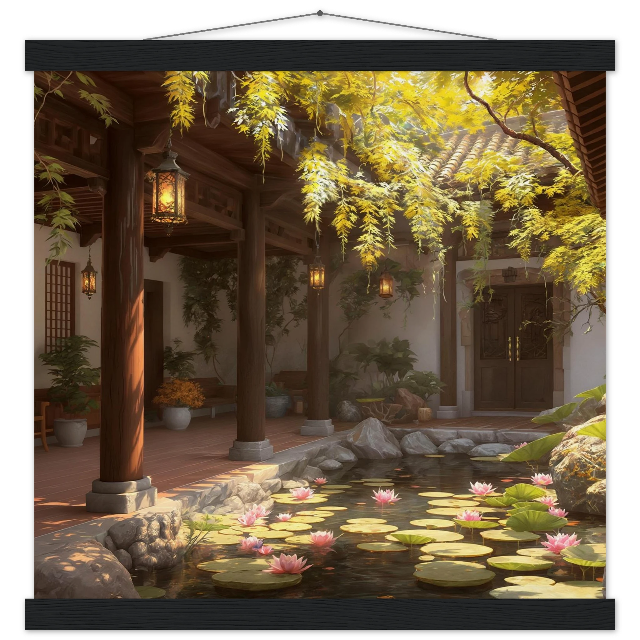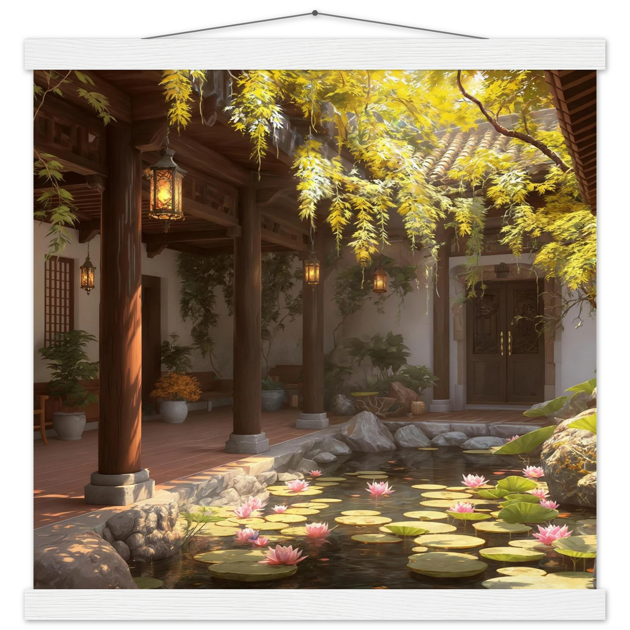 Escape to a serene courtyard with this realistic art print. Sunlight filters through columns onto a terracotta floor, while a pond with pink lotus flowers and lily pads creates a peaceful centrepiece. The warm glow of lanterns and lush greenery make this a harmonious, tranquil scene.Â