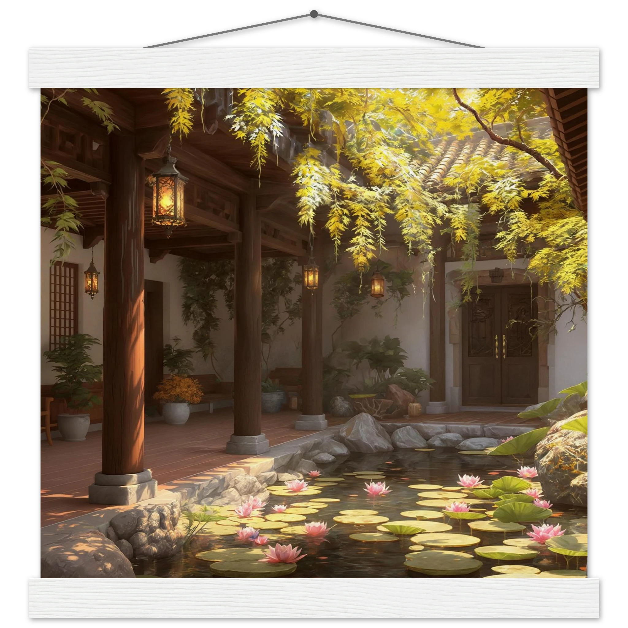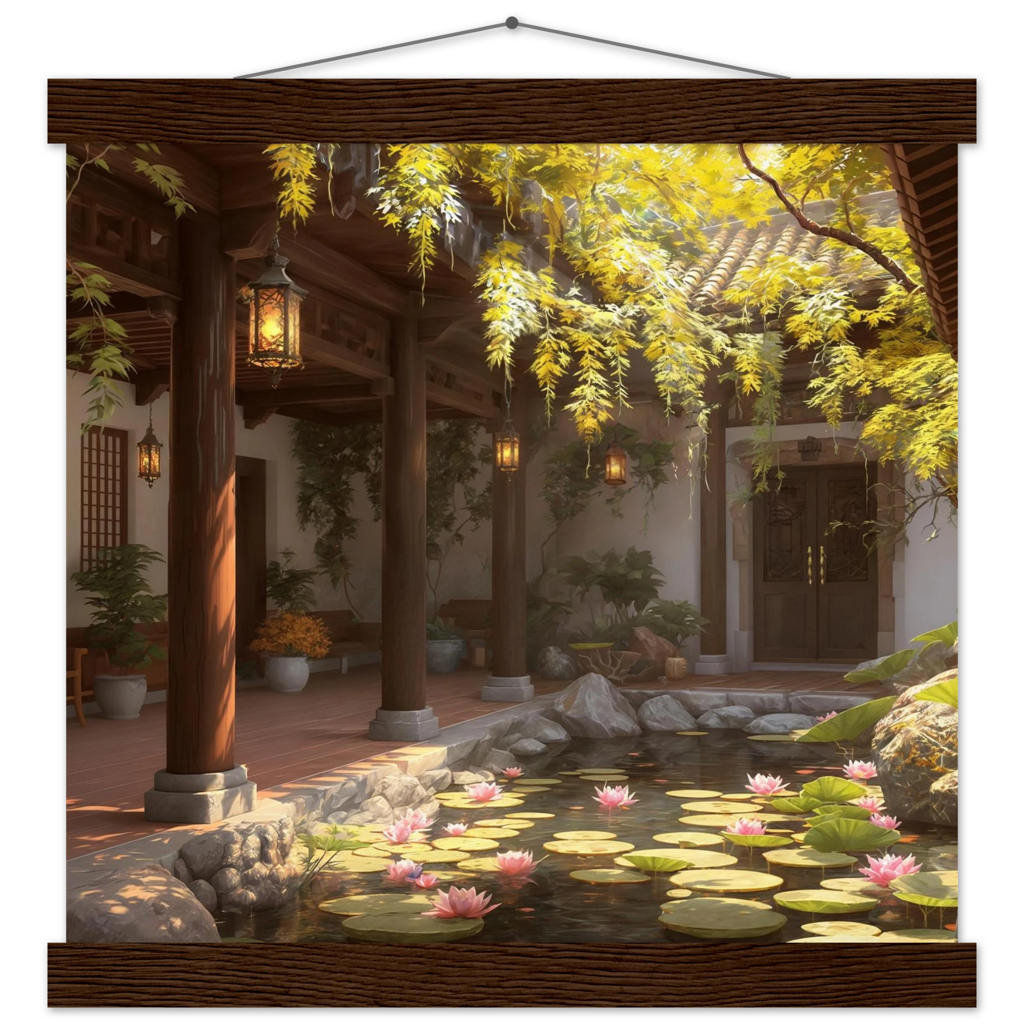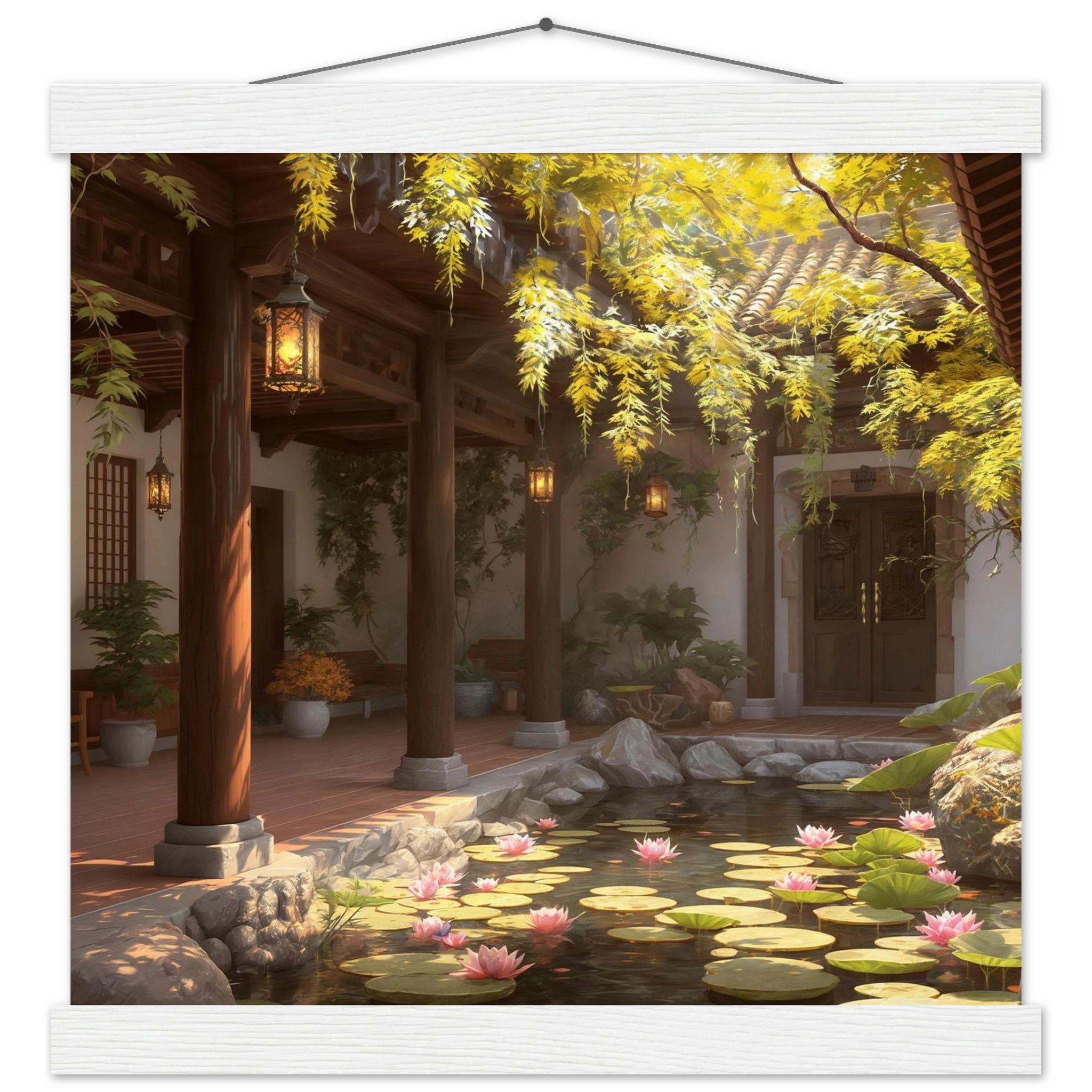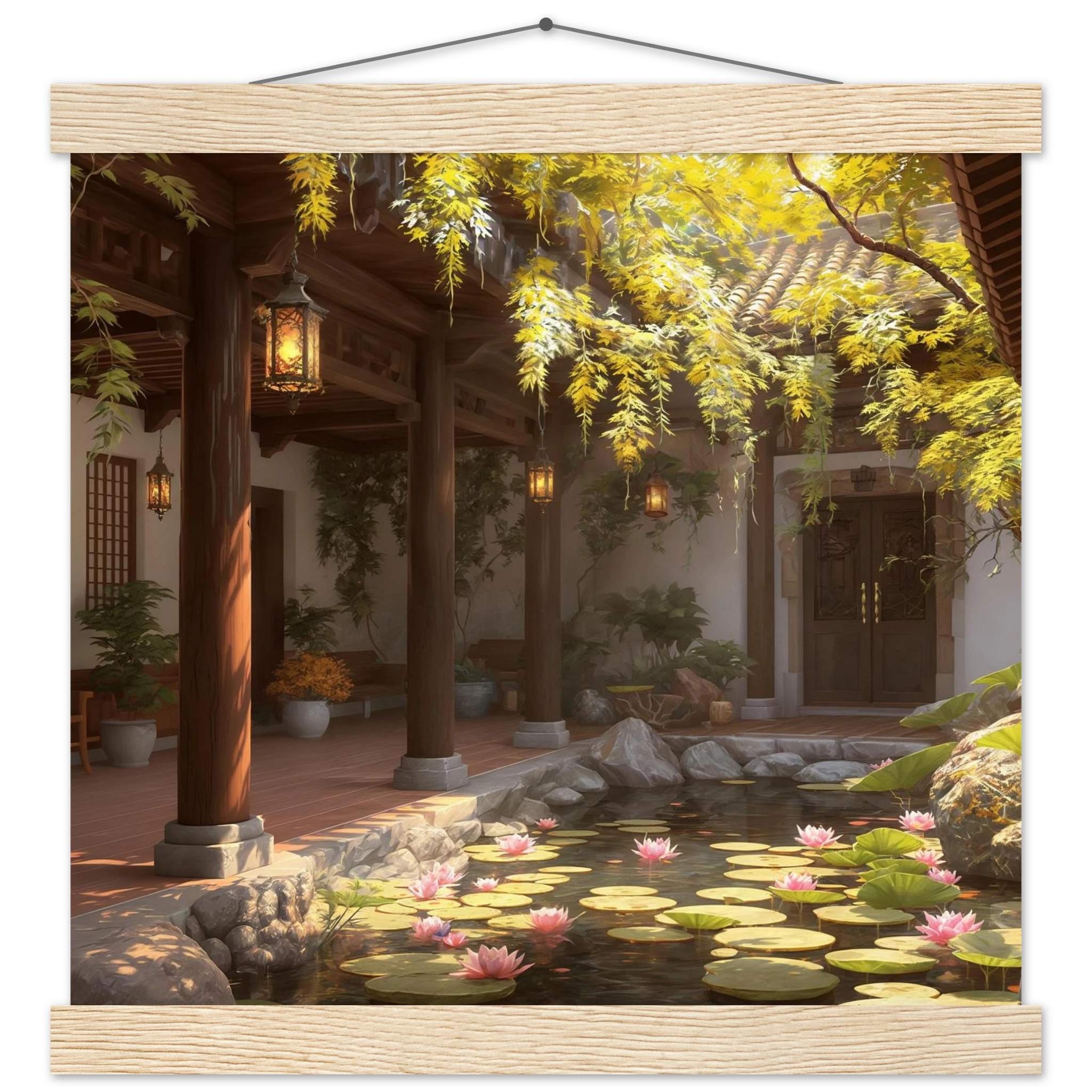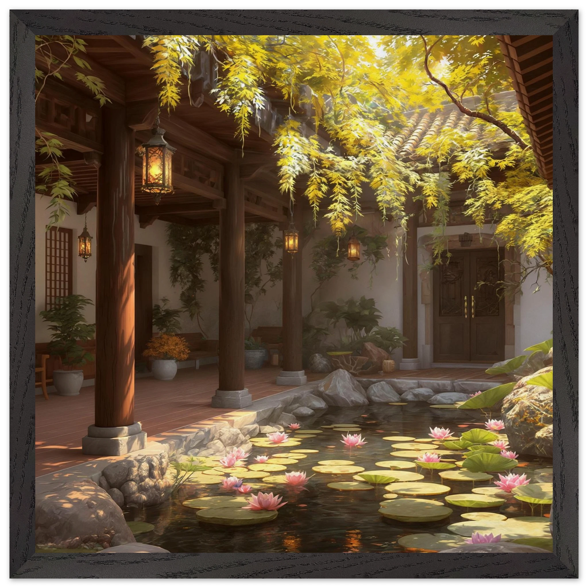 Escape to a serene courtyard with this realistic art print. Sunlight filters through columns onto a terracotta floor, while a pond with pink lotus flowers and lily pads creates a peaceful centrepiece. The warm glow of lanterns and lush greenery make this a harmonious, tranquil scene.Â