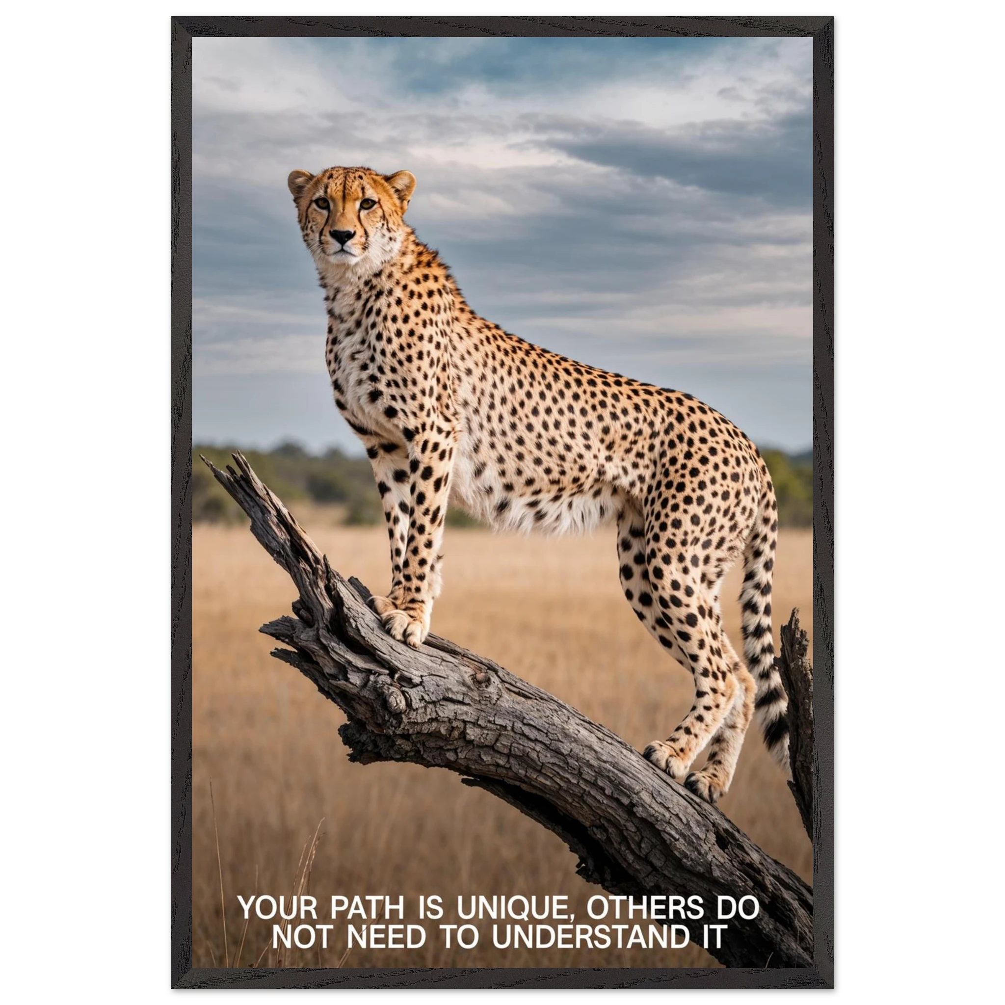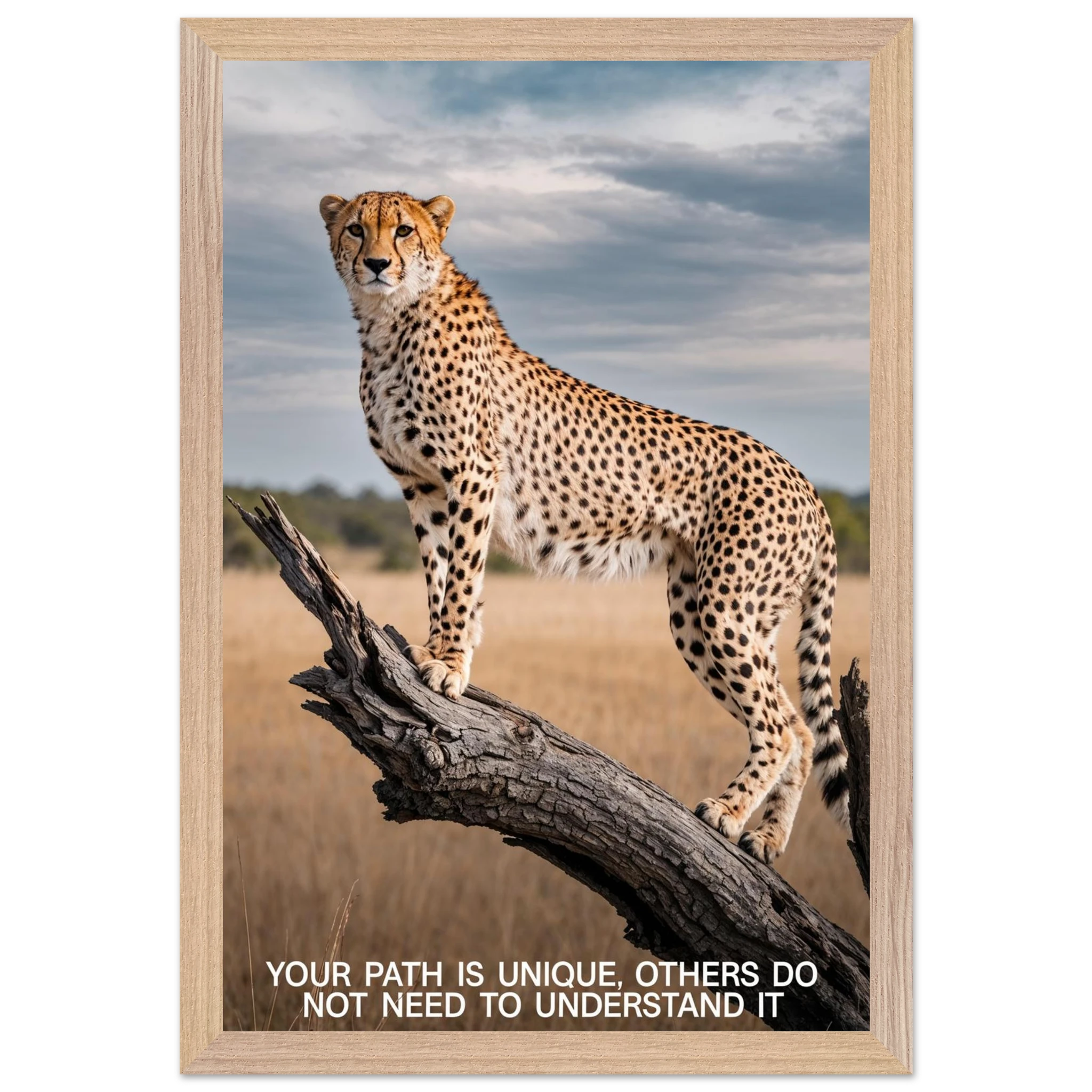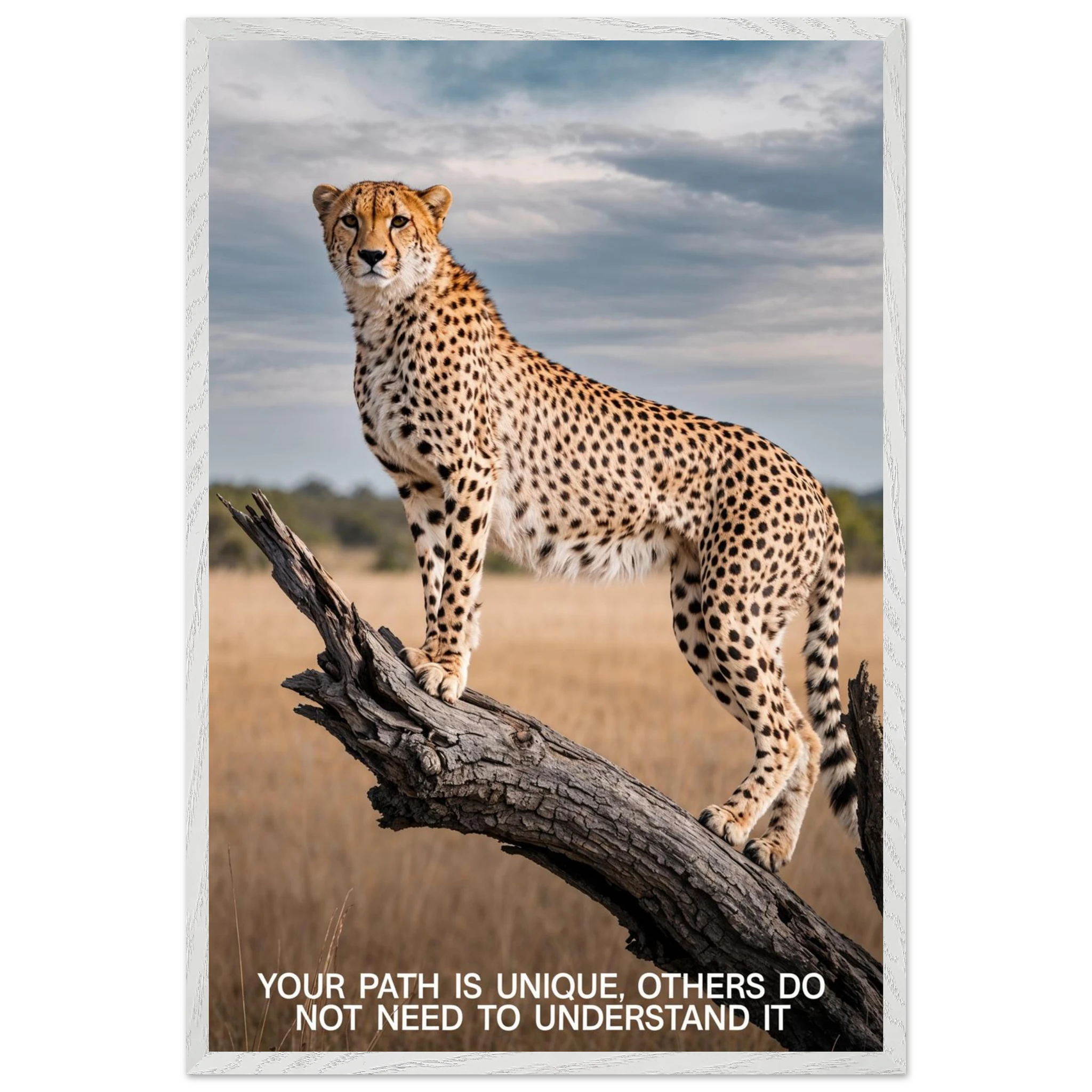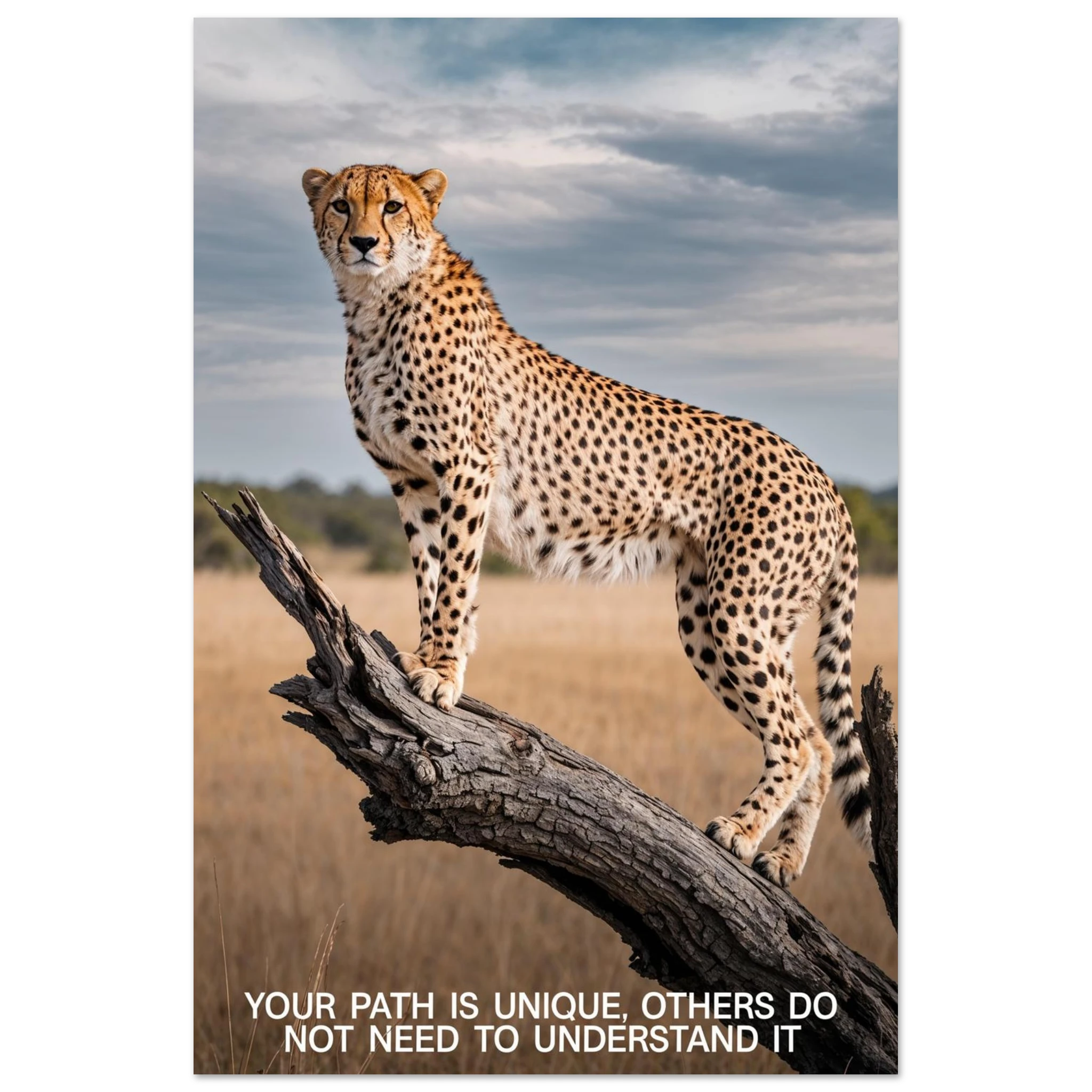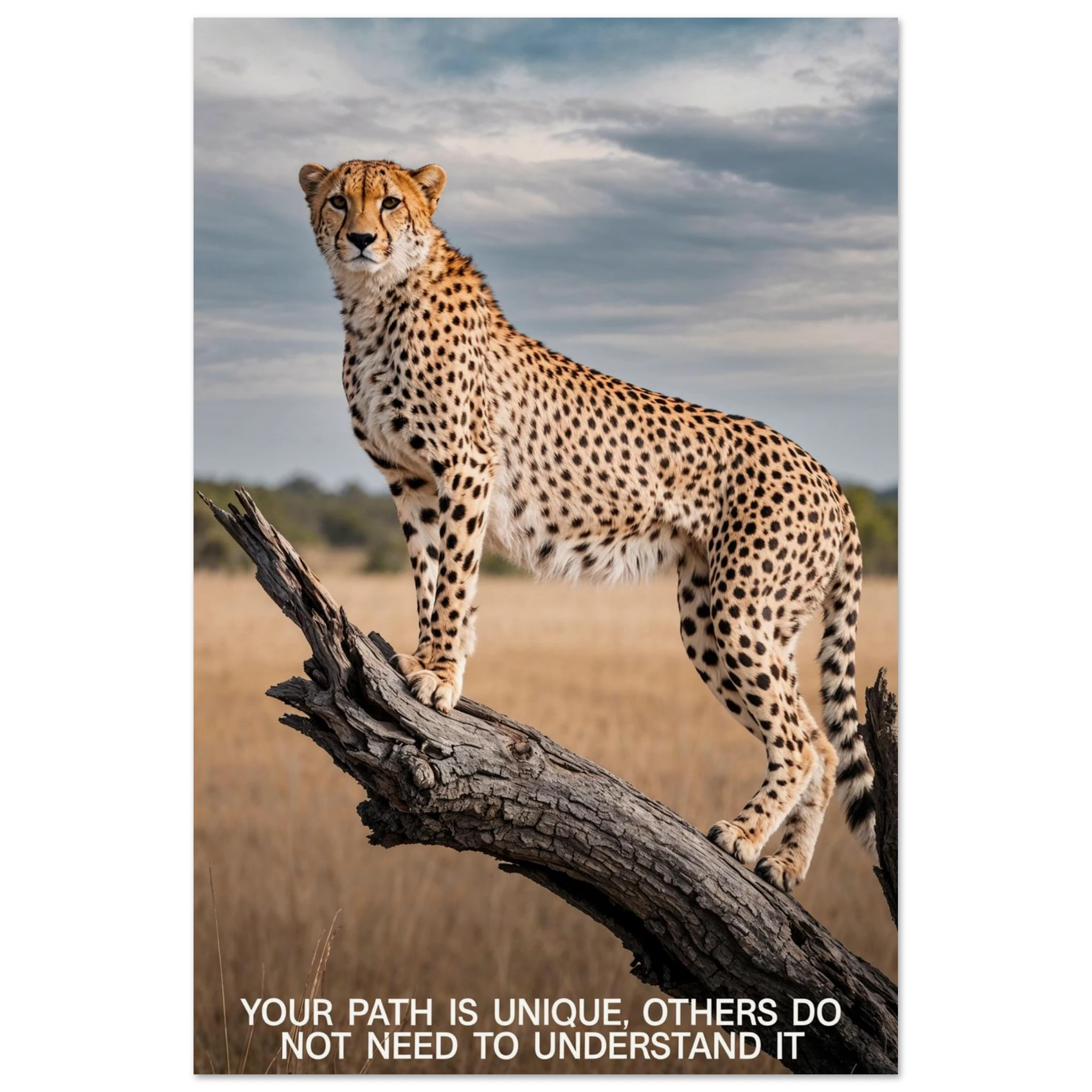 Experience the captivating grace of the wild with this high-resolution cheetah digital print. A majestic cheetah stands poised and alert on a weathered tree branch, its sleek, spotted form beautifully highlighted against a vast savannah landscape. The dramatic, natural lighting emphasises its power and agility. This stunning wildlife photograph is further enhanced by the inspiring text elegantly placed at the bottom. Perfect for adding a motivational and powerful statement to any space, this piece celebrates both natural beauty and personal strength.