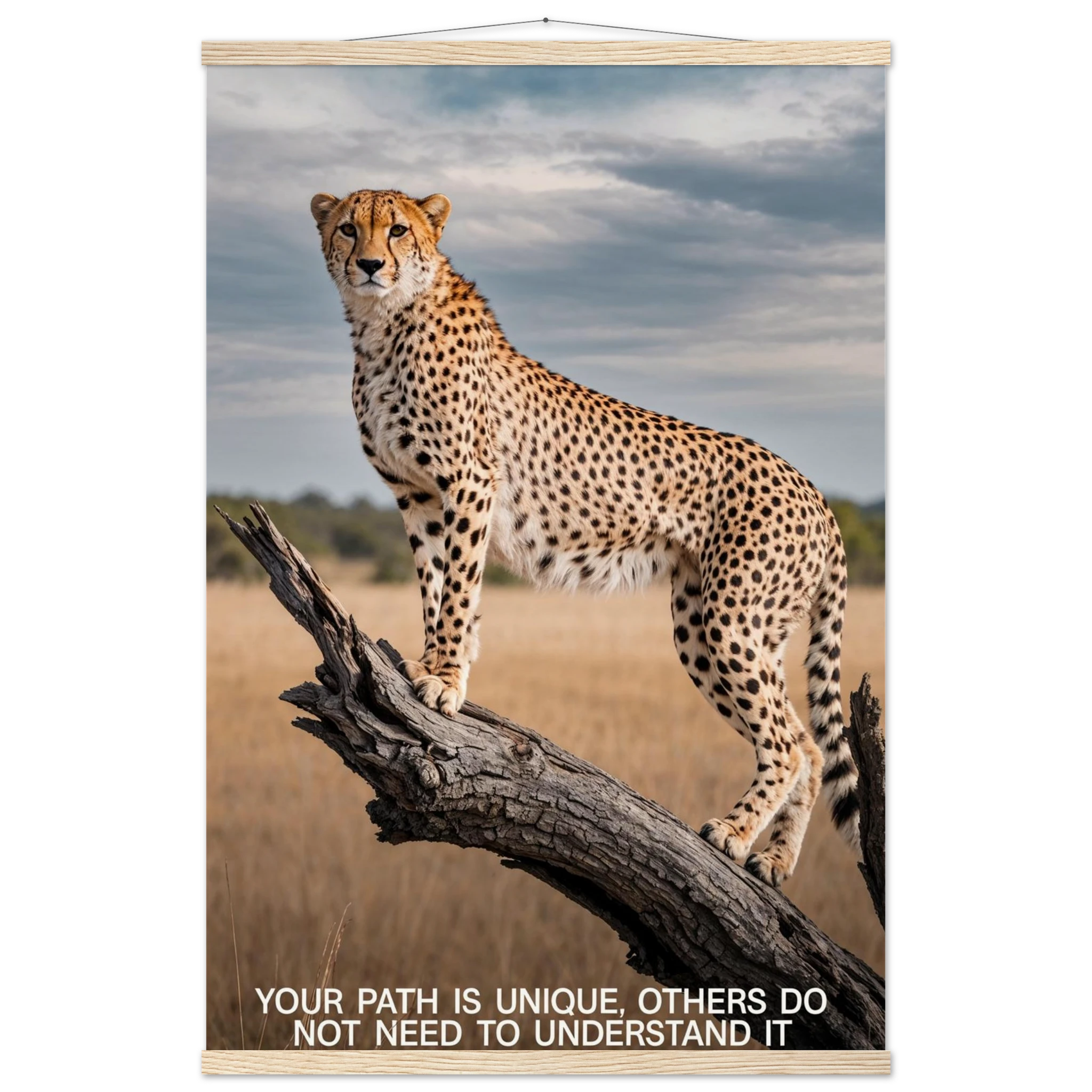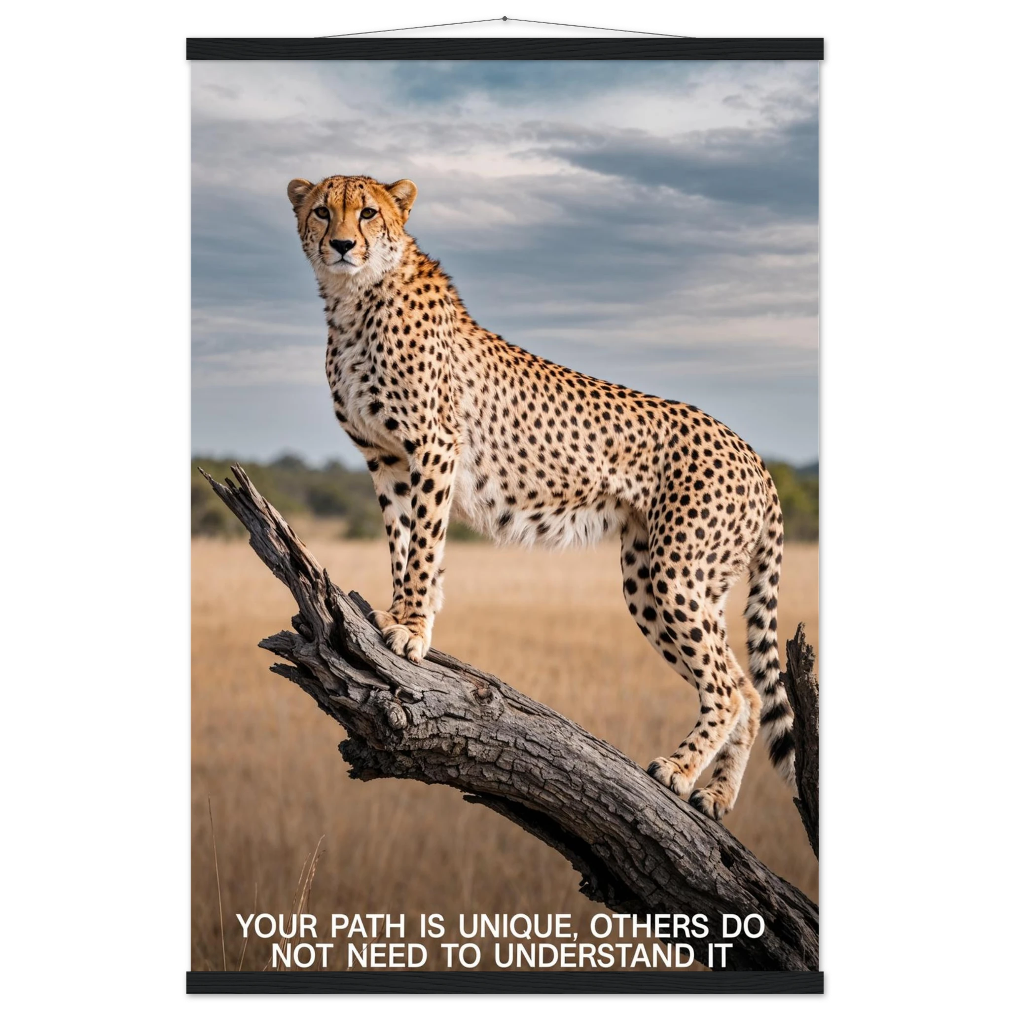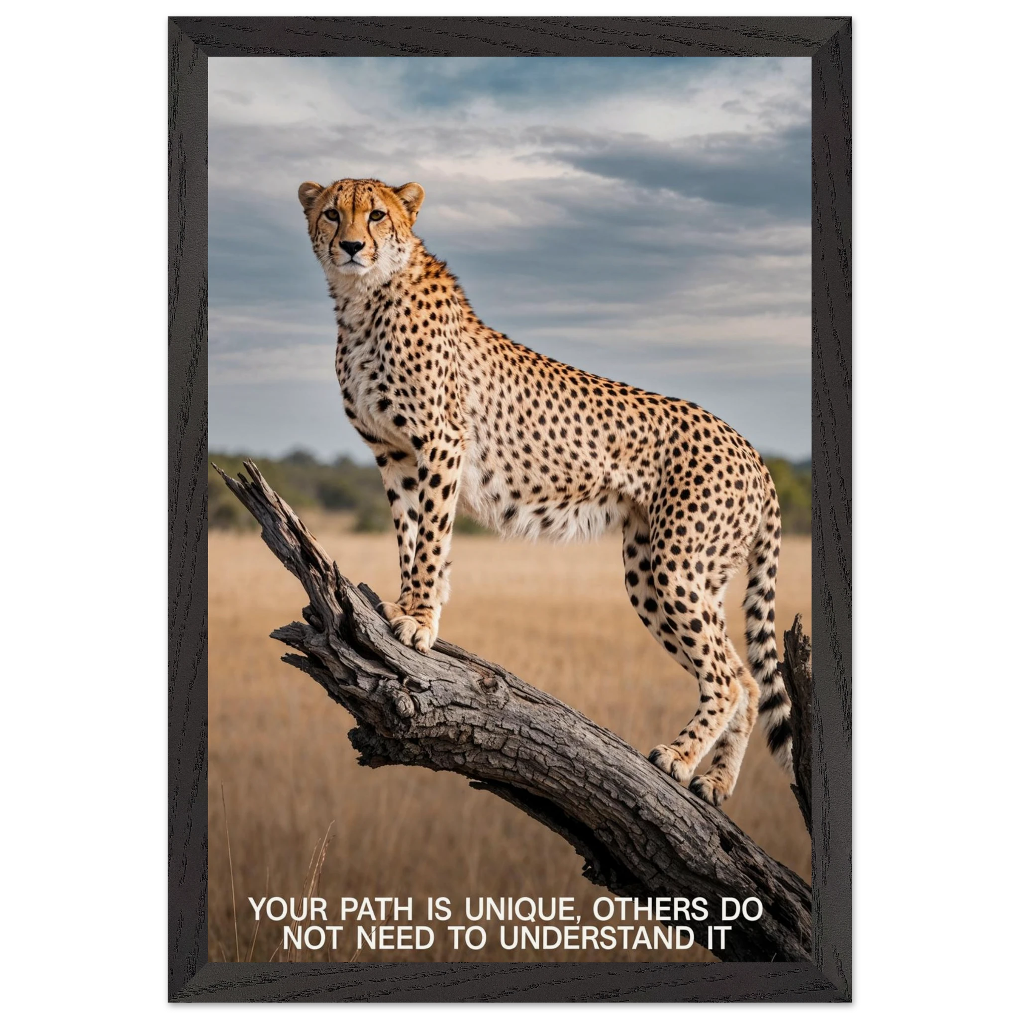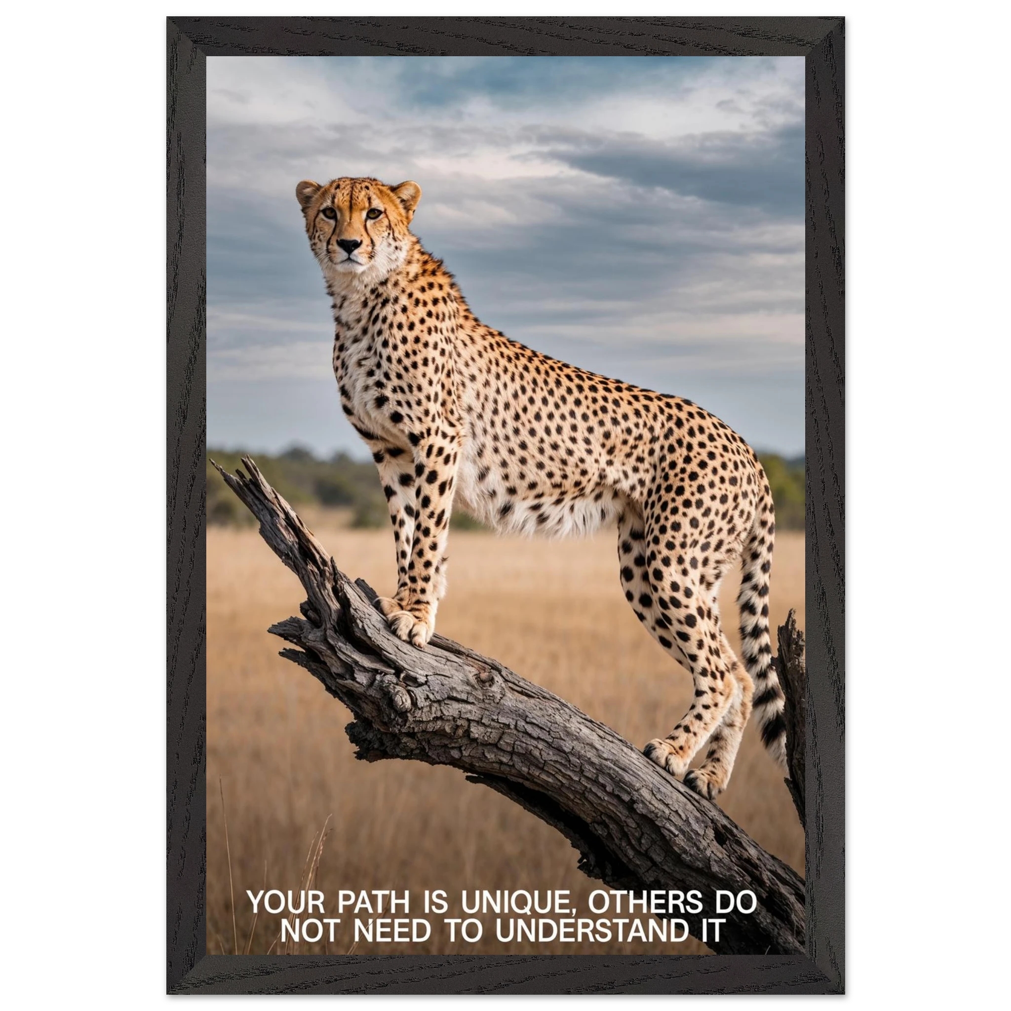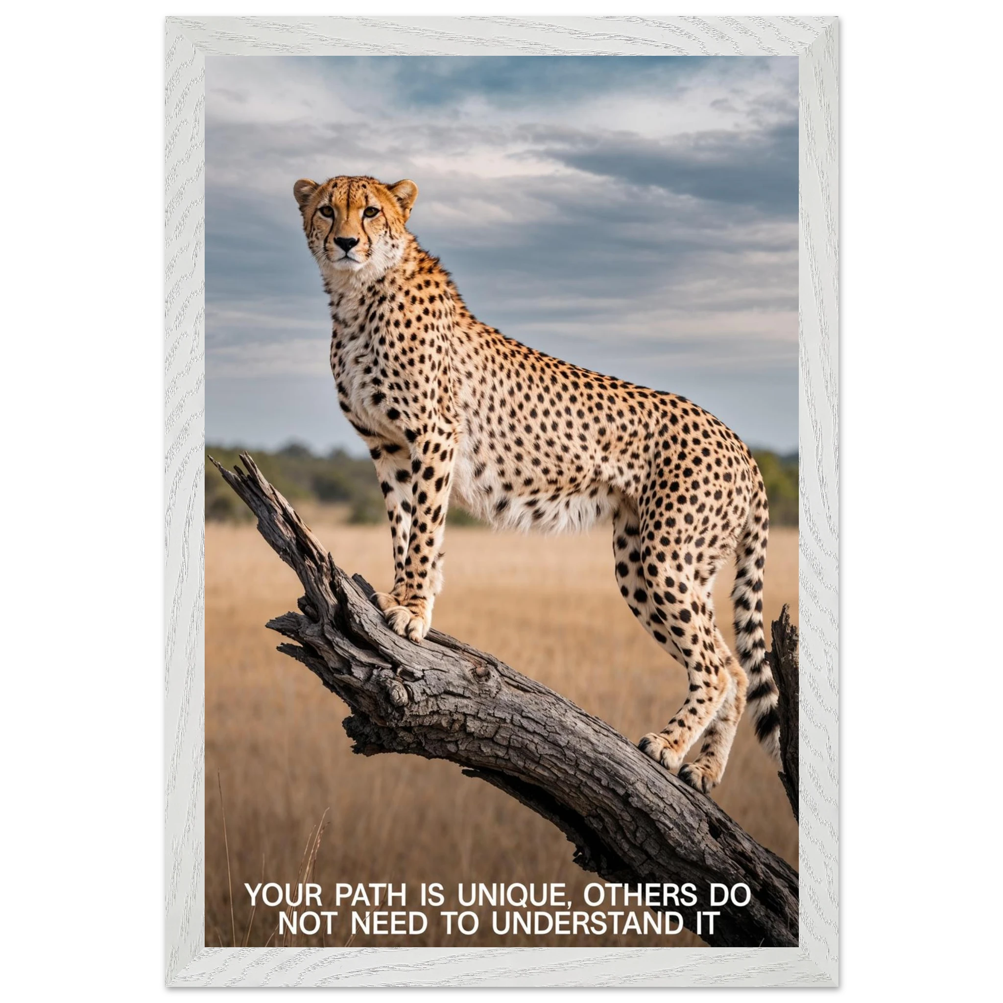 Experience the captivating grace of the wild with this high-resolution cheetah digital print. A majestic cheetah stands poised and alert on a weathered tree branch, its sleek, spotted form beautifully highlighted against a vast savannah landscape. The dramatic, natural lighting emphasises its power and agility. This stunning wildlife photograph is further enhanced by the inspiring text elegantly placed at the bottom. Perfect for adding a motivational and powerful statement to any space, this piece celebrates both natural beauty and personal strength.