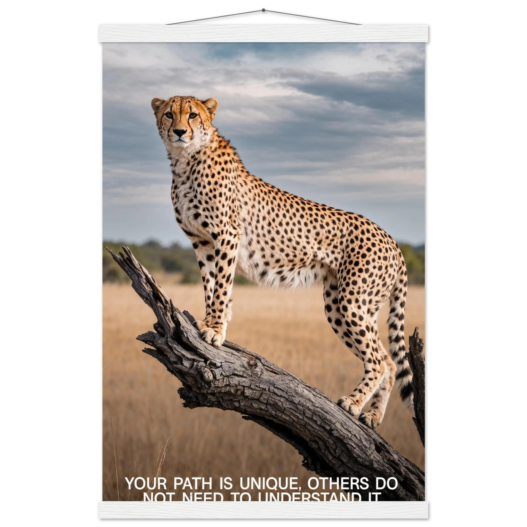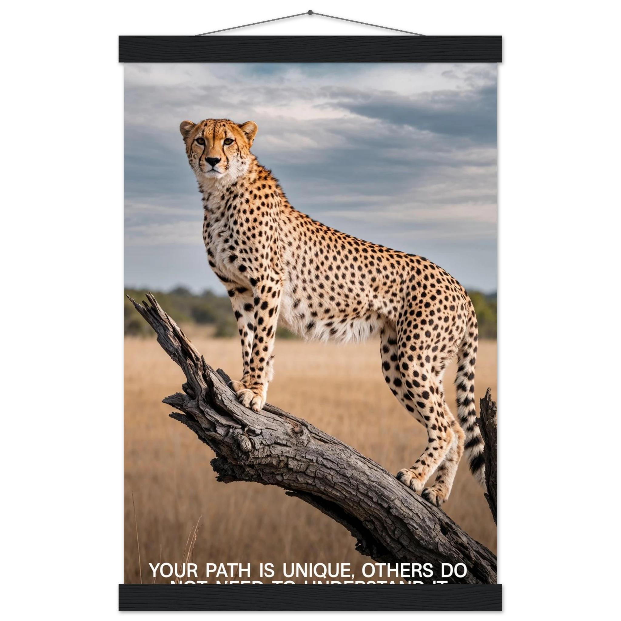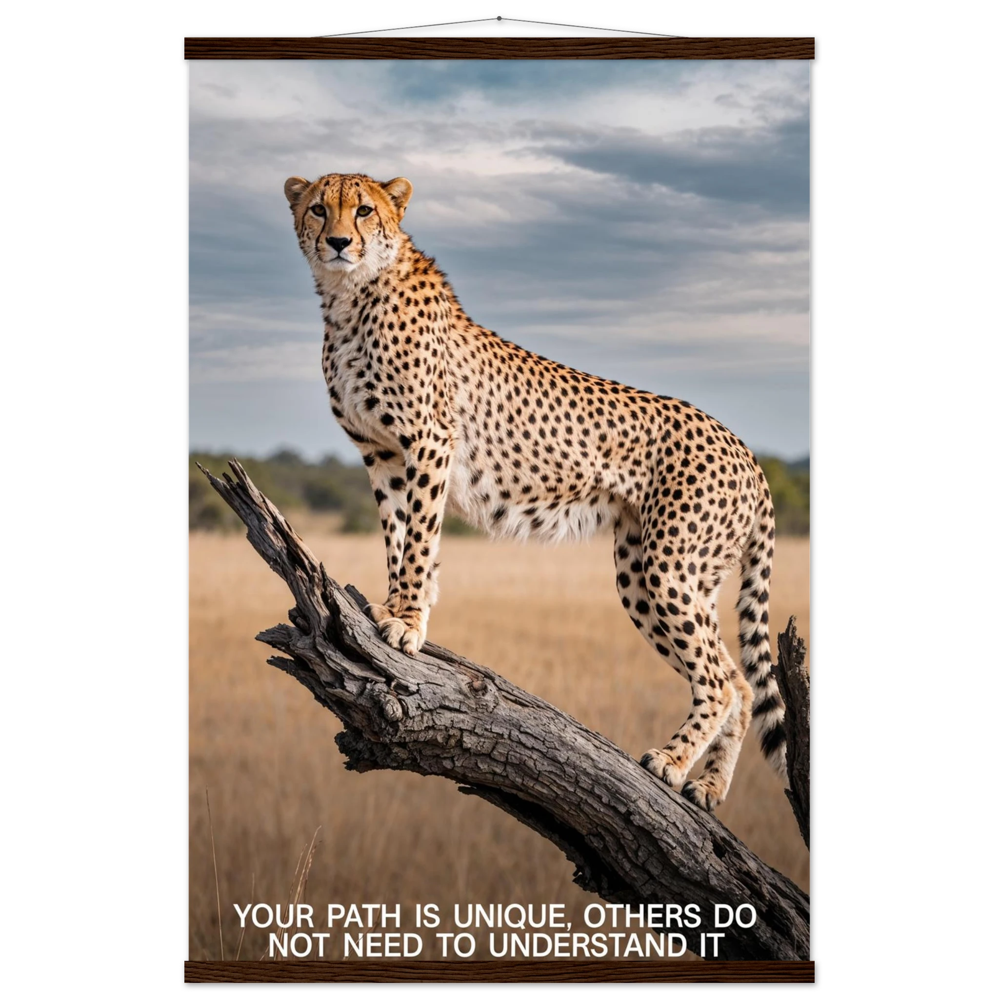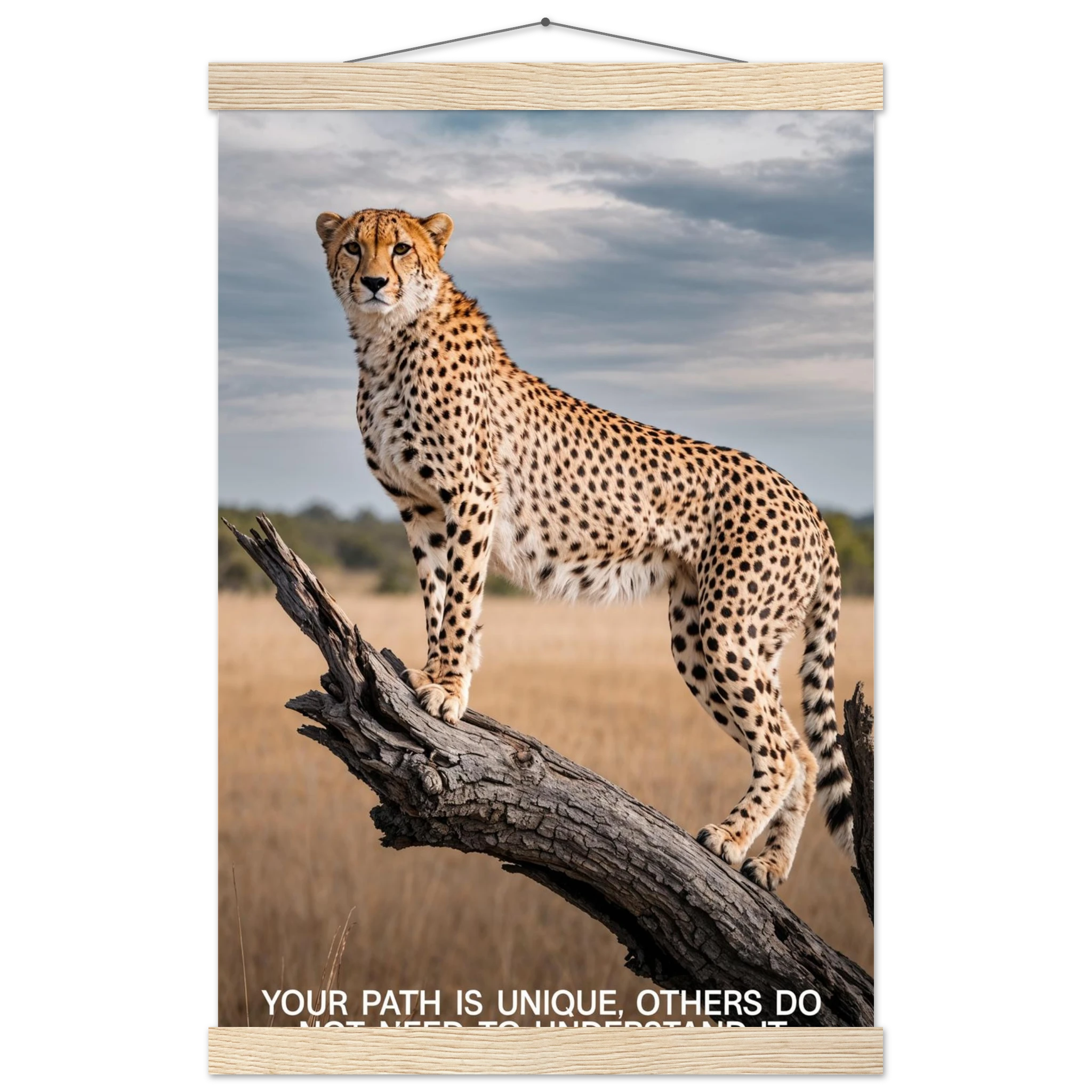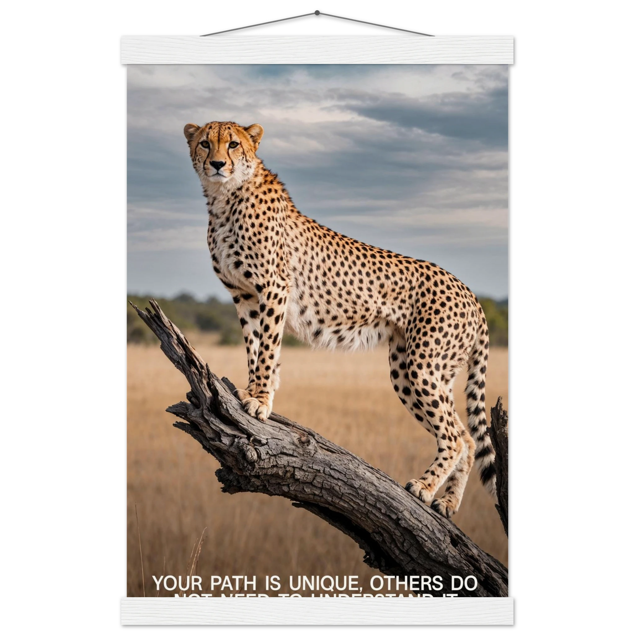 Experience the captivating grace of the wild with this high-resolution cheetah digital print. A majestic cheetah stands poised and alert on a weathered tree branch, its sleek, spotted form beautifully highlighted against a vast savannah landscape. The dramatic, natural lighting emphasises its power and agility. This stunning wildlife photograph is further enhanced by the inspiring text elegantly placed at the bottom. Perfect for adding a motivational and powerful statement to any space, this piece celebrates both natural beauty and personal strength.