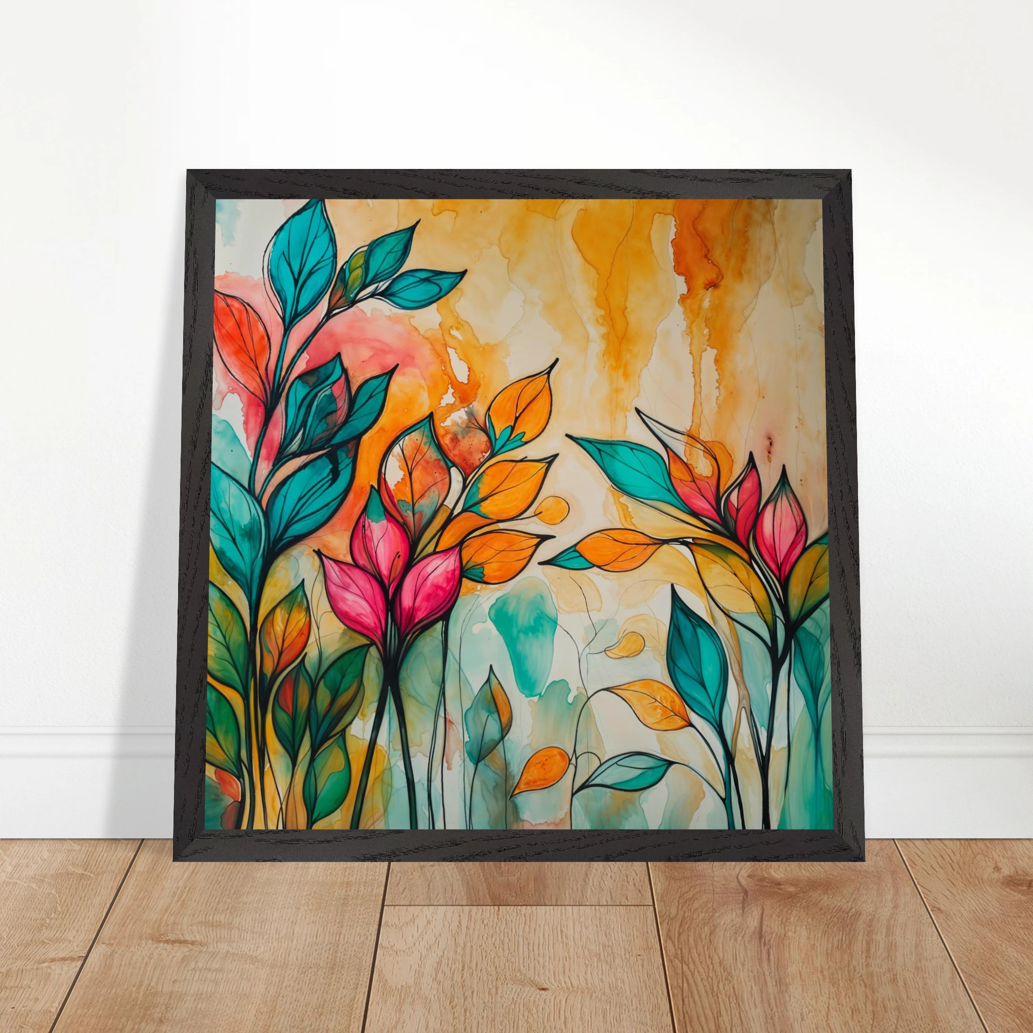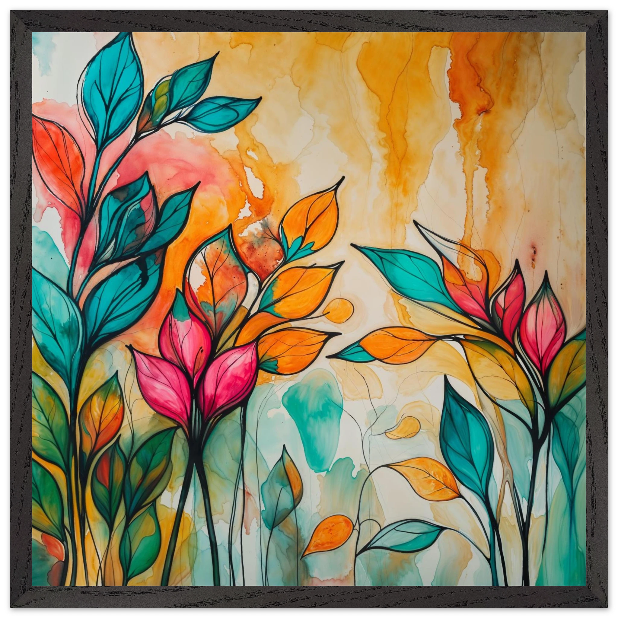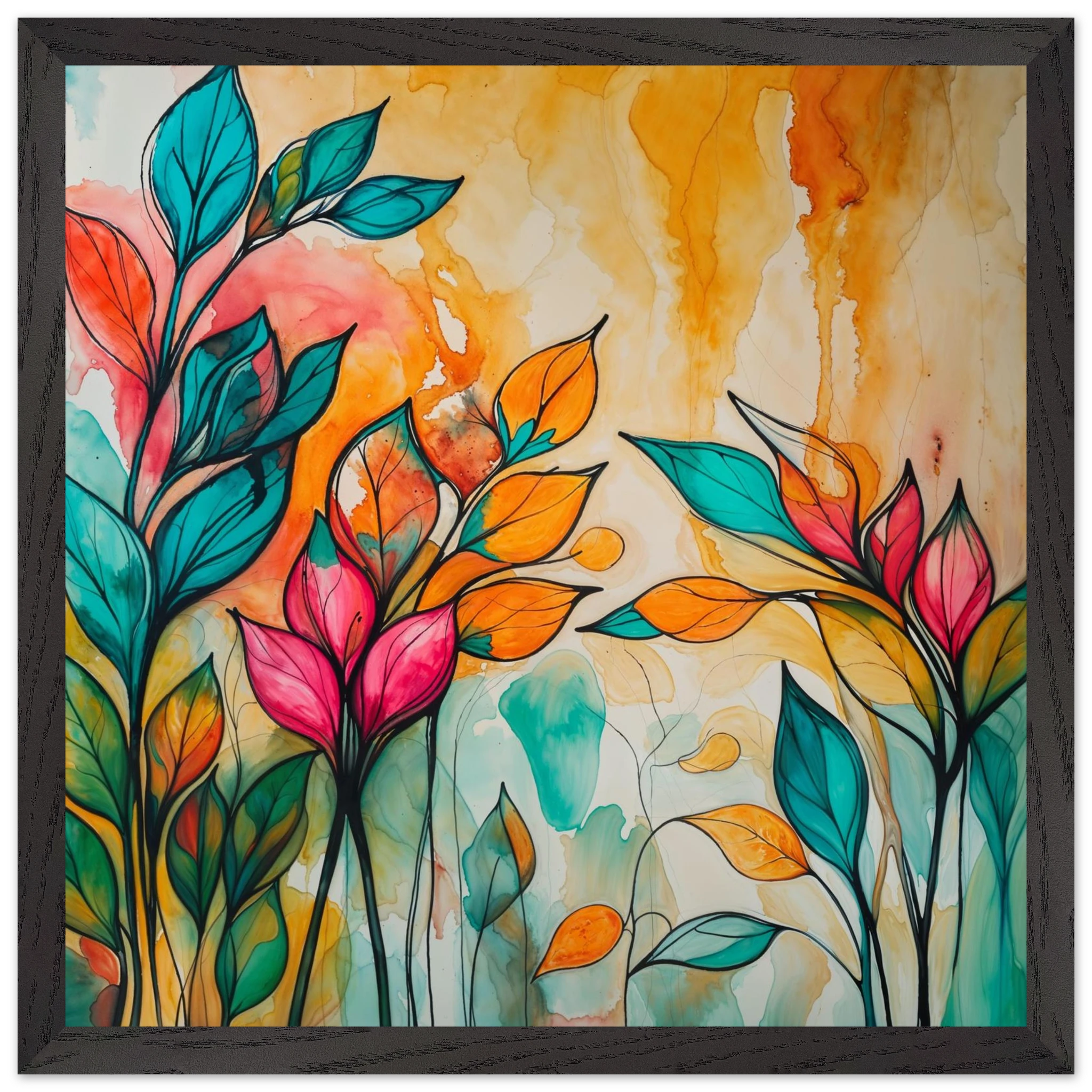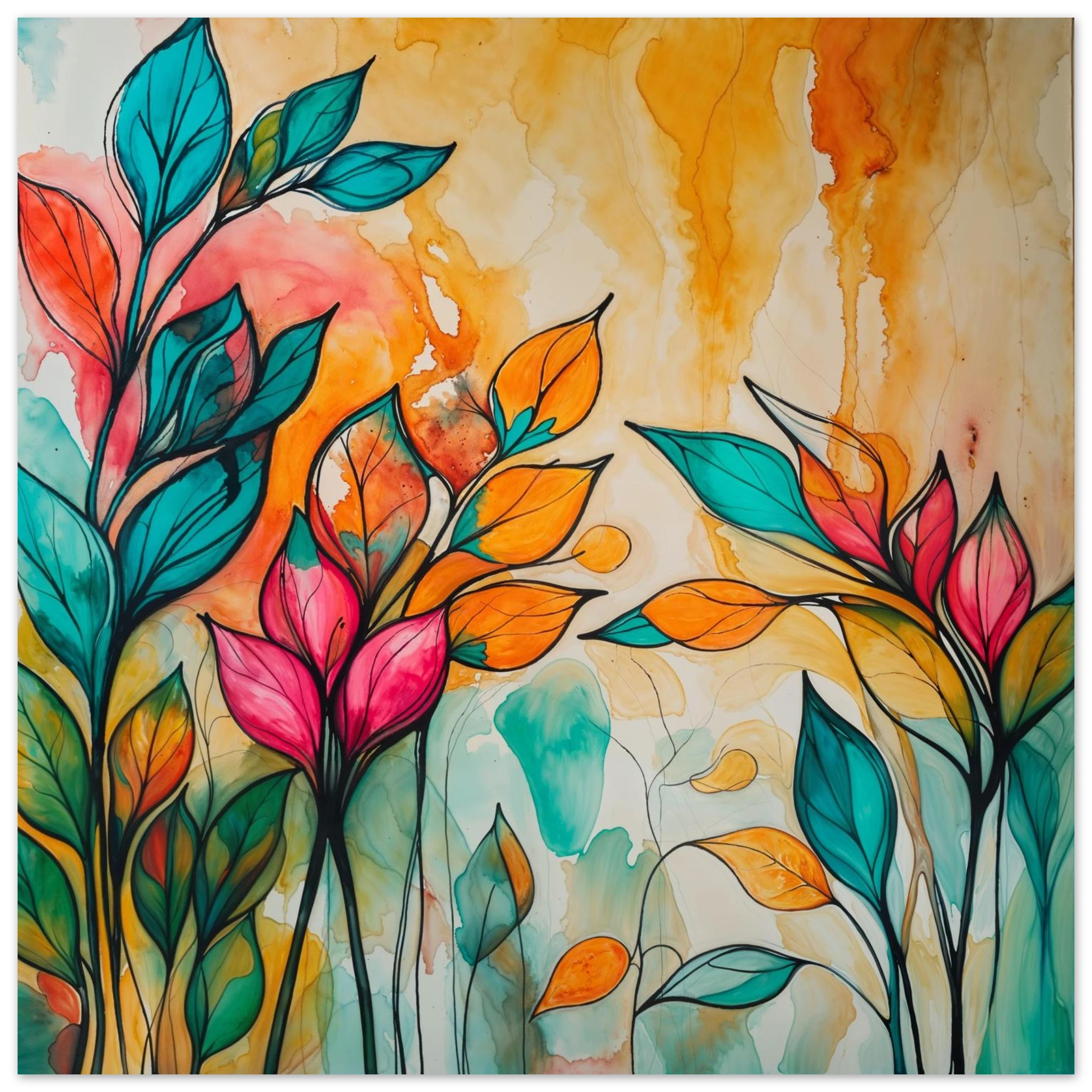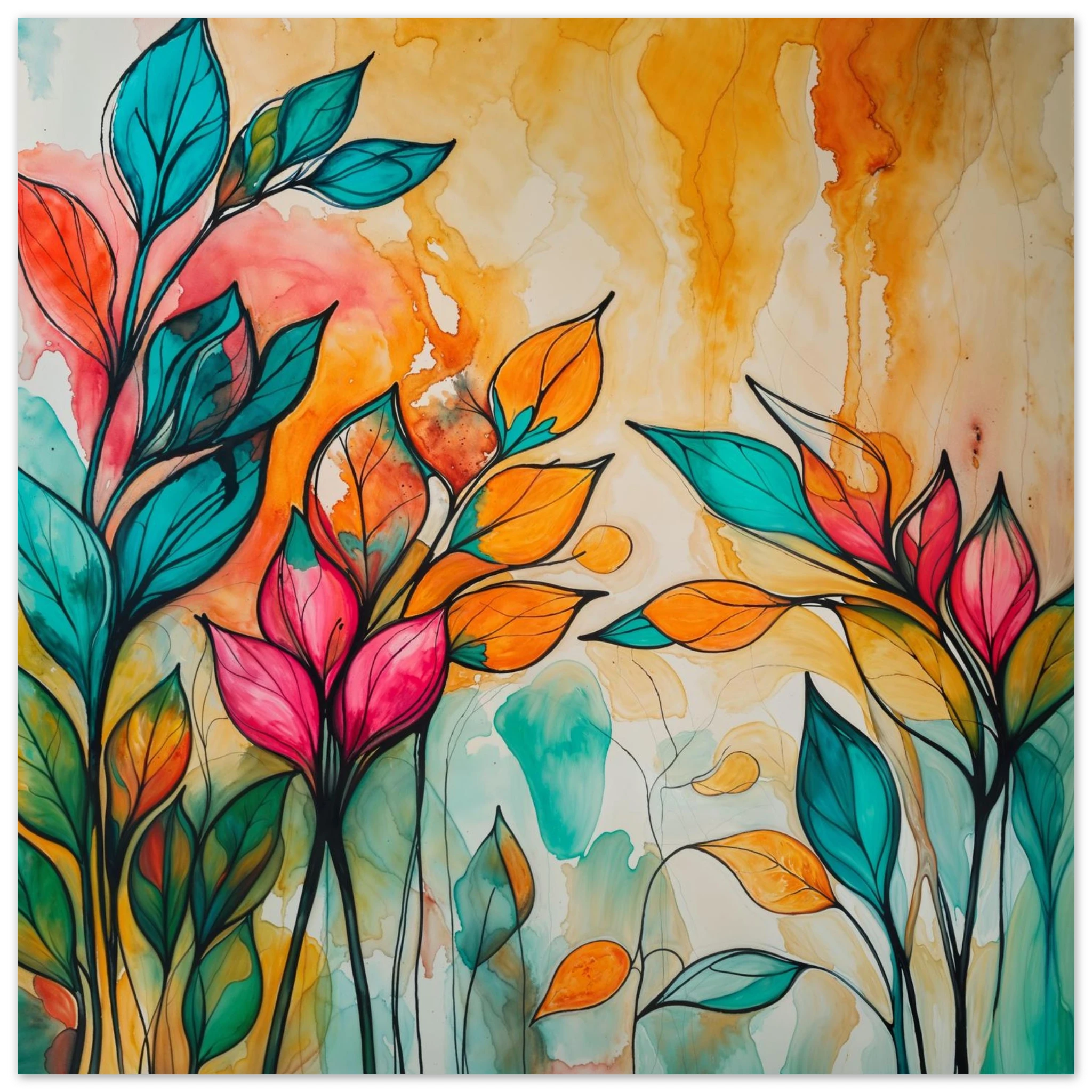 Infuse your home with energy and colour with this vibrant abstract floral watercolour print. Created with bold, expressive strokes, this digital artwork features stylised leaves and flowers in a rich, dynamic palette of teal, orange, pink, and red. The organic shapes are sharply defined by a bold black outline, adding a modern graphic punch. A wash of warm oranges and yellows in the background enhances the depth and vitality. This modern abstract art piece is focused entirely on colour and form, capturing the energetic essence of nature in a truly imaginative way.