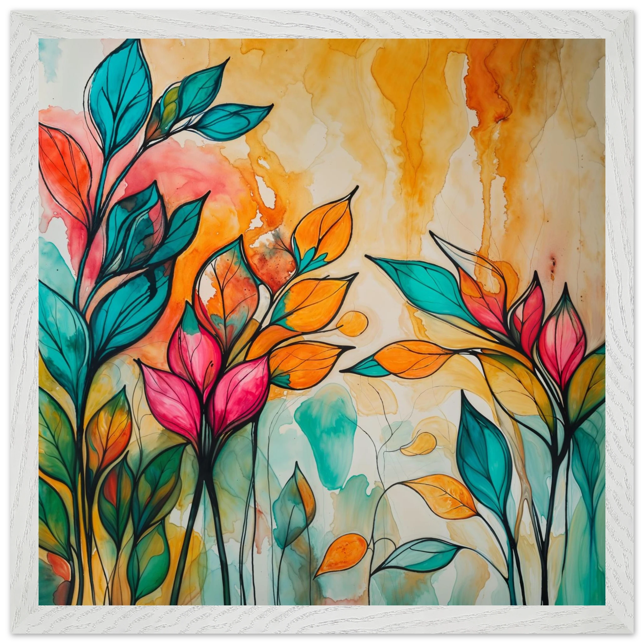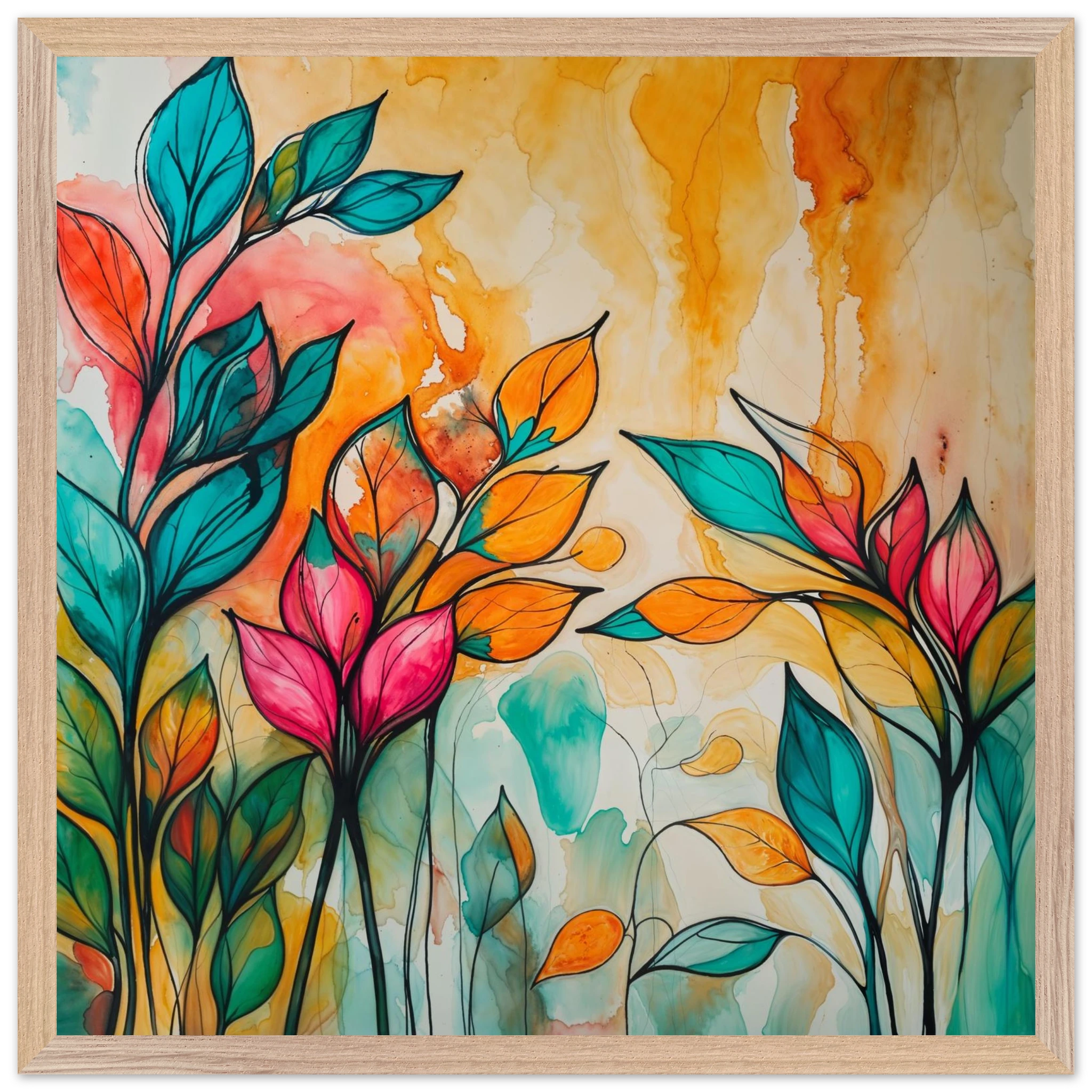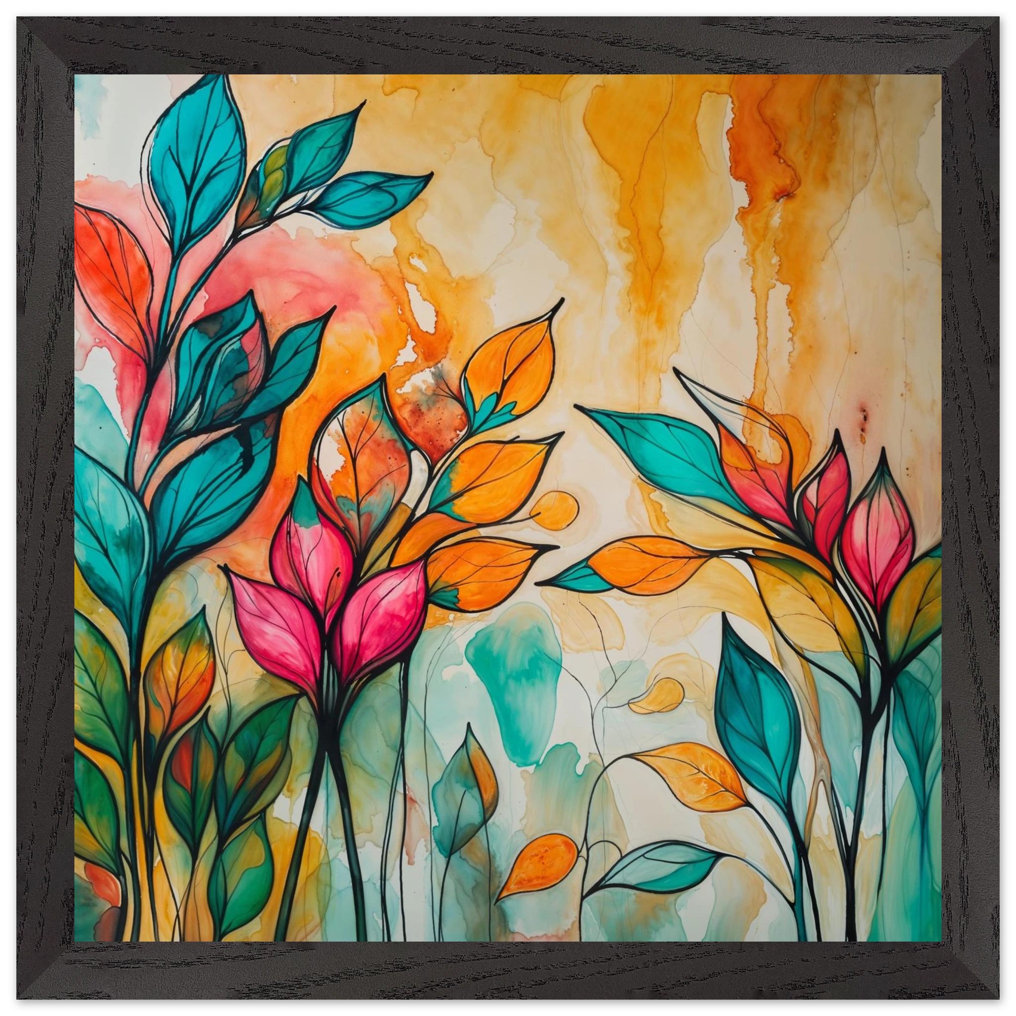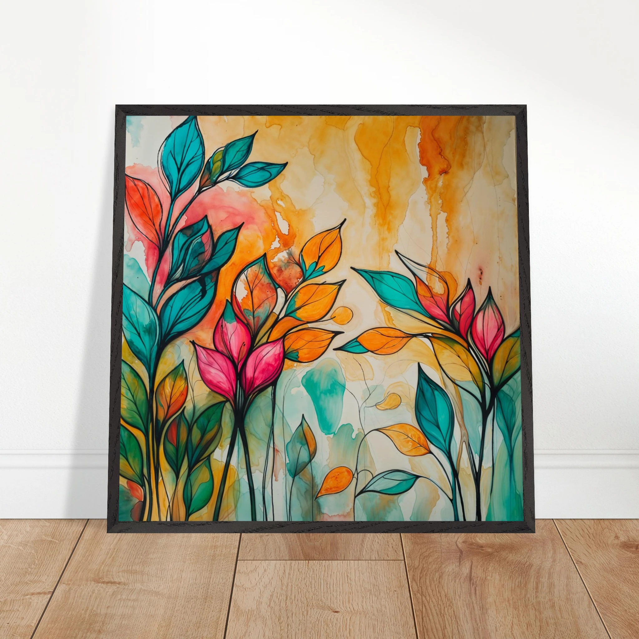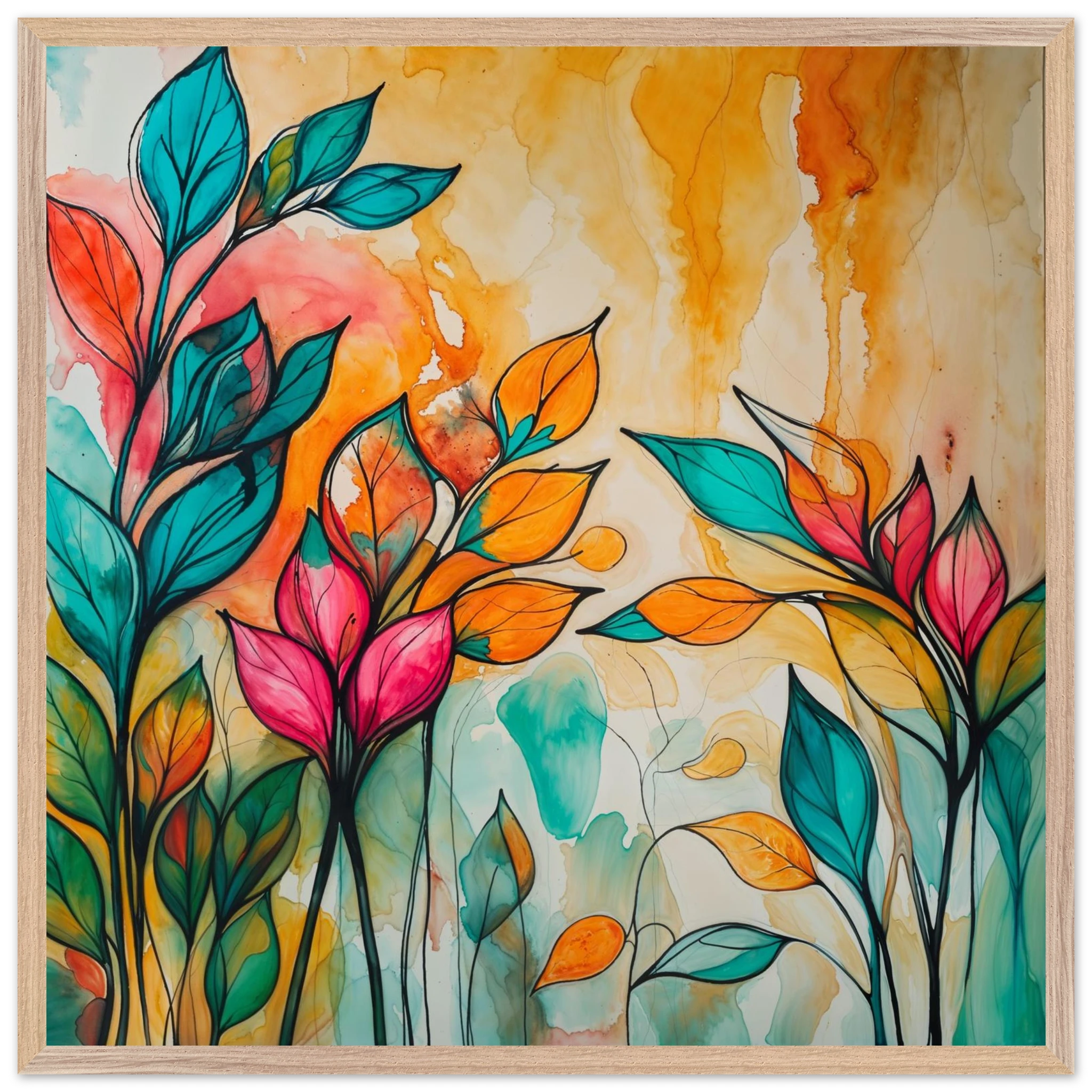 Infuse your home with energy and colour with this vibrant abstract floral watercolour print. Created with bold, expressive strokes, this digital artwork features stylised leaves and flowers in a rich, dynamic palette of teal, orange, pink, and red. The organic shapes are sharply defined by a bold black outline, adding a modern graphic punch. A wash of warm oranges and yellows in the background enhances the depth and vitality. This modern abstract art piece is focused entirely on colour and form, capturing the energetic essence of nature in a truly imaginative way.