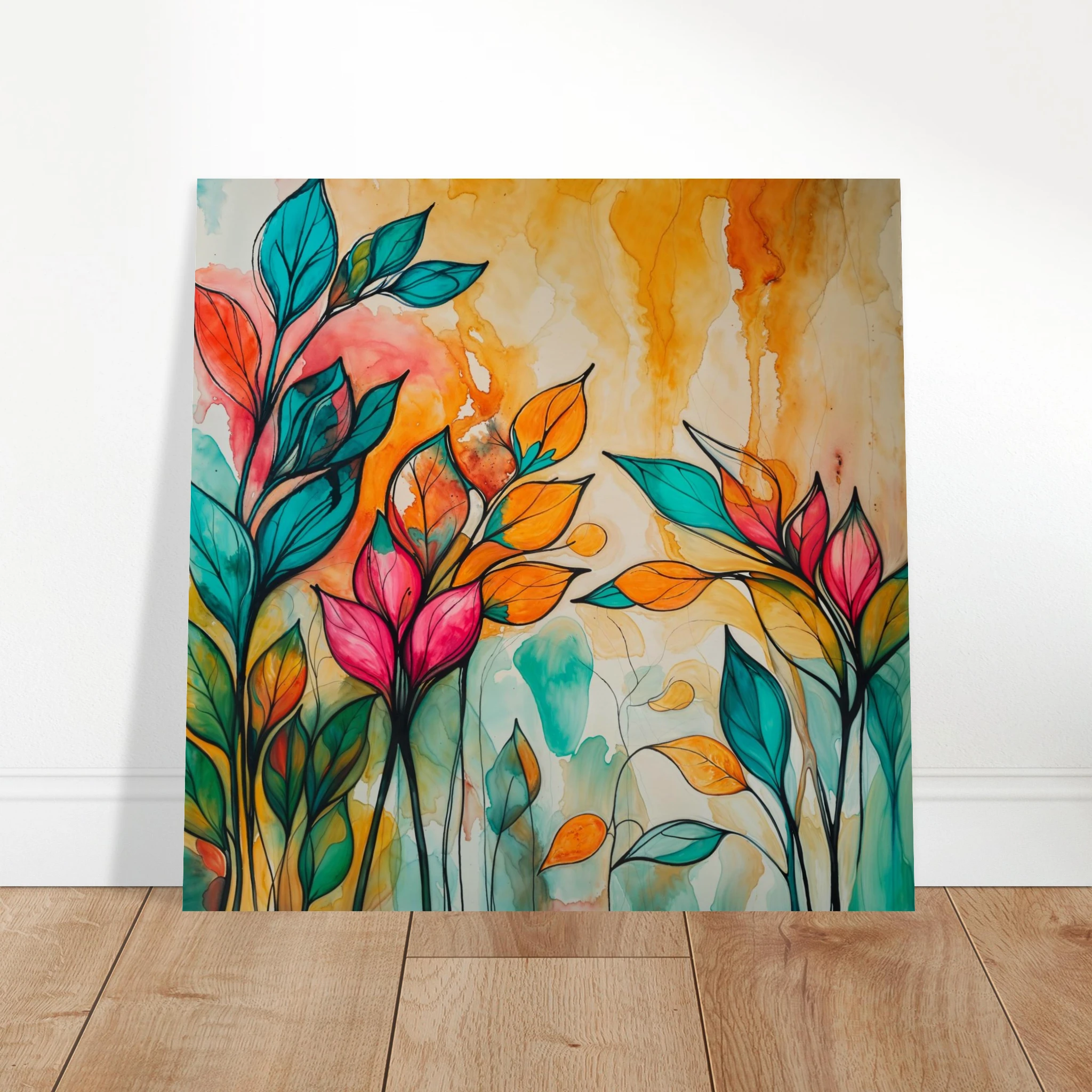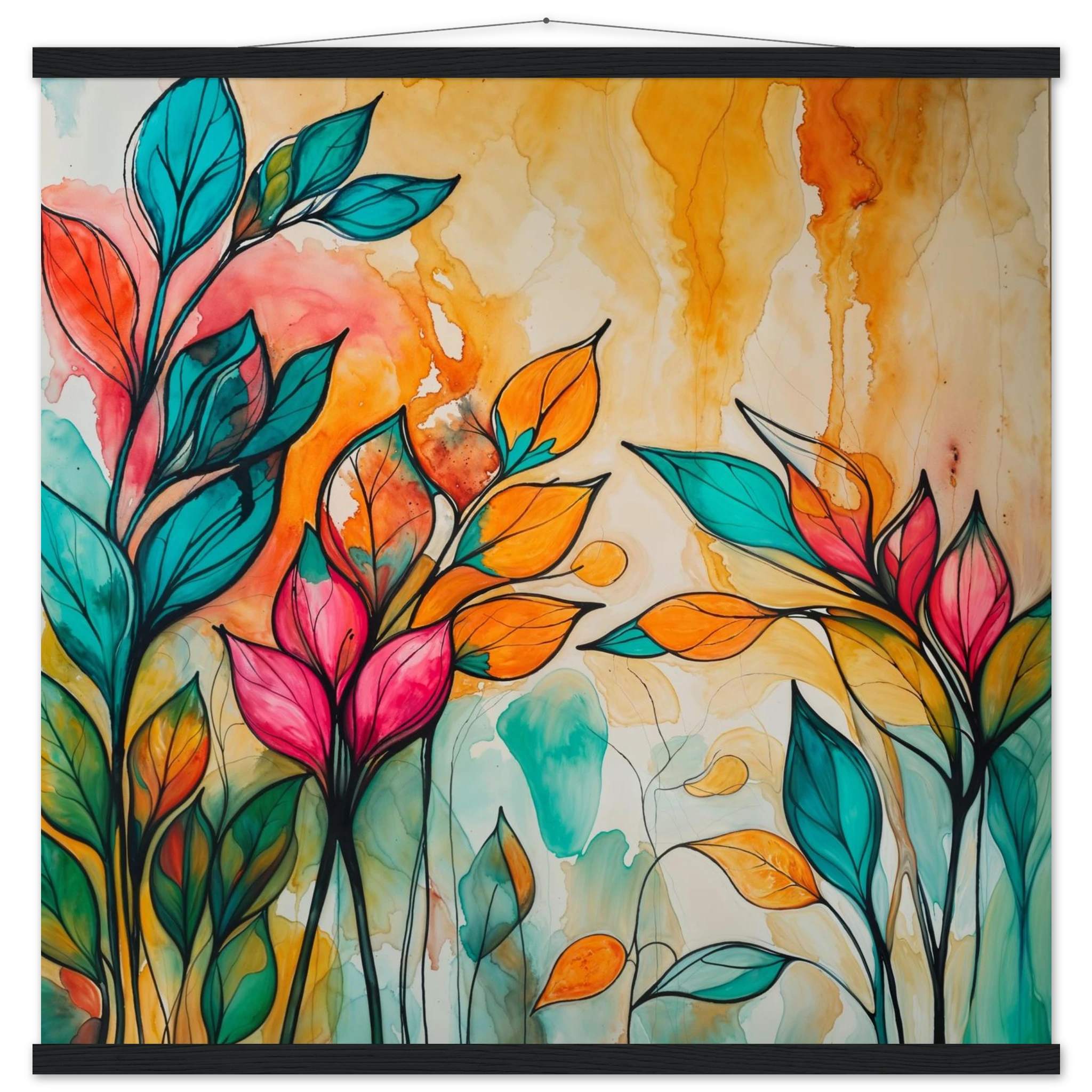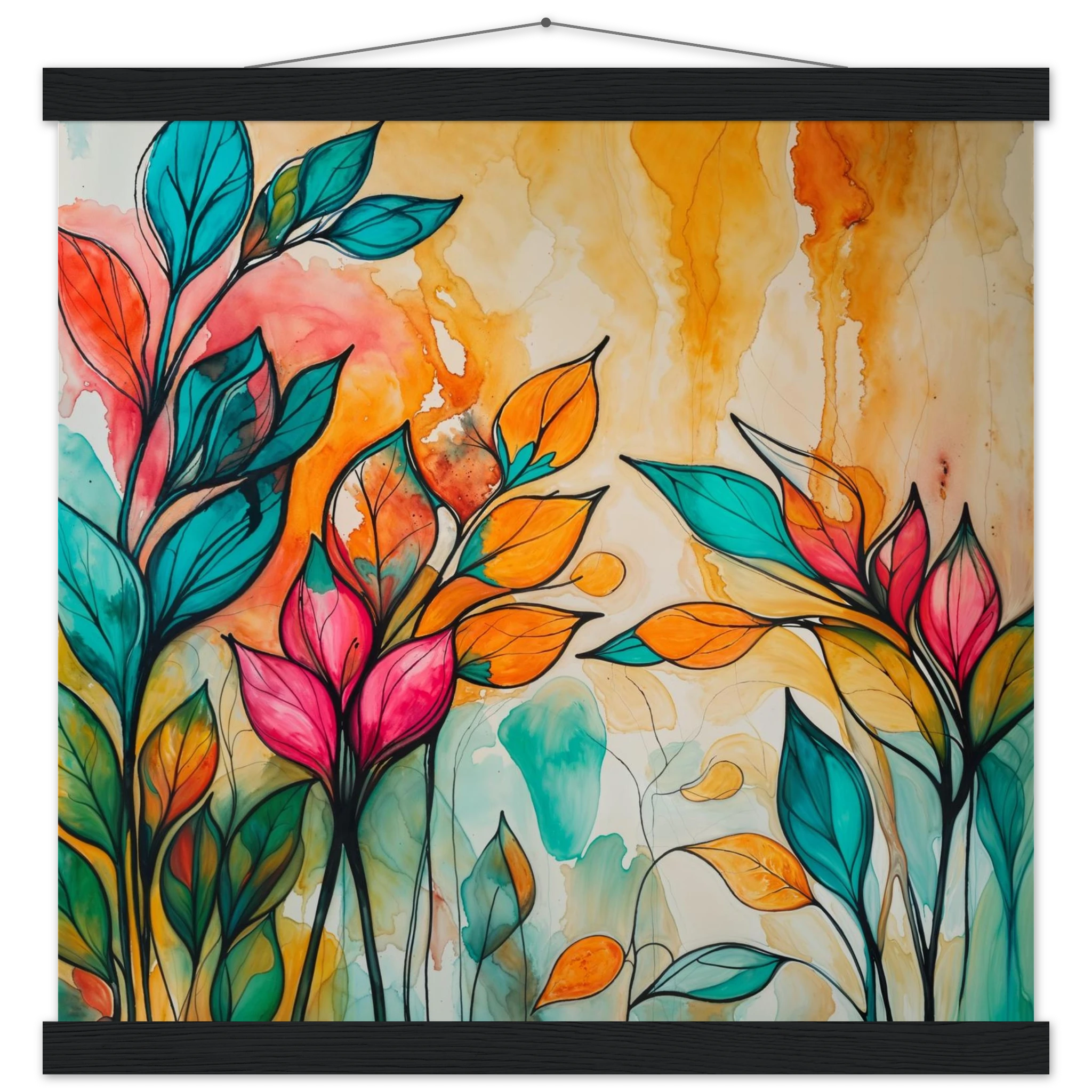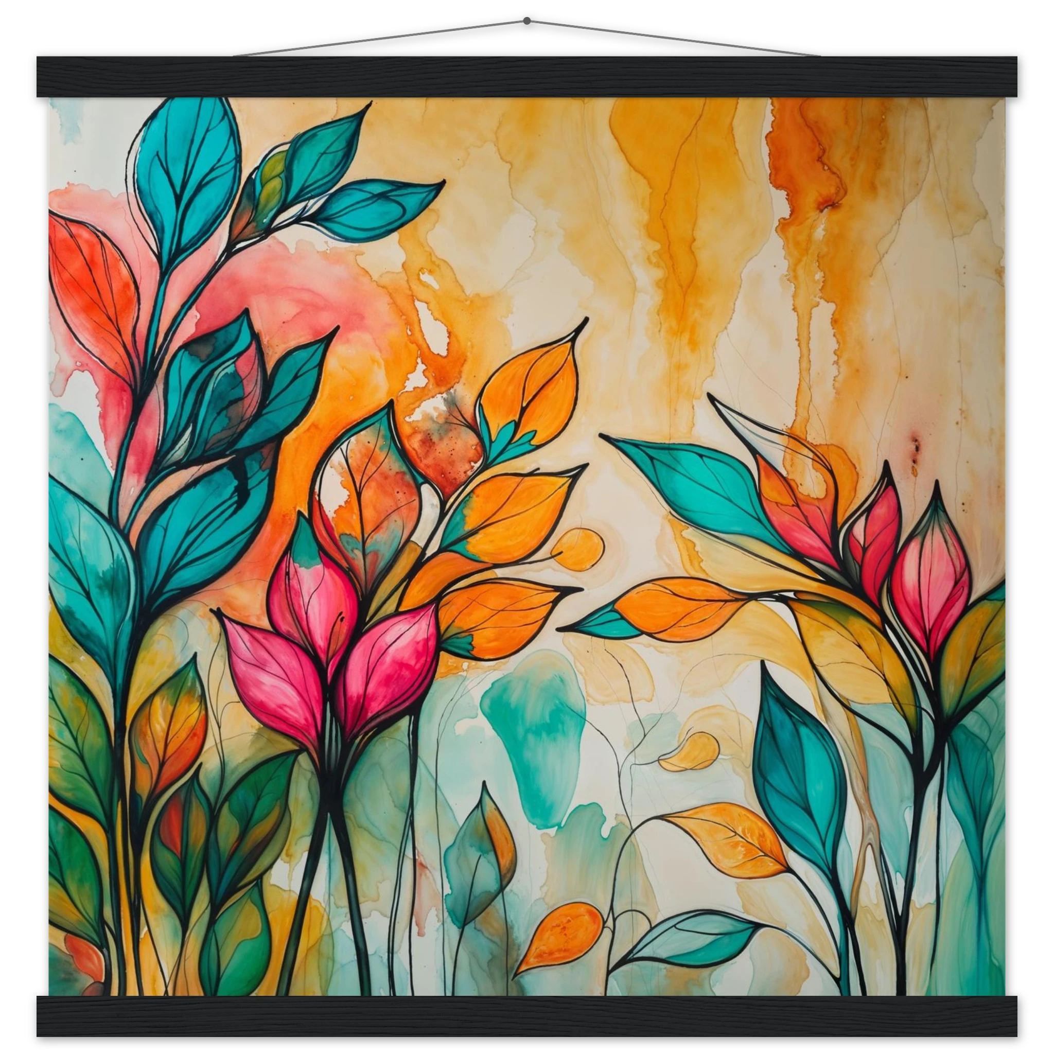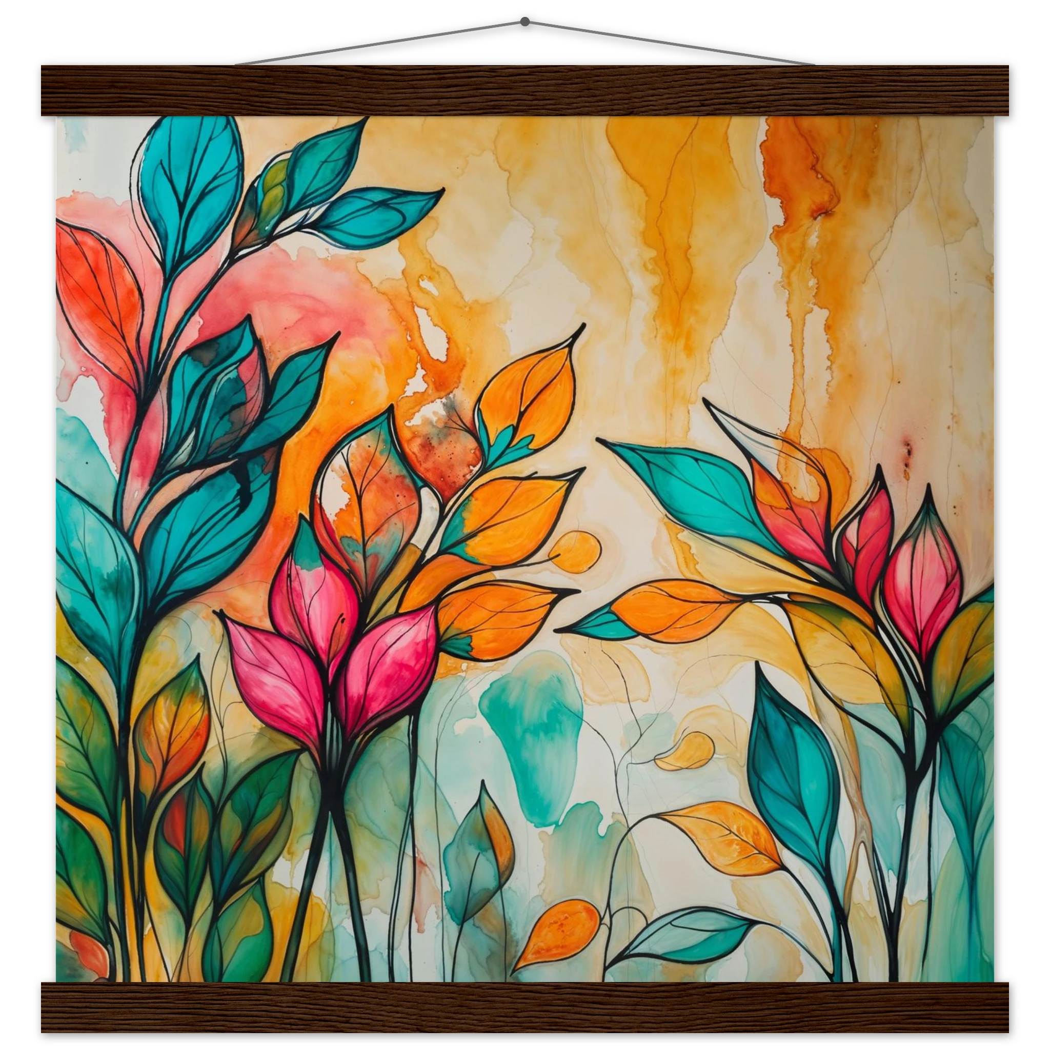Infuse your home with energy and colour with this vibrant abstract floral watercolour print. Created with bold, expressive strokes, this digital artwork features stylised leaves and flowers in a rich, dynamic palette of teal, orange, pink, and red. The organic shapes are sharply defined by a bold black outline, adding a modern graphic punch. A wash of warm oranges and yellows in the background enhances the depth and vitality. This modern abstract art piece is focused entirely on colour and form, capturing the energetic essence of nature in a truly imaginative way.