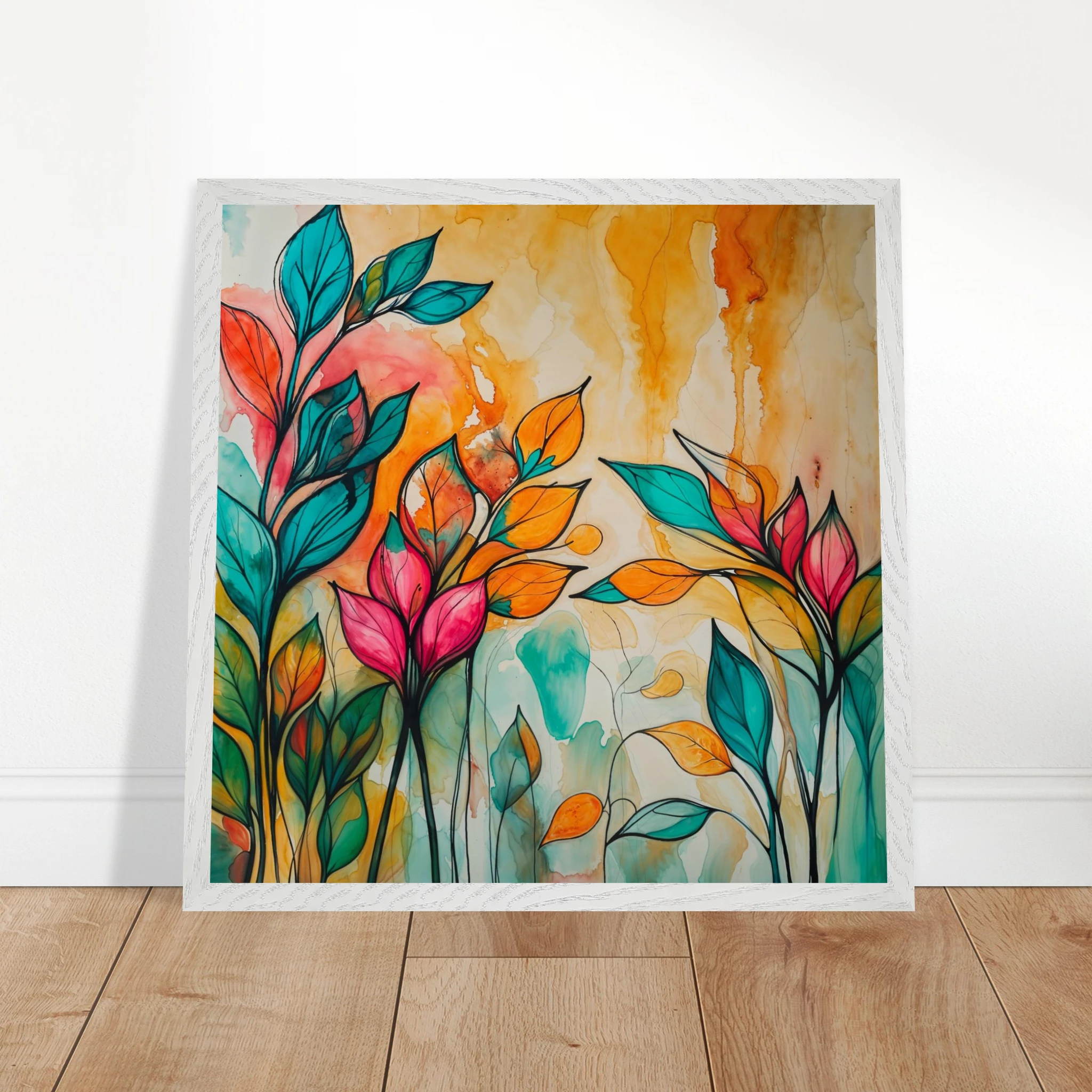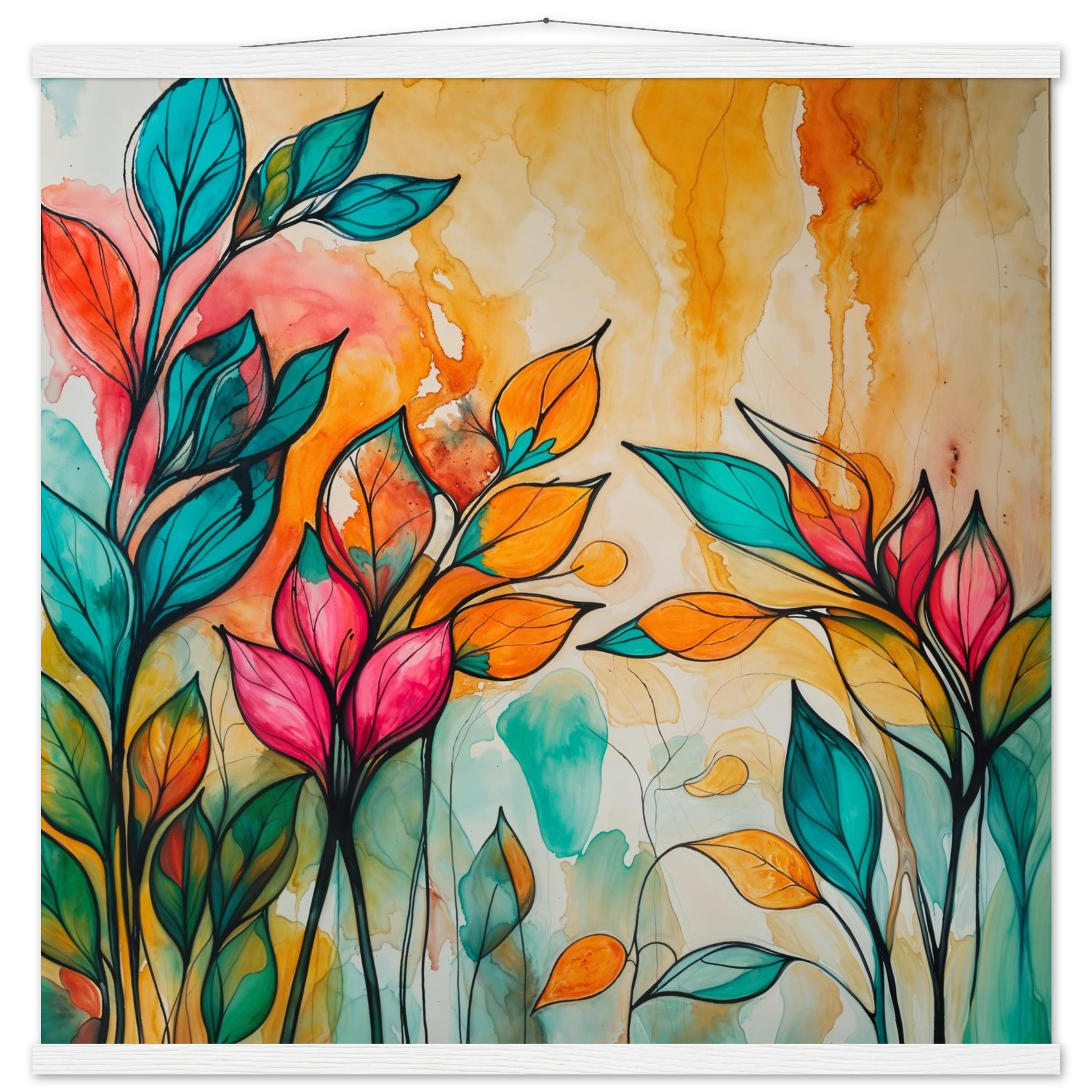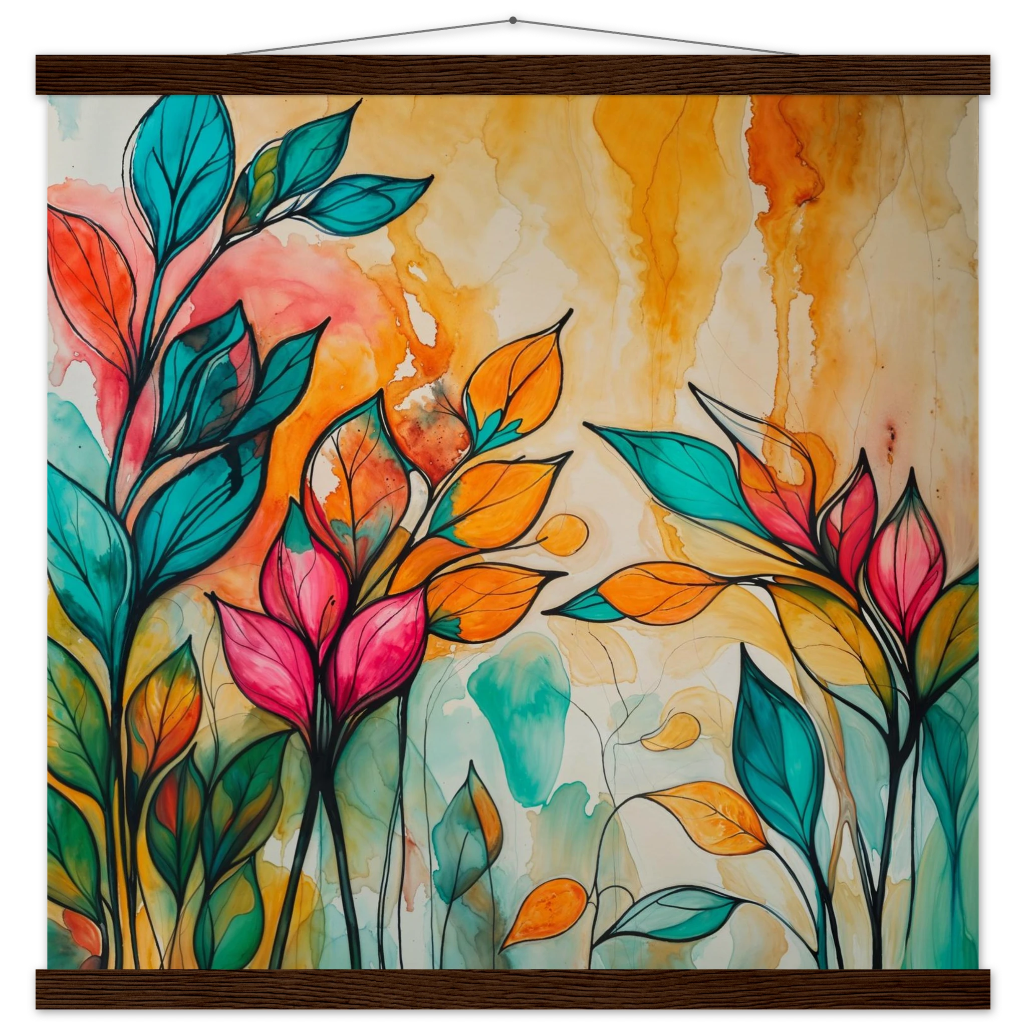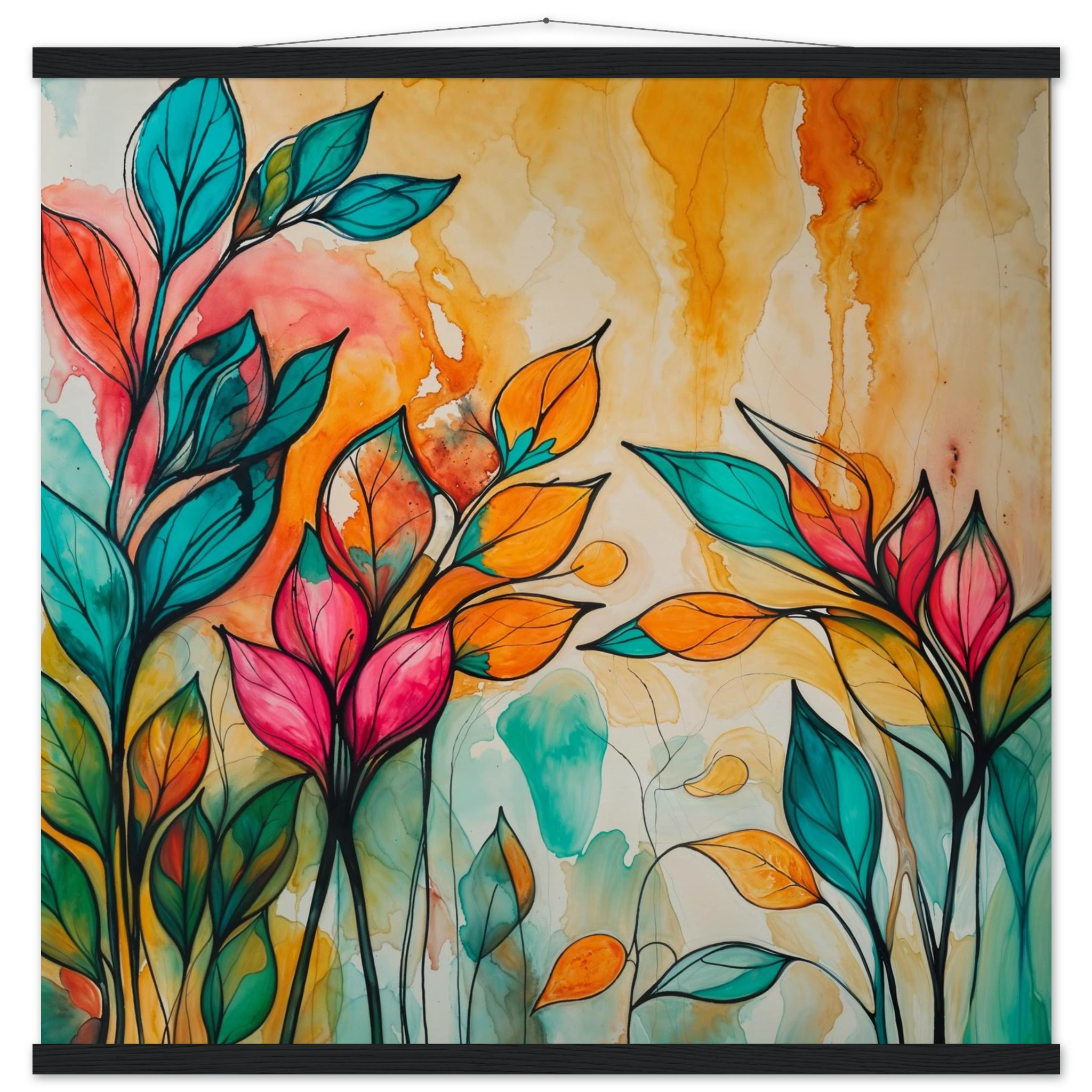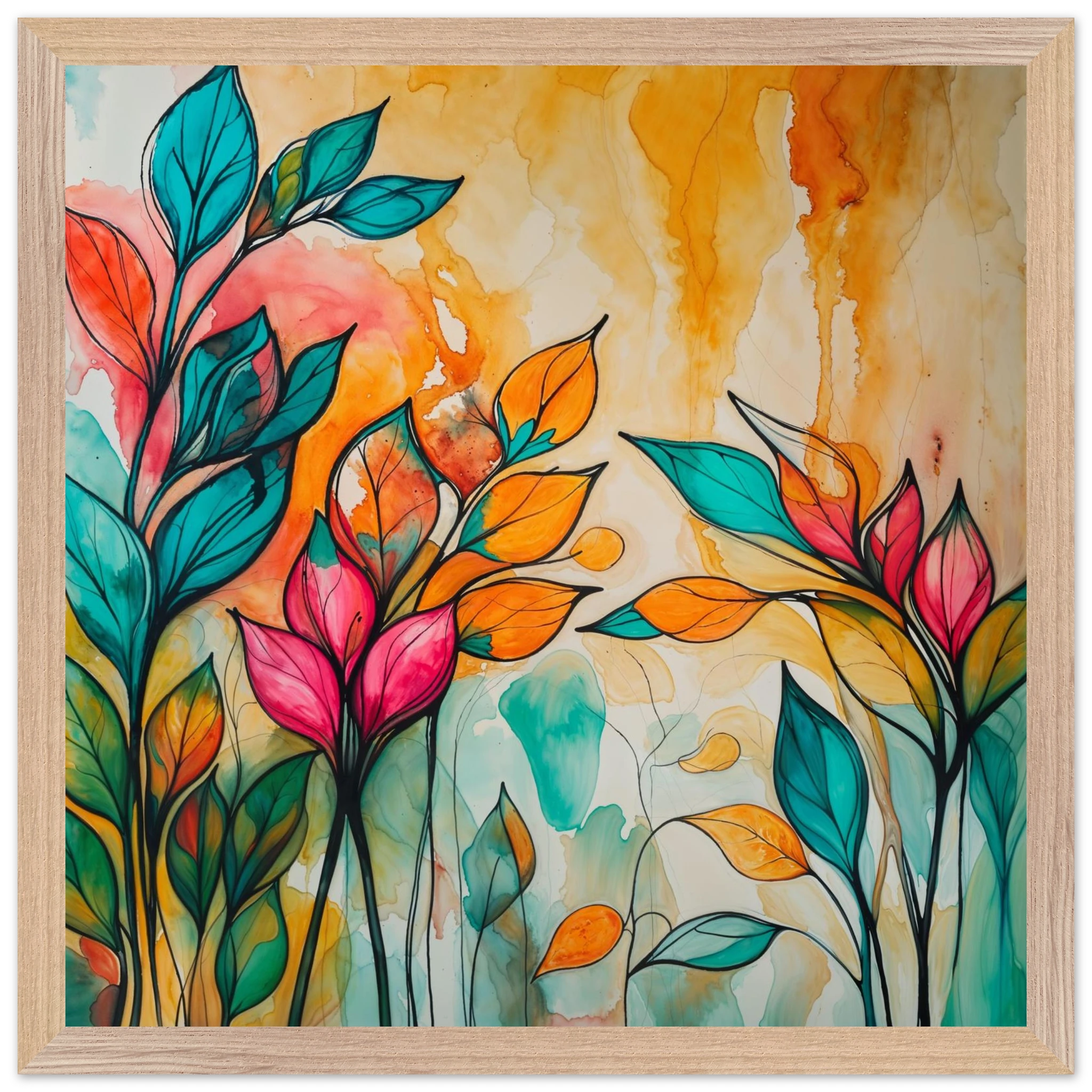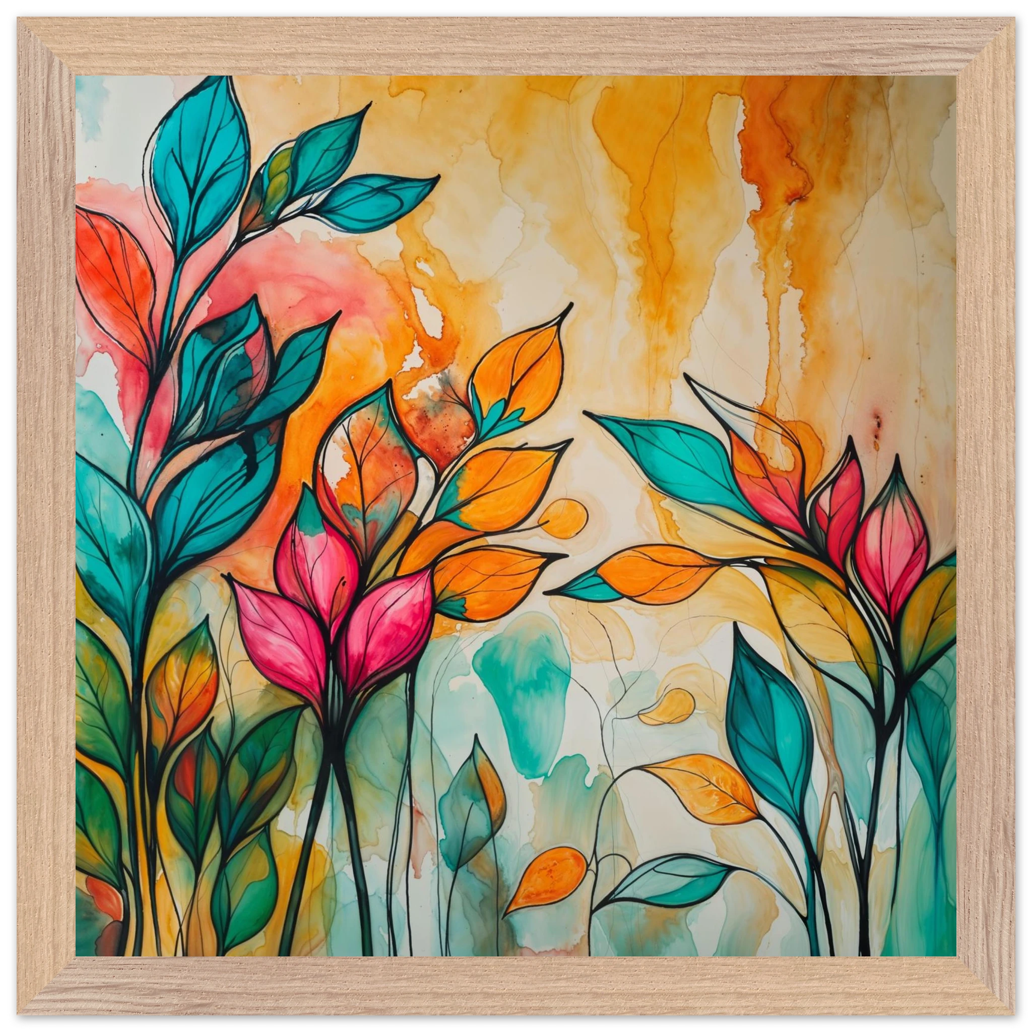 Infuse your home with energy and colour with this vibrant abstract floral watercolour print. Created with bold, expressive strokes, this digital artwork features stylised leaves and flowers in a rich, dynamic palette of teal, orange, pink, and red. The organic shapes are sharply defined by a bold black outline, adding a modern graphic punch. A wash of warm oranges and yellows in the background enhances the depth and vitality. This modern abstract art piece is focused entirely on colour and form, capturing the energetic essence of nature in a truly imaginative way.