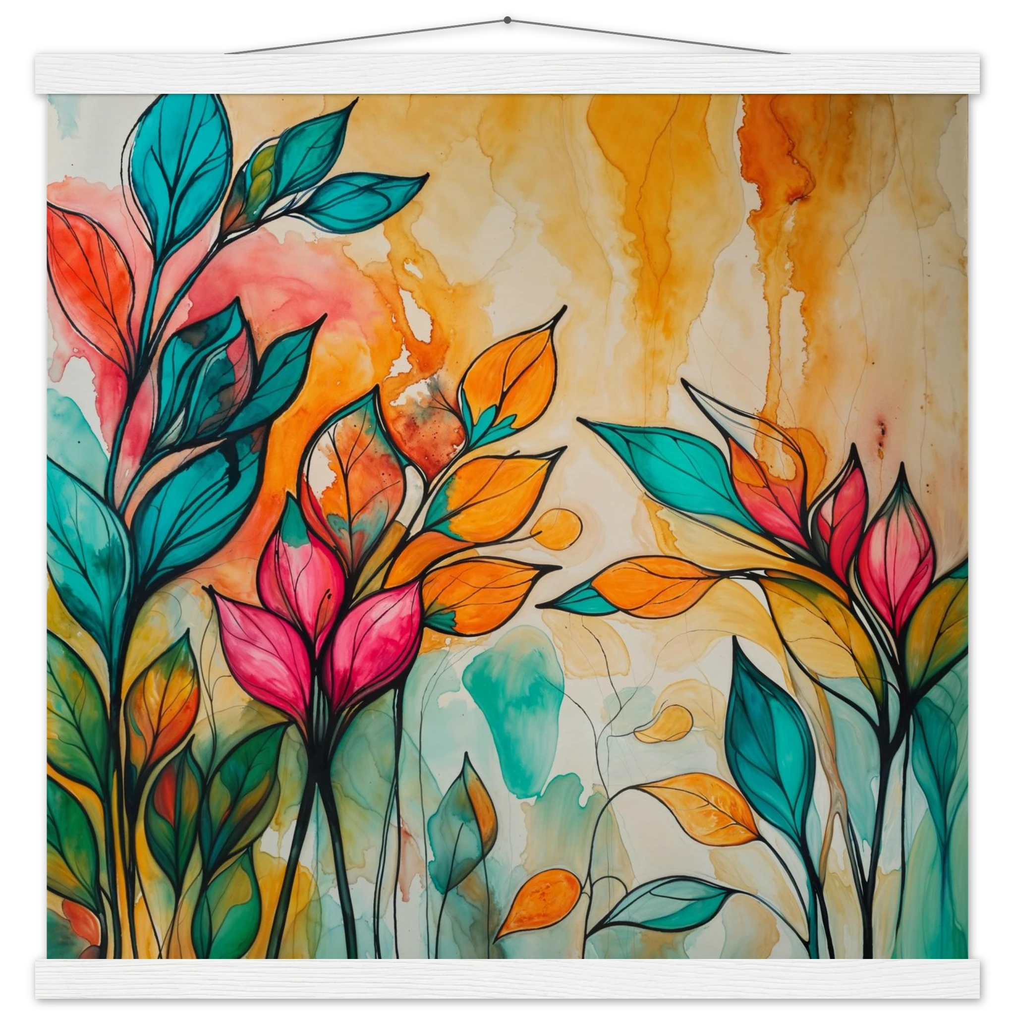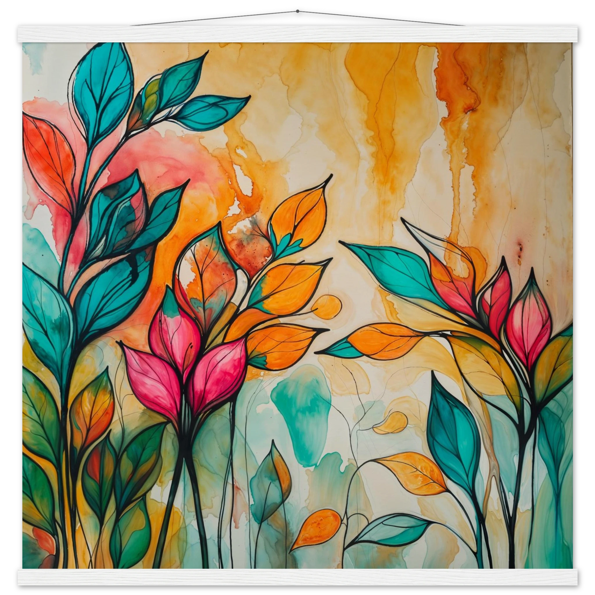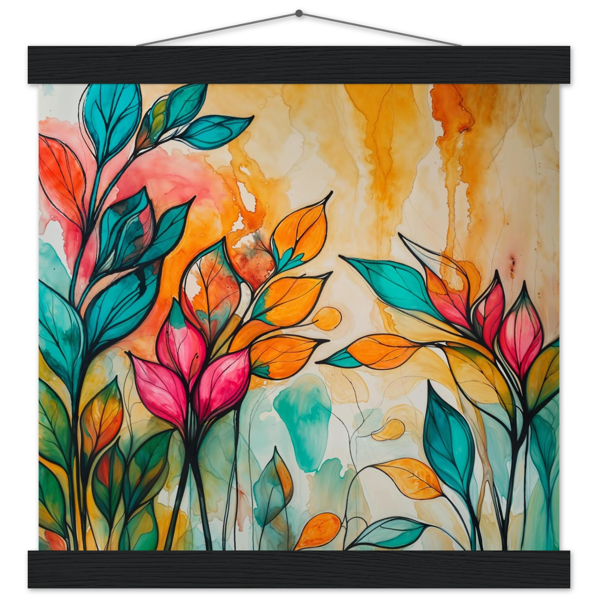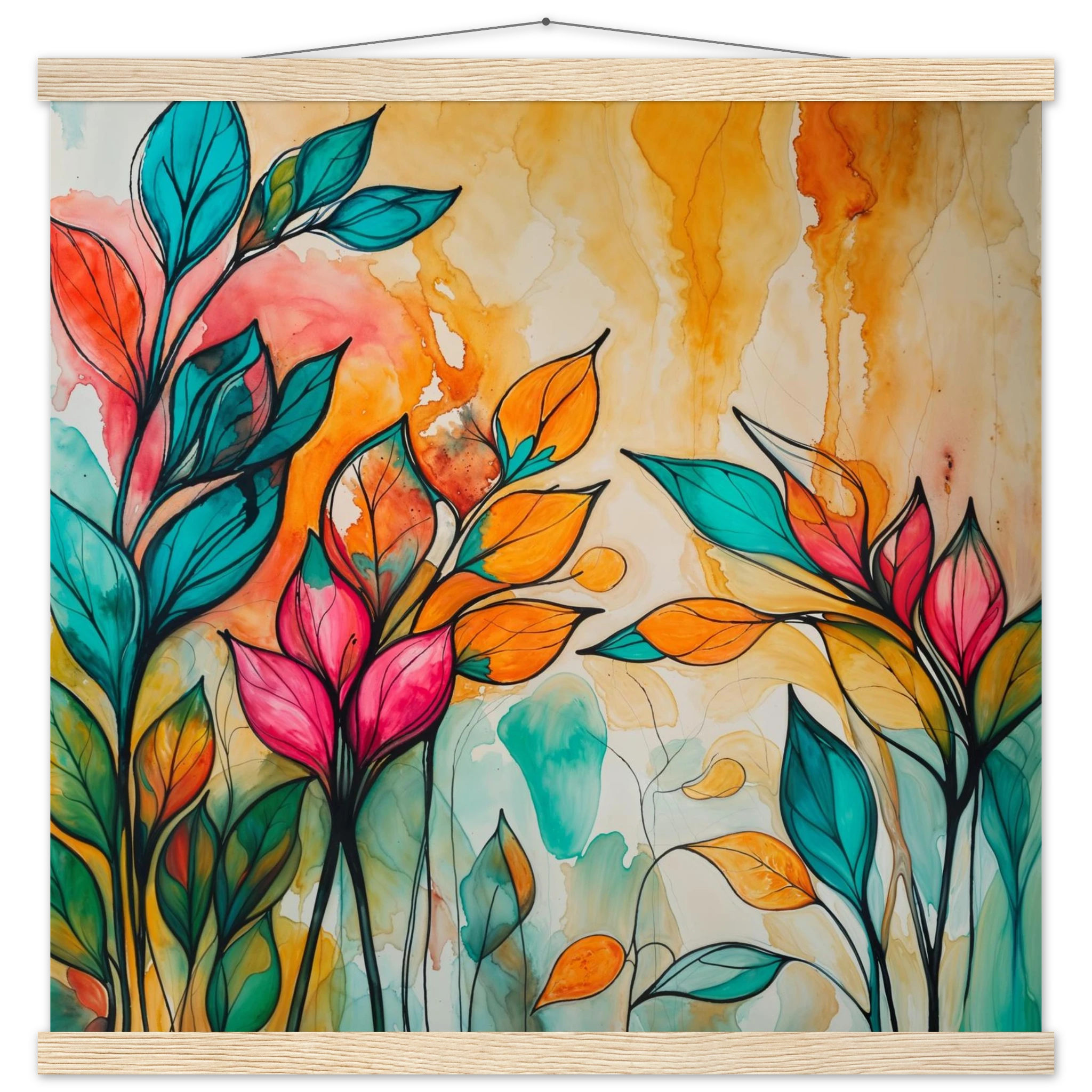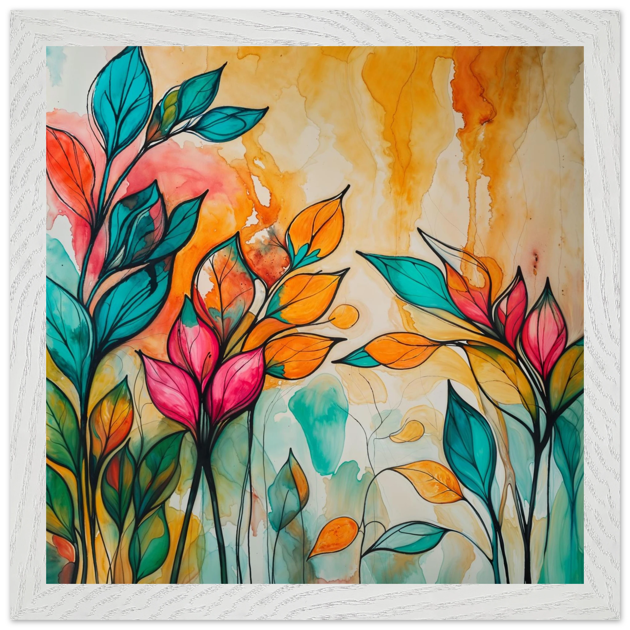 Infuse your home with energy and colour with this vibrant abstract floral watercolour print. Created with bold, expressive strokes, this digital artwork features stylised leaves and flowers in a rich, dynamic palette of teal, orange, pink, and red. The organic shapes are sharply defined by a bold black outline, adding a modern graphic punch. A wash of warm oranges and yellows in the background enhances the depth and vitality. This modern abstract art piece is focused entirely on colour and form, capturing the energetic essence of nature in a truly imaginative way.