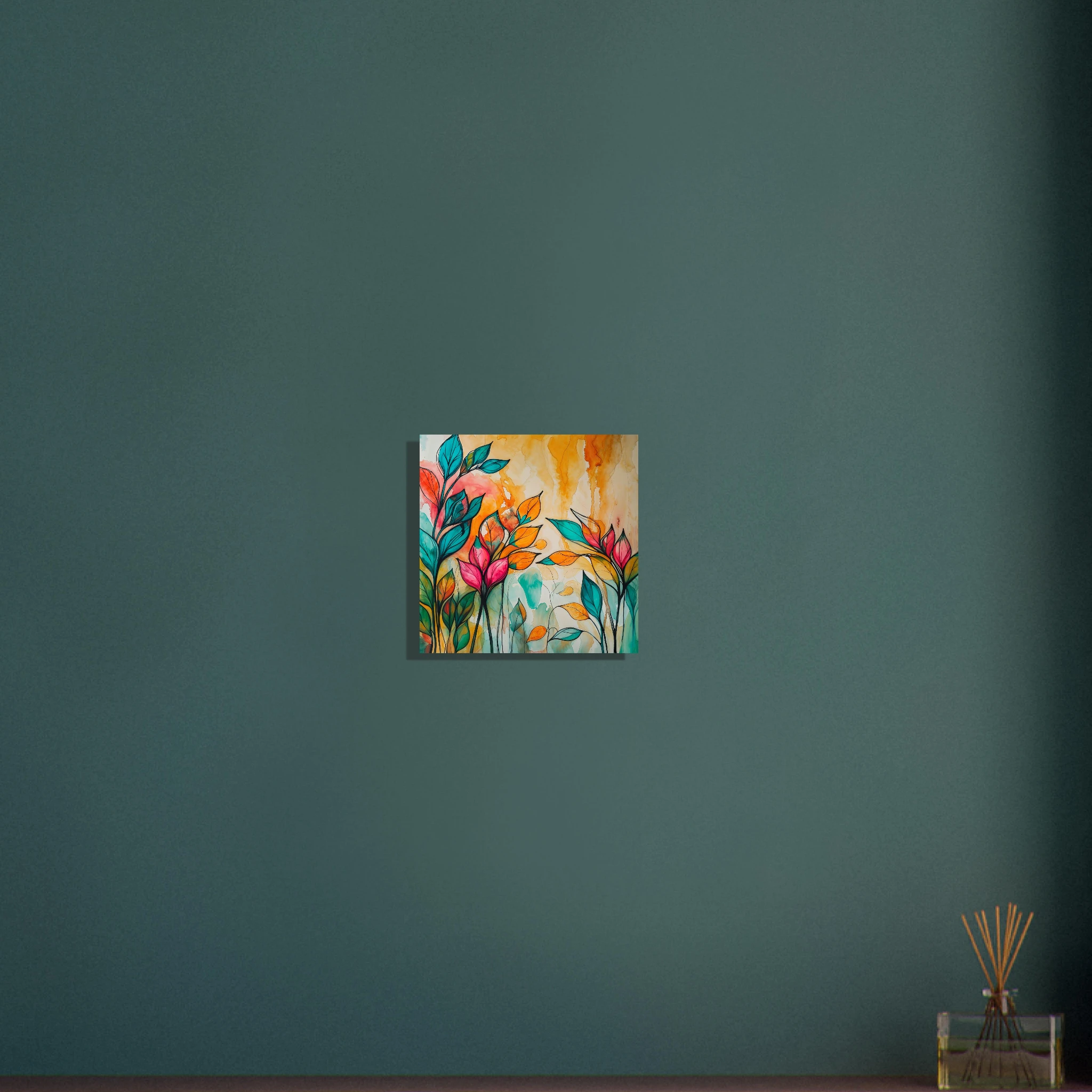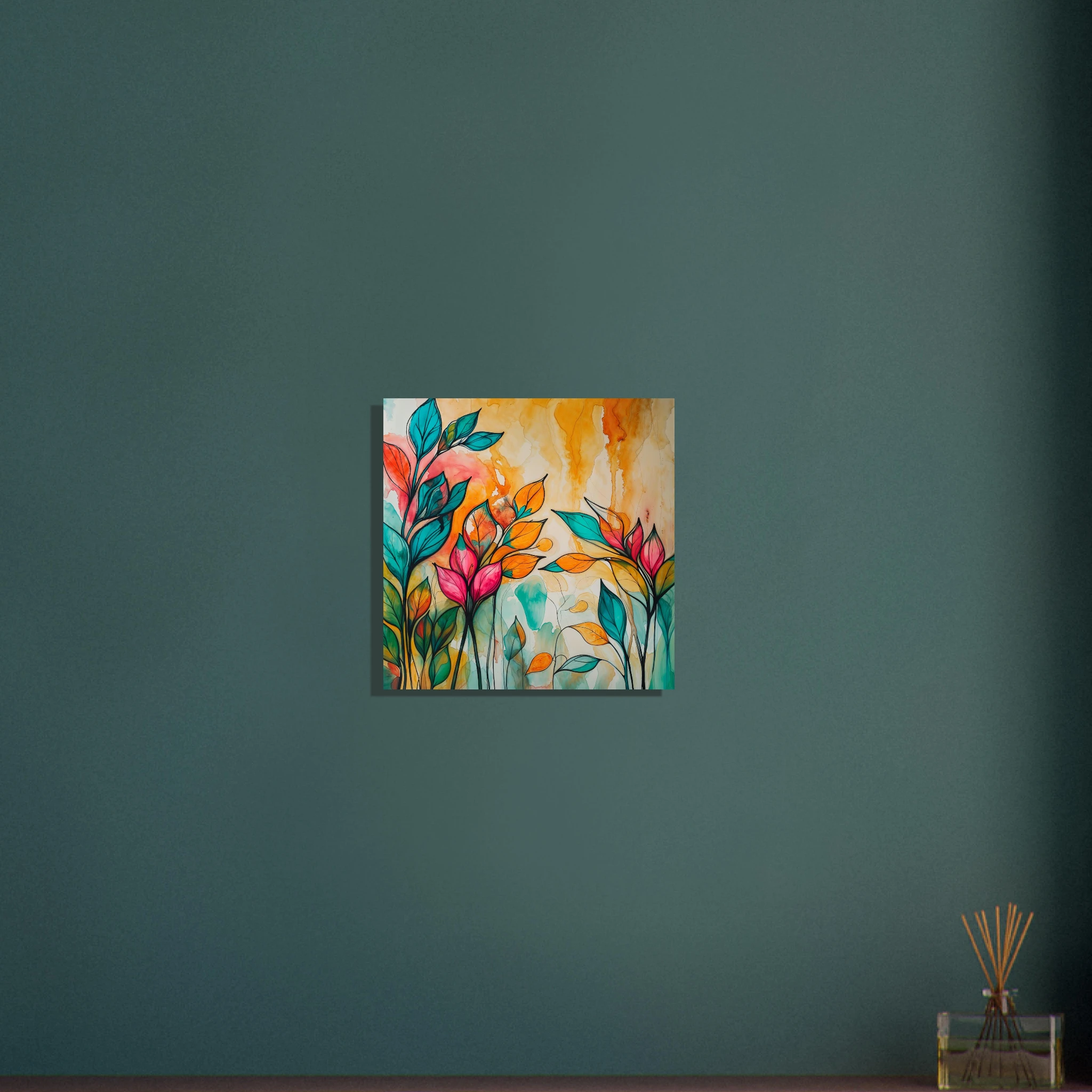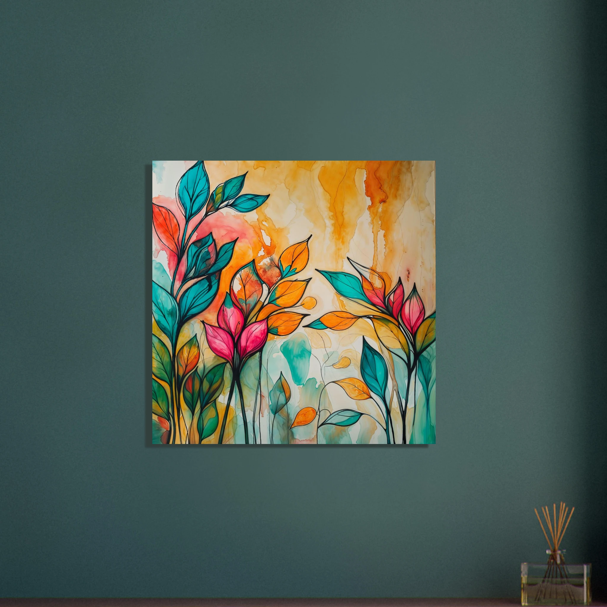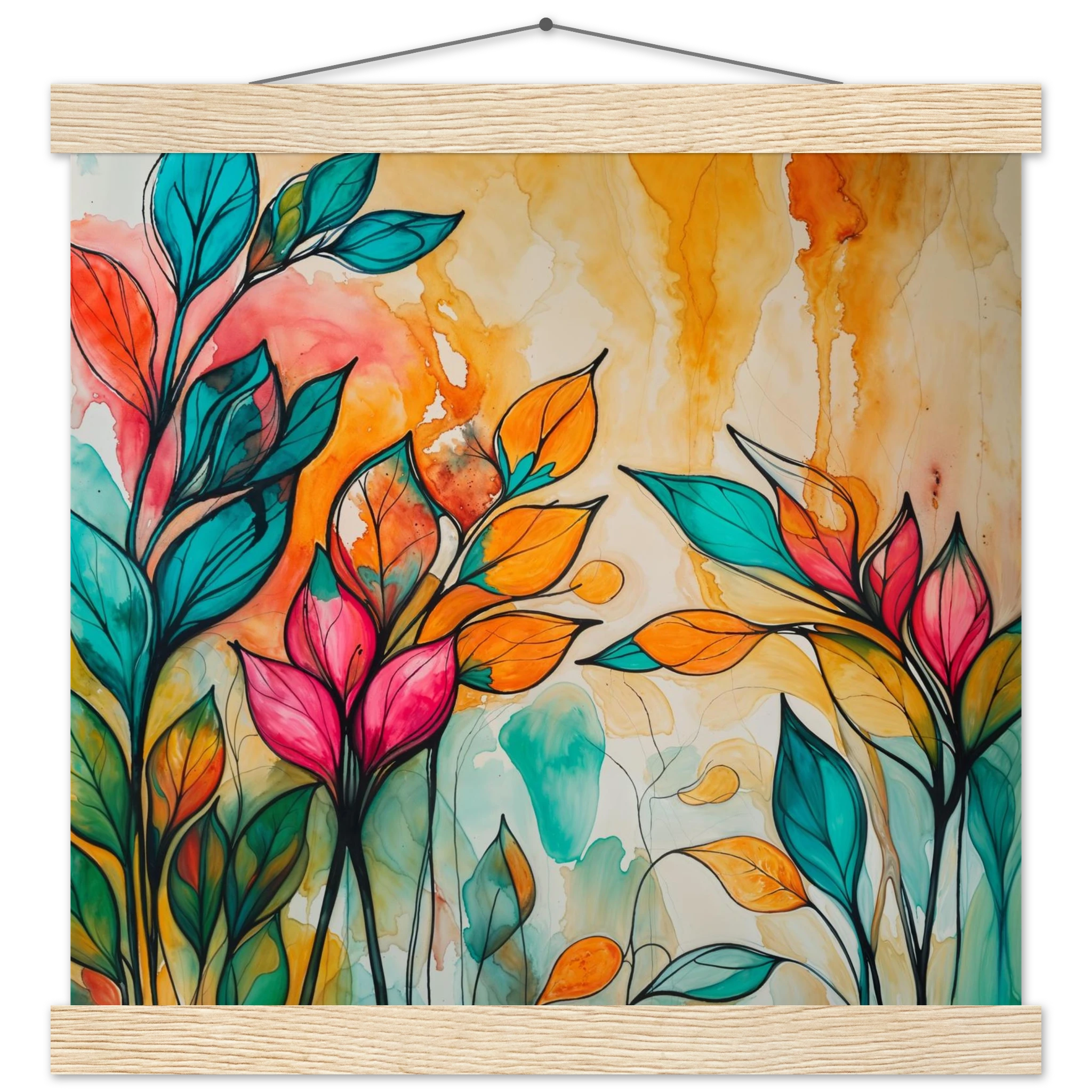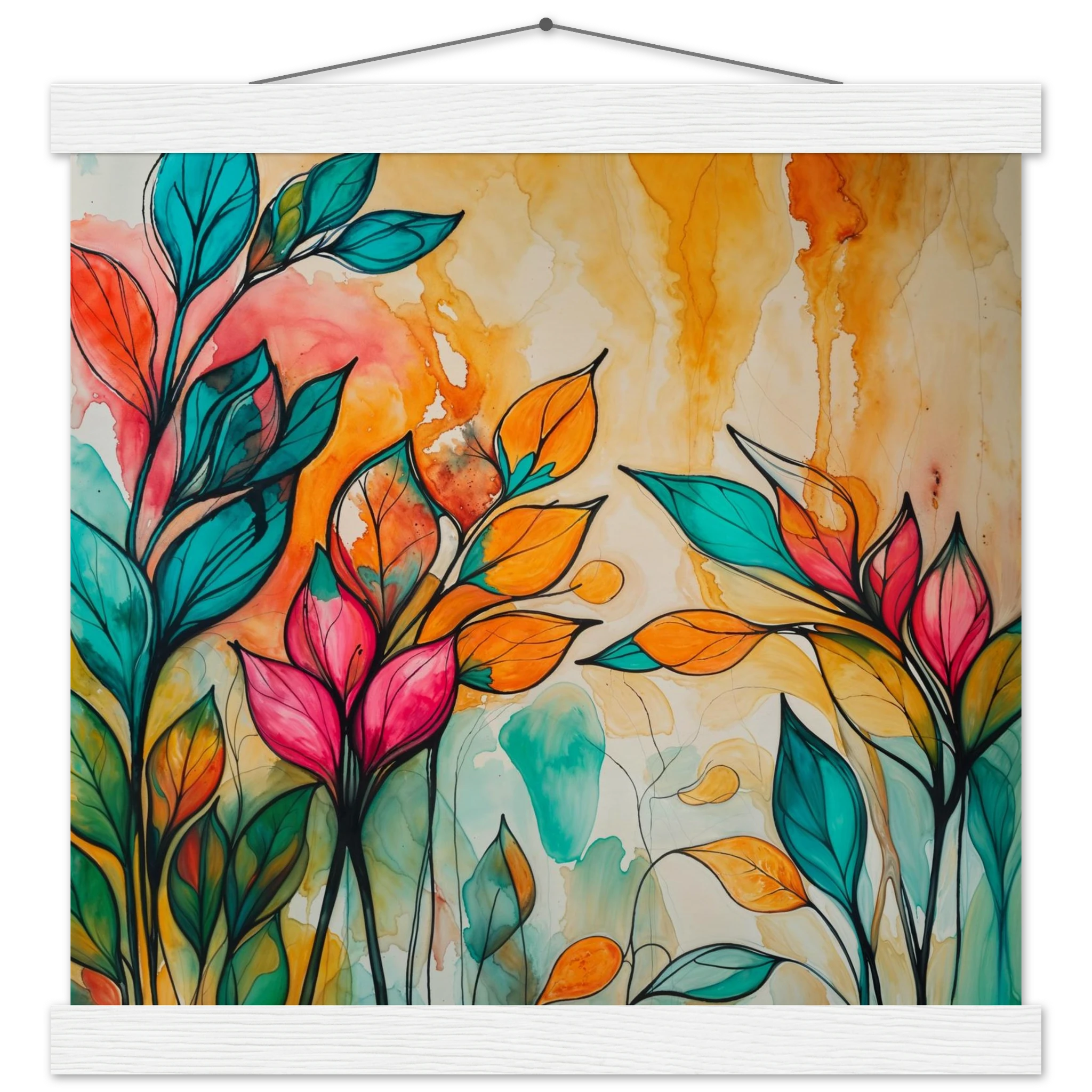 Infuse your home with energy and colour with this vibrant abstract floral watercolour print. Created with bold, expressive strokes, this digital artwork features stylised leaves and flowers in a rich, dynamic palette of teal, orange, pink, and red. The organic shapes are sharply defined by a bold black outline, adding a modern graphic punch. A wash of warm oranges and yellows in the background enhances the depth and vitality. This modern abstract art piece is focused entirely on colour and form, capturing the energetic essence of nature in a truly imaginative way.
