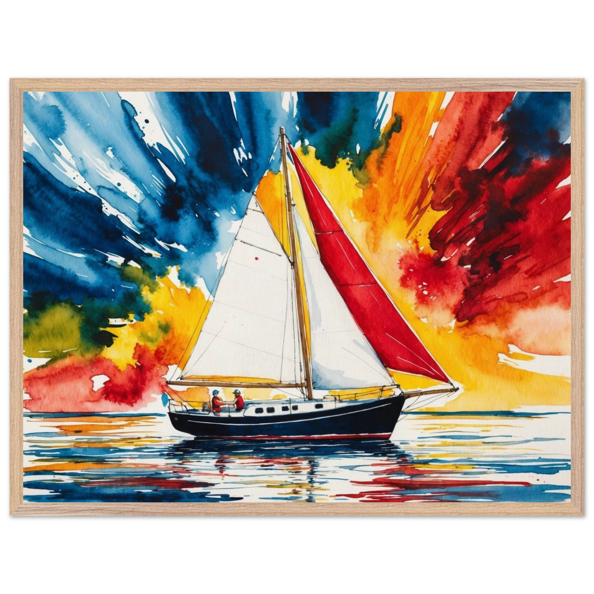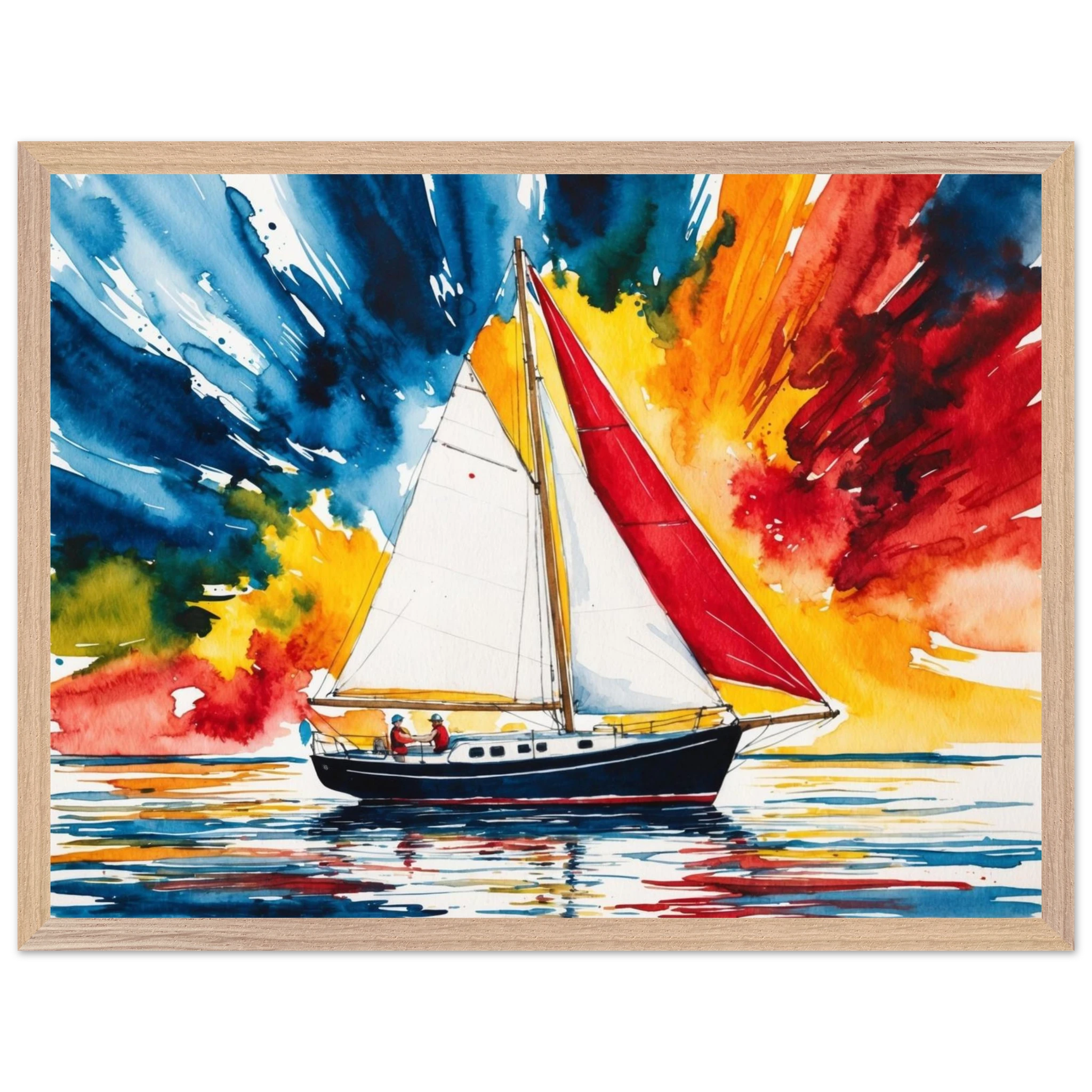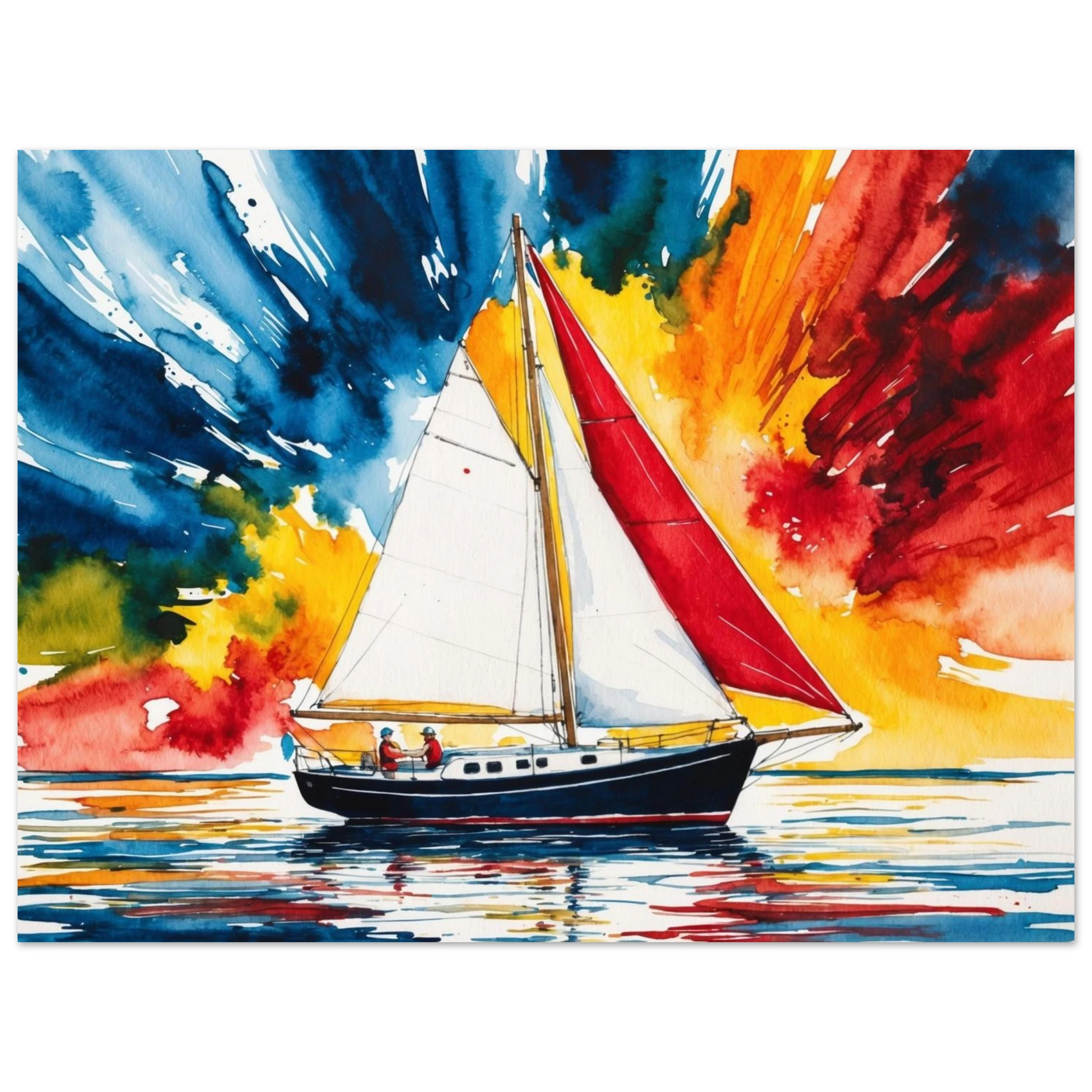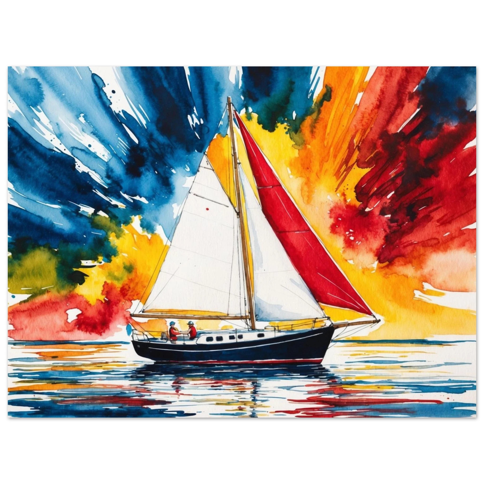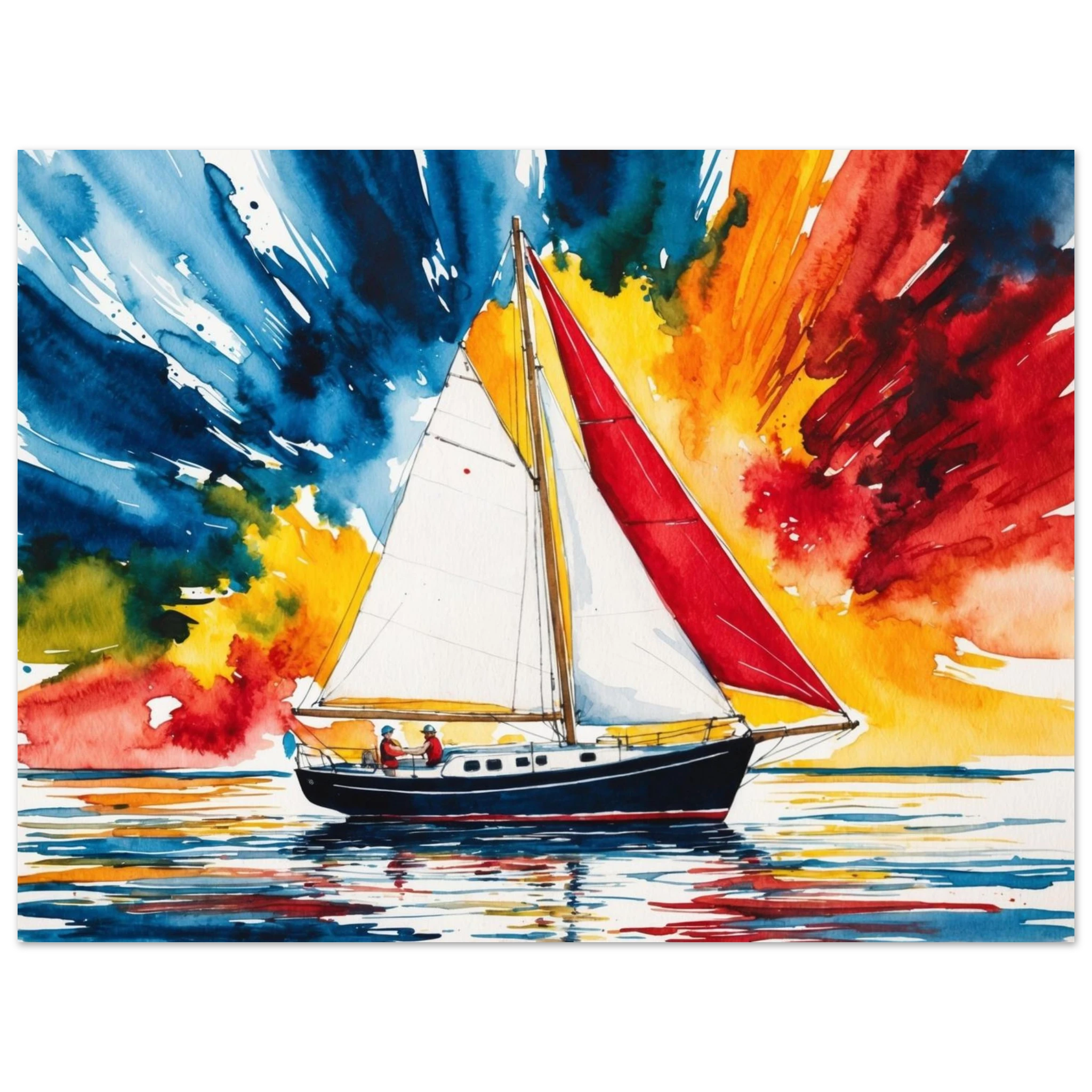 The focal point, a solitary boat, stands out with its striking red sail billowing gently and a dark blue hull. The art’s background is an absolute spectacle – an explosion of colours where dynamic shades of blue, orange, yellow, and red blend seamlessly, creating a truly dramatic and energetic sky.