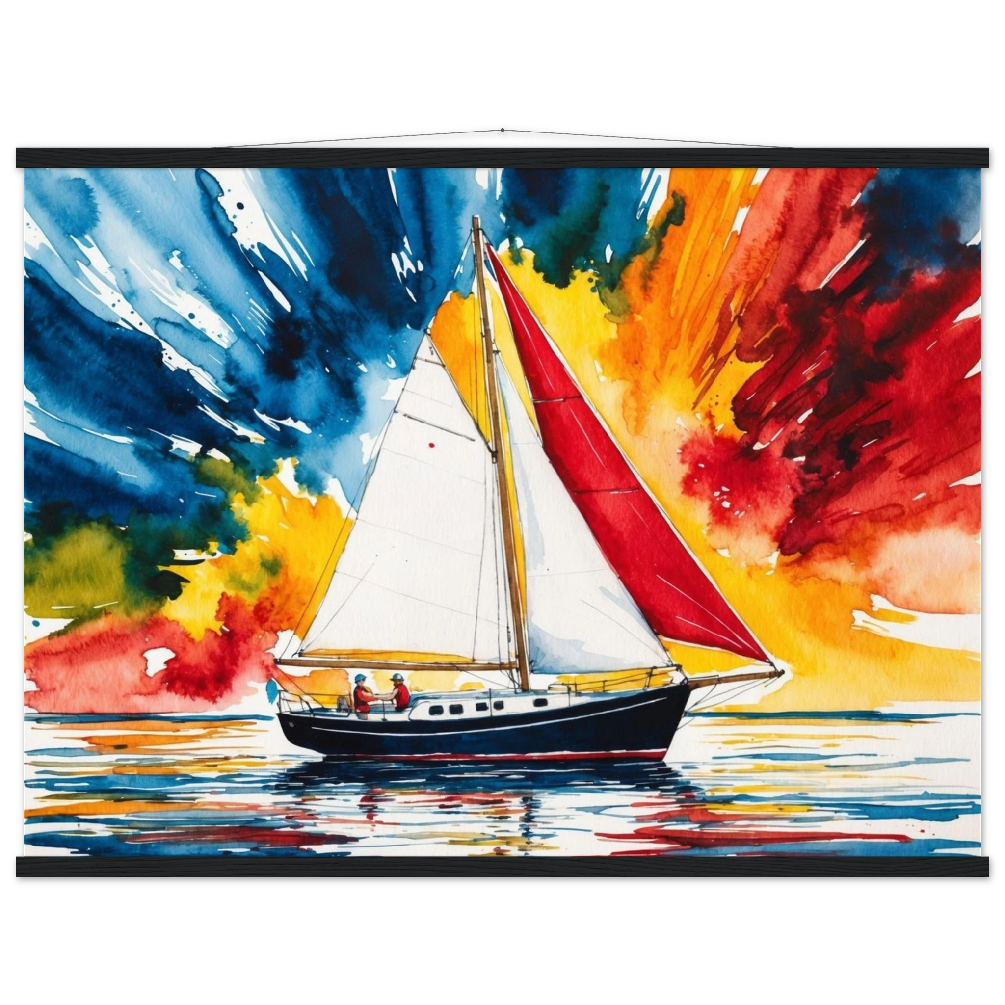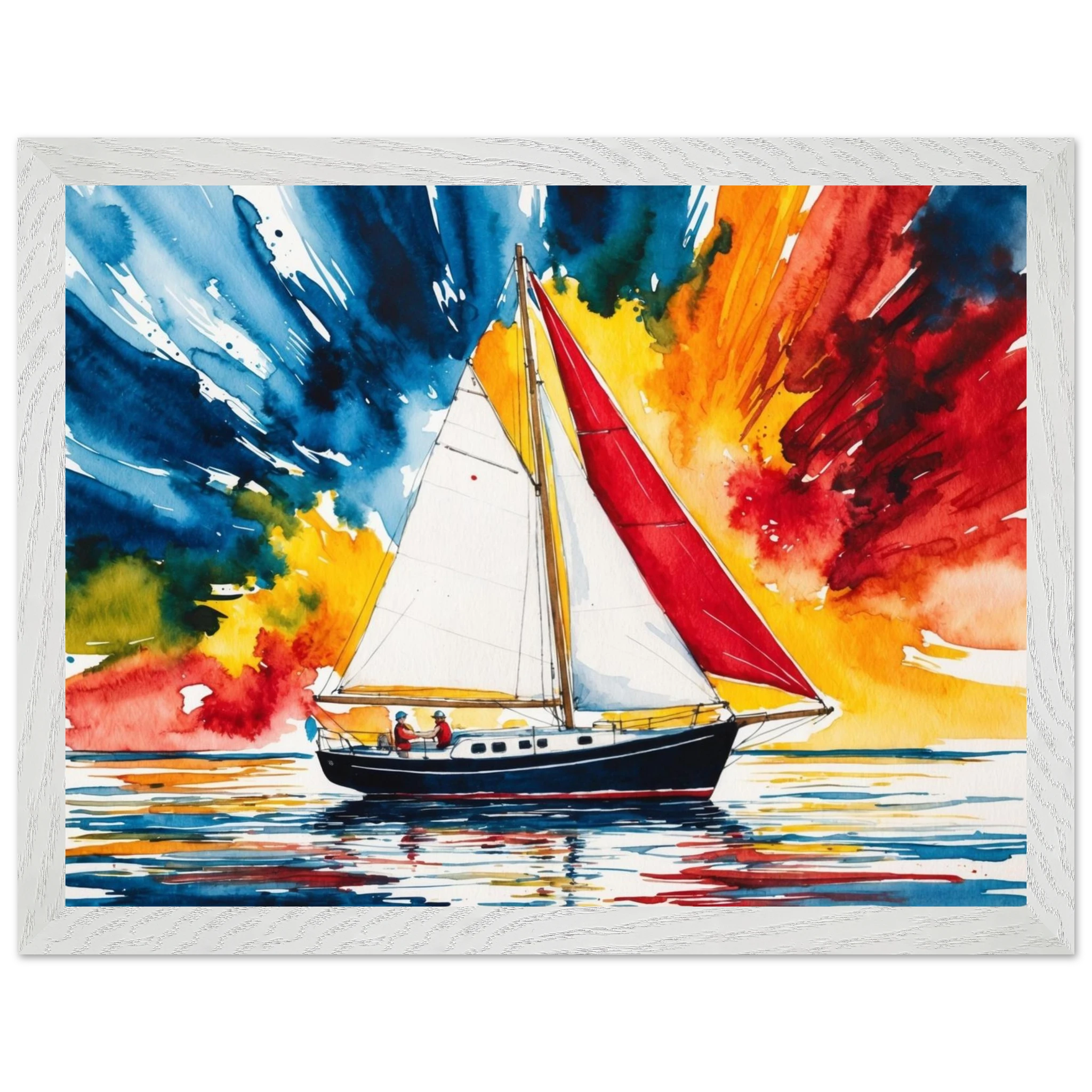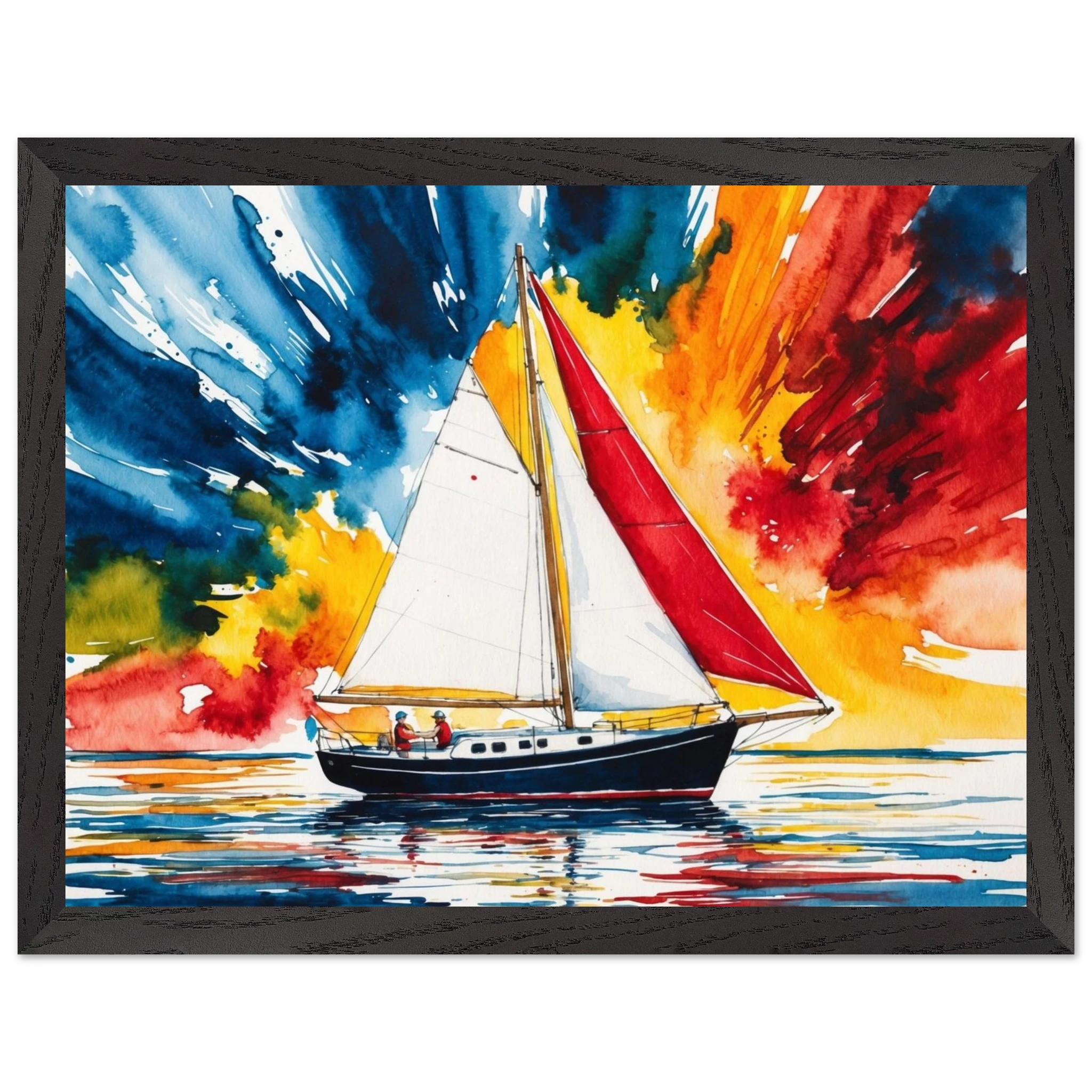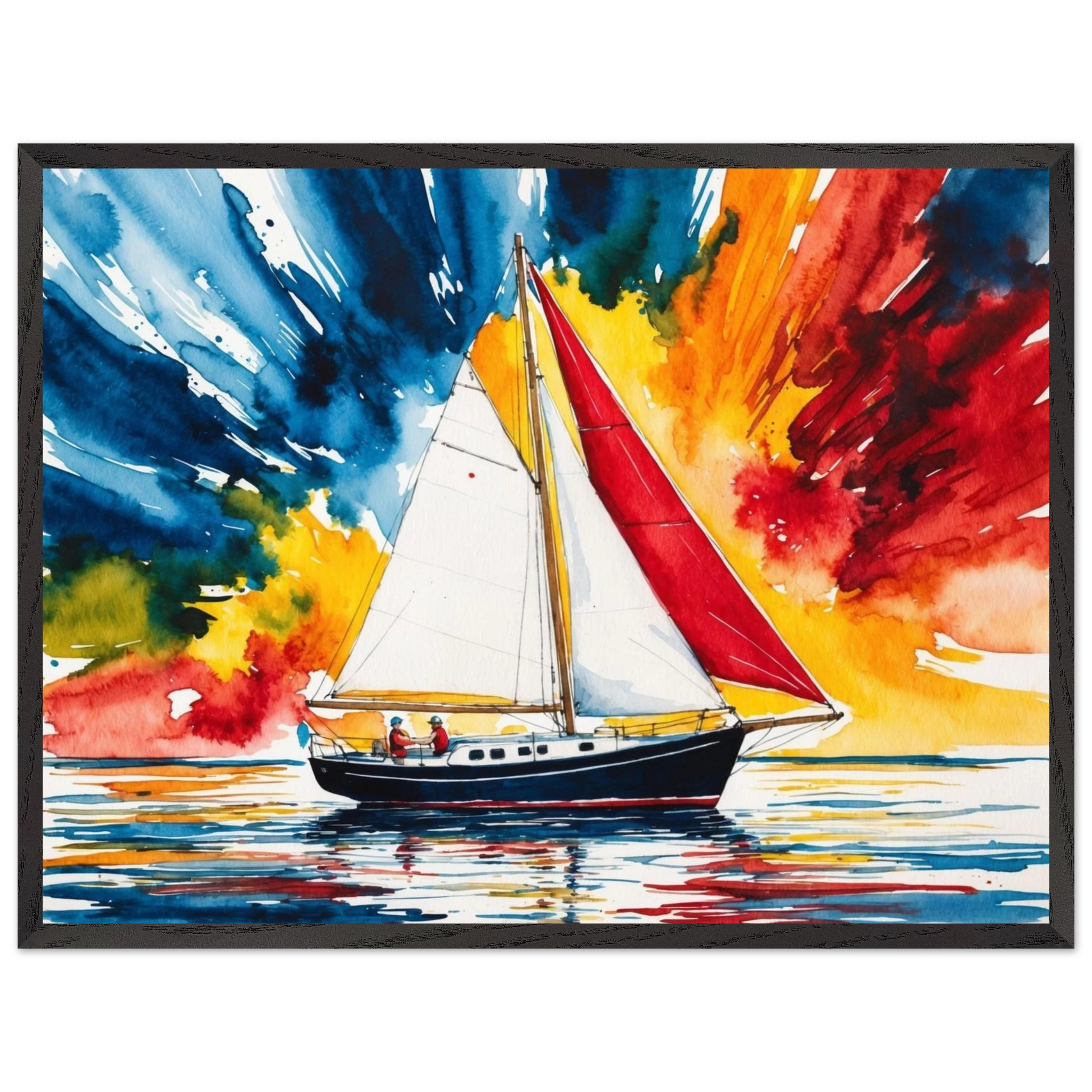The focal point, a solitary boat, stands out with its striking red sail billowing gently and a dark blue hull. The art’s background is an absolute spectacle – an explosion of colours where dynamic shades of blue, orange, yellow, and red blend seamlessly, creating a truly dramatic and energetic sky.
