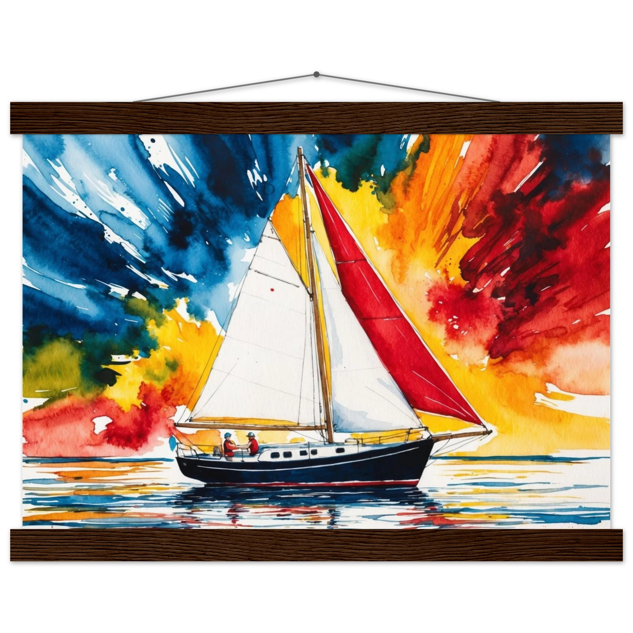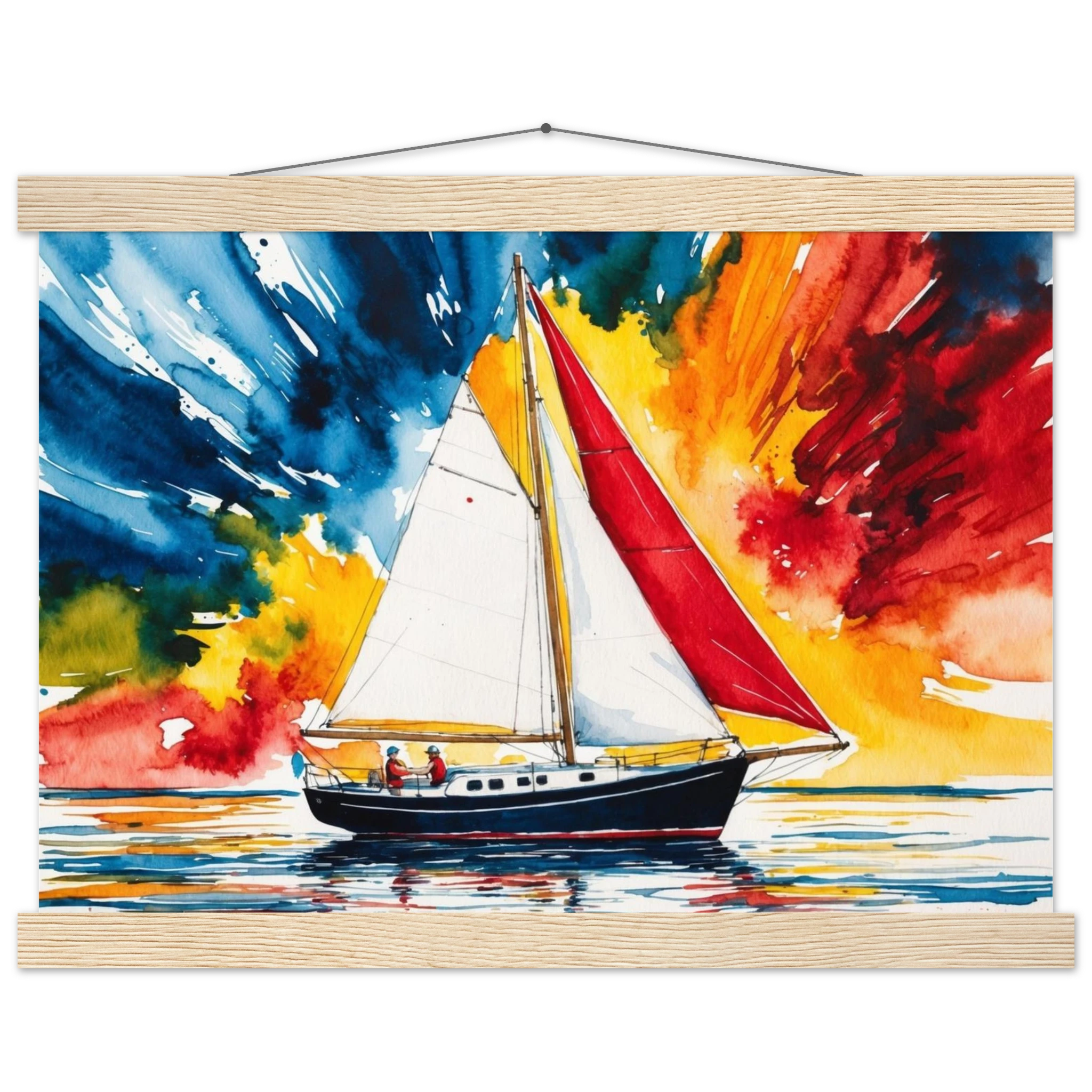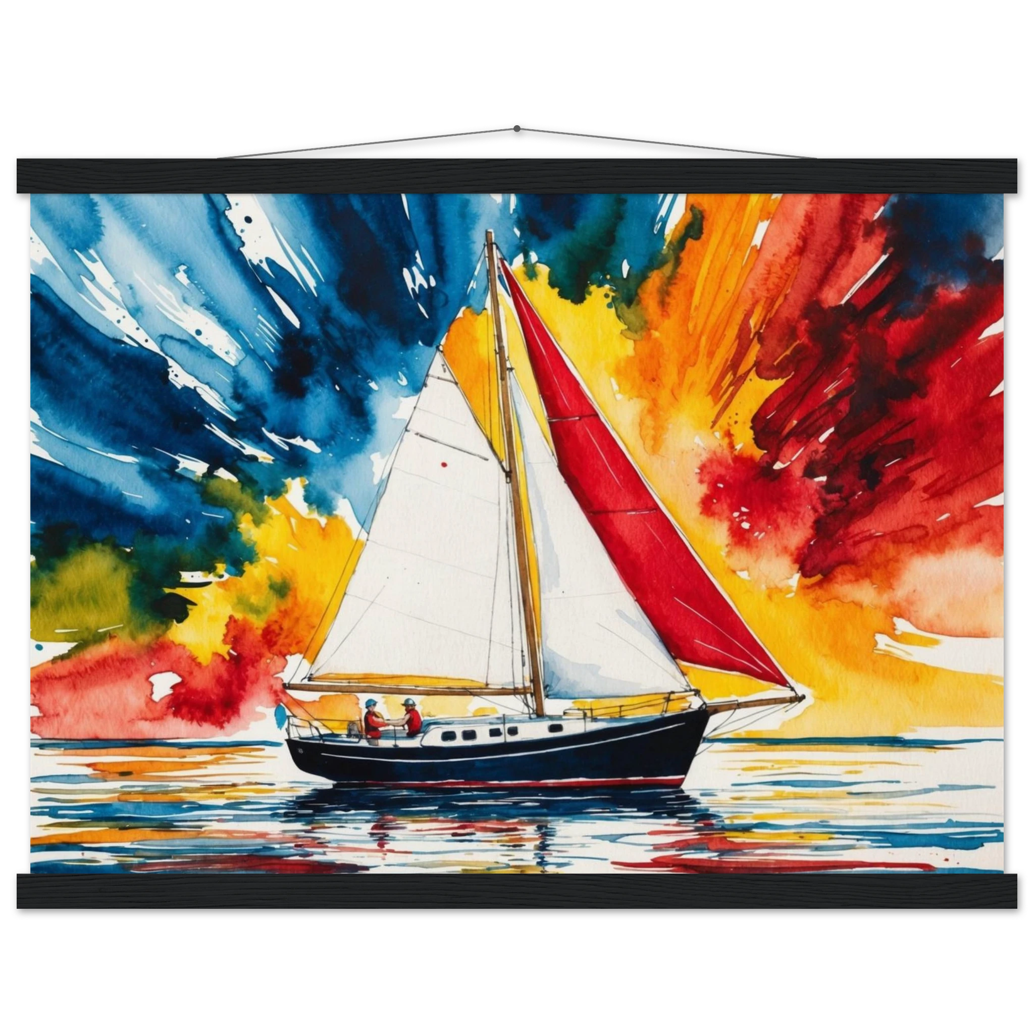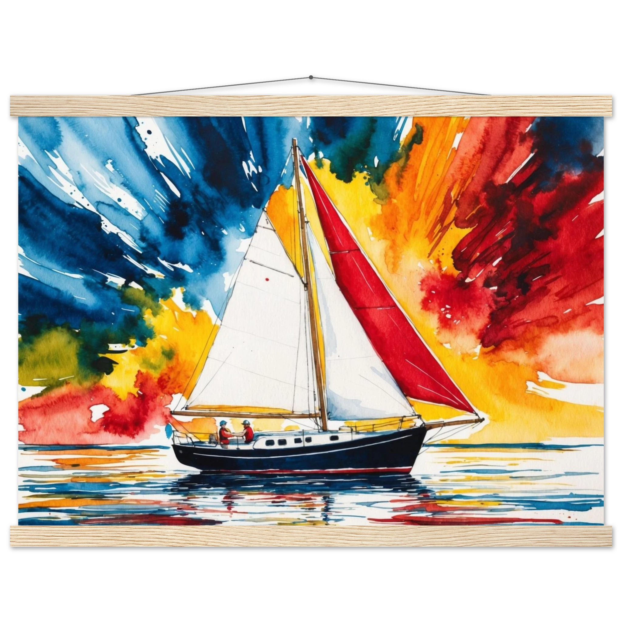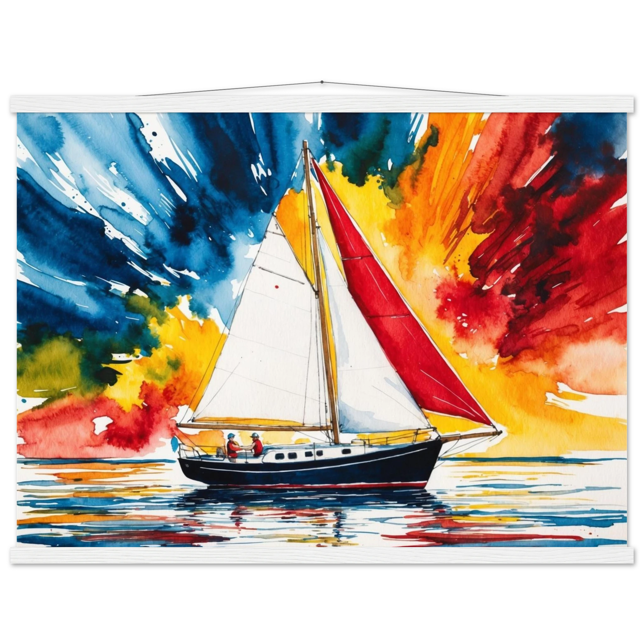 The focal point, a solitary boat, stands out with its striking red sail billowing gently and a dark blue hull. The art’s background is an absolute spectacle – an explosion of colours where dynamic shades of blue, orange, yellow, and red blend seamlessly, creating a truly dramatic and energetic sky.