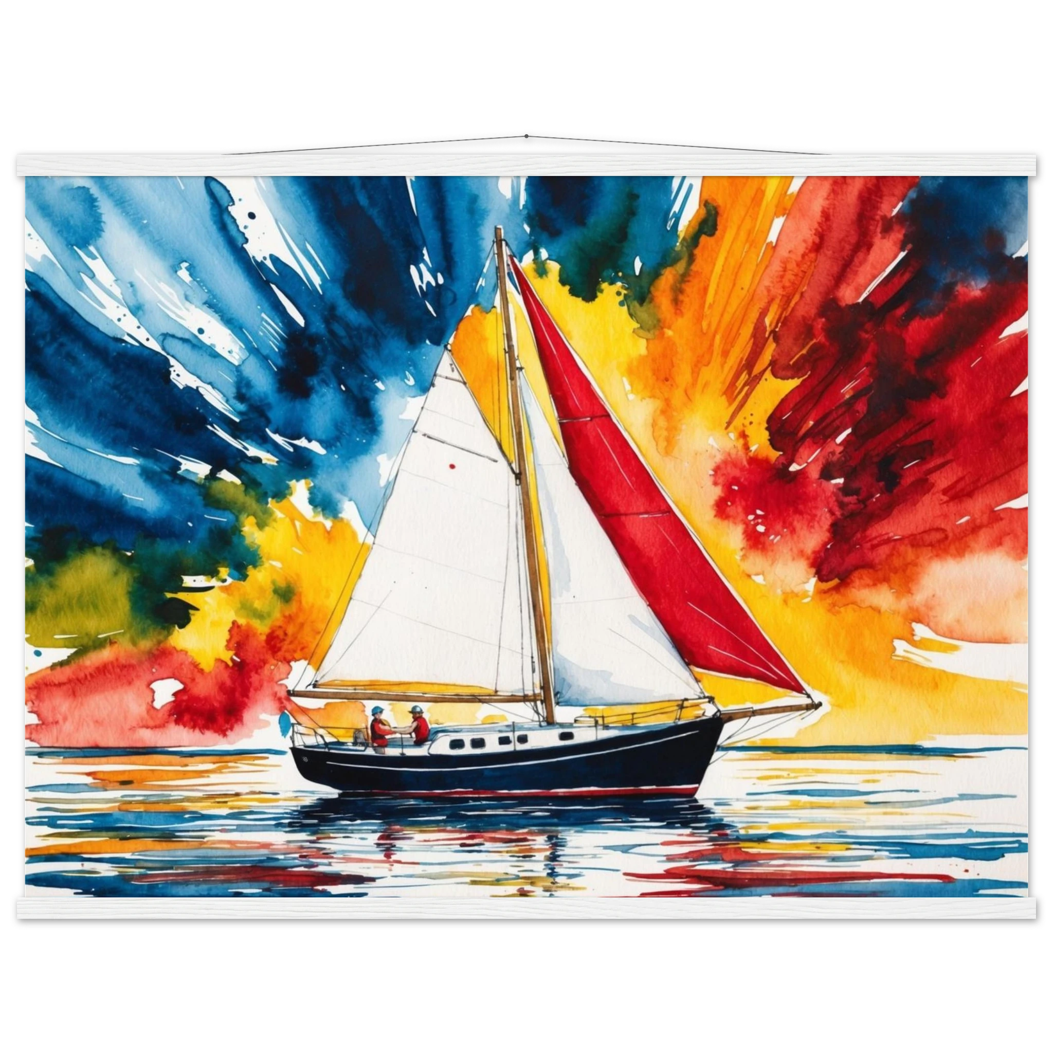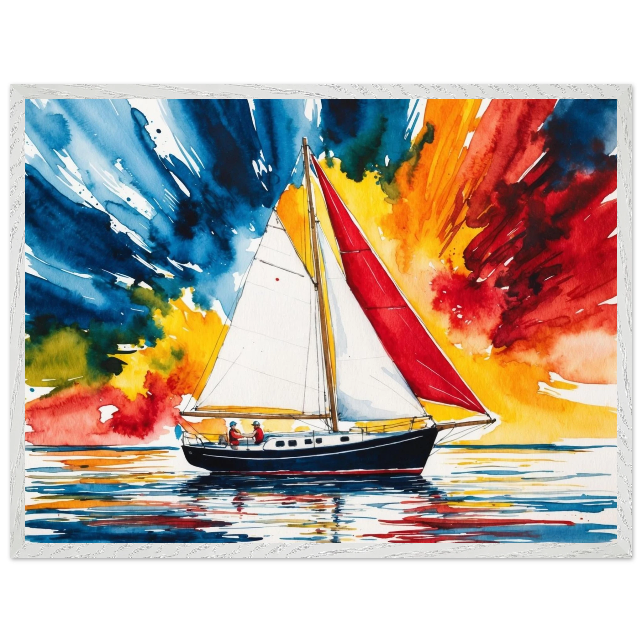 Embark on an artistic journey with this breathtaking, vibrant print. This piece masterfully captures a single sailboat gracefully navigating calm, reflective waters, inviting a sense of peace and adventure into any space.