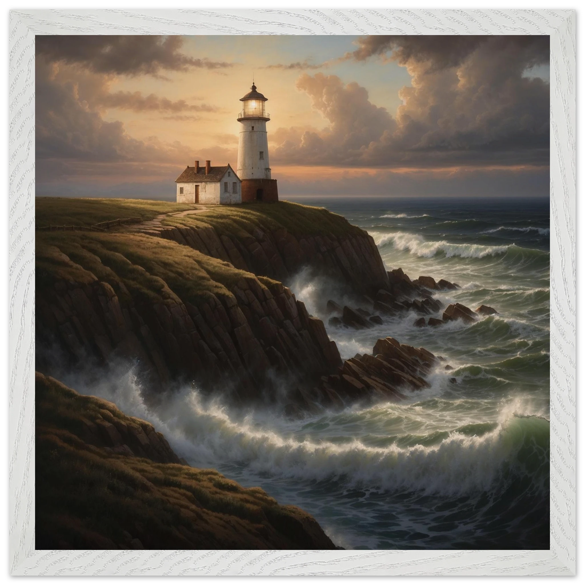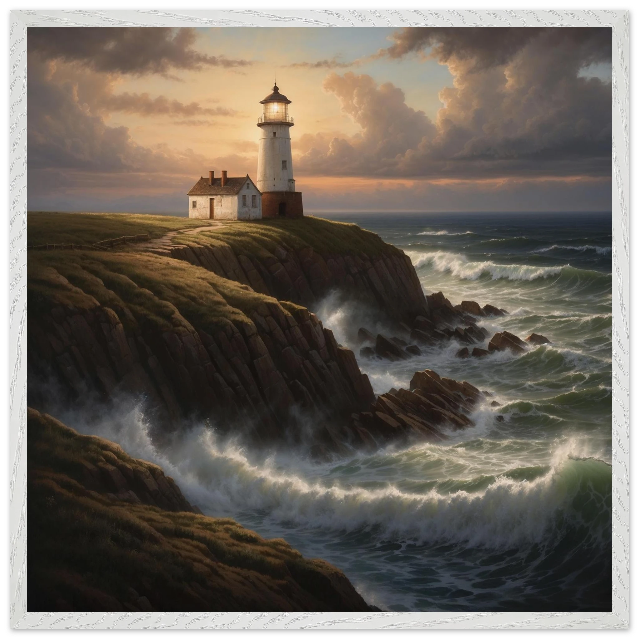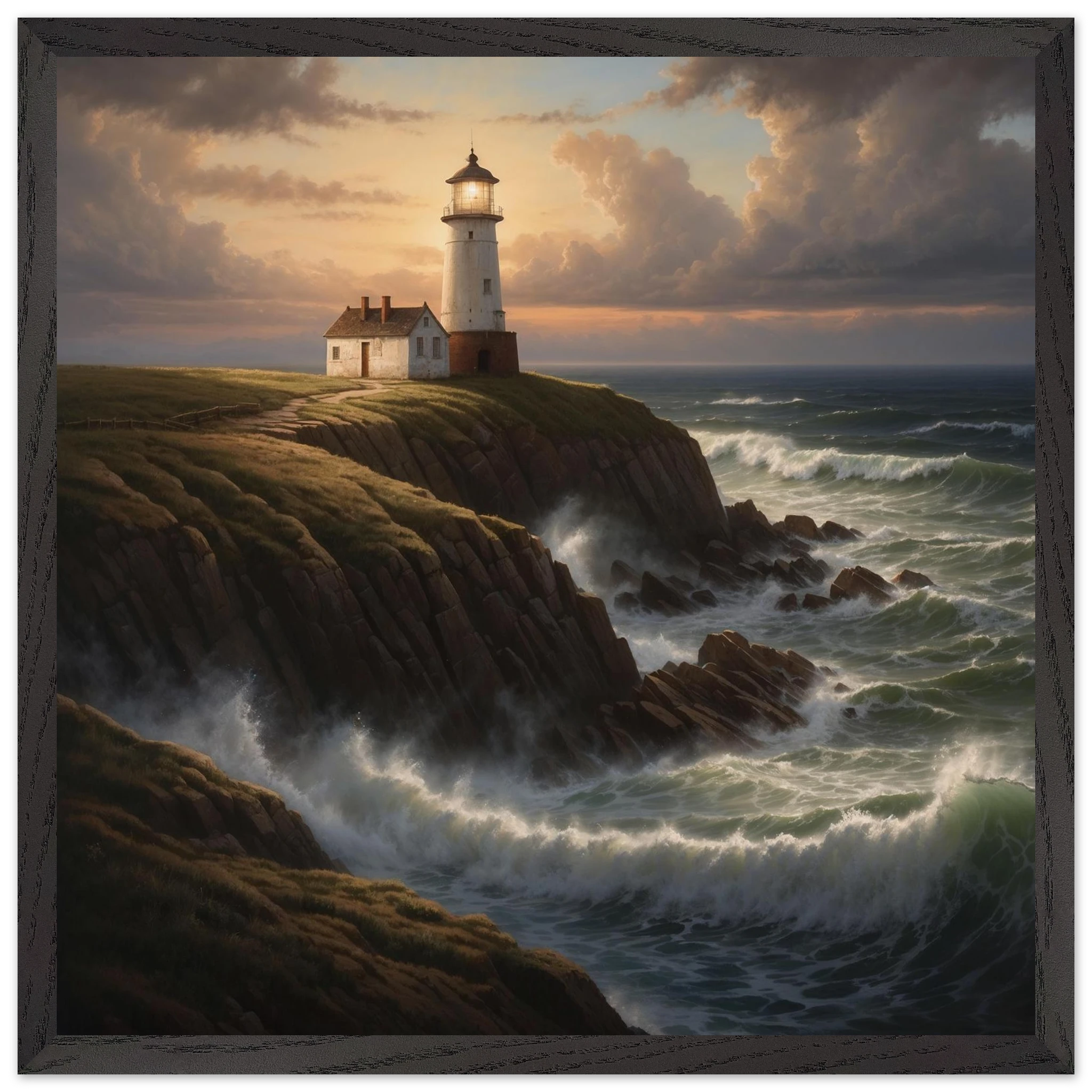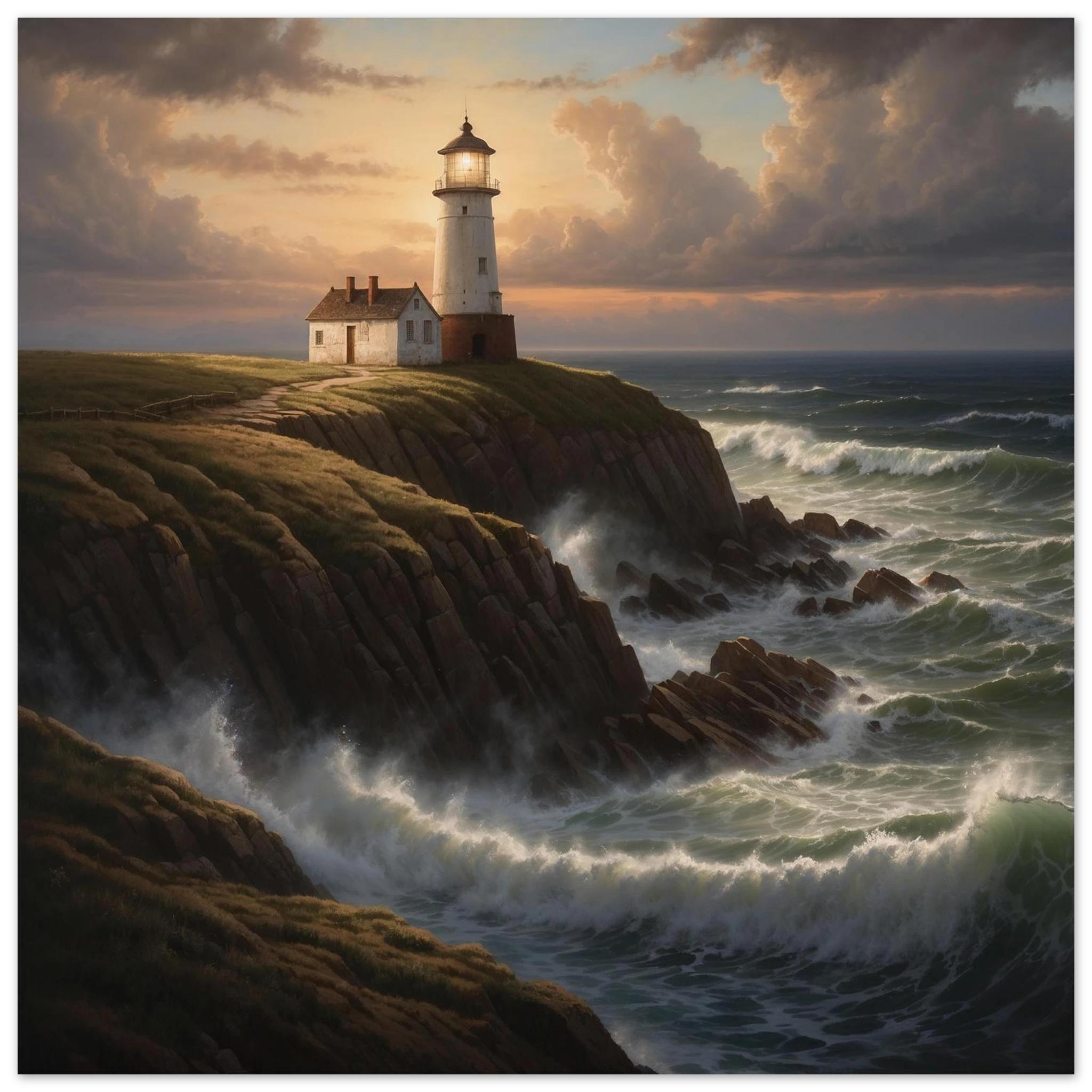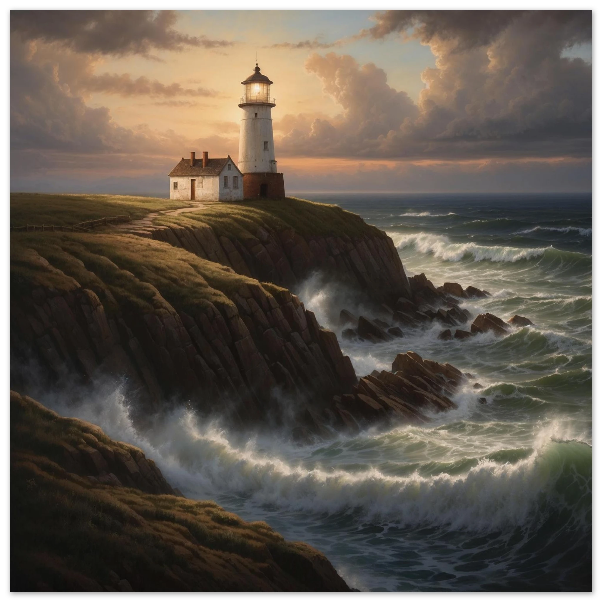This hyperrealistic print captures a weathered lighthouse on a rugged cliff, standing tall against a dramatic, stormy sea at sunset. Rich textures and striking lighting create an awe-inspiring scene. Perfect for adding a powerful, maritime feel to your home.