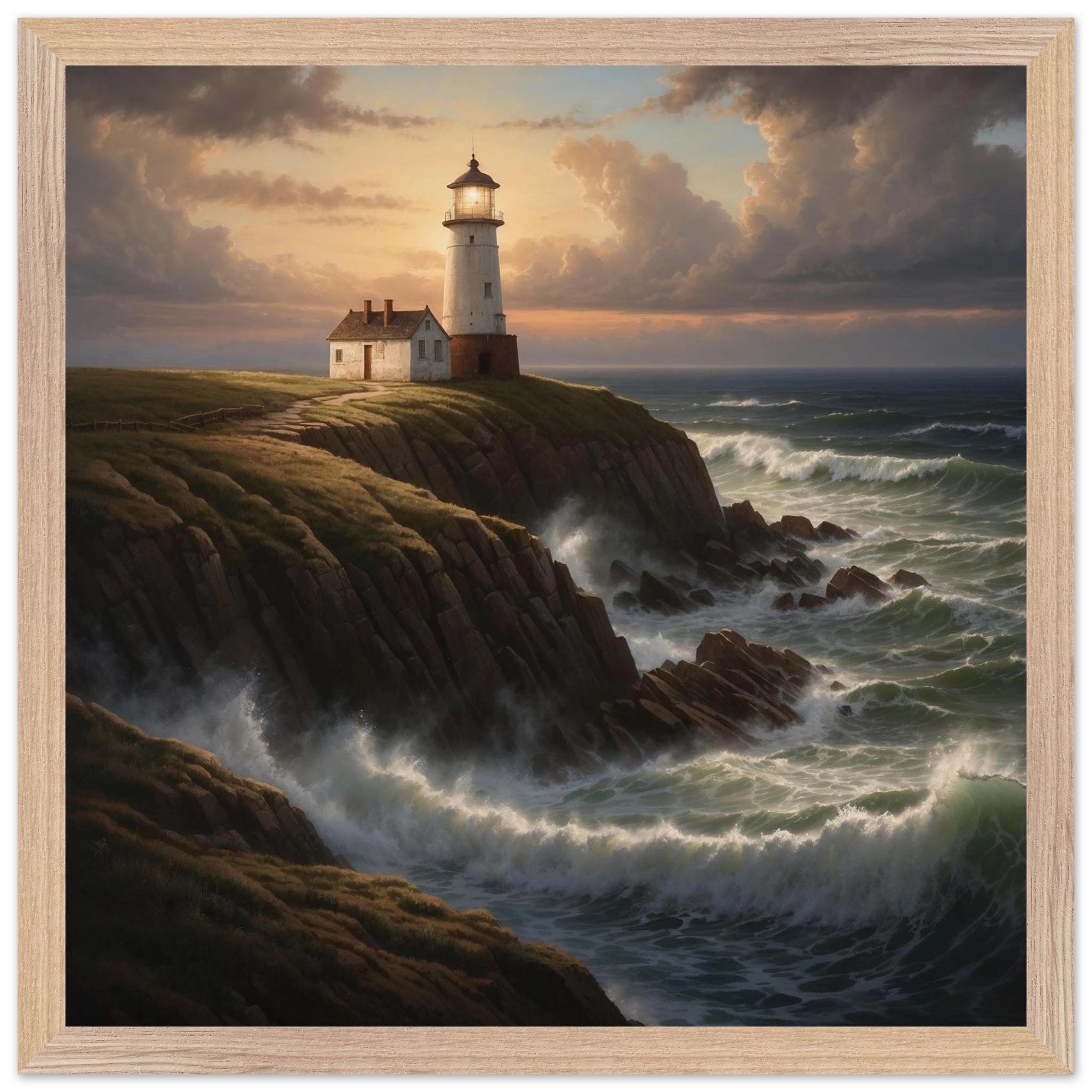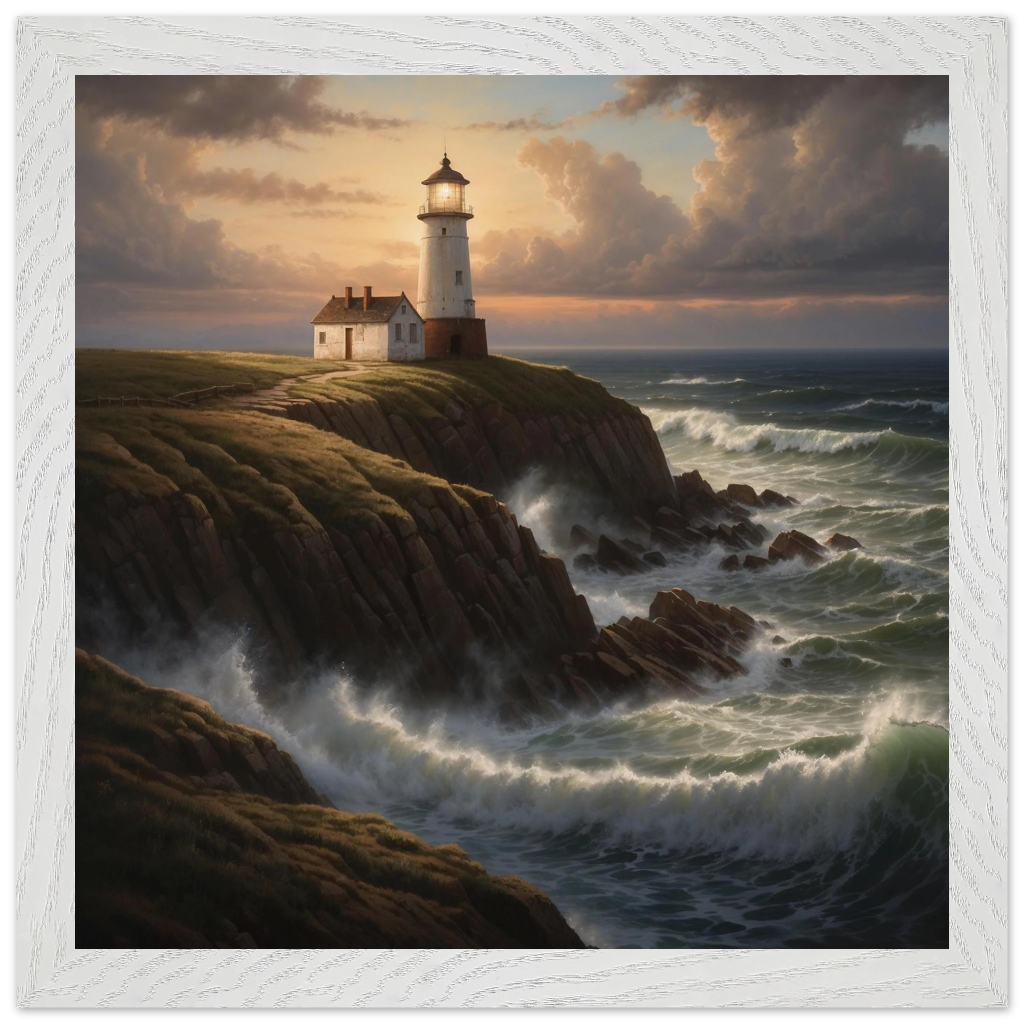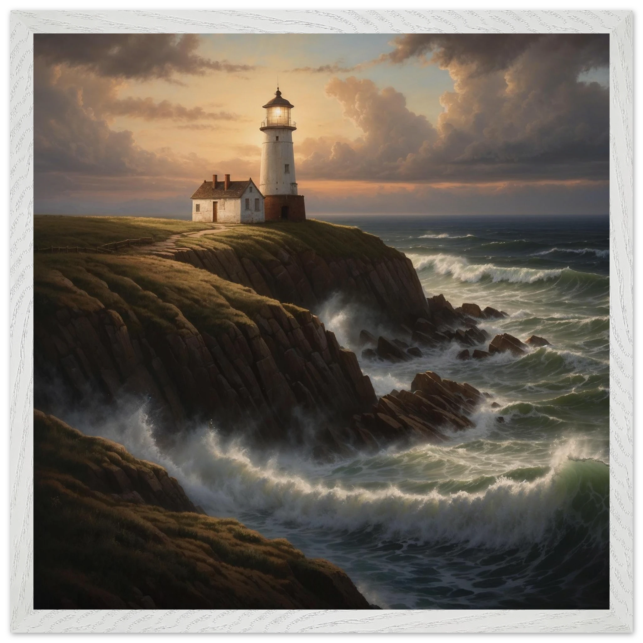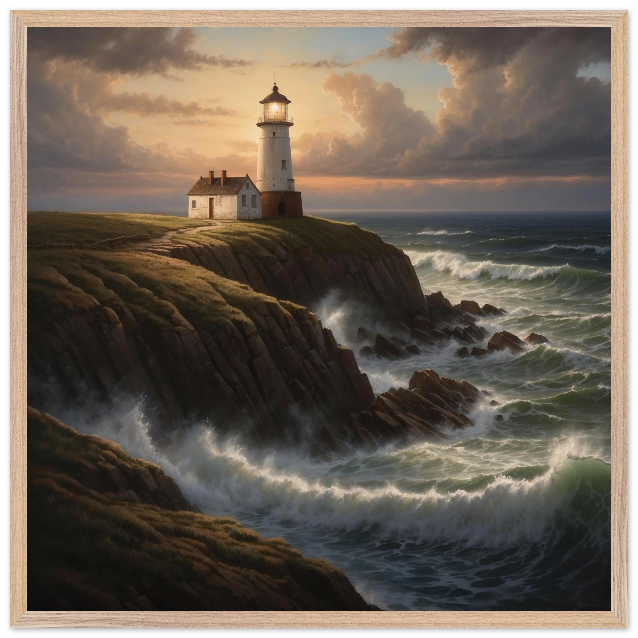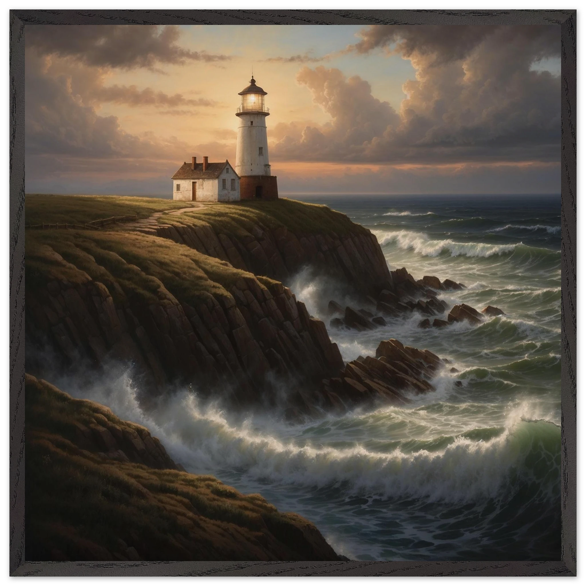 This hyperrealistic print captures a weathered lighthouse on a rugged cliff, standing tall against a dramatic, stormy sea at sunset. Rich textures and striking lighting create an awe-inspiring scene. Perfect for adding a powerful, maritime feel to your home.