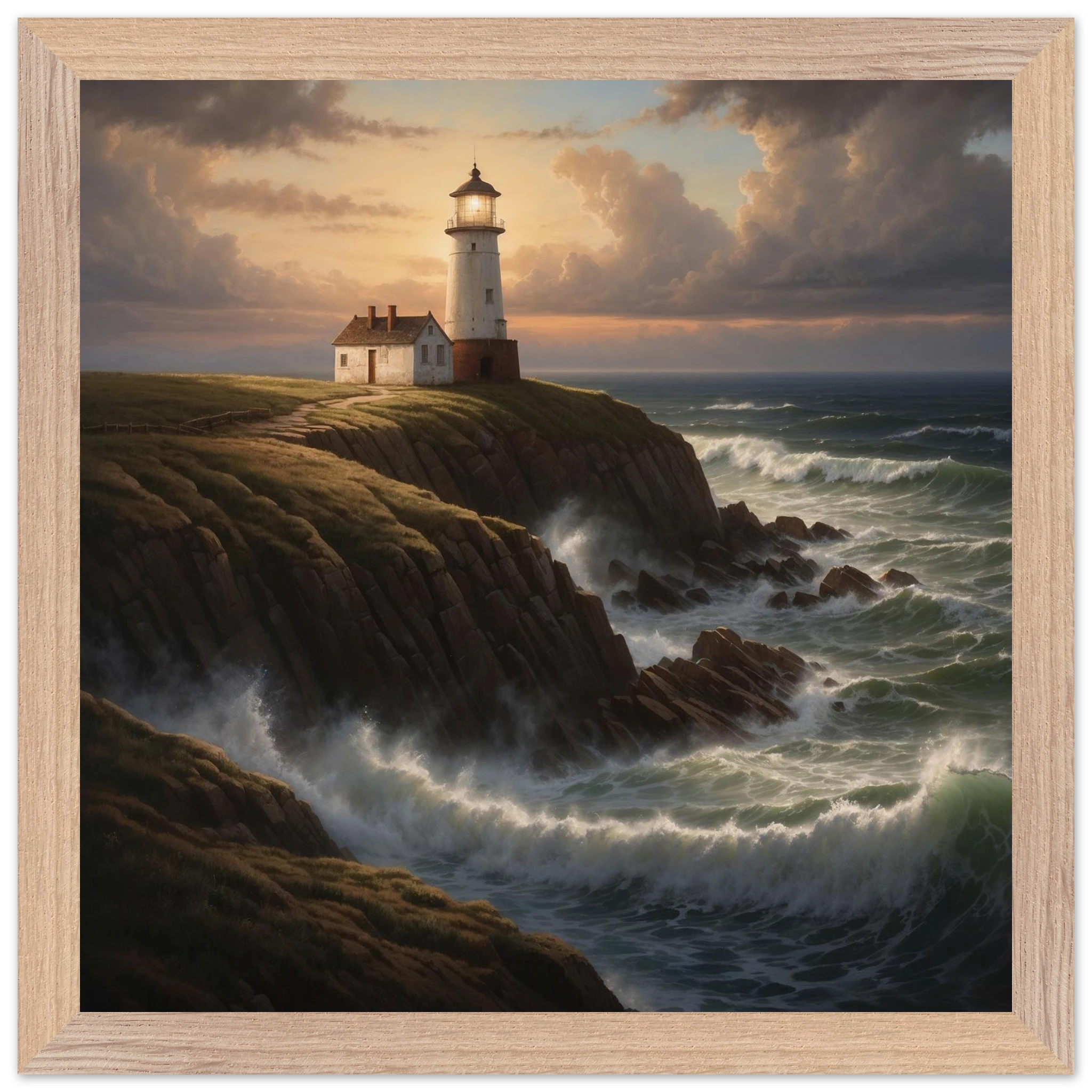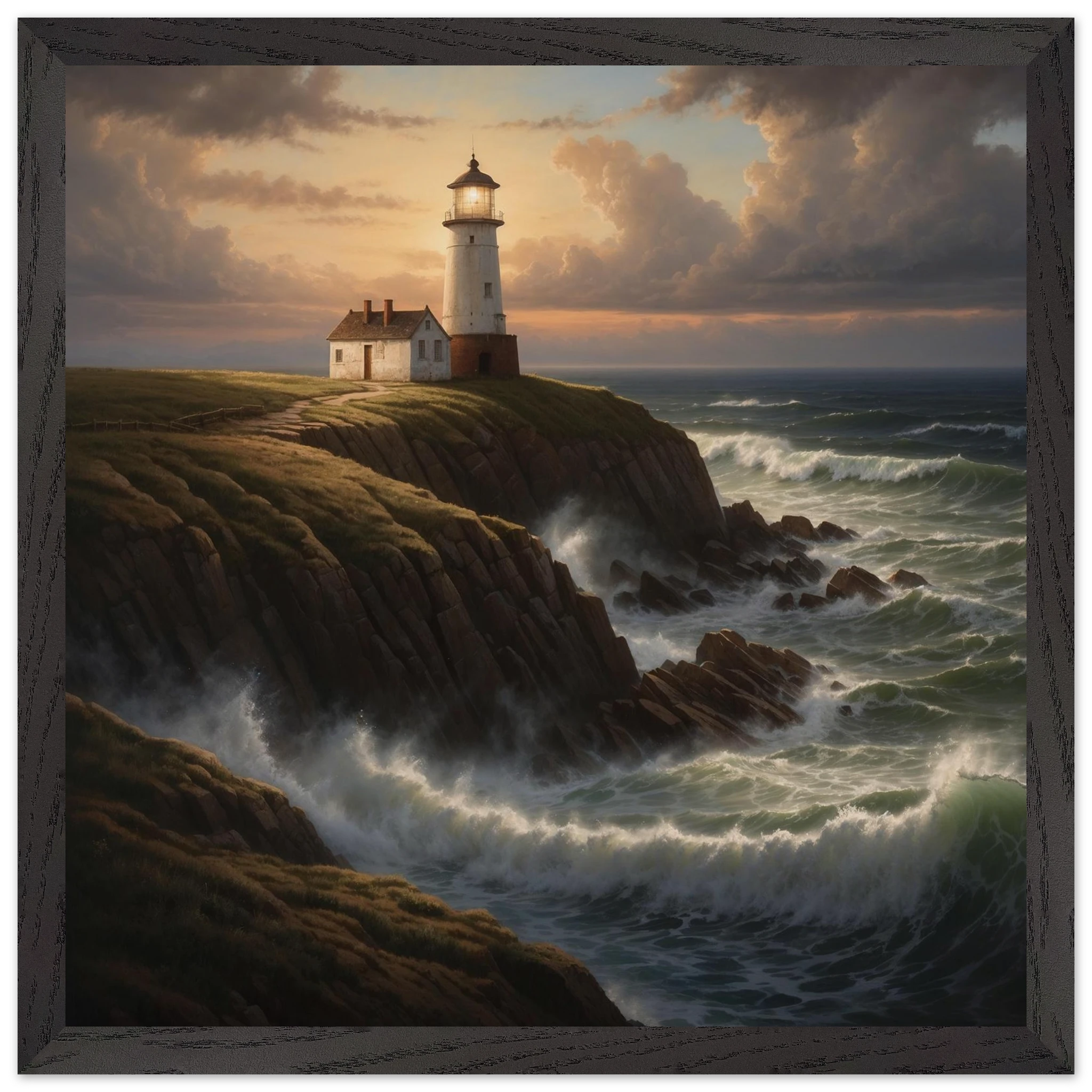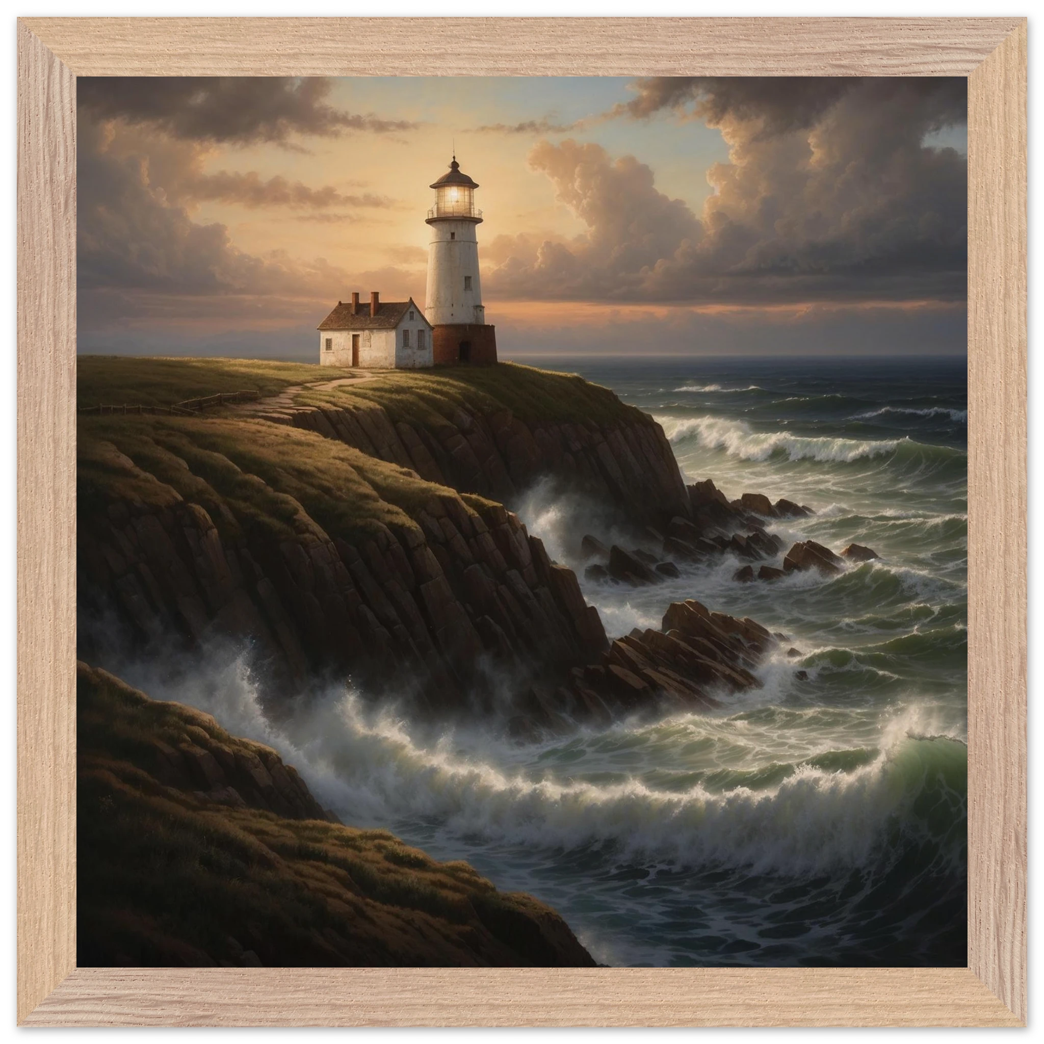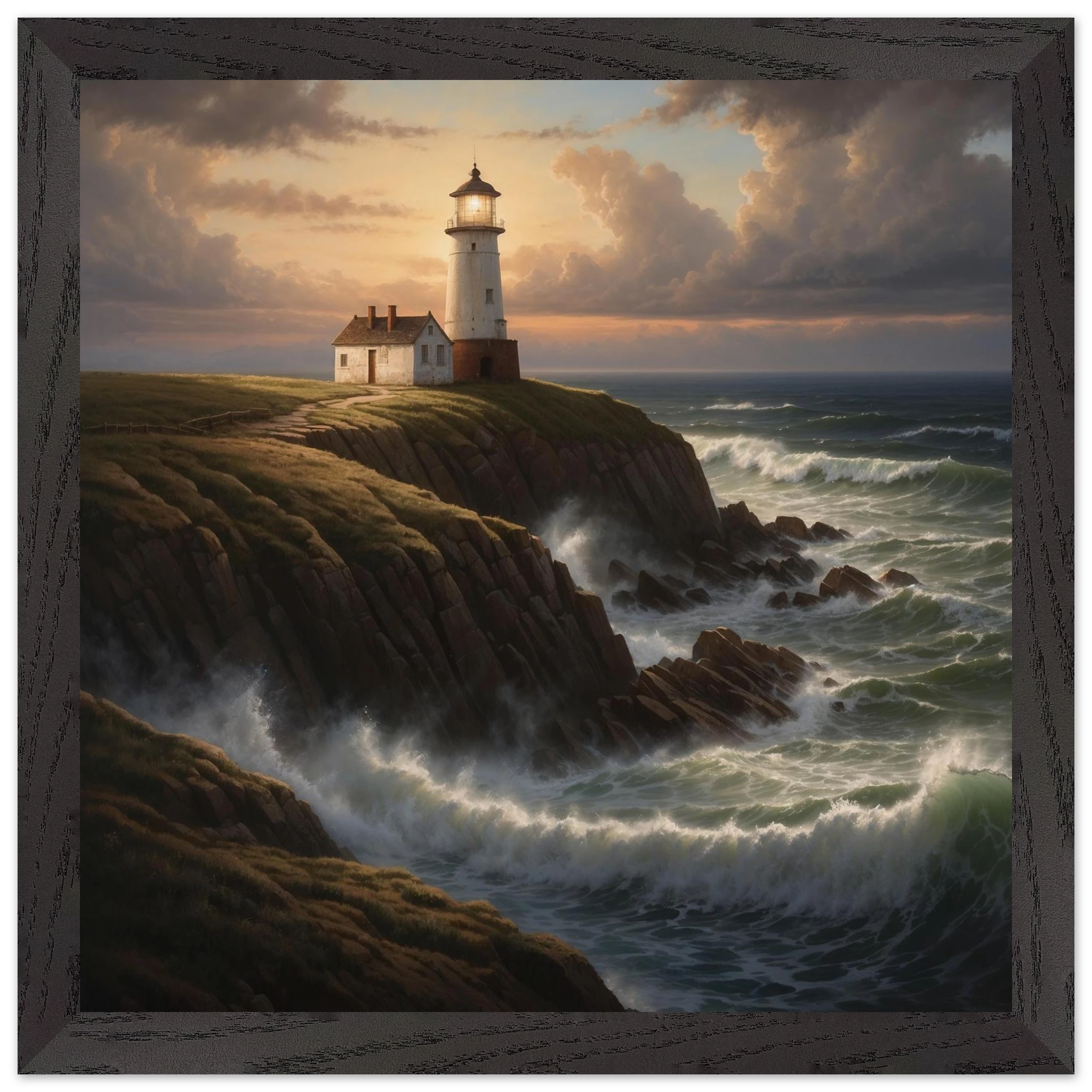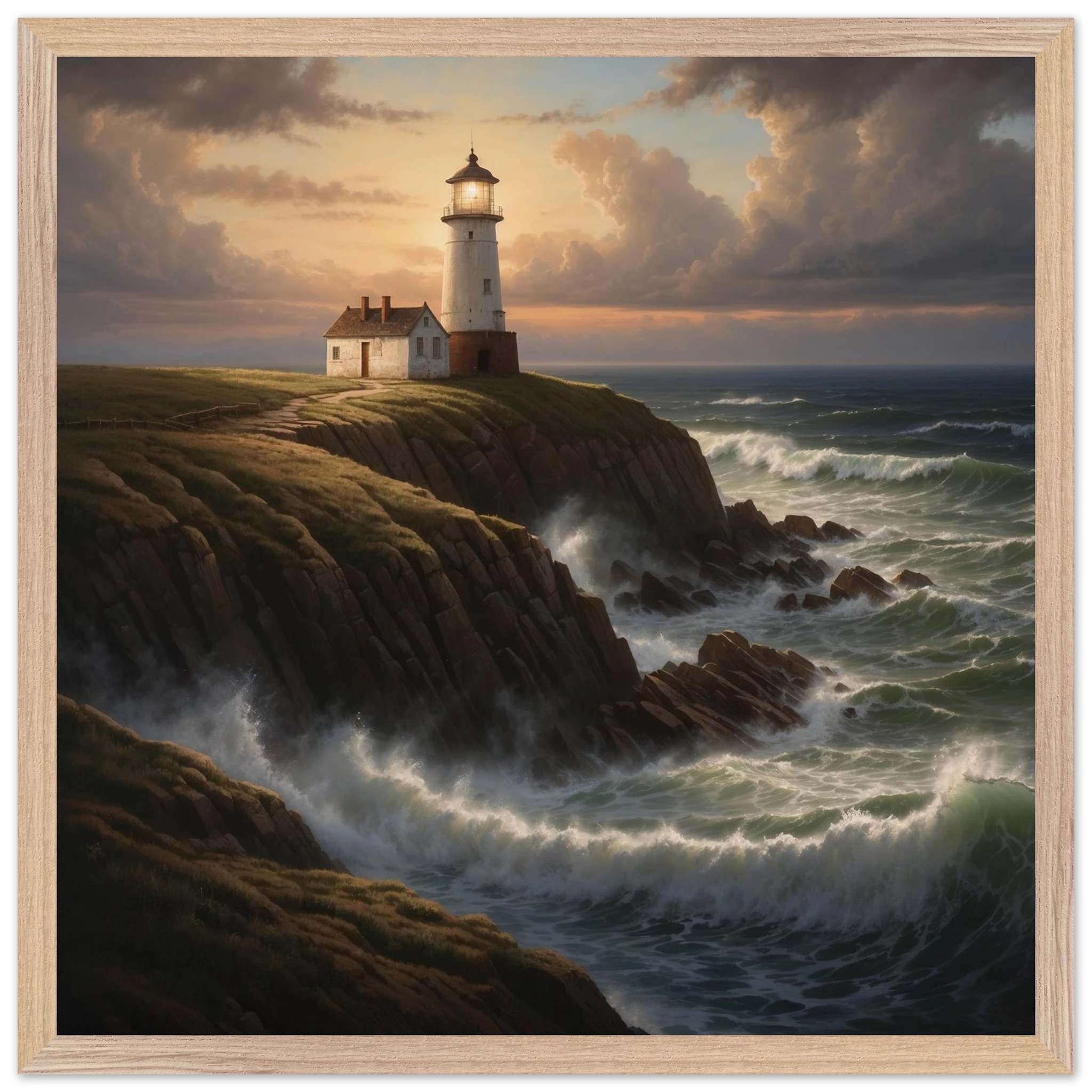 This hyperrealistic print captures a weathered lighthouse on a rugged cliff, standing tall against a dramatic, stormy sea at sunset. Rich textures and striking lighting create an awe-inspiring scene. Perfect for adding a powerful, maritime feel to your home.
