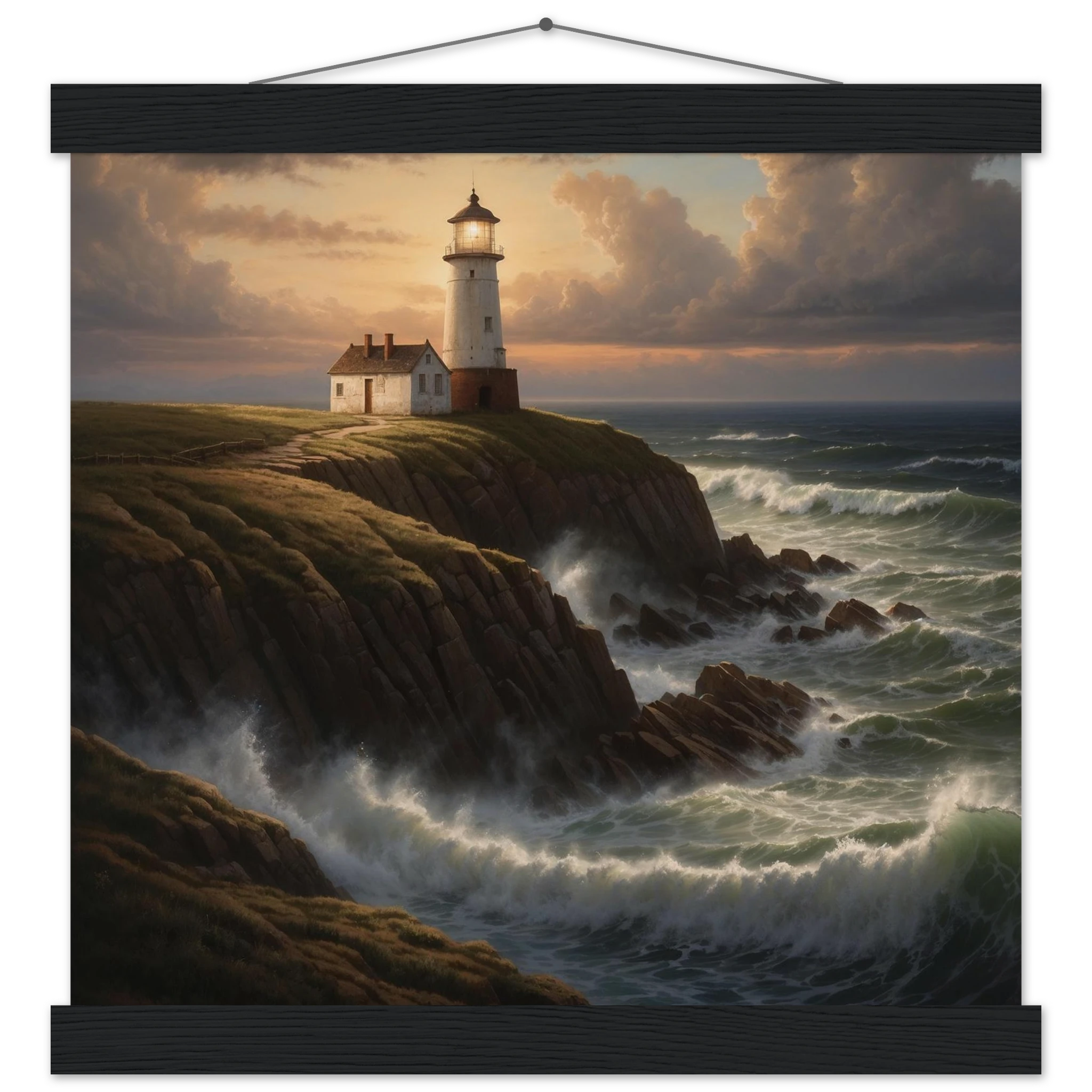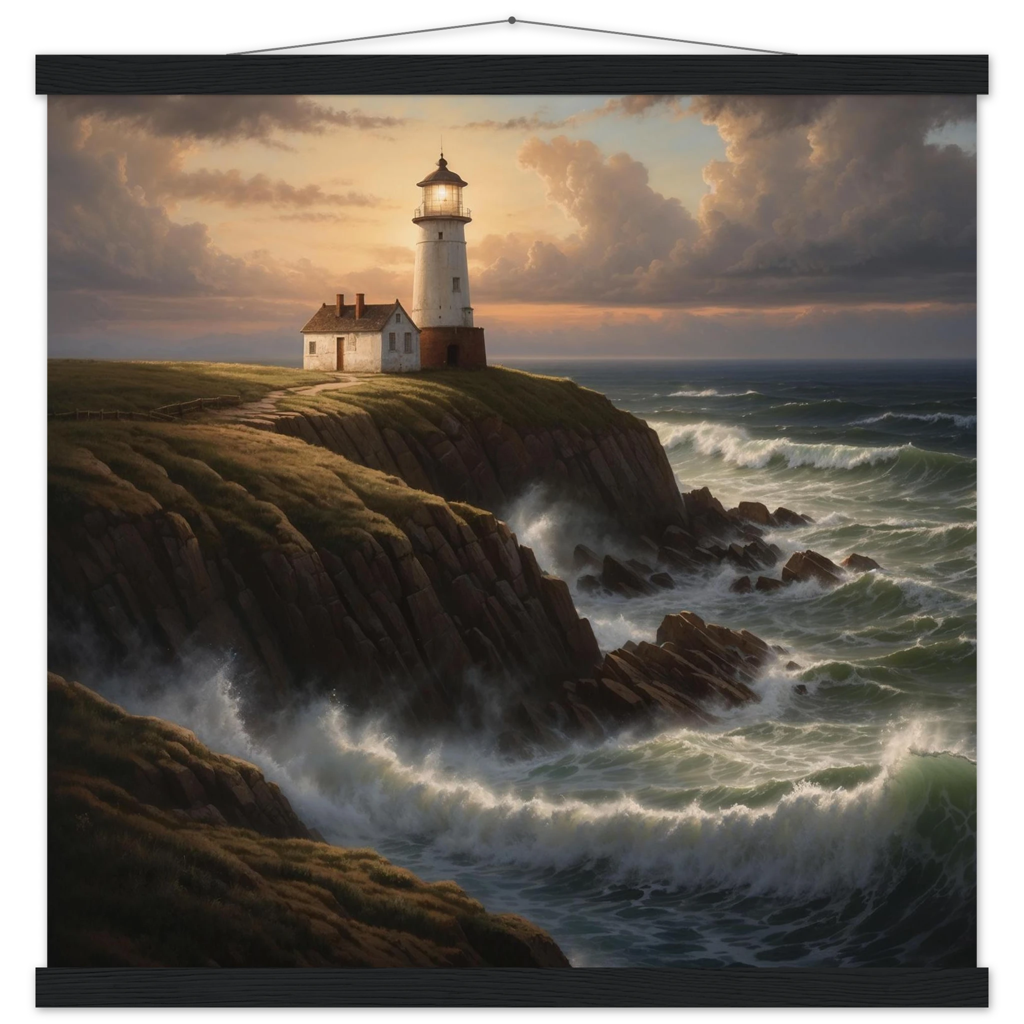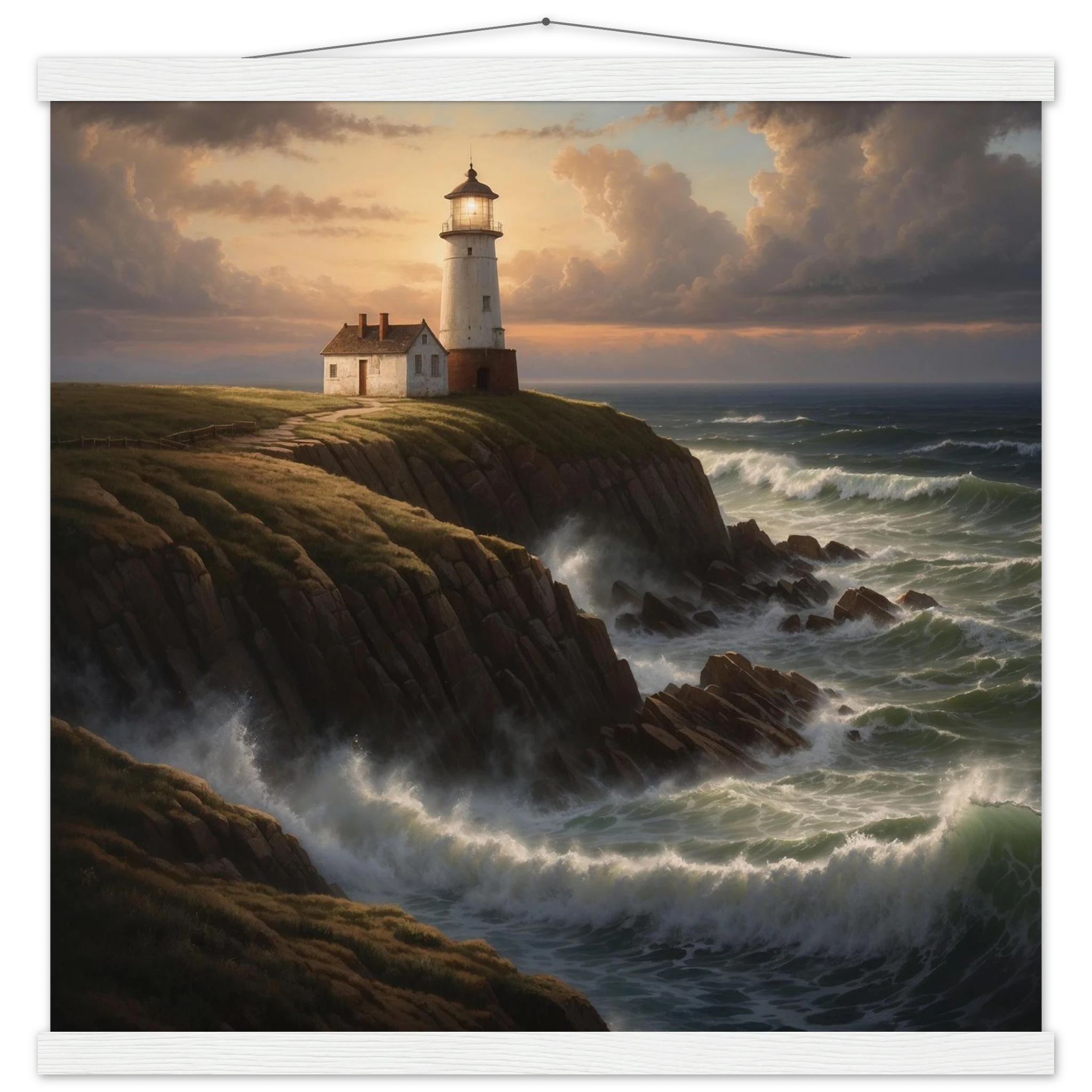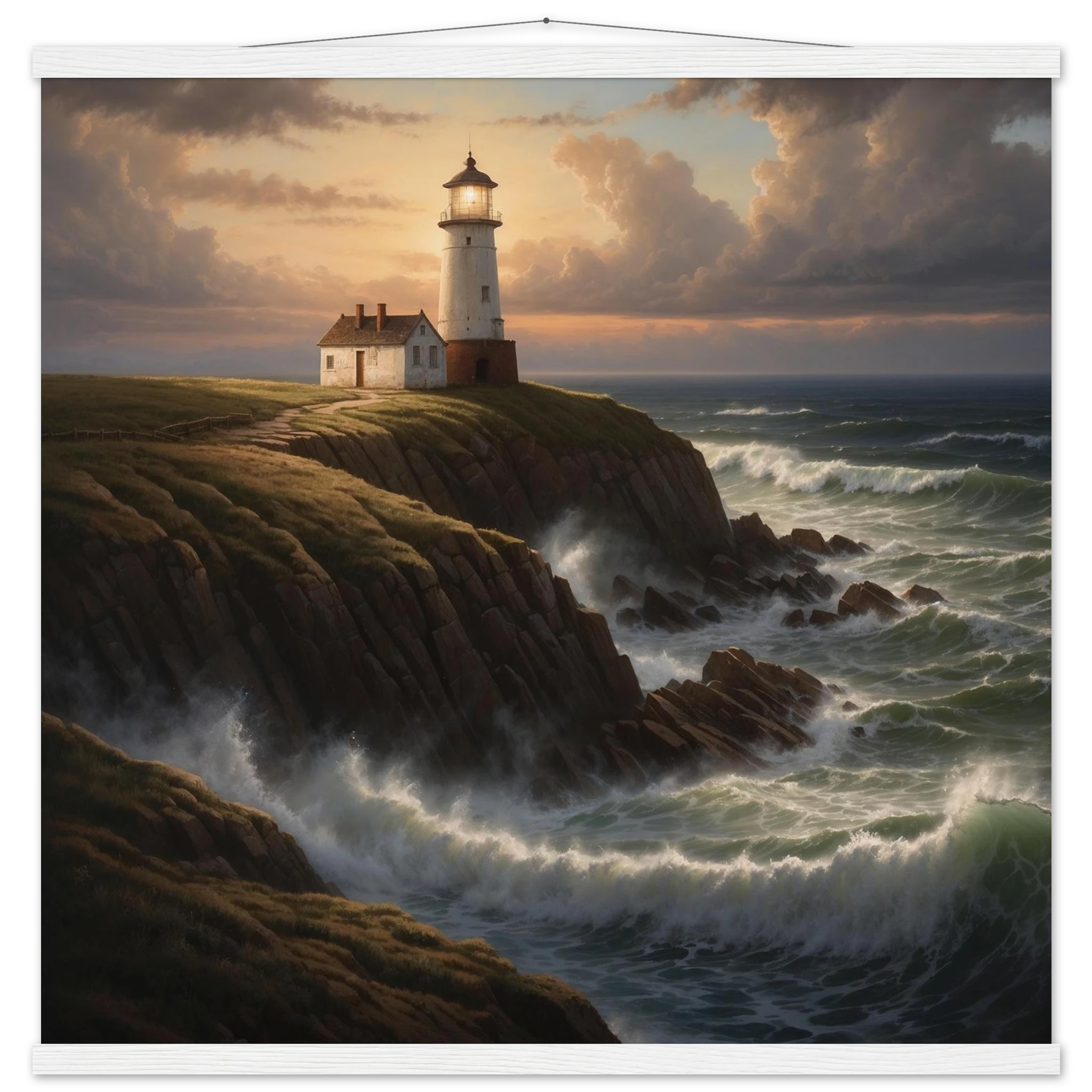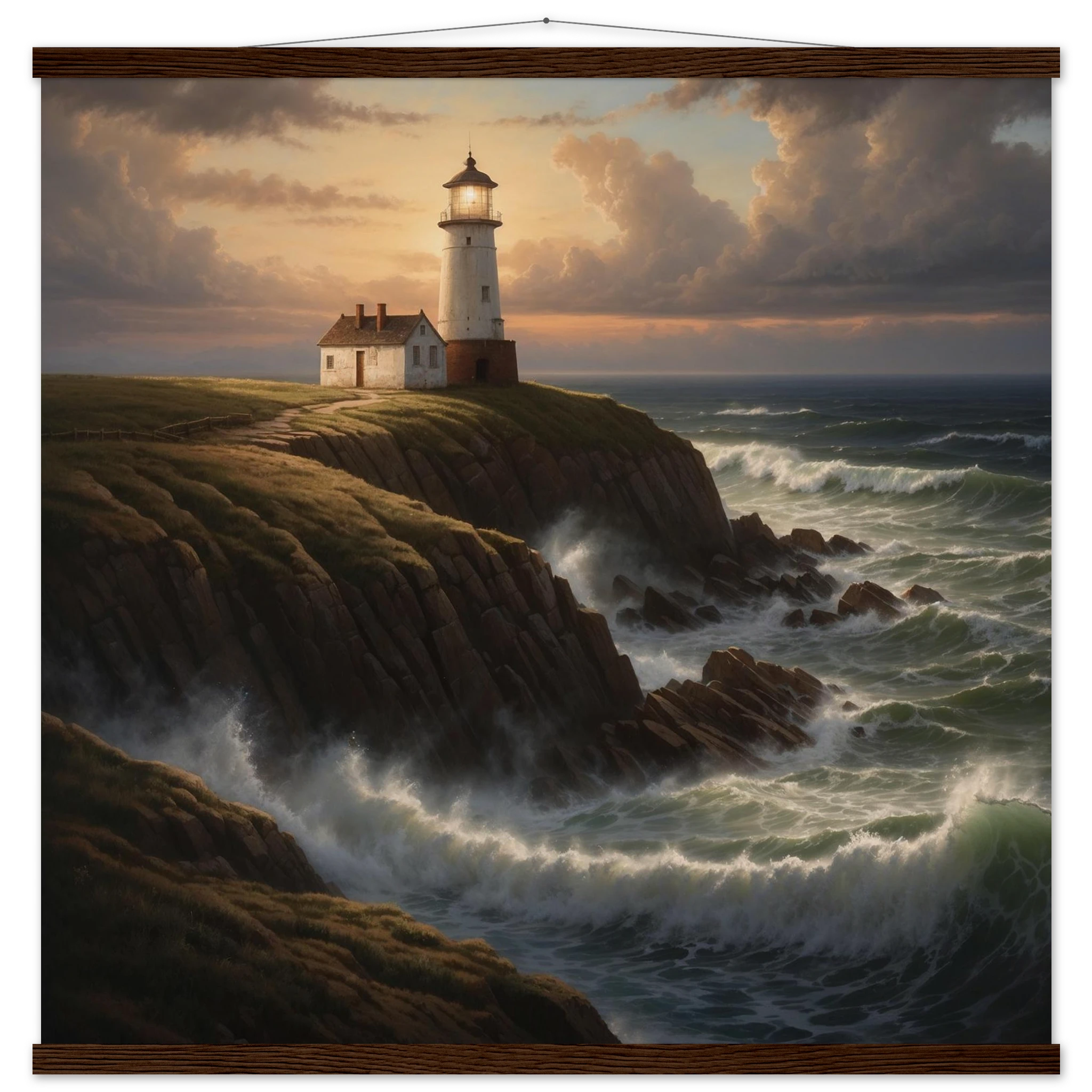 This hyperrealistic print captures a weathered lighthouse on a rugged cliff, standing tall against a dramatic, stormy sea at sunset. Rich textures and striking lighting create an awe-inspiring scene. Perfect for adding a powerful, maritime feel to your home.