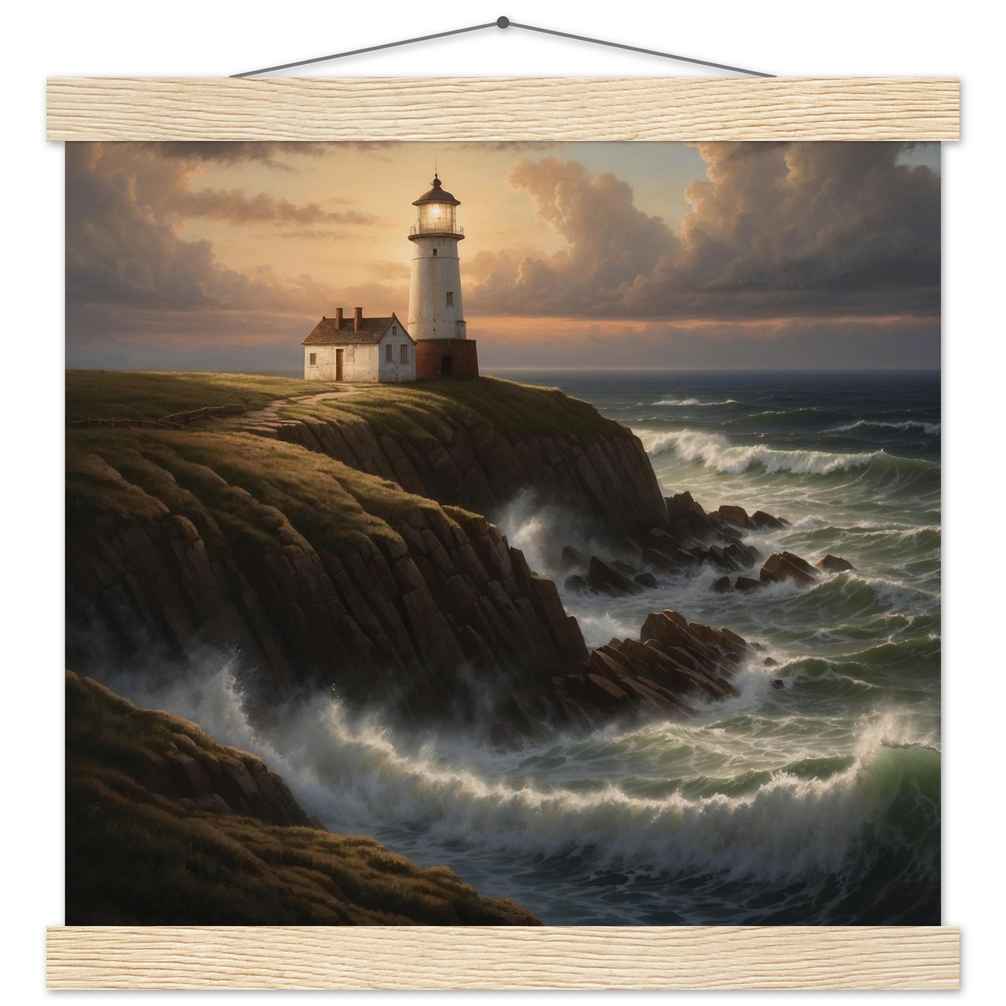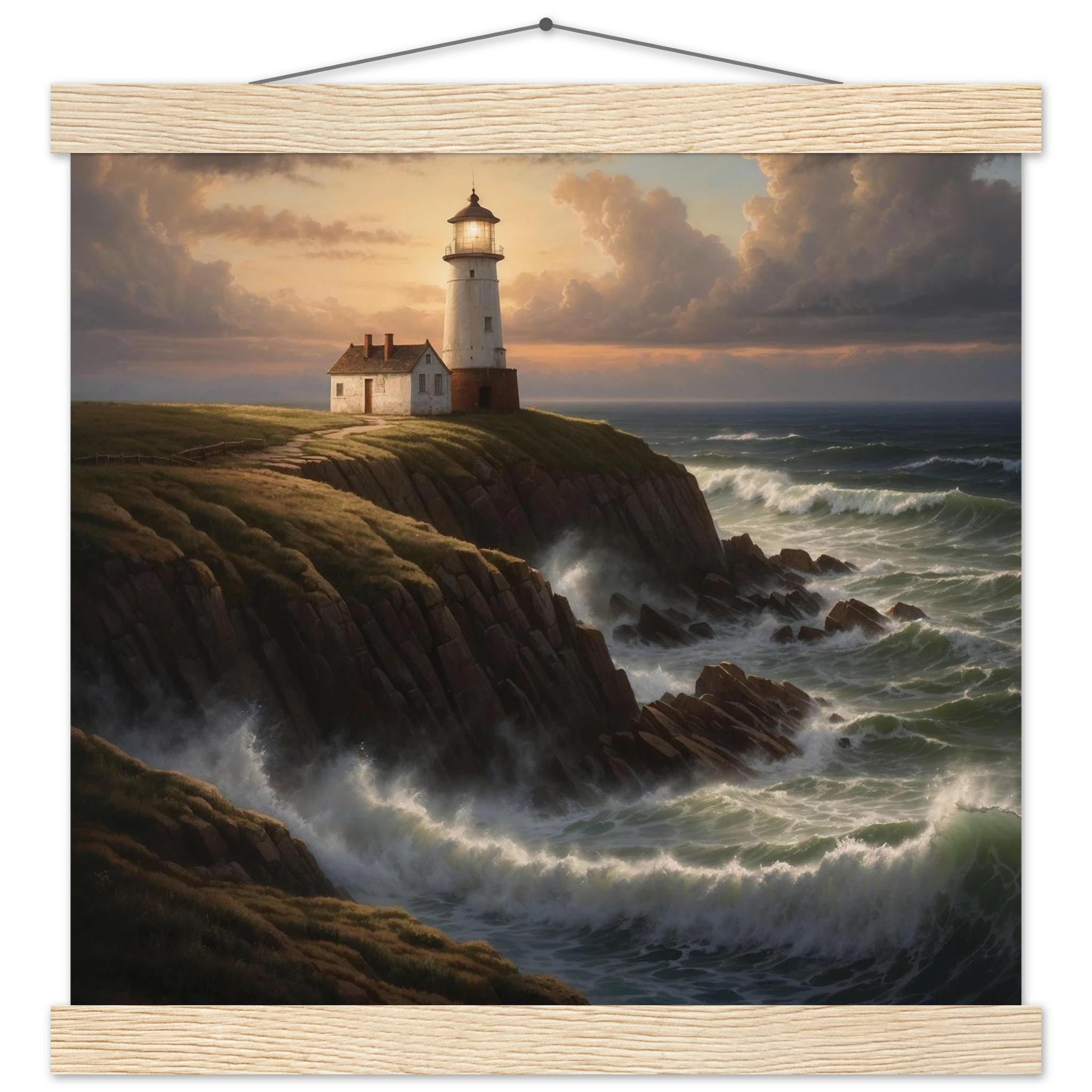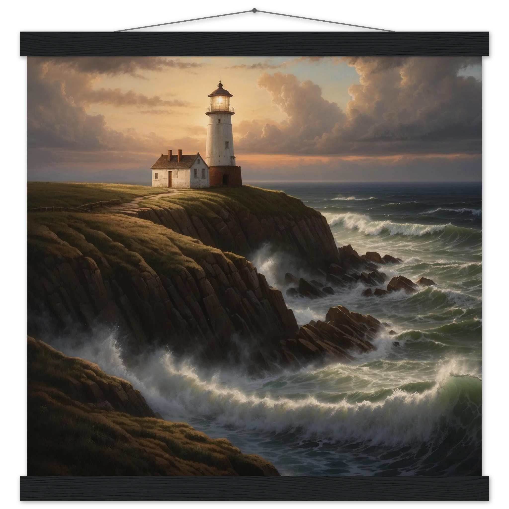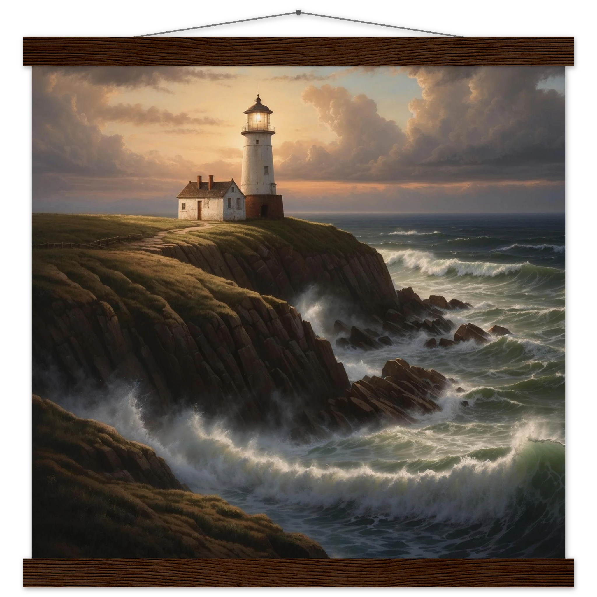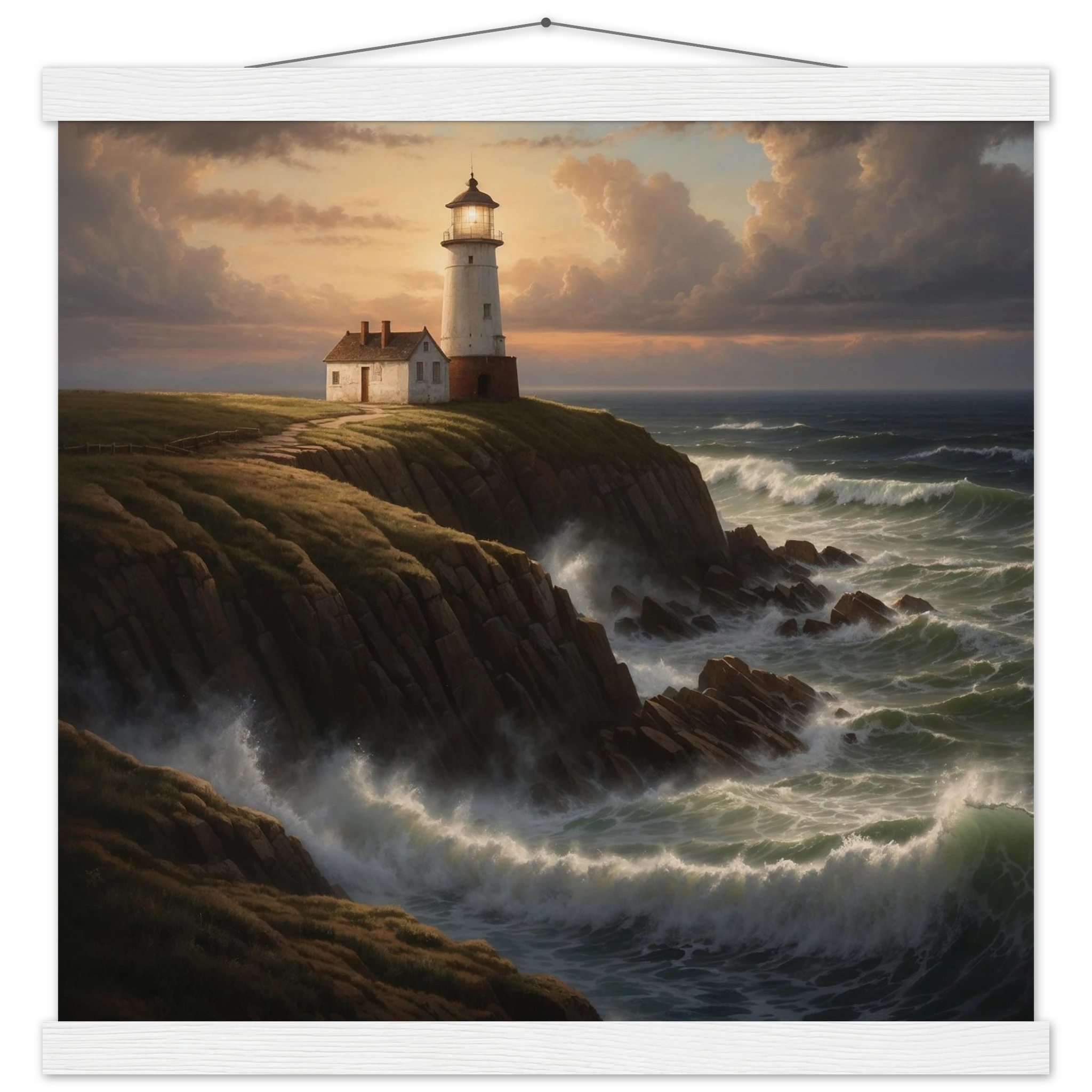 This hyperrealistic print captures a weathered lighthouse on a rugged cliff, standing tall against a dramatic, stormy sea at sunset. Rich textures and striking lighting create an awe-inspiring scene. Perfect for adding a powerful, maritime feel to your home.